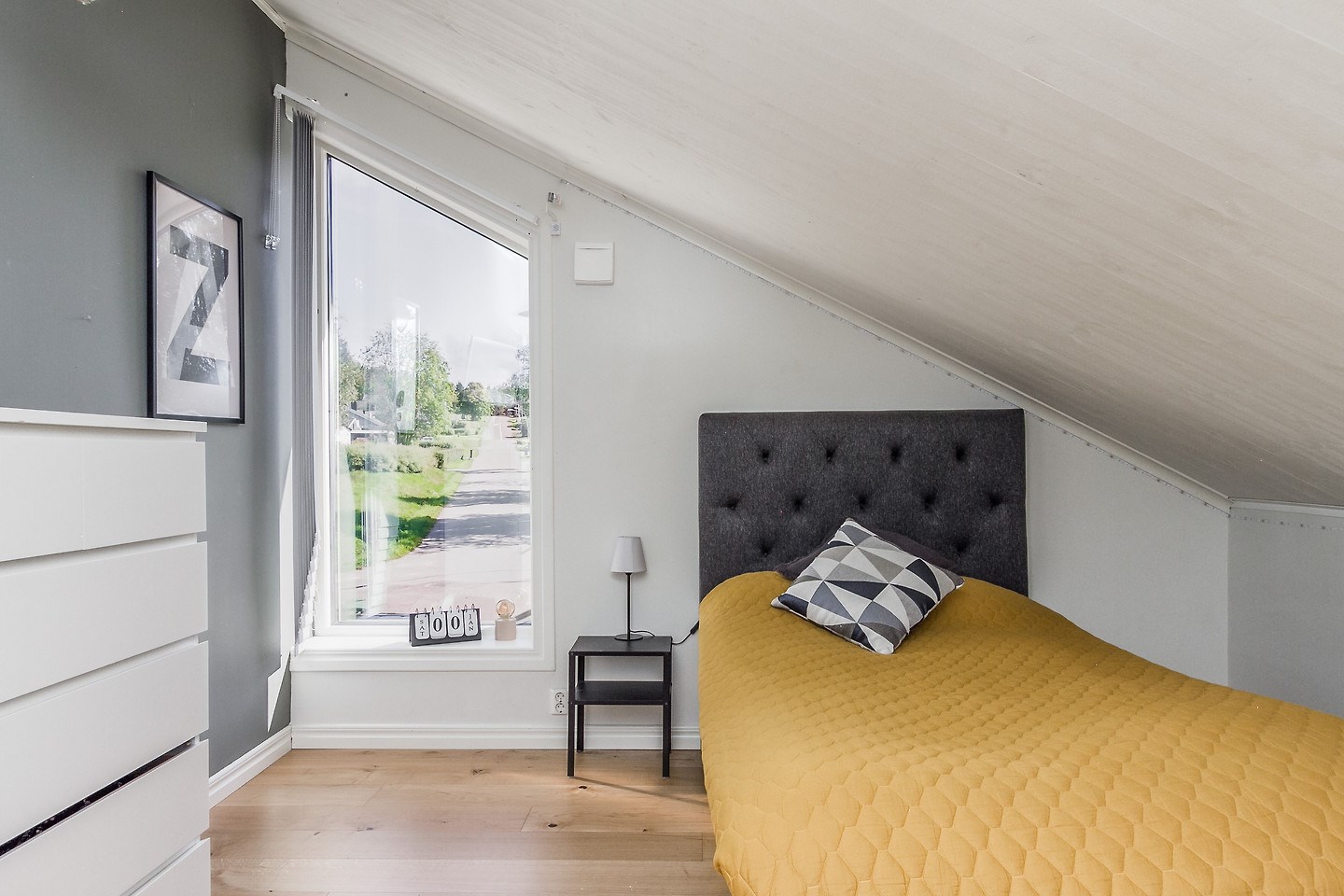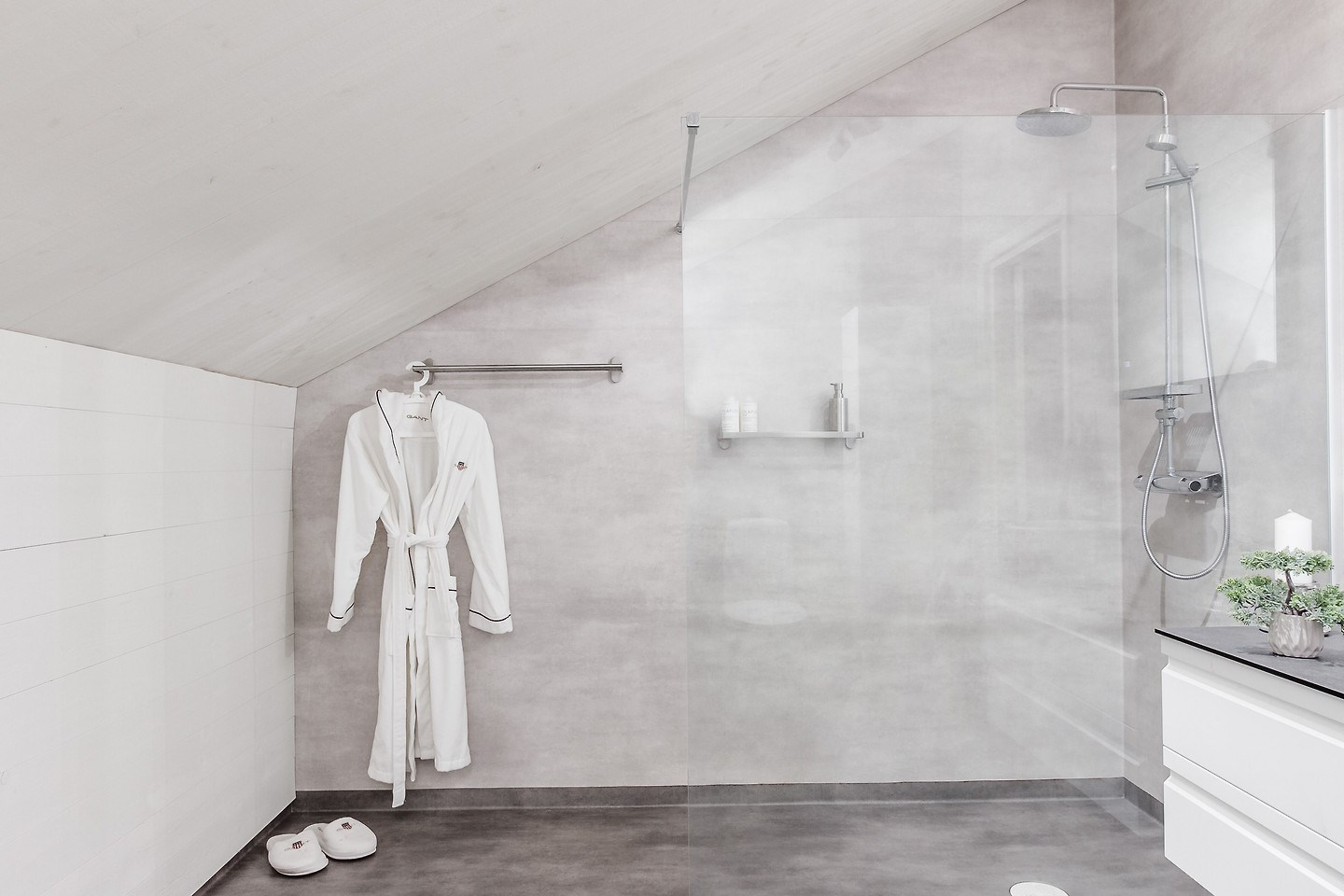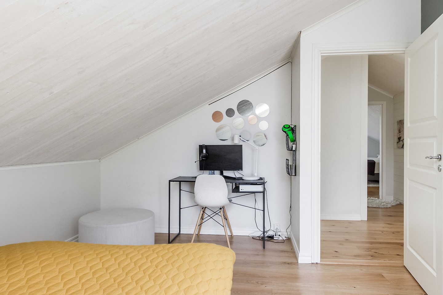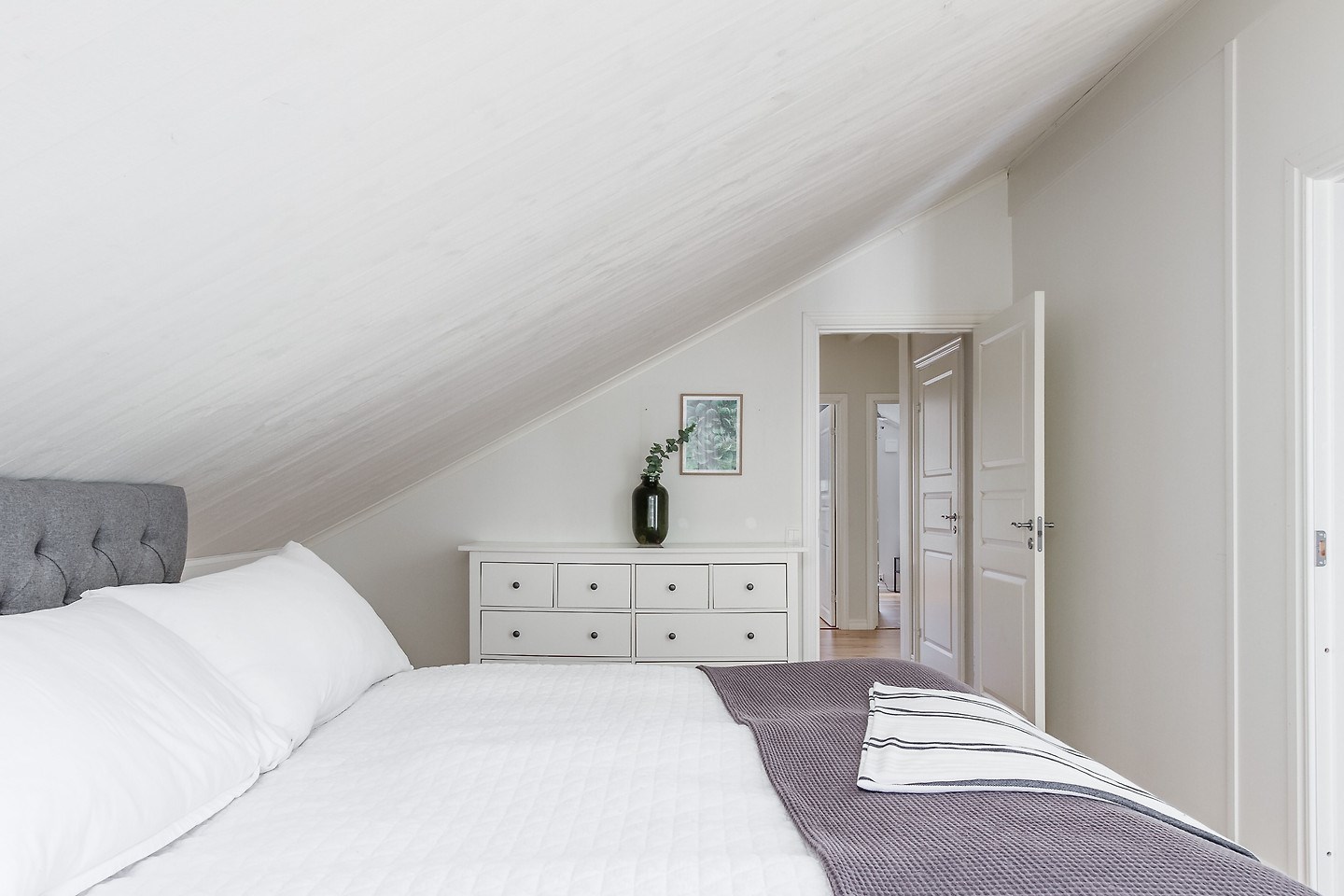 Entréplan: Man kommer in i den ljusa bostaden via HALL med klinkergolv och plats för ytterkläder. KÖKET är renoverat med köksö och utrustning i form av spis/induktionshäll, ugn, spisfläkt med rostfri kåpa, högskåp kyl och frys, integrerad diskmaskin, micro. Samtliga maskiner och apparater från Bosch. Kaklad vit vägg över spishäll och intill spiskåpa. Utsikt via två köksfönster mot ingång och uppfart. Det stora ALLRUMMET har öppen planlösning och generösa ytor. Utgång till både inglasat och inrett UTERUM som ALTAN- och SOLDÄCK. I anslutning till det stora ALLRUMMET med separat TV-hörna och sittgrupp finns tillgång till en TOALETT med duschutrymme, golvvärme samt klinkergolv och kaklade väggar i vitt. De flera uteplatserna gör att nedre planet upplevs både stort och välkomnande att kunna nyttja alla årstider. Från hallen når man TVÄTTSTUGAN med klinkergolv, tvättmaskin och torktumlare samt praktiska avlastningsytor och diskho. Intill ligger ett APPARATRUM med klinkergolv, bergvärmepump och elcentral med automatsäkringar samt jordfelsbrytare. Nedre planet har även tre separata RUM varav två med utsikt mot skog -och grönområde. De tre rummen kan användas på olika sätt beroende utifrån behov och önskemål såsom: kontor, lekrum, gästrum, sovrum, hobbyrum, ateljé m.m. Ovanvåning: TRAPPA via allrummet leder upp till det övre våningsplanet som omfattar 4 inredda RUM varav det ena är ett större ”Master-bedroom” med utgång till BALKONG. Två av rummen har stora fönster med utmärkt utsikt över egen infart. De två andra rummen har utsikt över egen tomt samt mot skogs- och grönområde. På det övre planet finns även ett BADRUM med toalett, tvättställ och duschhörna. Klinkergolv med vattenburen golvvärme och infällda spotlights. En rymlig och inredd KLÄDKAMMARE finns även på övre planet i direkt anslutning trapphus. Merparten av befintliga utrymmen övre plan har snedtak. Målad råspont och/eller vit målade väggar och tak. Laminatgolv och vattenburen golvvärme.
