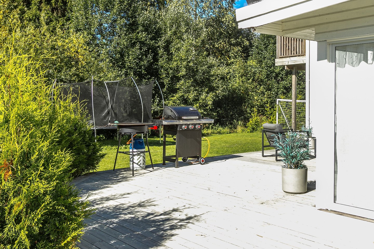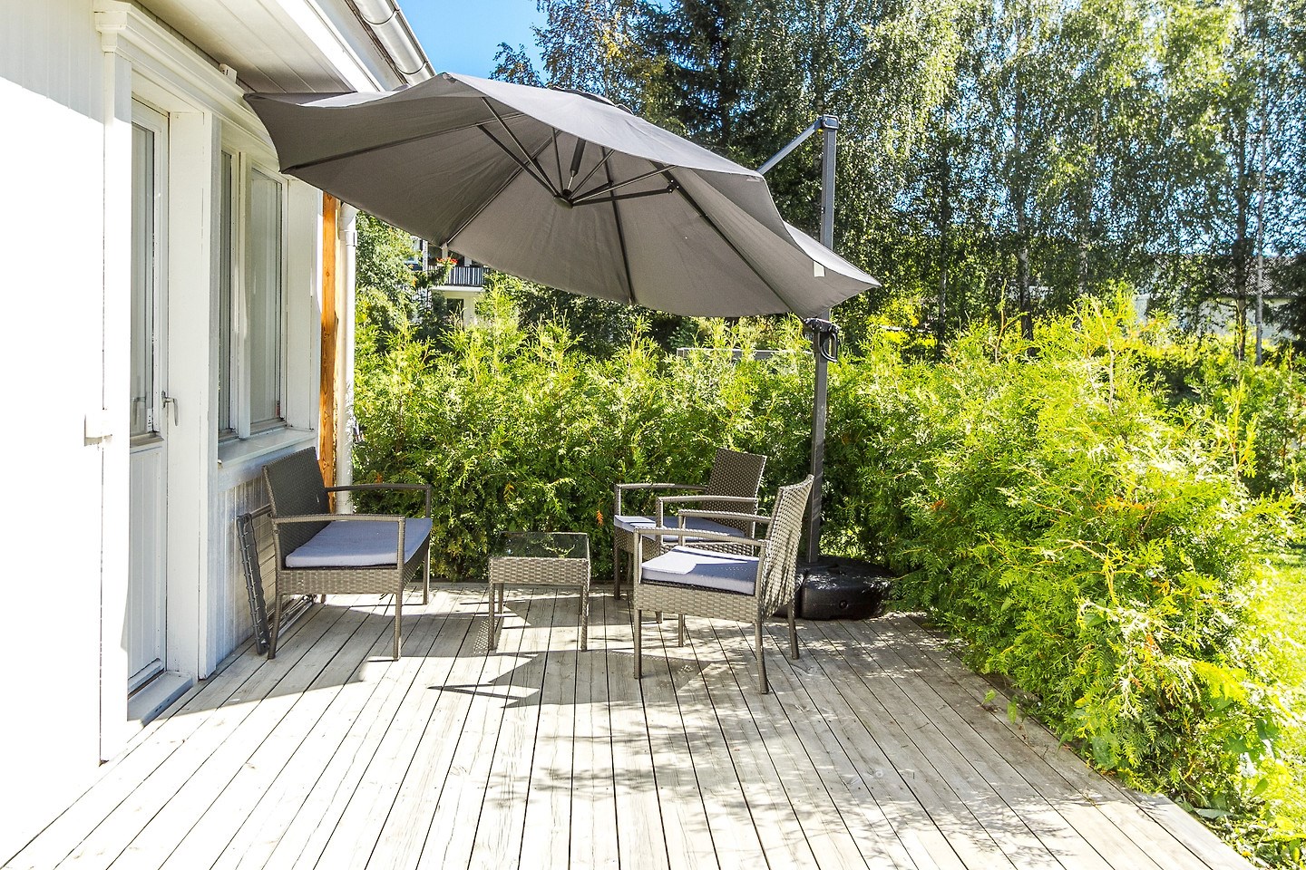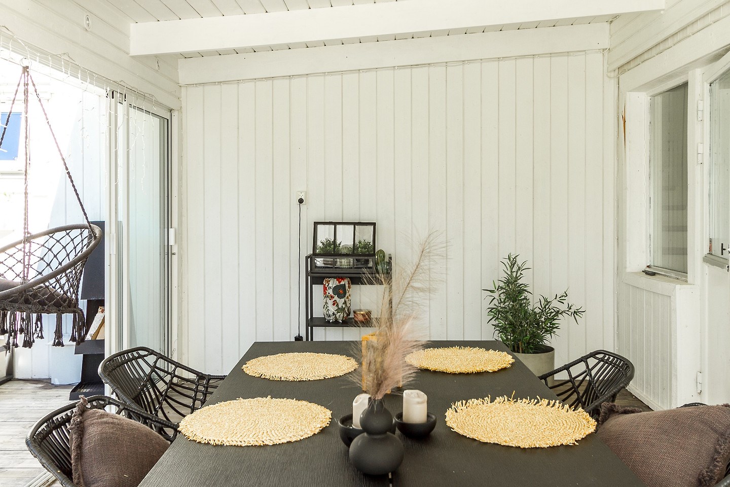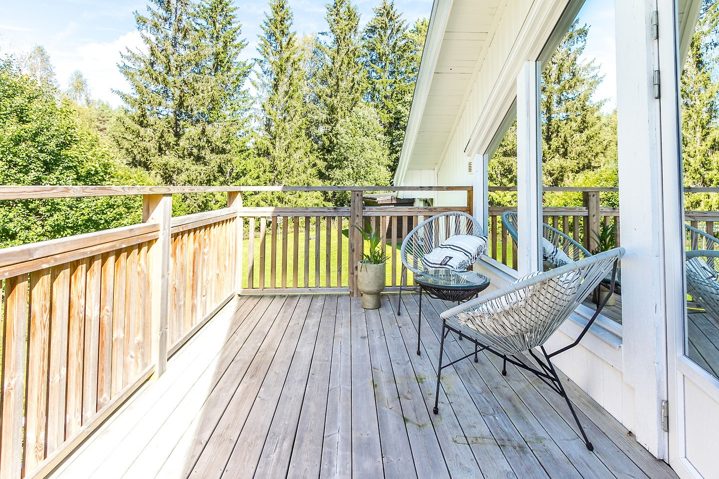 Inglasat uterum med separat altan och soldäck. Låsbar altandörr från bostad till uterum. Golv i form av trallvirke.