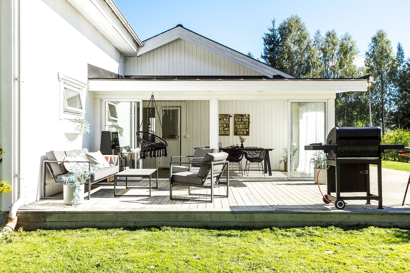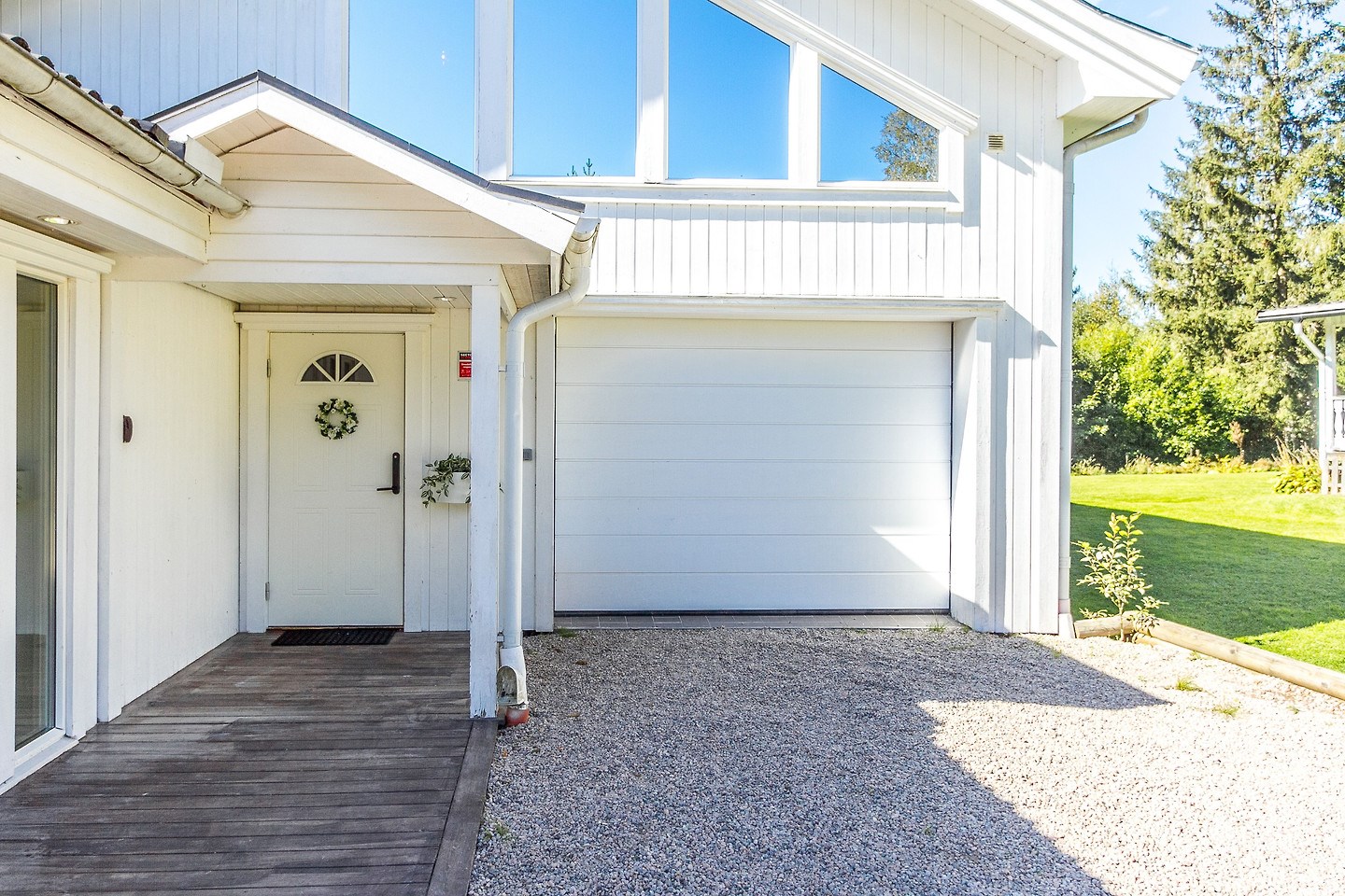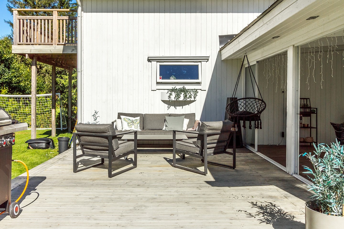 Inglasat uterum med separat altan och soldäck. Låsbar altandörr från bostad till uterum. Golv i form av trallvirke.