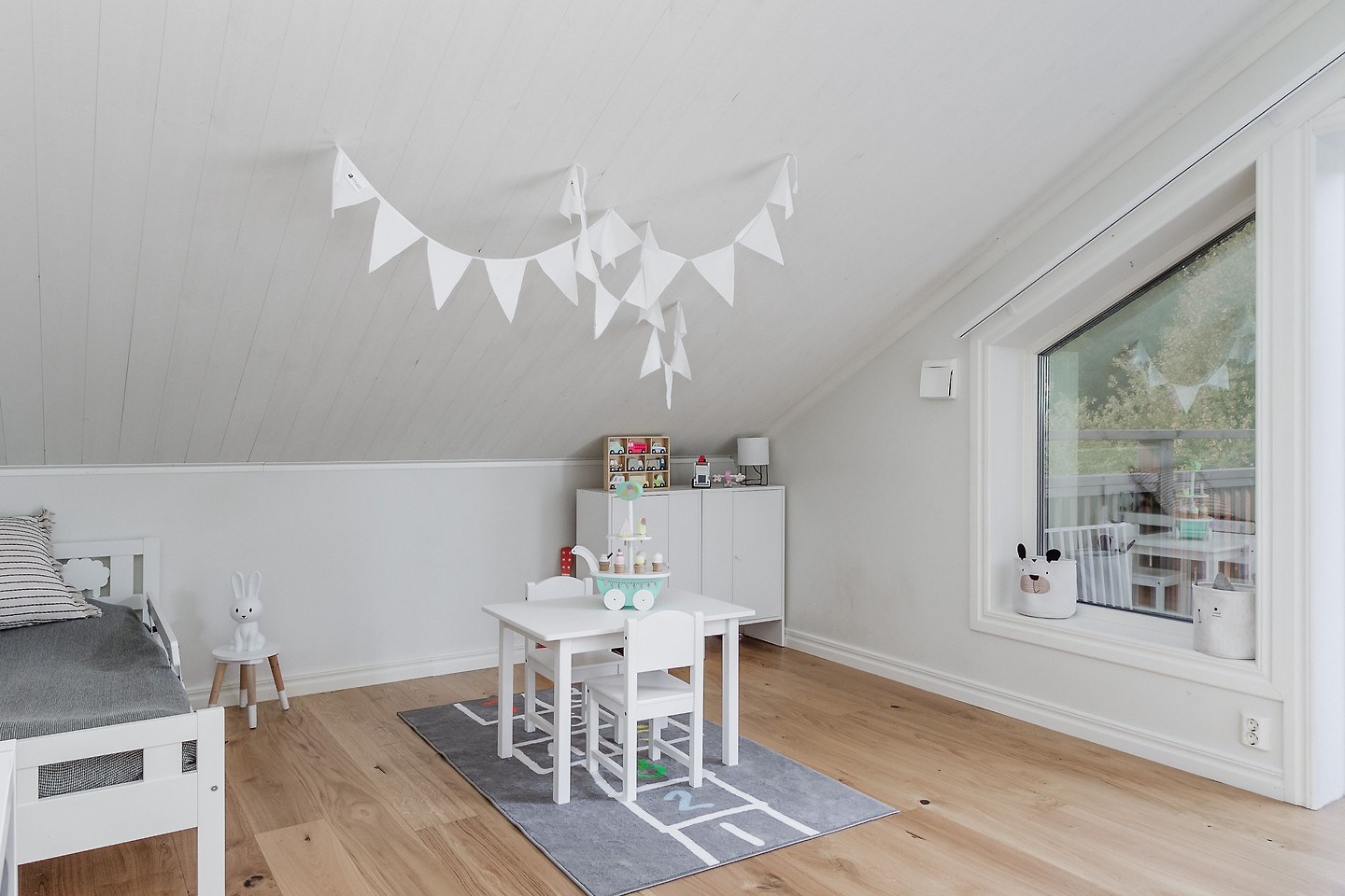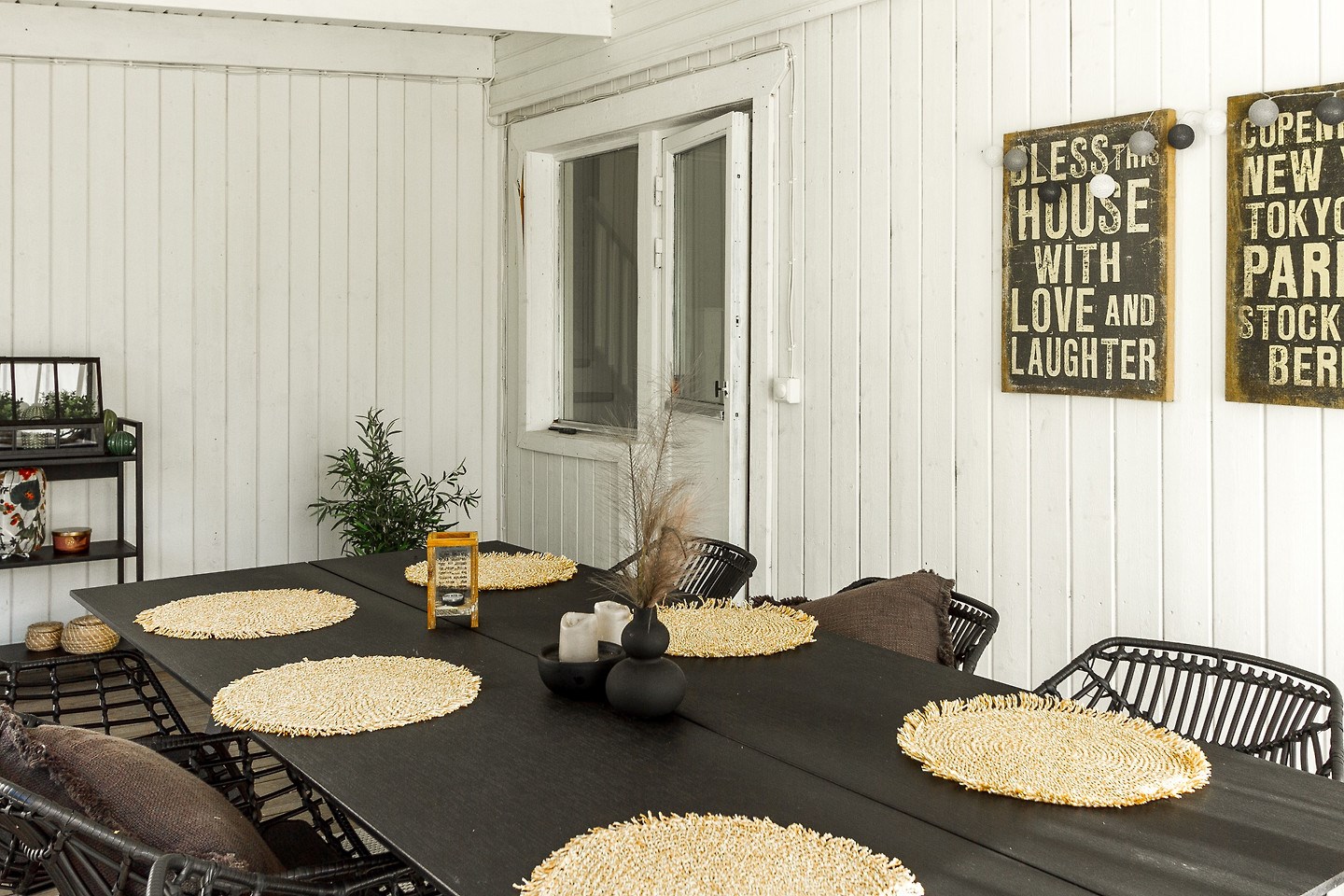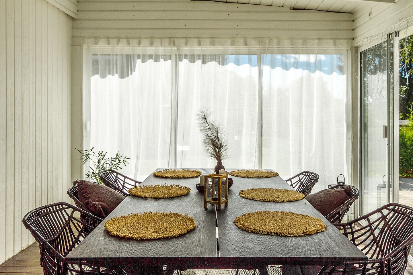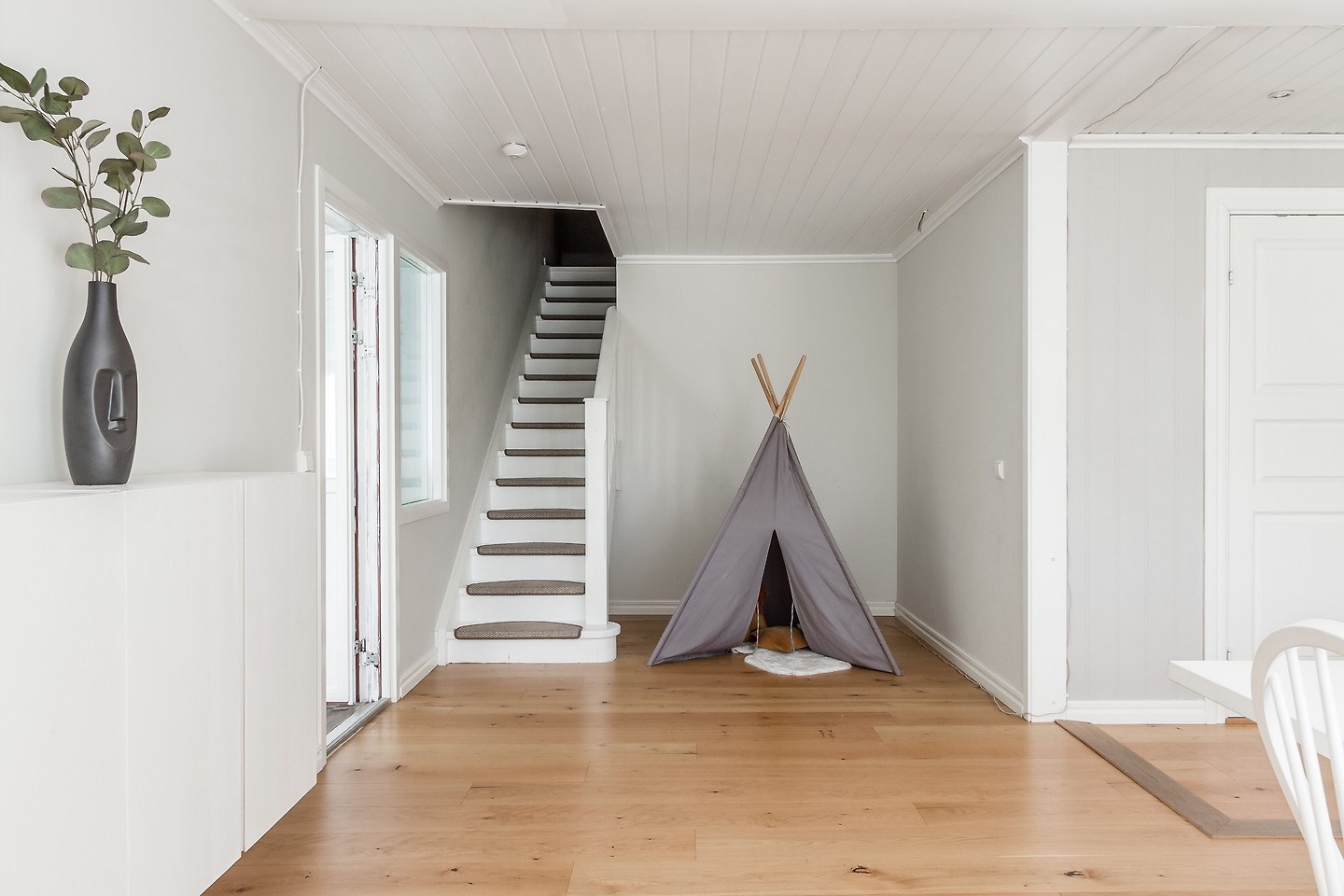 Inglasat uterum med separat altan och soldäck. Låsbar altandörr från bostad till uterum. Golv i form av trallvirke.