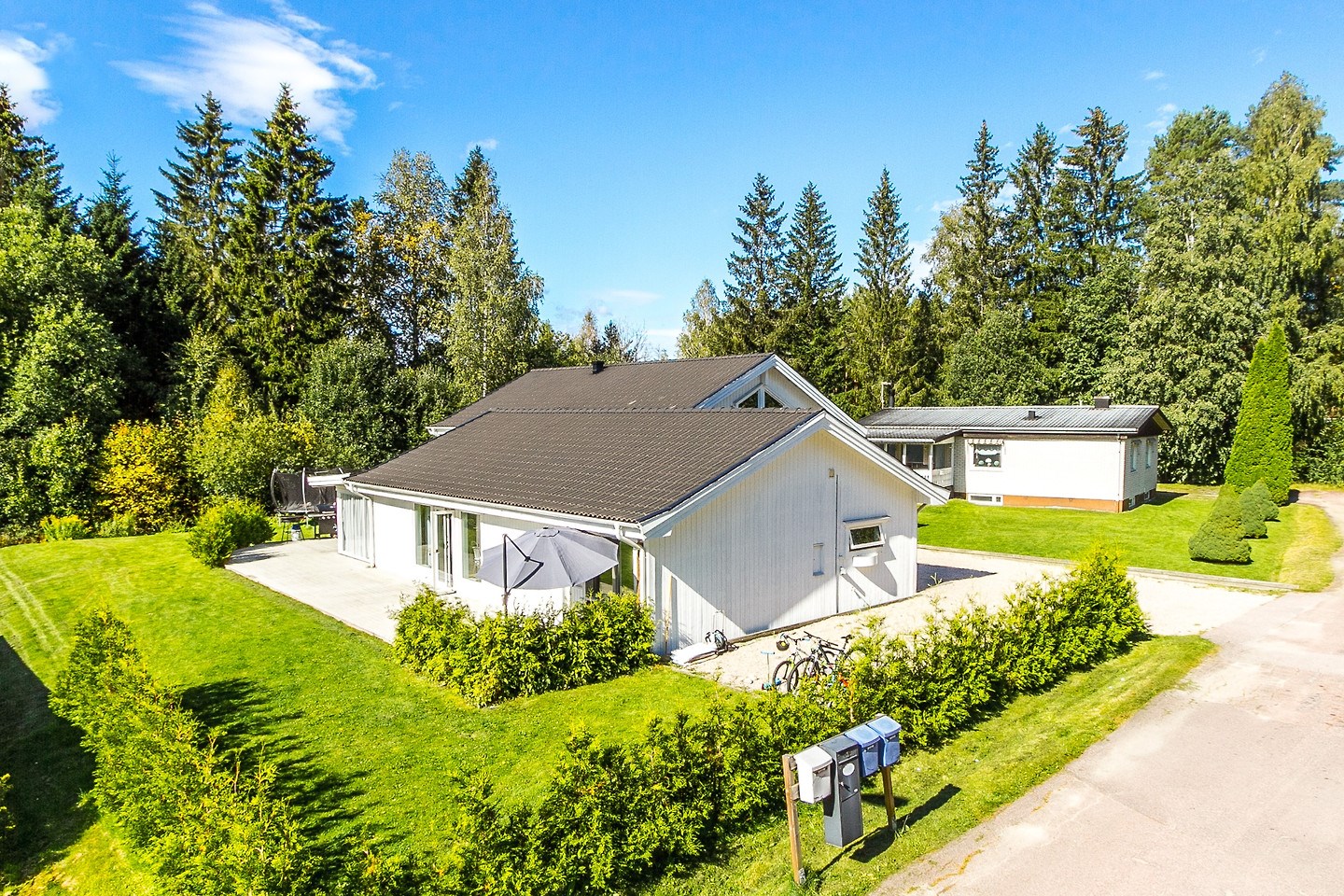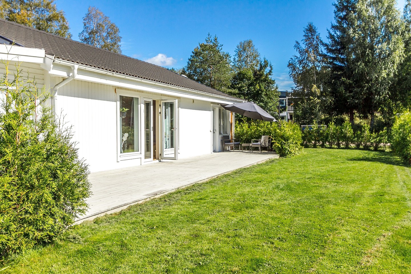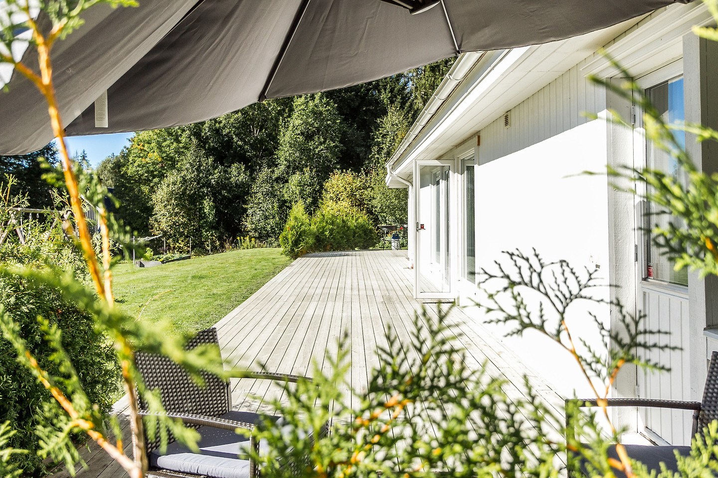 Trädgårdstomt i anslutning till skogs- och grönområden. Buskar planterade utmed tomtgräns mot granne. Insynsskyddad gräsyta mellan altandäck och närliggande skogsområde.