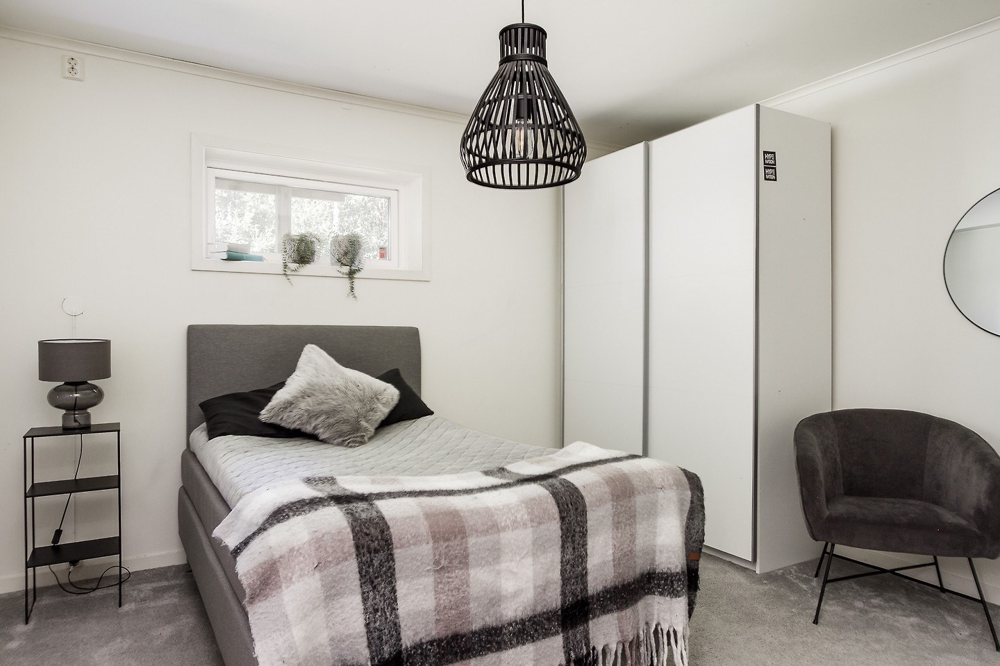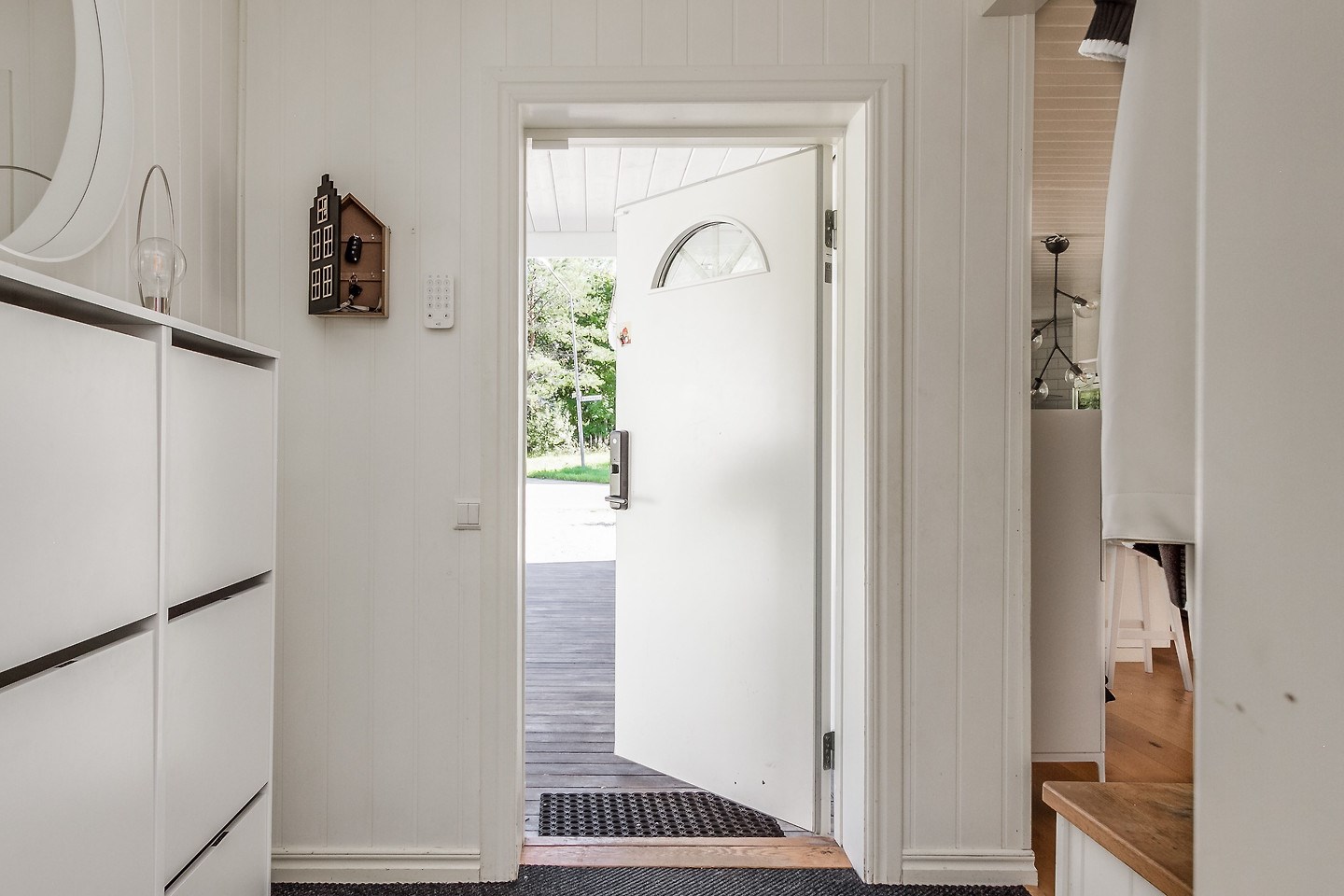 Skåp för inkommande el på bostadsvägg mot gatan. Besiktning utförd 2024. Inspektionslucka från nedre plan invändigt till isolerad nock vind med ståhöjd.