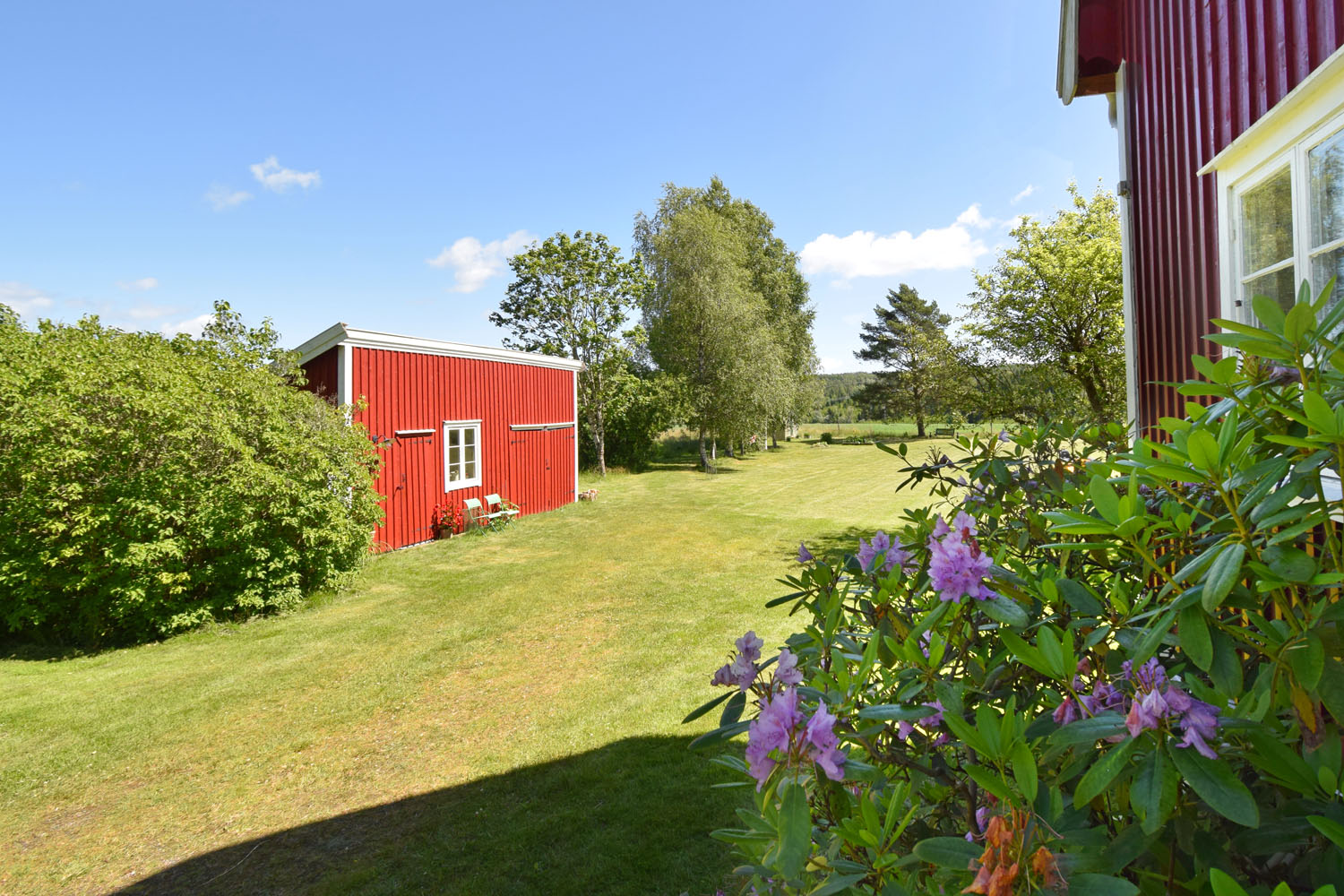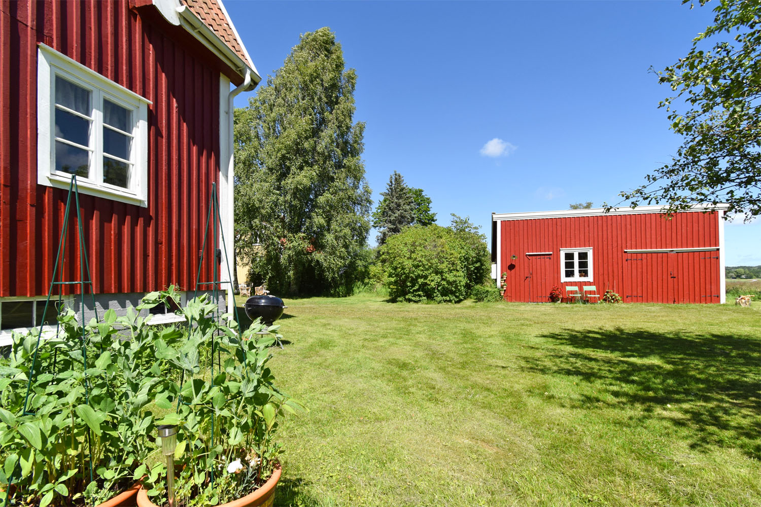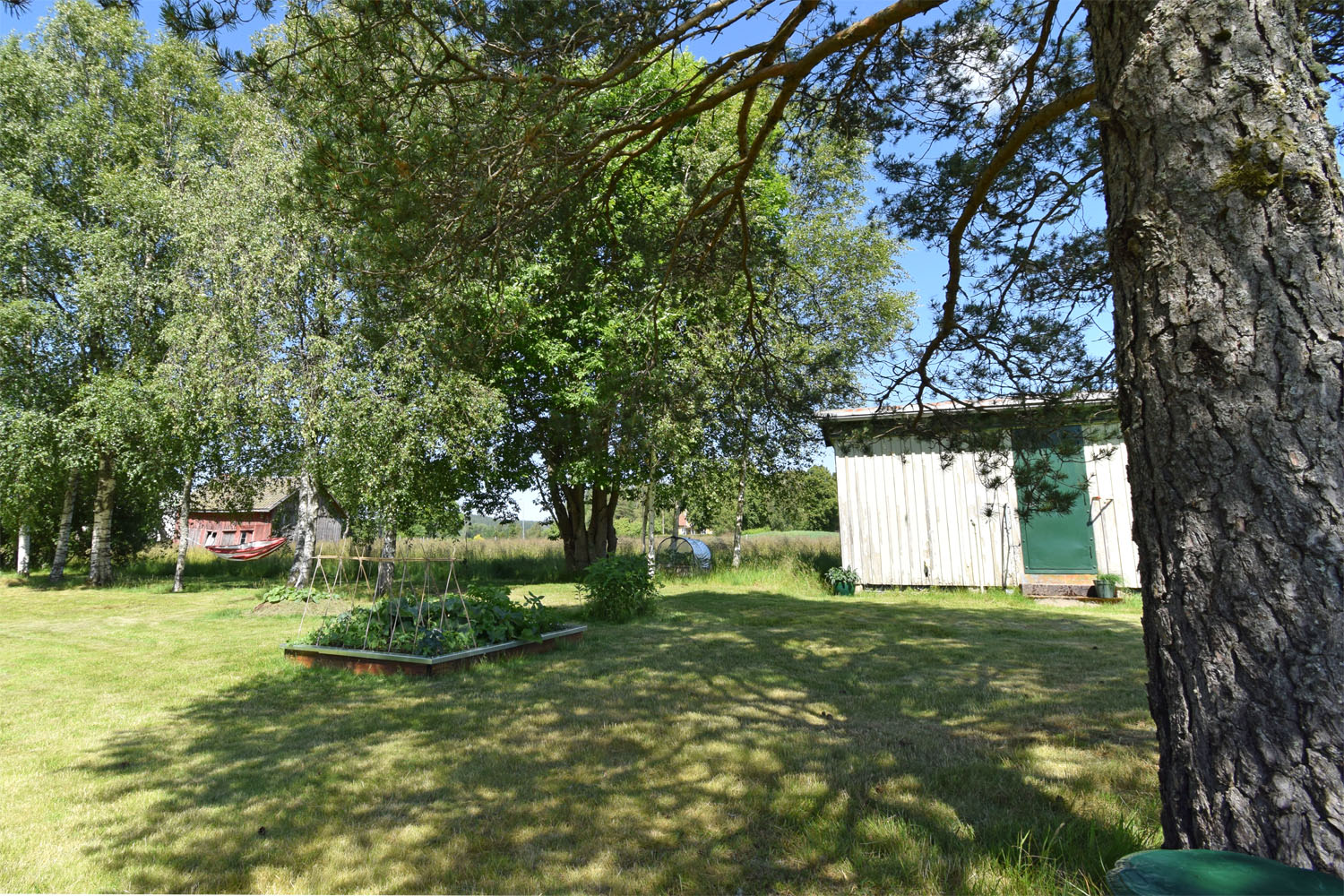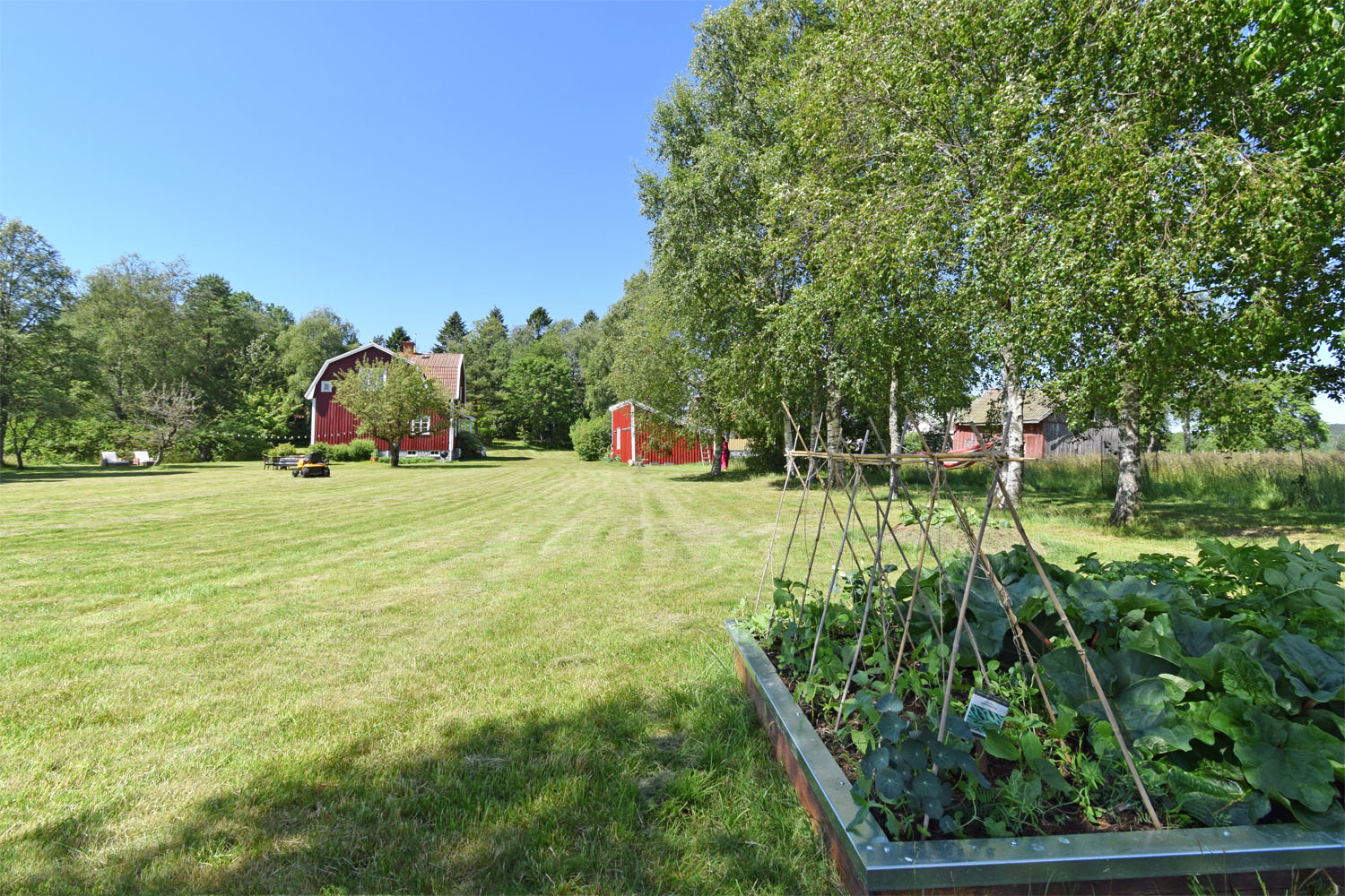 Trädgårdstomt med gräsmatta, träd, buskar, växter, rabatter och odlingar. I anslutning till tomten ligger betes och åkermarker. Tomten erbjuder möjligheter för den som önskar ytterligare planteringar och odlingar av olika slag. Växthus, altandäck, friggebod eller bastu och pool. På tomten finns flaggstång. Bevarade stenportar och gråsten vid ingång till fastigheten.