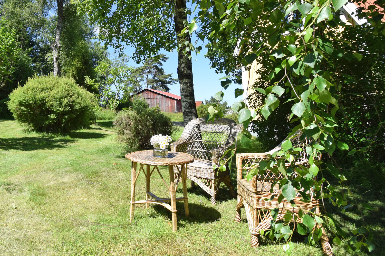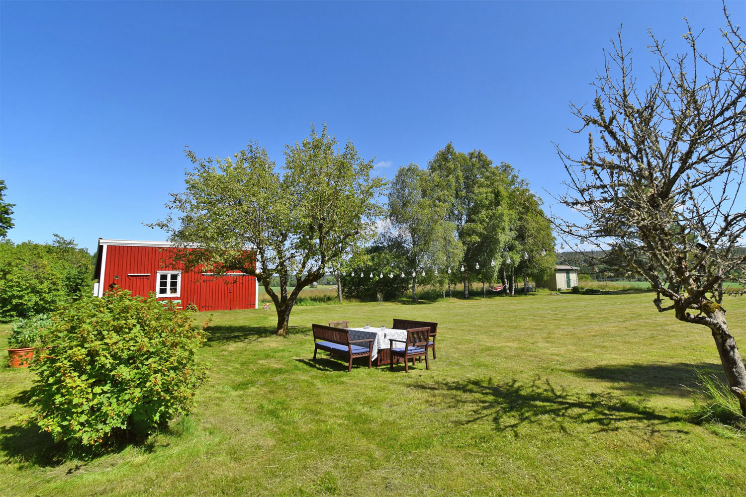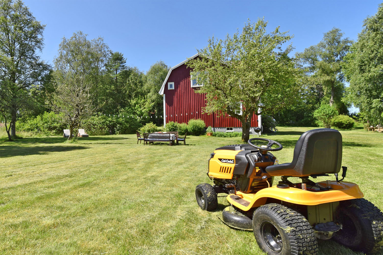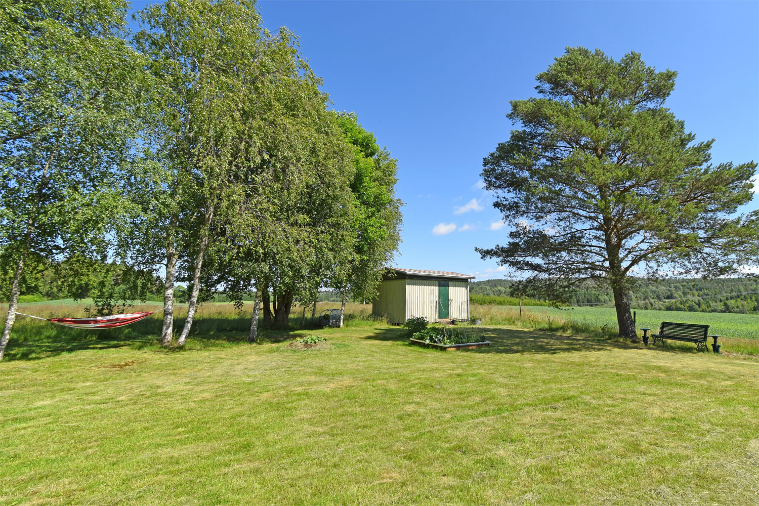 Trädgårdstomt med gräsmatta, träd, buskar, växter, rabatter och odlingar. I anslutning till tomten ligger betes och åkermarker. Tomten erbjuder möjligheter för den som önskar ytterligare planteringar och odlingar av olika slag. Växthus, altandäck, friggebod eller bastu och pool. På tomten finns flaggstång. Bevarade stenportar och gråsten vid ingång till fastigheten.