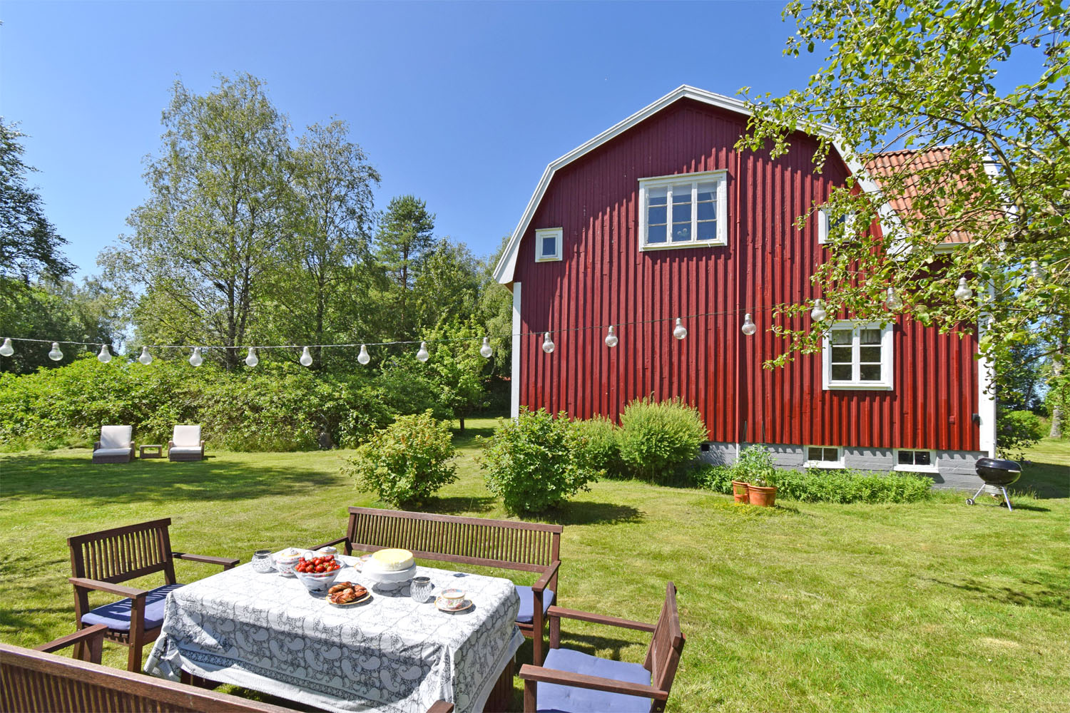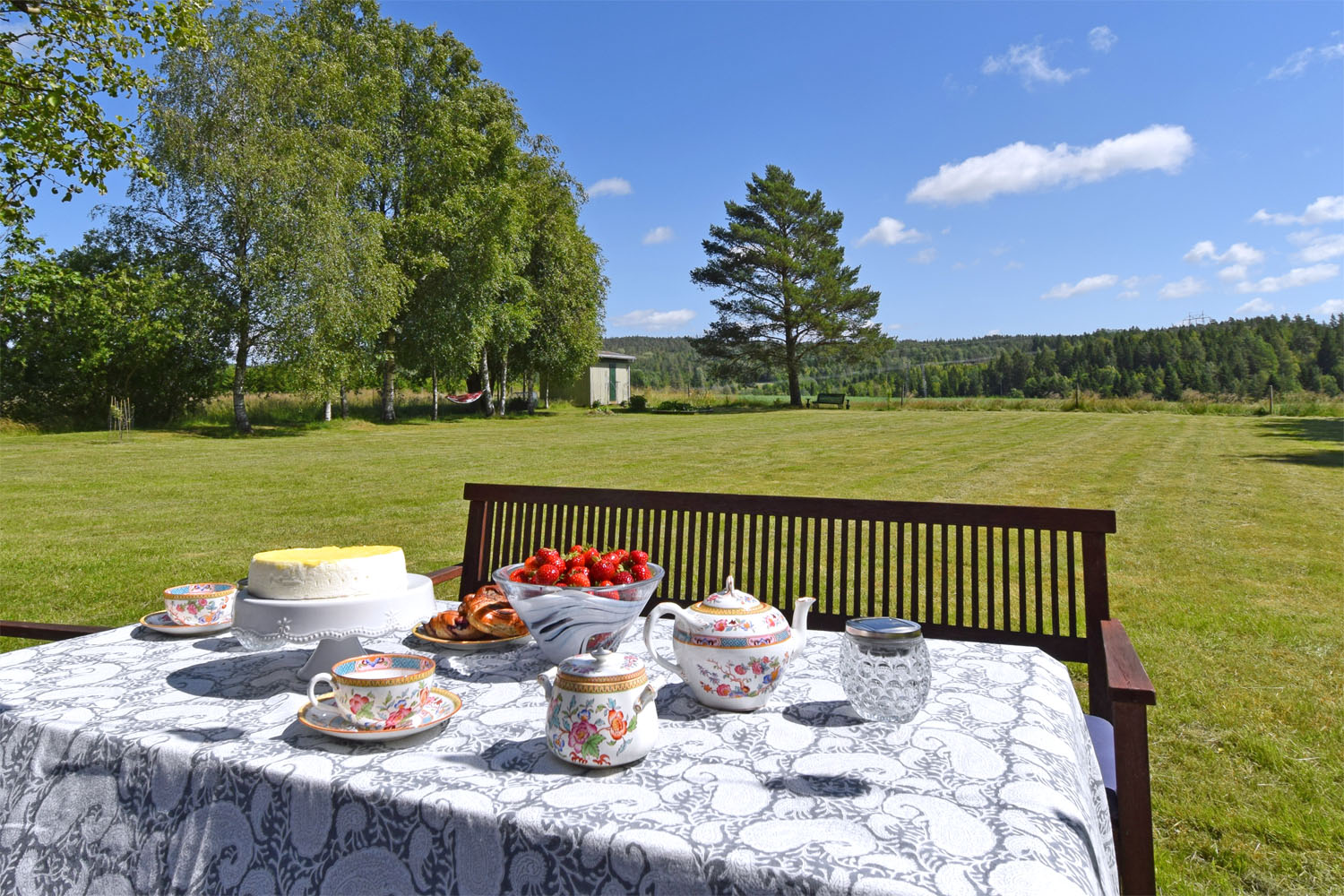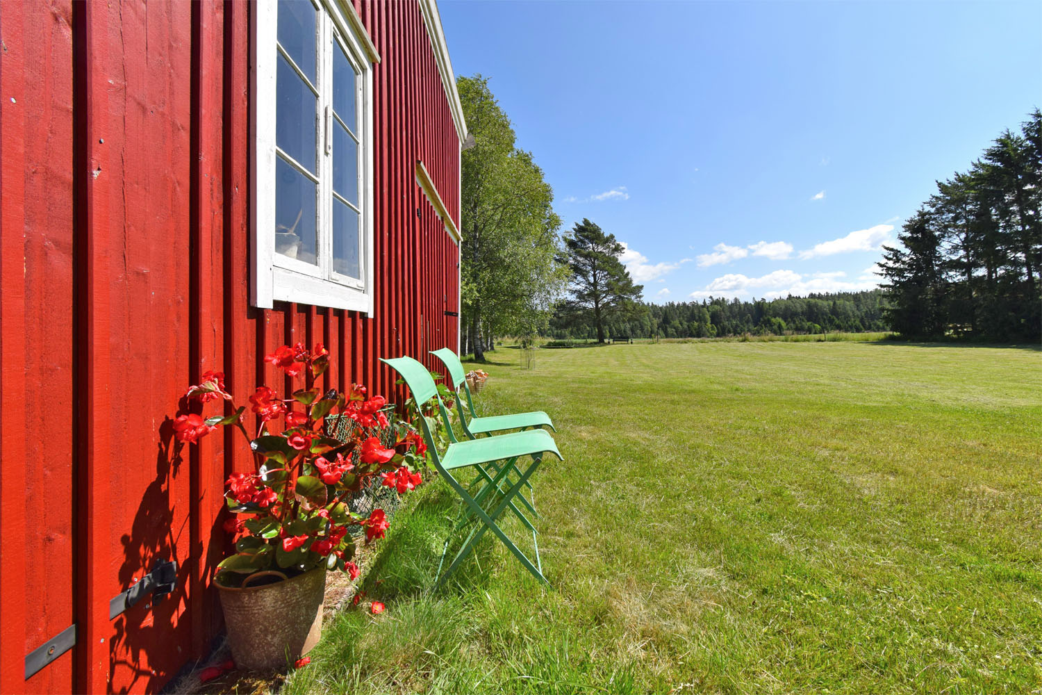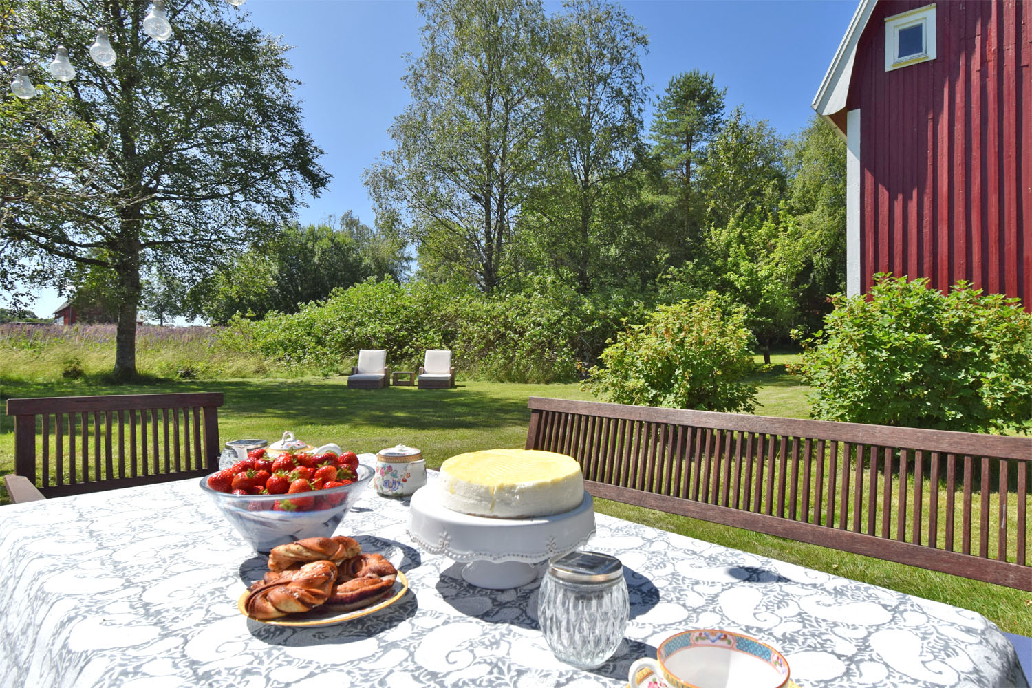 Trädgårdstomt med gräsmatta, träd, buskar, växter, rabatter och odlingar. I anslutning till tomten ligger betes och åkermarker. Tomten erbjuder möjligheter för den som önskar ytterligare planteringar och odlingar av olika slag. Växthus, altandäck, friggebod eller bastu och pool. På tomten finns flaggstång. Bevarade stenportar och gråsten vid ingång till fastigheten.