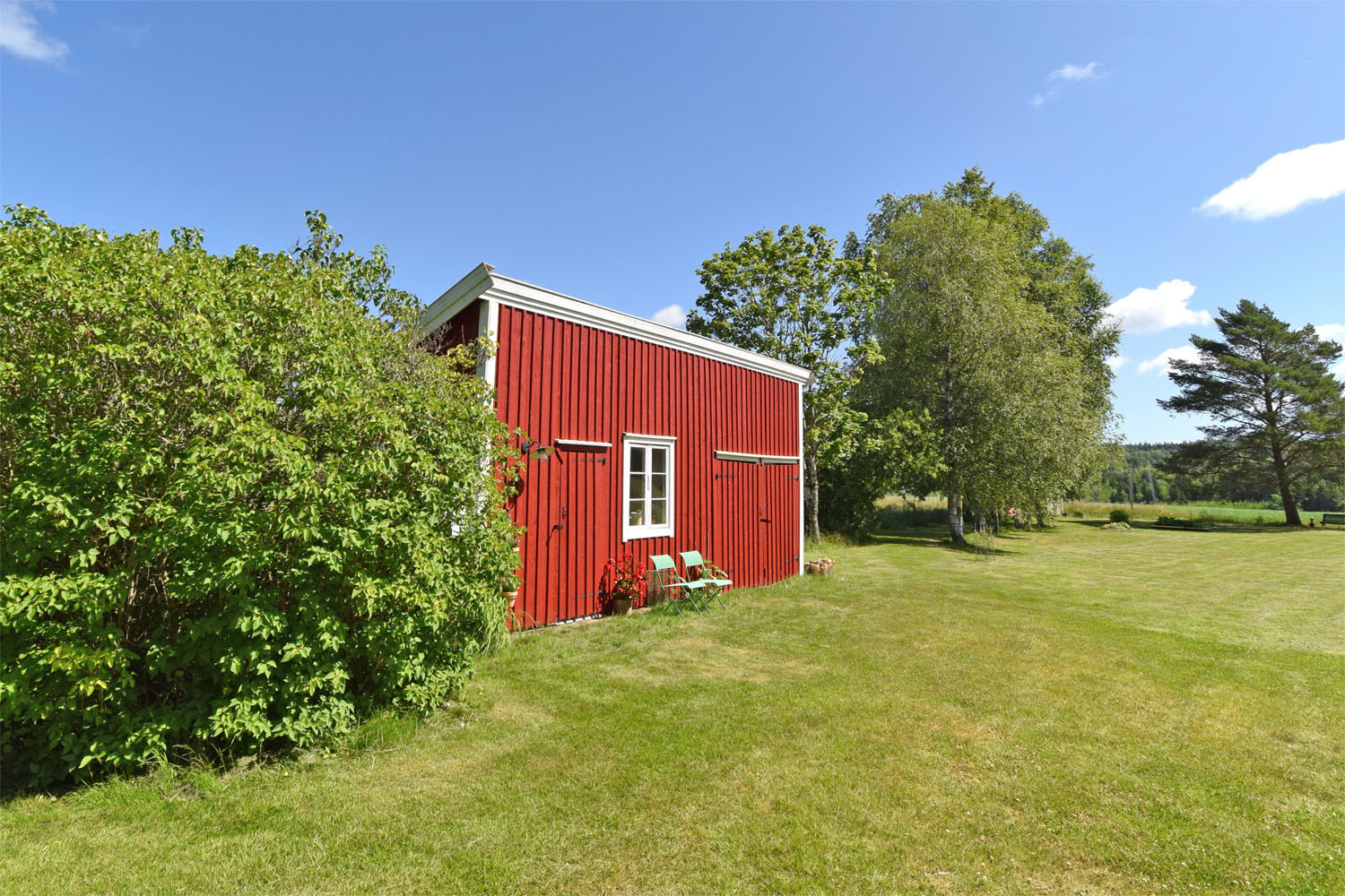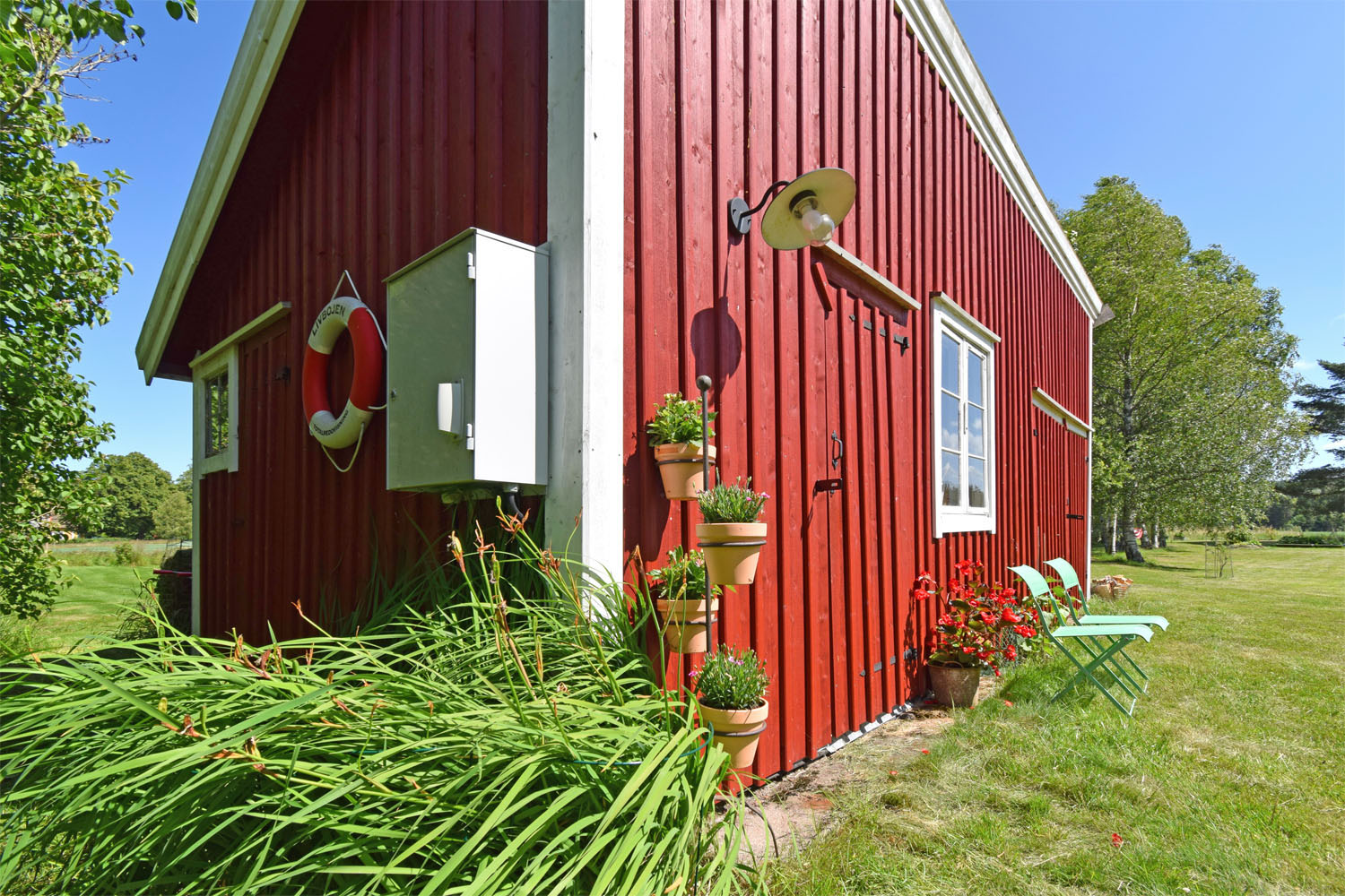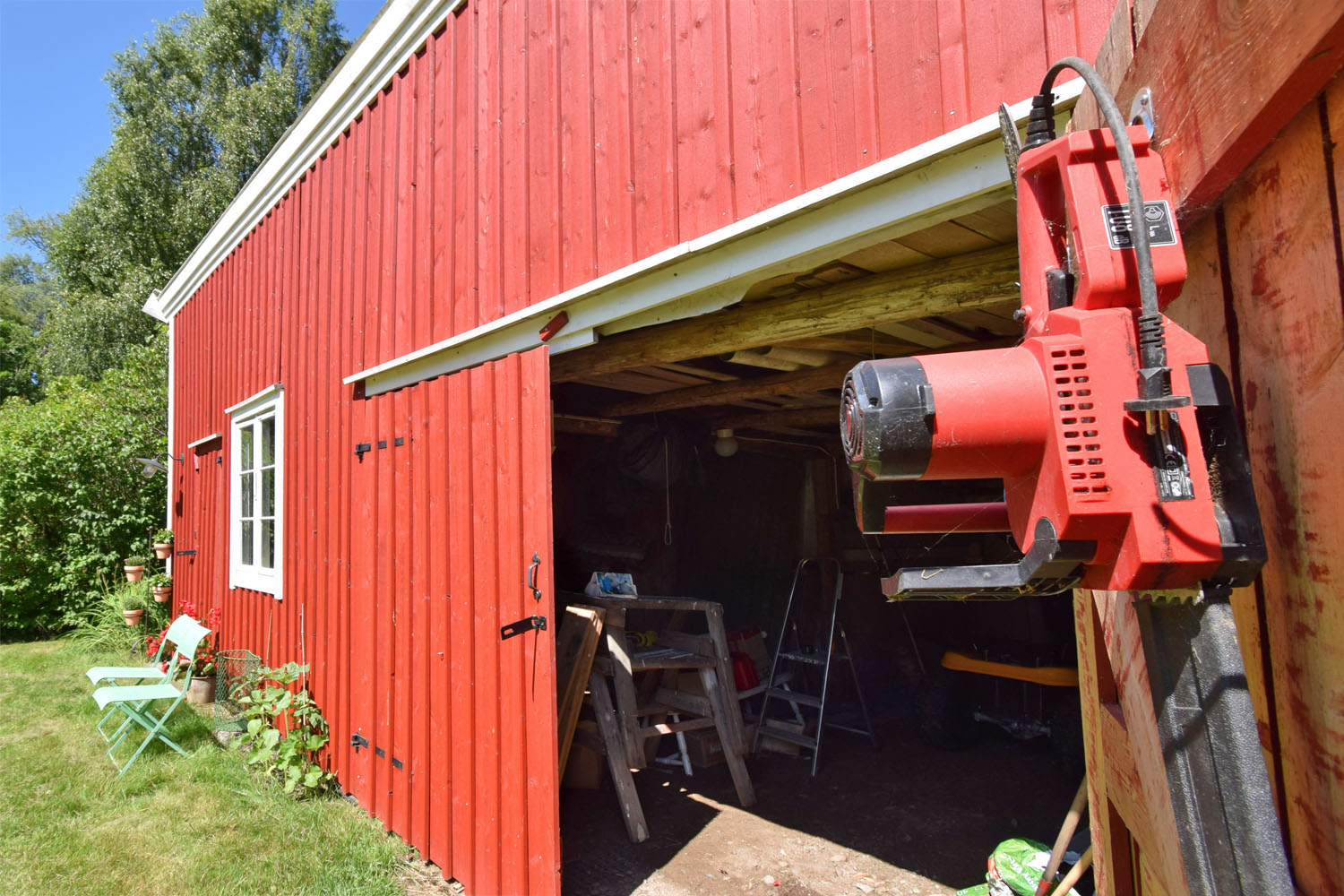 Förrådsbyggnad med bra utrymmen för trädgårdsmaskiner, gräsklippare, utrustning, ved I ena änden av byggnaden äldre utedass som idag används som förråd. Tegeltak. Stående rödmålad träpanel. Skomakarlampa. Torpargrund och stenfot. På tomten står en bod som tidigare tillhörde Televerket