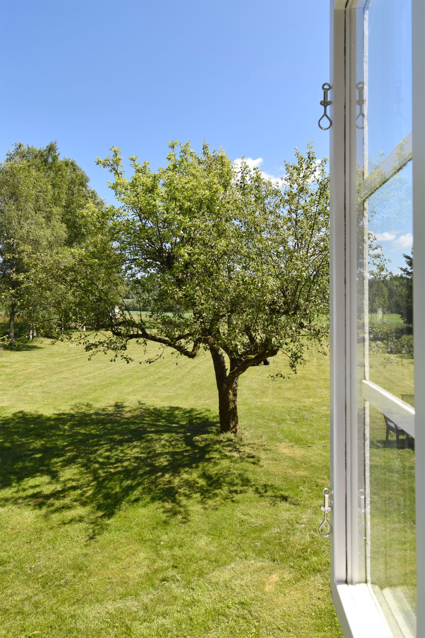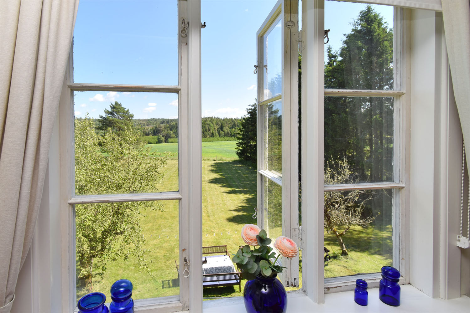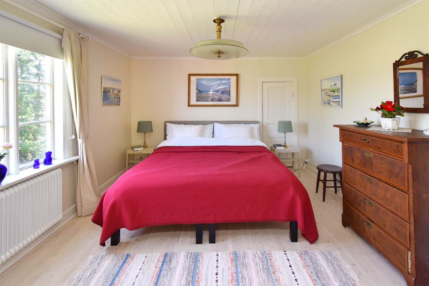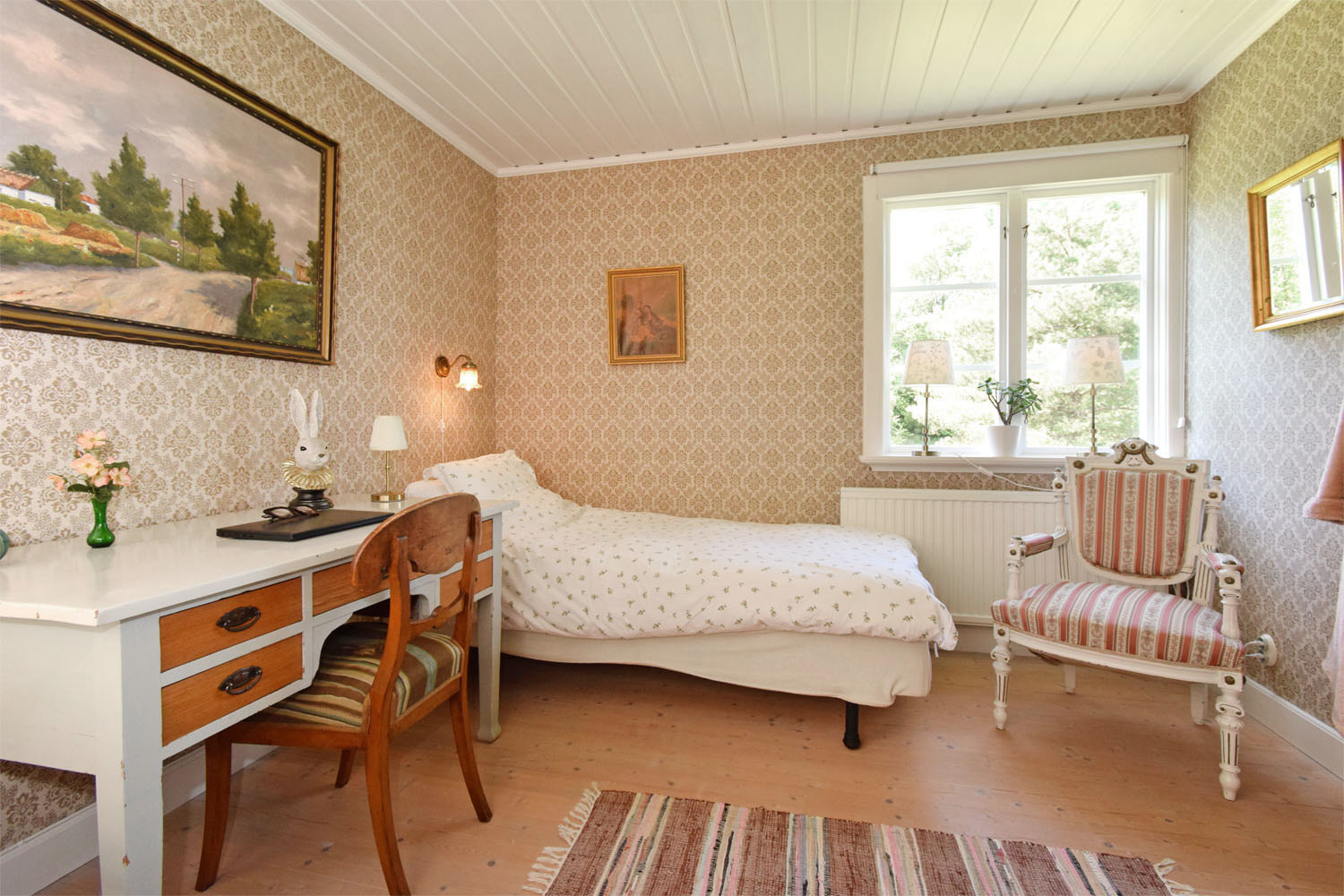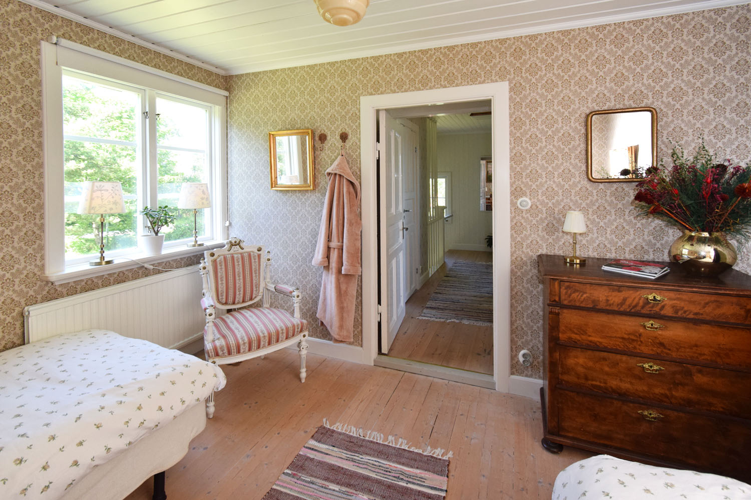 Det ena sovrummet har fönster ut mot trädgården med utmärkt utsikt över stora trädgården och intilliggande betes och hagmarker. Dörr som leder till praktiskt förvaringsutrymme i form av sidogarderober och kattvind med snedtak längs hela bostadens kortsida. Snygg elradiator med termostat under fönstret. Trägolv och målade ljusa väggar. Träpanel i tak. Bevarade spegeldörrar i merparten av bostadens utrymmen och rum inkl dörrstockar.