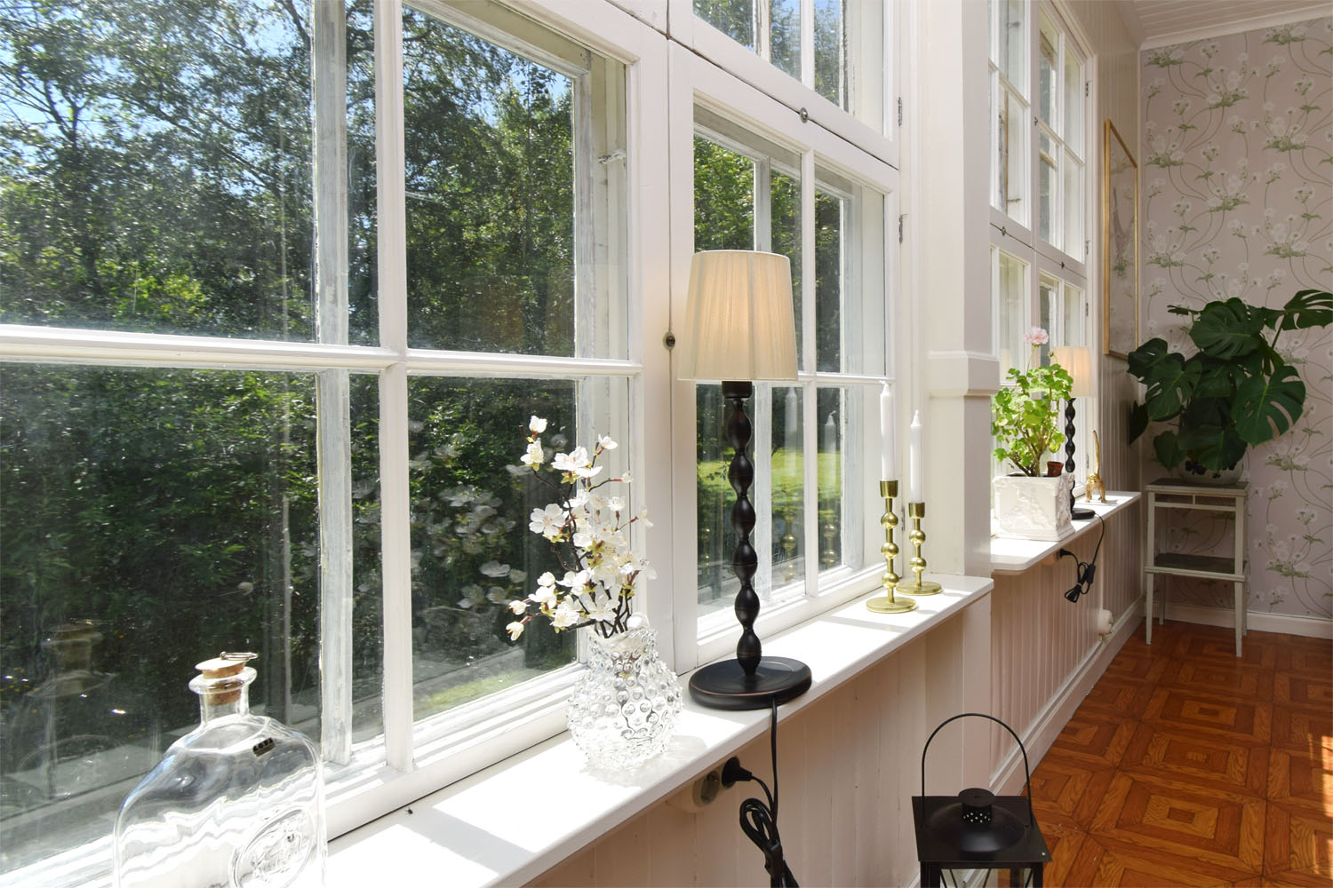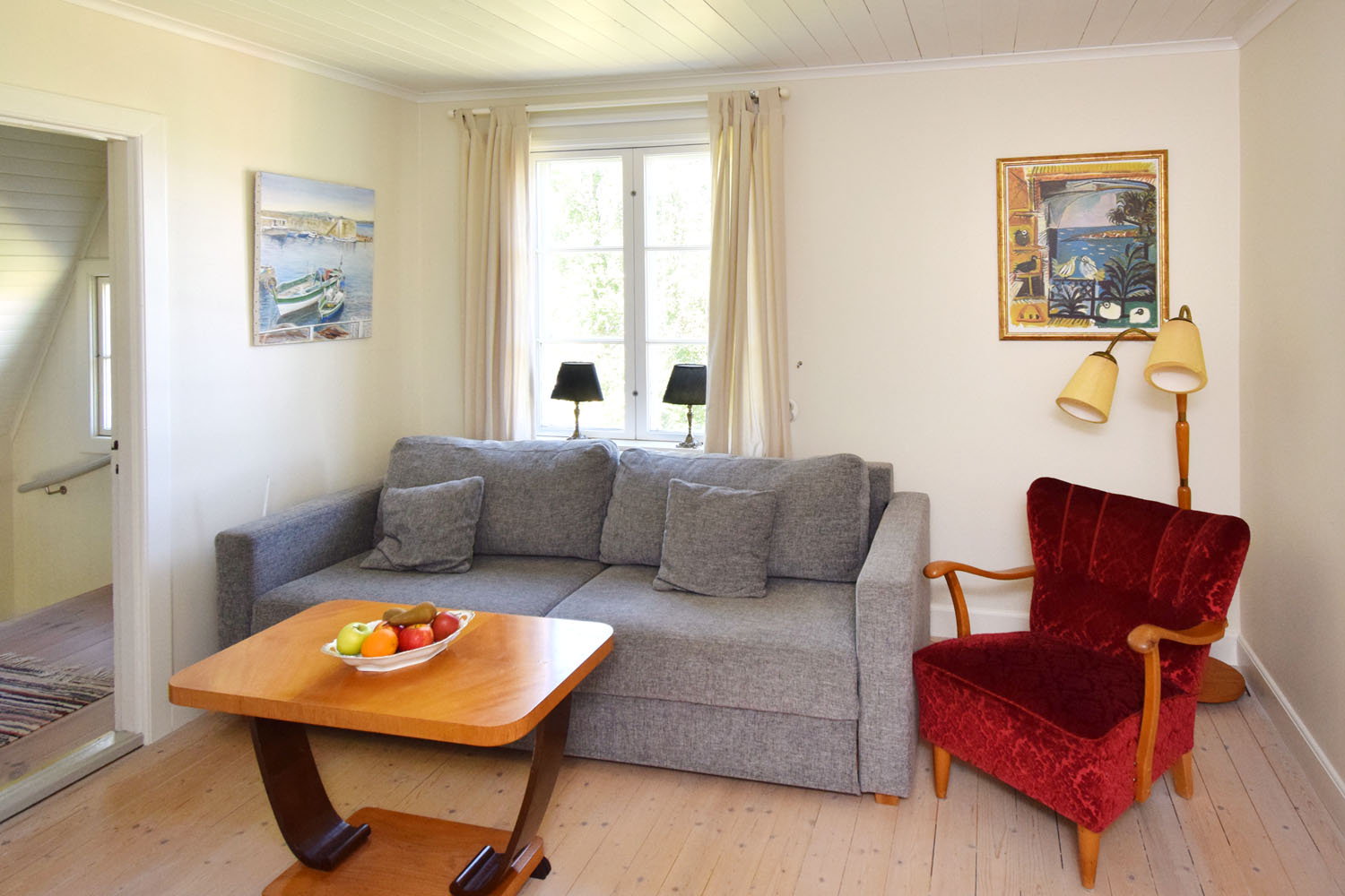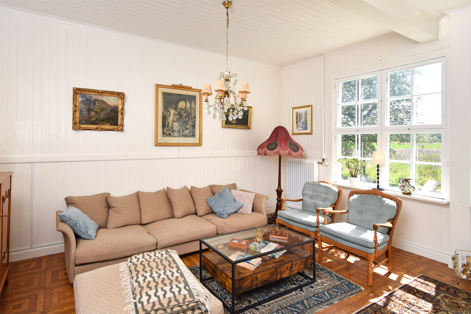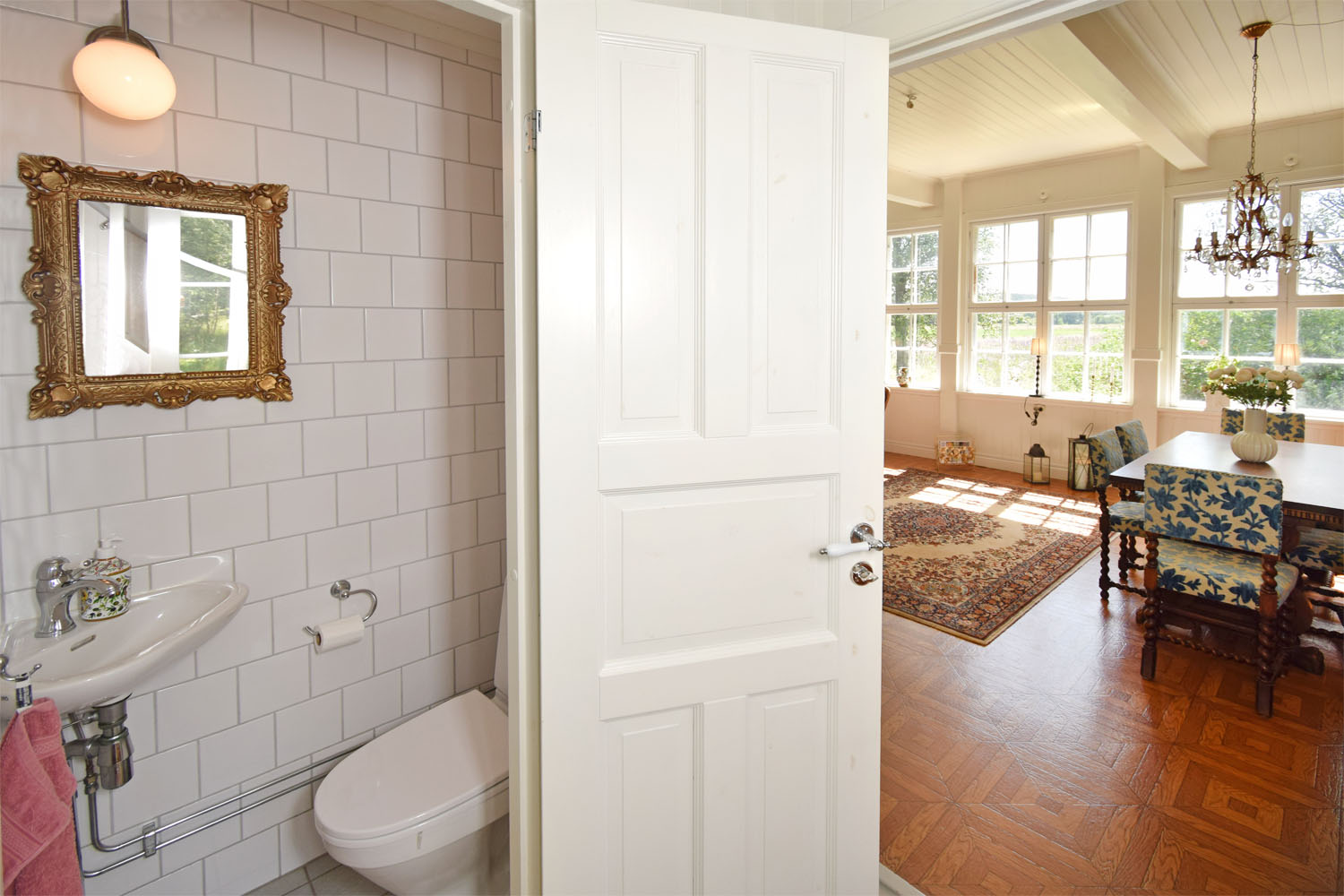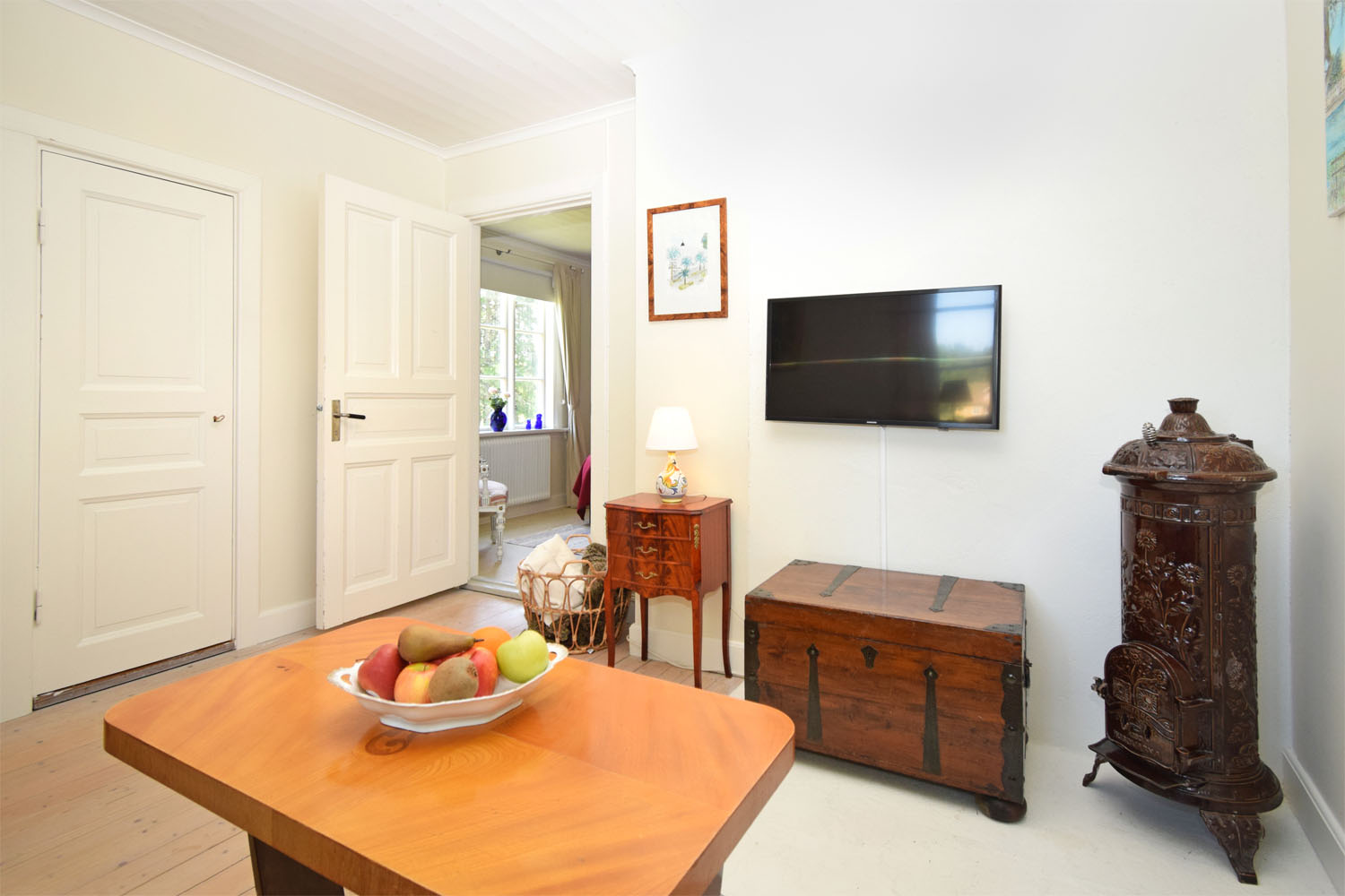 Det ena sovrummet har fönster ut mot trädgården med utmärkt utsikt över stora trädgården och intilliggande betes och hagmarker. Dörr som leder till praktiskt förvaringsutrymme i form av sidogarderober och kattvind med snedtak längs hela bostadens kortsida. Snygg elradiator med termostat under fönstret. Trägolv och målade ljusa väggar. Träpanel i tak. Bevarade spegeldörrar i merparten av bostadens utrymmen och rum inkl dörrstockar.