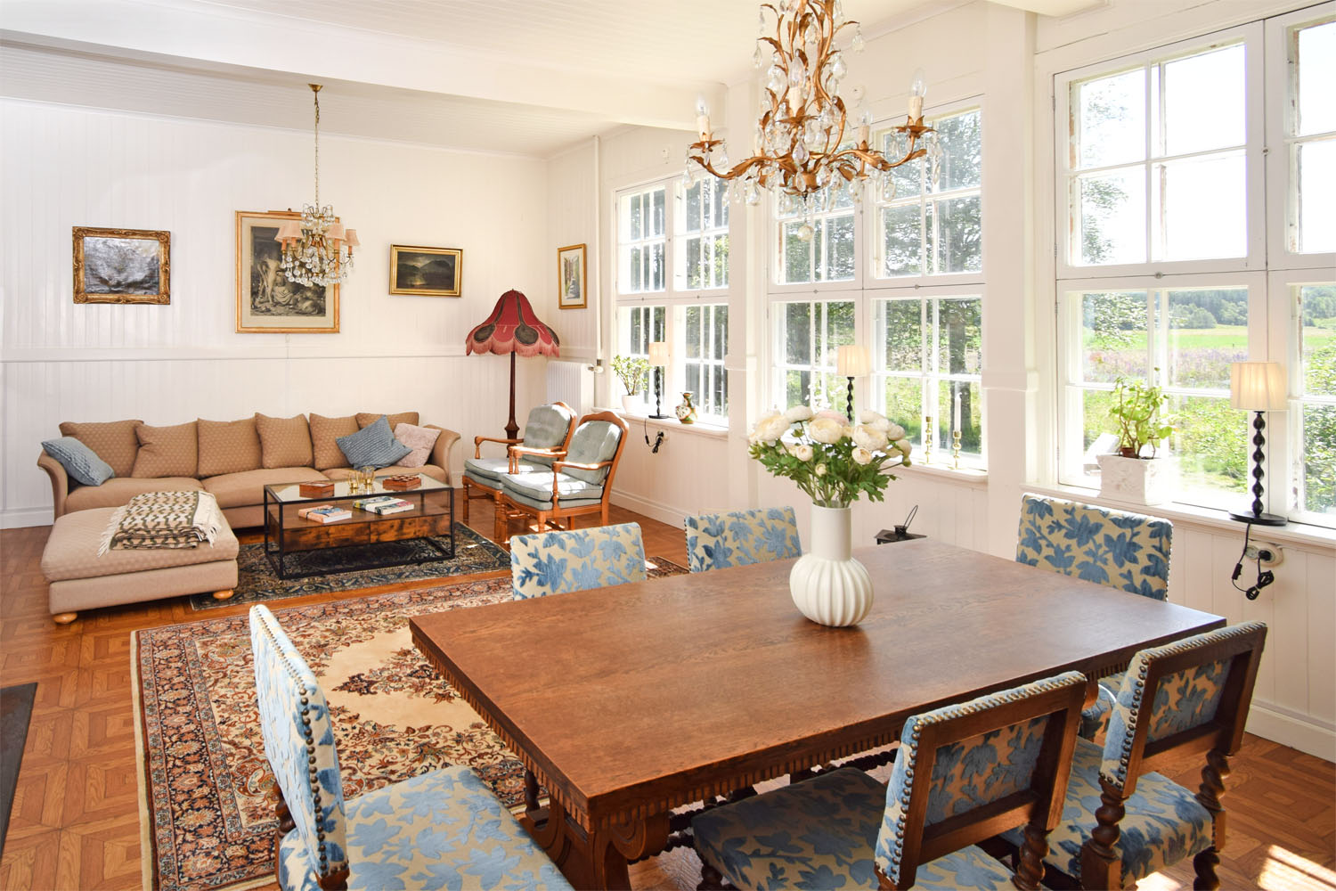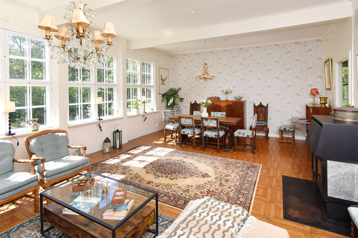 Den gamla skolsalen är renoverad och bevarad vilket har skapat en plats för sammankomster, middagar och allrum utöver det vanliga främst tack vare de stora fönsterpartierna samt den storslagna takhöjden. Salen är av tilltagen storlek vilket gör att man får möjlighet till möblering på ett fritt sätt. Braskamin bidrager förutom själva mysfaktorn även till att skapa en möjlig driftskostnad som är låg i relation bostadens storlek. Snygg plastmatta som liknar ekparkett är anpassad till rummets övriga inredning. Väggar i form av stående ljust målad bröstpanel förutom tapetserad vägg i tidsenligt mönster till höger om dörr intill den pampiga middags-salen och allrummet. De stora fönsterpartierna med totalt 48 fönster har praktiska innanfönster från en tid då bostaden var skola.