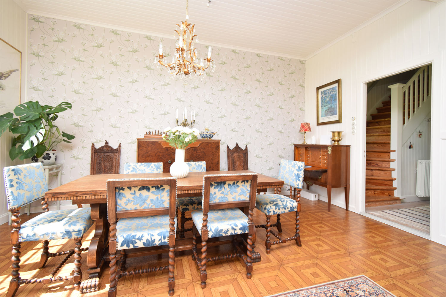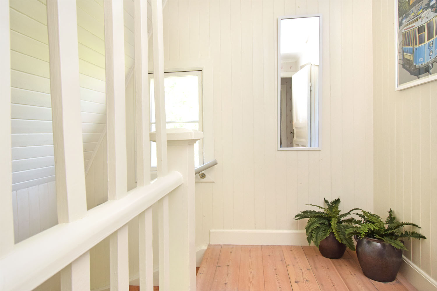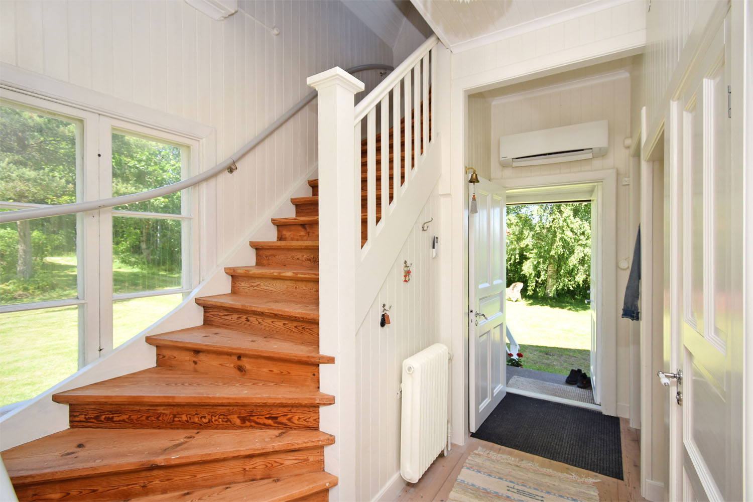 Även här har vi bevarad trappa från den tiden då bostaden var en byskola med start 1934. Undervåningen var på den tiden kapprum och skolsal. Trappan är byggd i bostadens ena hörn med genuin ledstång och trappräcke övre plan Fönster under innertaket skapar ett ljust trapphus Diskret stående målad träpanel från hall nedre plan upp till övre planet Stående ljus träpanel ger rymd åt det bevarade trapphuset med snedtak upp mot taknock Övre planet har slipade, laserade och genuina trägolv som samtliga rum i bostaden Hall med inspektionslucka upp till vindsutrymme Vinden isolerad med sågspån. Lätt att inspektera innertak och takbjälkar samt murstock