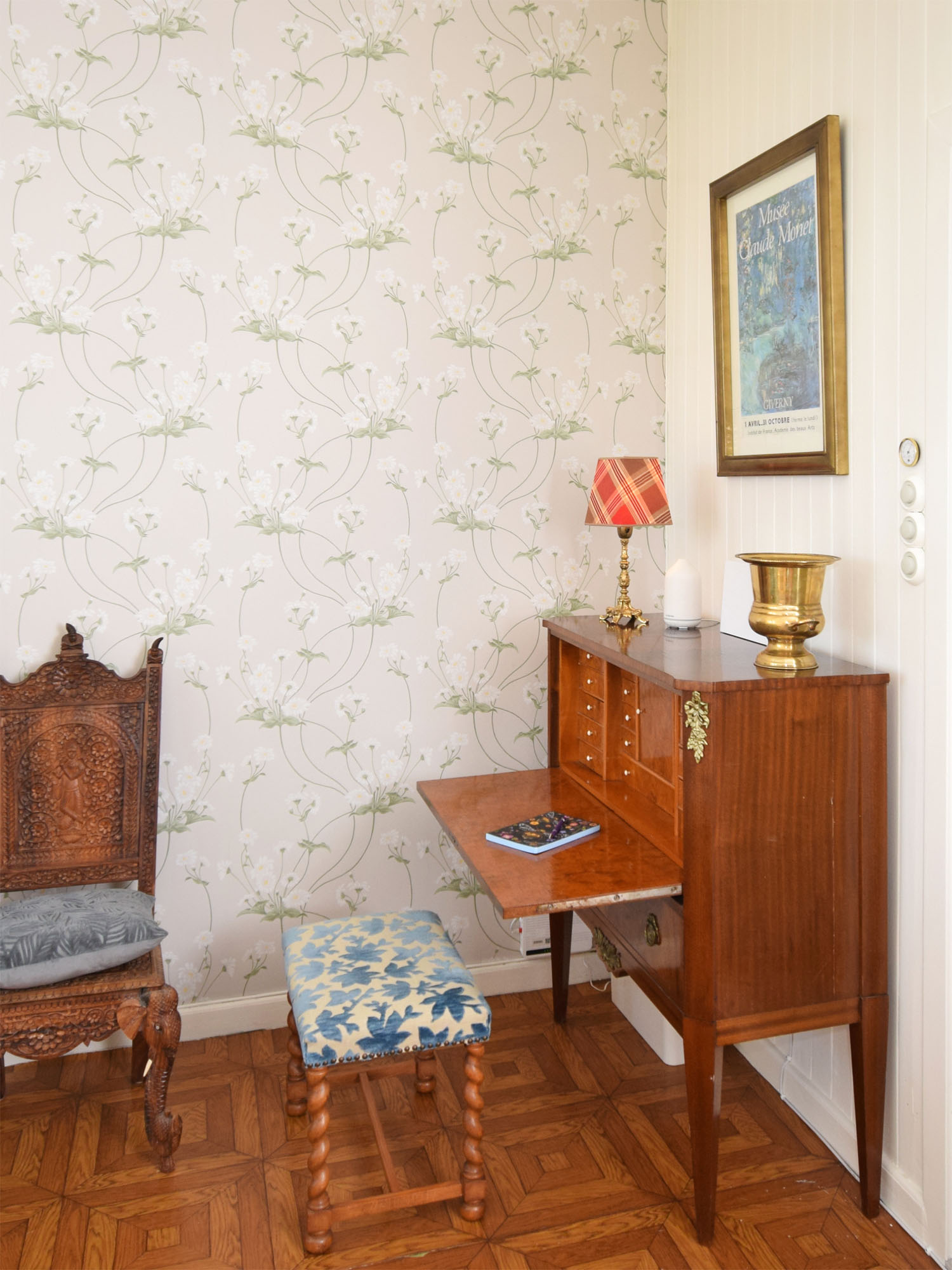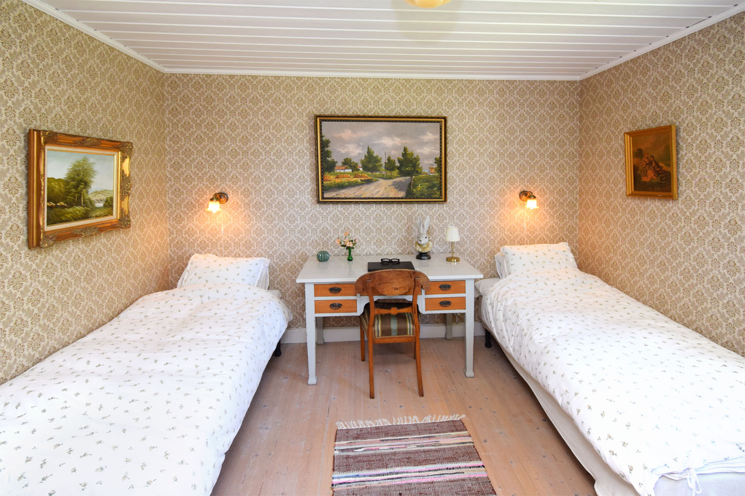 Det andra sovrummet är charmigt inrett med matchande tapeter i mönster och tidsenlig kulör Rummet är idag inrett med bla: två enkelsängar, tidsenligt skrivbord och stol samt byrå. Elelement med termostat under fönster med utsikt över ingång med bla stenportar och blomster, rabatter och växter Bevarade ljusa trägolv. Tapetserade väggar. Ljus träpanel i tak. Breda golvlister Spegeldörr och bevarad dörrstock