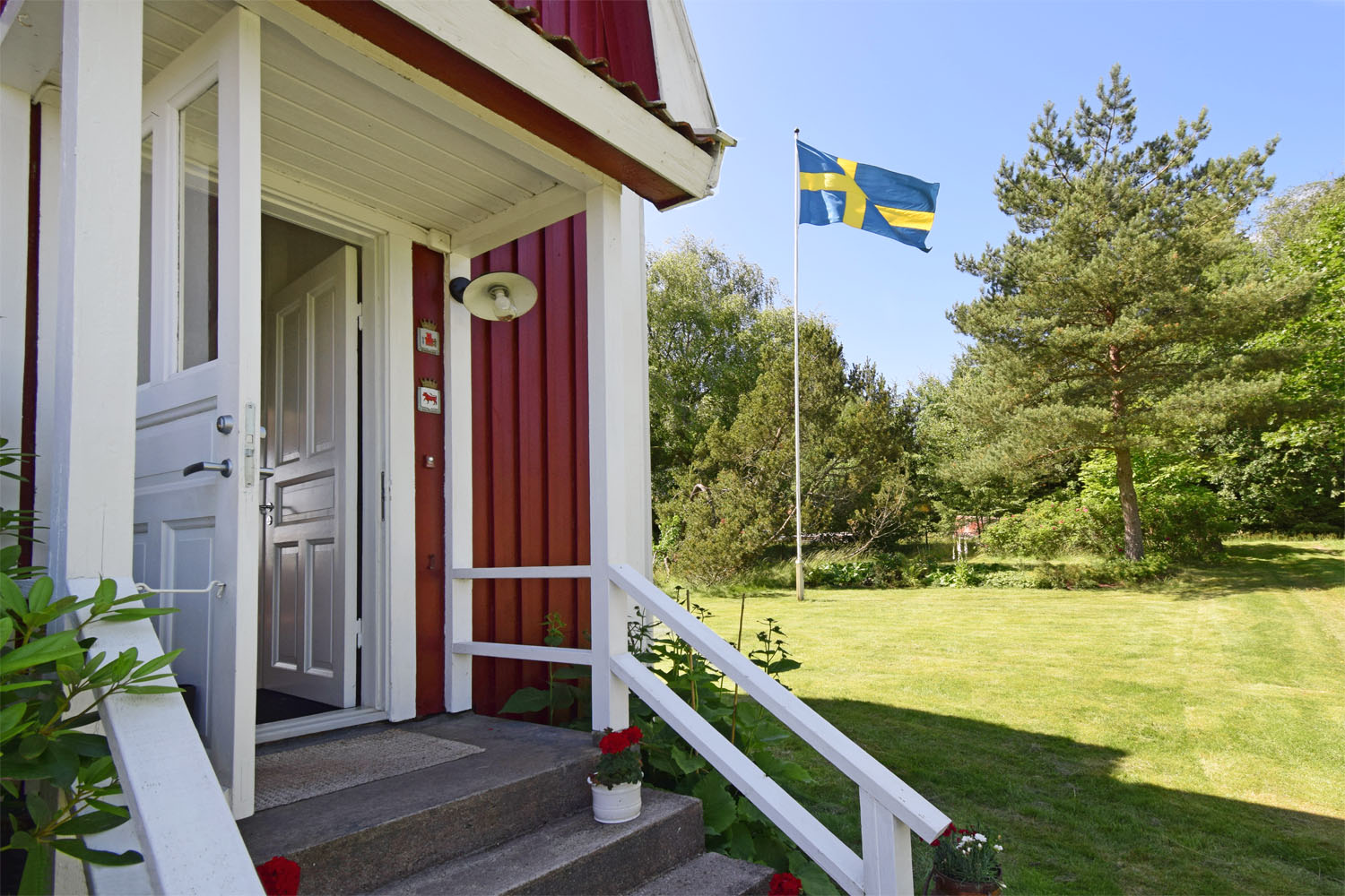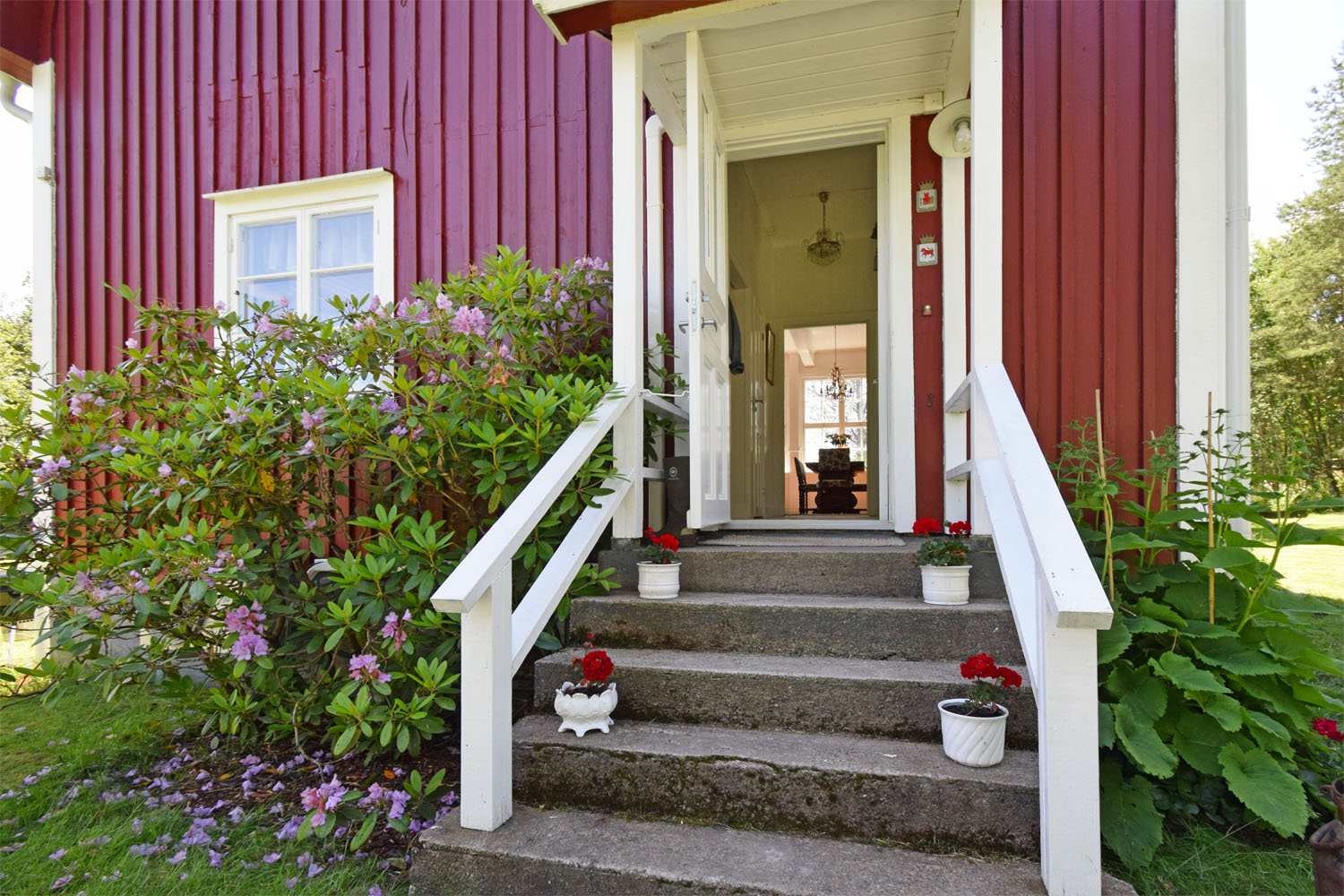 Farstukvist med genuin stentrappa. Vitmålat träräcke. Ingången överbyggd med tak. Bevarad skomakarlampa skapar tillsammans med övrig inredning ett lantligt och välkomnande som personligt intryck från första stund. Luftvärmepump installerad över ytterdörr. El-element med termostat i äldre design. Buskar och blomsterarrangemang i anslutning till entrétrappen.