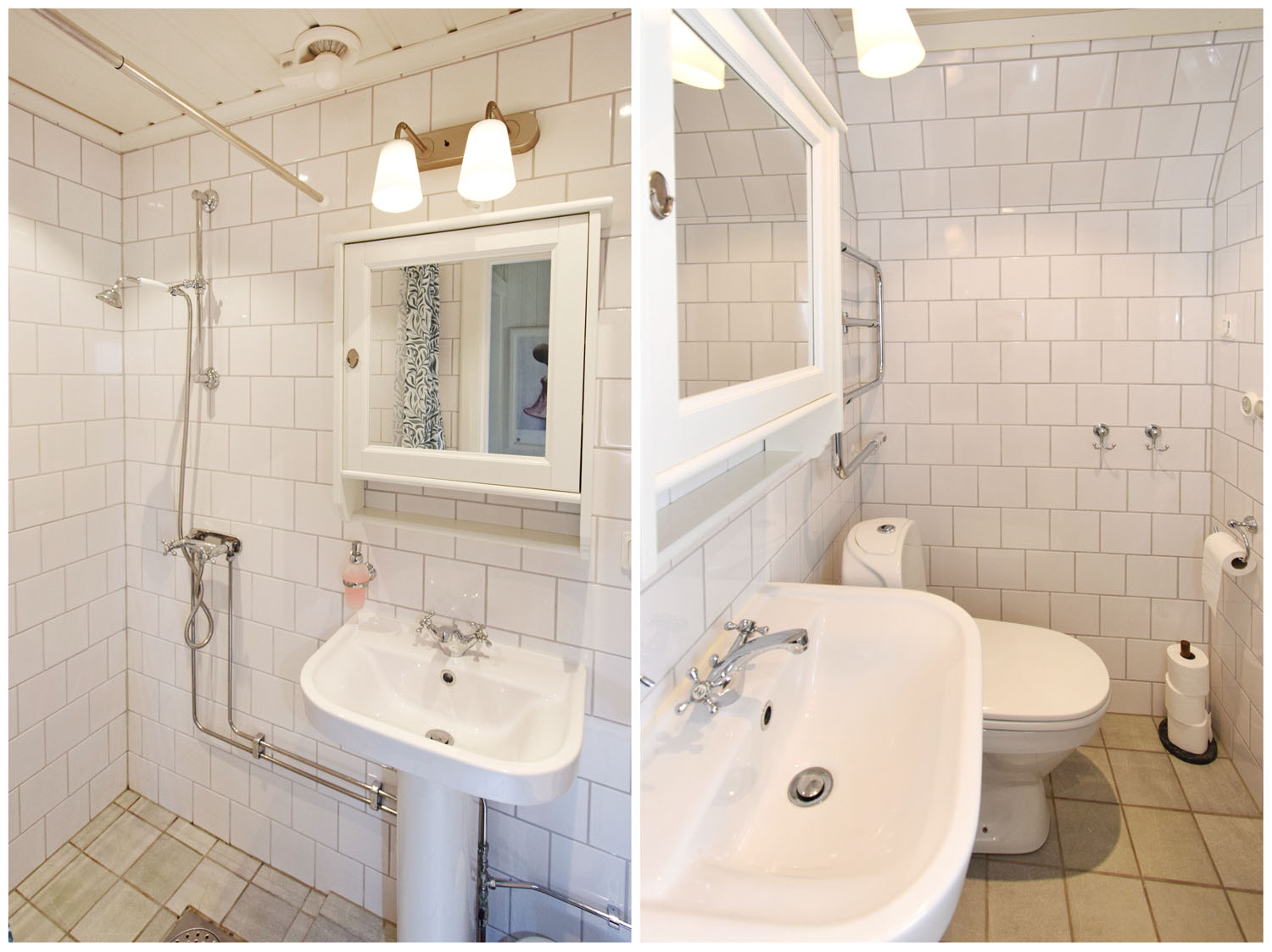 Badrummet ligger i direkt anslutning till hallen. Ljust badrum med klinkergolv och golvvärme. Kaklade ljusa väggar. Duschhörna med golvbrunn. Tvättställ och handfat med spegelskåp. Belysning över spegel. Separat våtrumsfläkt. WC stol och elektrisk torkställ. Snedtak i ena änden på badrummet även här kaklad vägg Spotlights infällda i tak