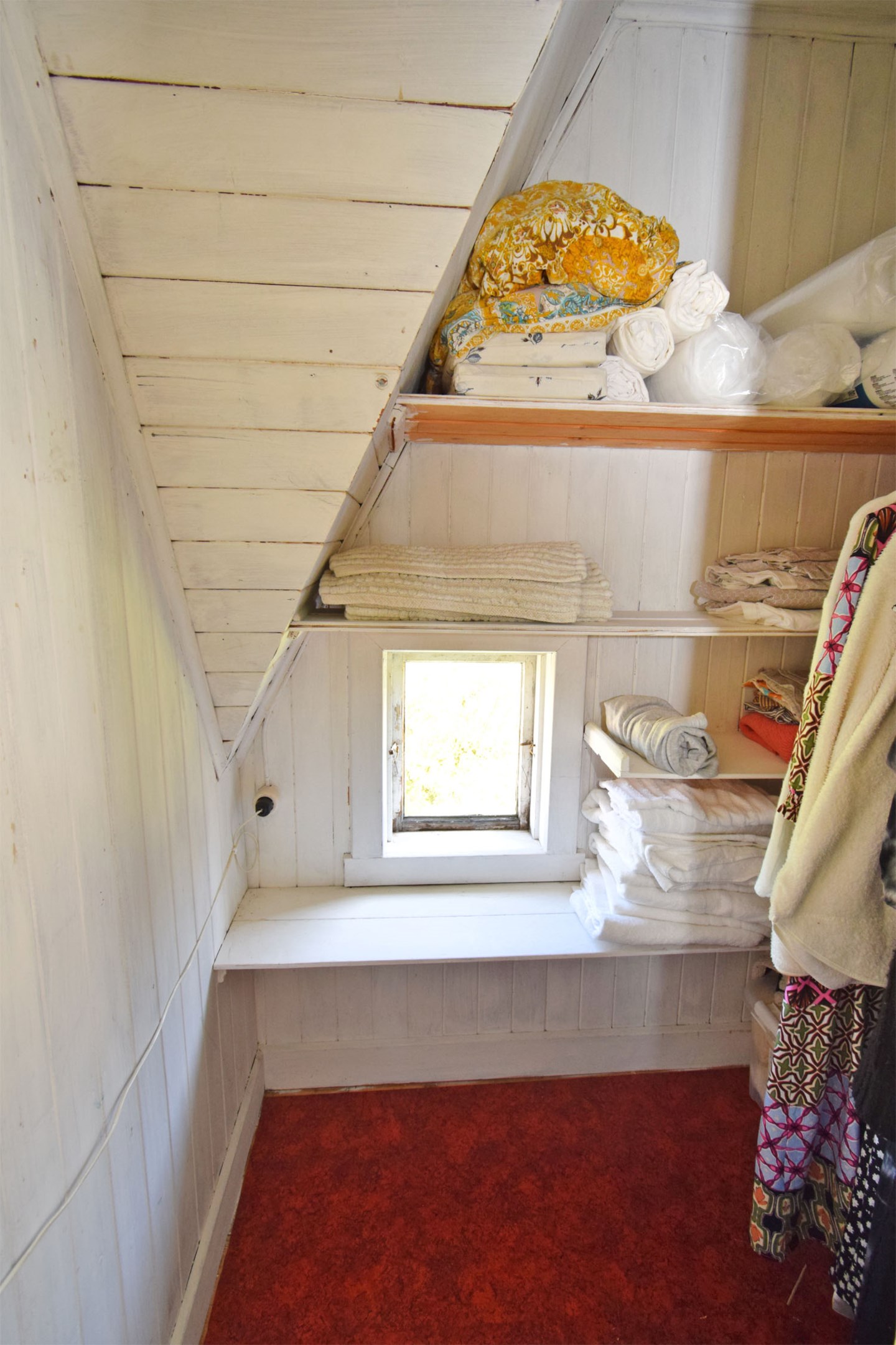Praktiskt allrum som kan nyttjas som bland annat kontor, arbetsrum, ateljé eller lekrum. Två dörrar leder till bra förrådsutrymmen och sidogarderober med snedtak. Här stod tidigare en eldstad där plattan är bevarad intill murstocken Ett fönster med utsikt över den välskötta innergården med gräsmatta och träd och växter Väl bevarade trägolv som på alla andra rum i bostaden. Ljust målade väggar Målad träpanel i tak. Breda golvlister förstärker intryck av en tid när byggnaden var byskola