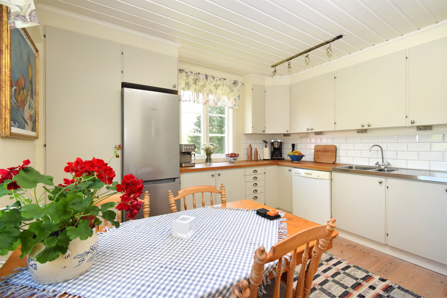 Direkt till vänster i anslutning till den ljusa hallen ligger ett ljust, lantligt renoverat kök med även här bevarade ljusa trägolv. Tapetserade väggar i matchande mönster och färgsättning Köket är utrustat med diskmaskin, ugn och fläkt. Kyl och frys (kombinerad) Spis och fläkt. Köket har bra med arbetsbänkar, över och underskåp utöver diskbänk och diskho Här finns plats för matbord. Två fönster med bra ljusinsläpp från trädgård och ingångsparti Kaklad vägg. Fristående mikrougn. Spotlights. Tak med pärlspont, målad