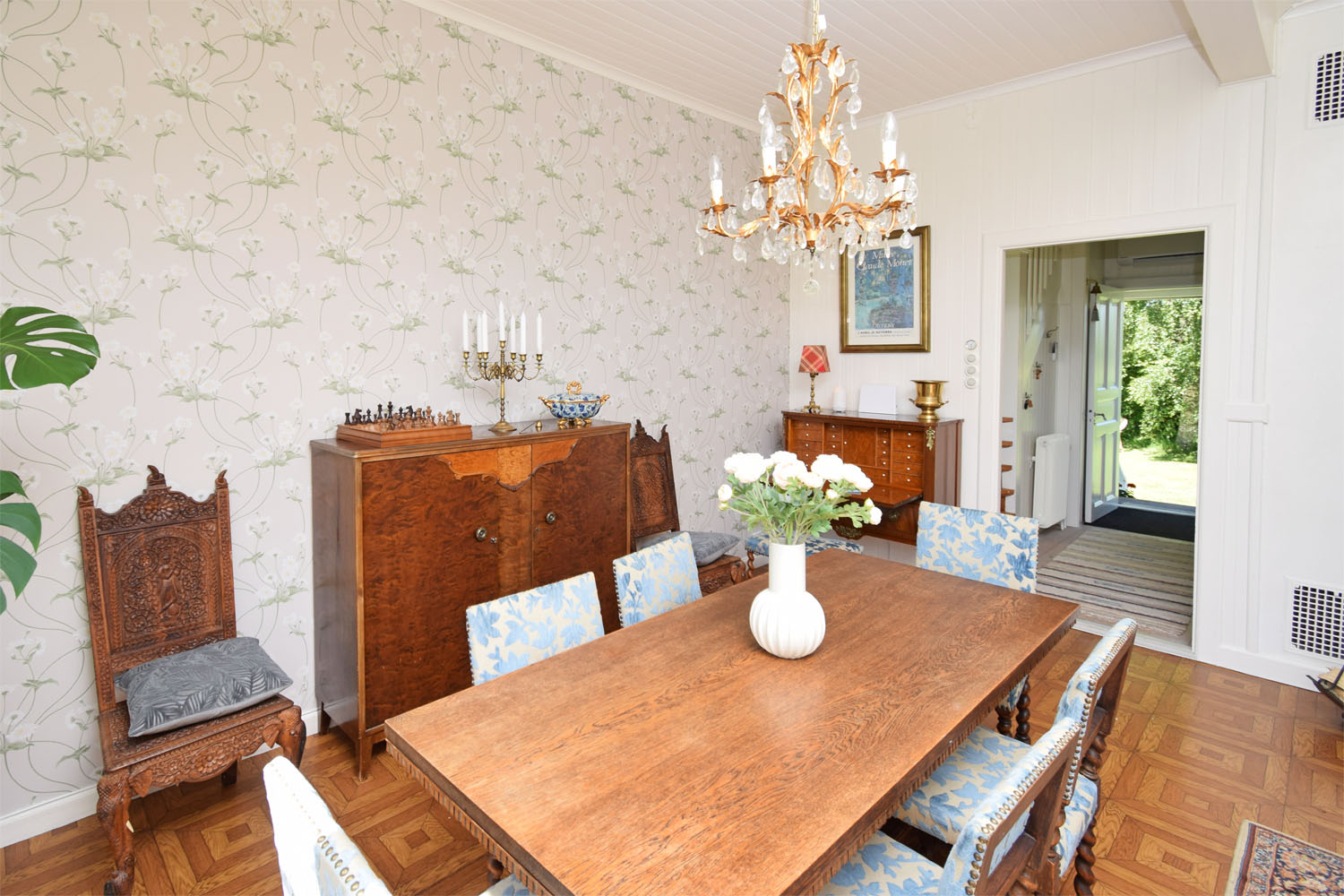 Ljus hall med högt i tak och målade väggar. Bevarade trägolv. Plats för avgängning av kläder Kristallkronan i taket ger bostaden ett extra lyft liksom ett flertal utvalda inredningsdetaljer på båda våningsplanen i samtliga rum inklusive köket Separat dörr för nedgång till den inredda källaren med CTC panna, vattenpump, huvudkran för inkommande vatten, expansionskärl, hydrofor/trycktank, varmvattenberedare och separat vattenfilter och björnfilter