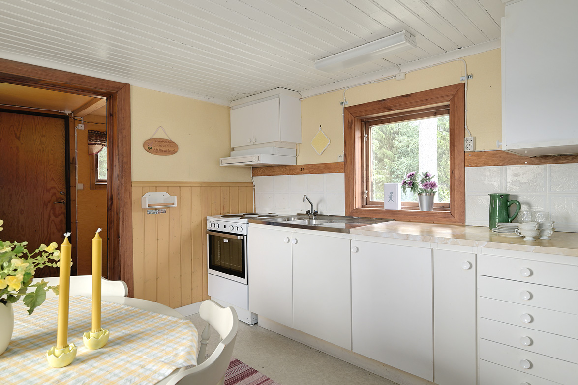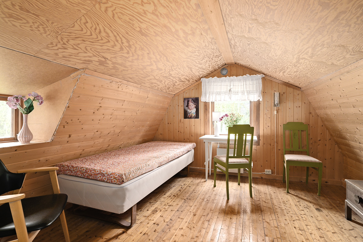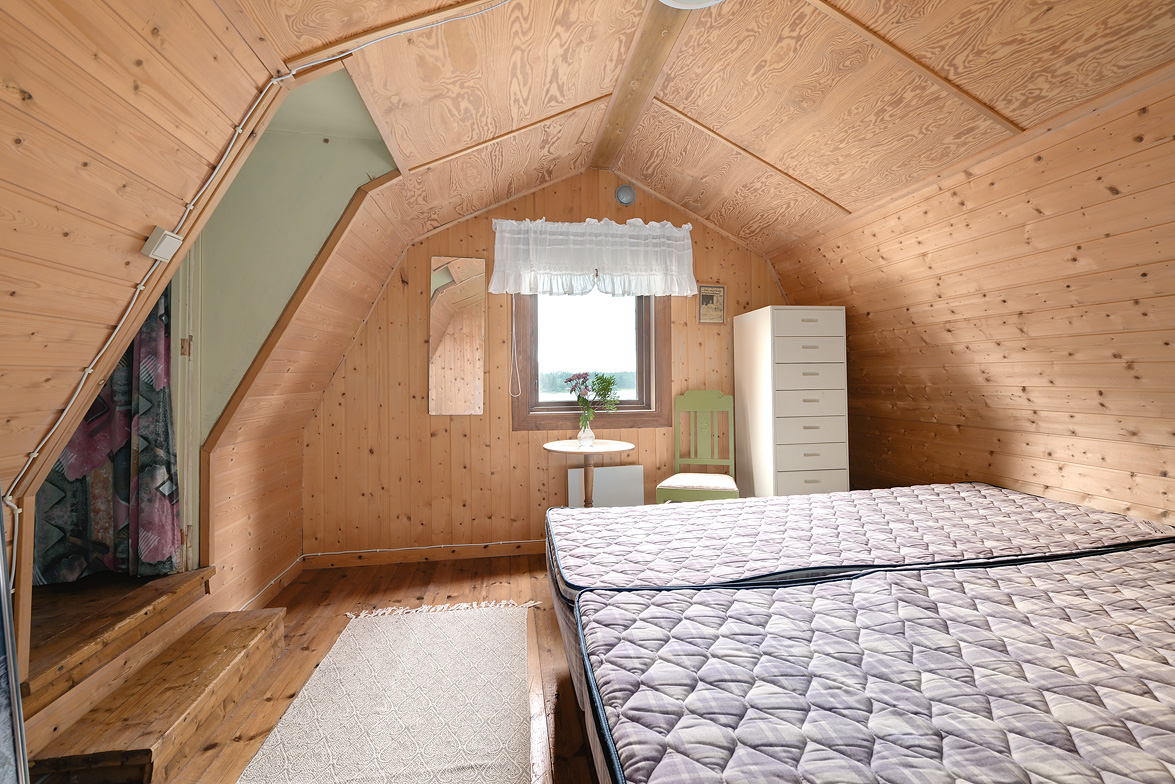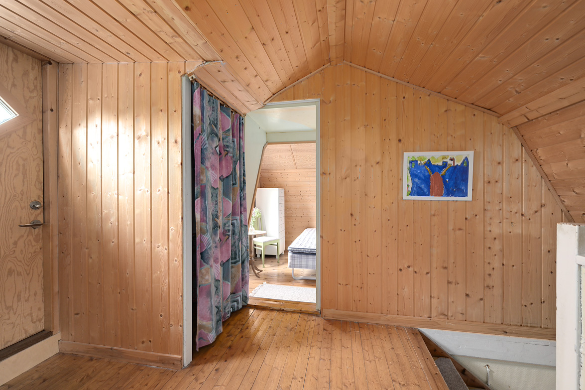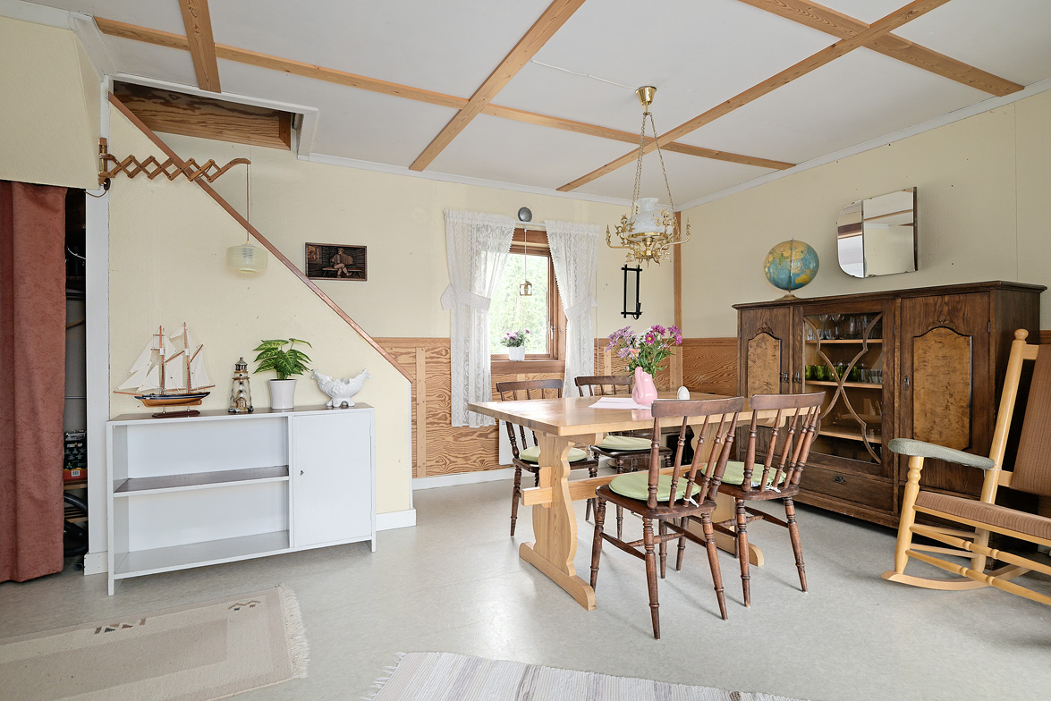 Hall Entrén till huset sker via en tillbyggd hall Kök Kök med matplats. I köket finns spis med fläkt samt en kyl/frys. Vardagsrum Stort vardagsrum med ett fint fönsterparti mot väster där man har utsikt mot Rinneln och fjärden. Från vardagsrummet har man utgång till en söderaltan. Övervåning Hall Övre hall med utgång till en stor altan med västerläge. Sovrum Två sovrum med trägolv, trätak och panelväggar. Husets båda altaner har underhållsbehov, men de är båda stora och soliga och väl värda att reparera. Fastigheten säljs med alla inventarier.