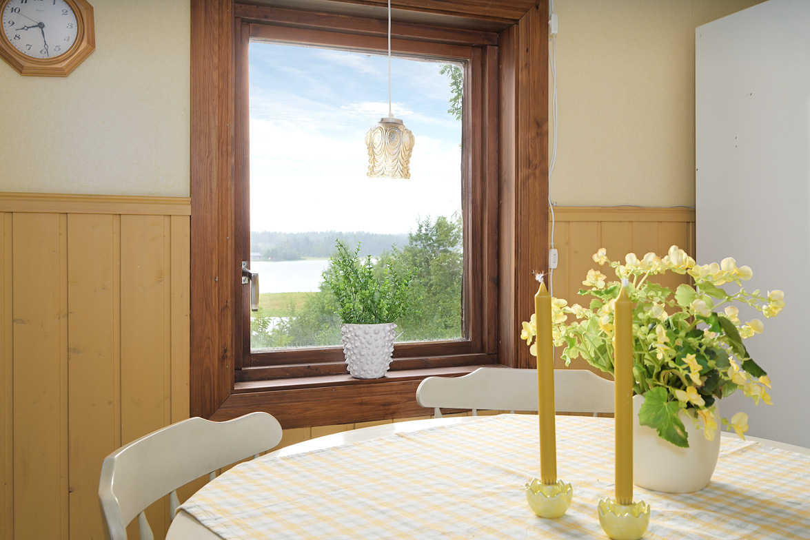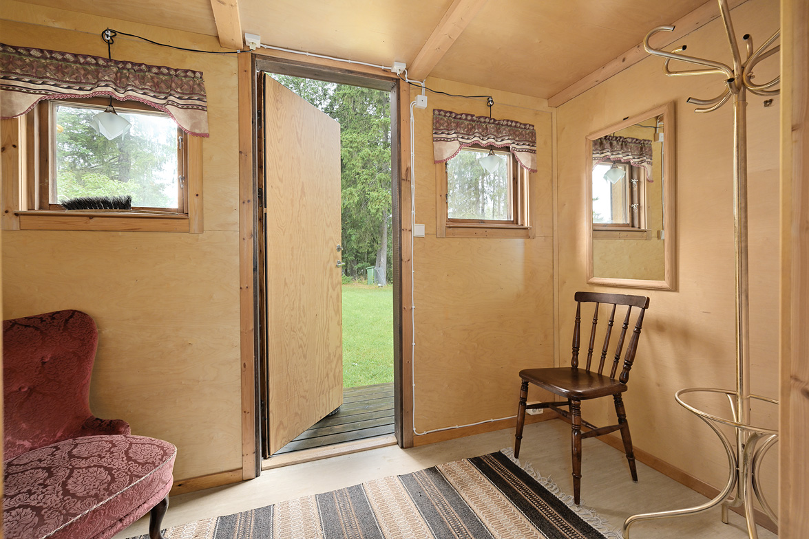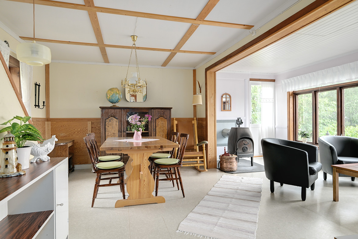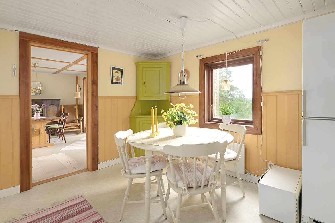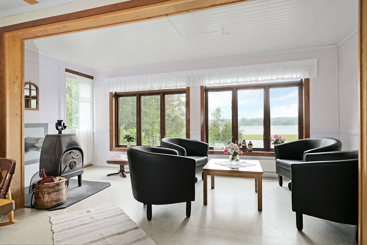 Hall Entrén till huset sker via en tillbyggd hall Kök Kök med matplats. I köket finns spis med fläkt samt en kyl/frys. Vardagsrum Stort vardagsrum med ett fint fönsterparti mot väster där man har utsikt mot Rinneln och fjärden. Från vardagsrummet har man utgång till en söderaltan. Övervåning Hall Övre hall med utgång till en stor altan med västerläge. Sovrum Två sovrum med trägolv, trätak och panelväggar. Husets båda altaner har underhållsbehov, men de är båda stora och soliga och väl värda att reparera. Fastigheten säljs med alla inventarier.