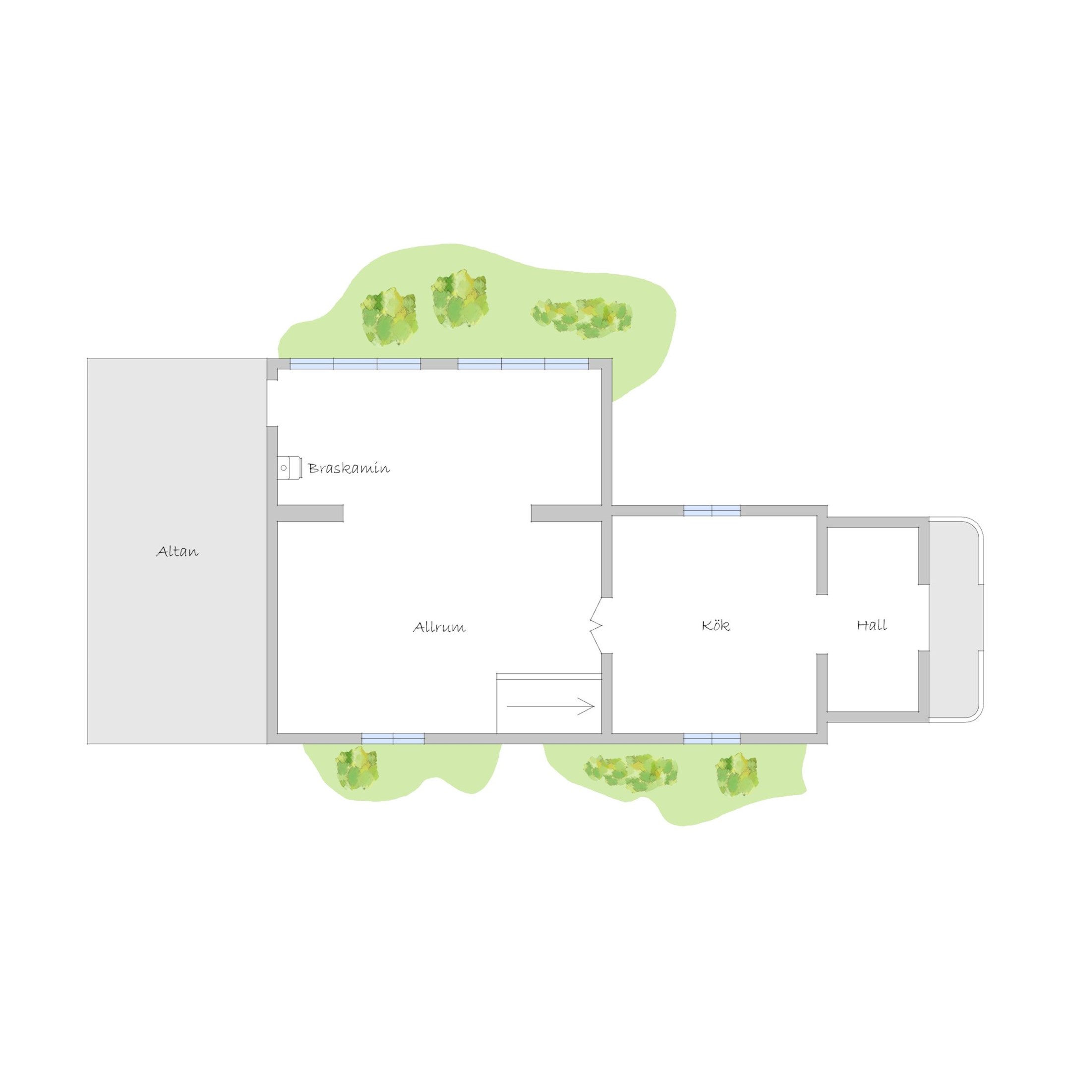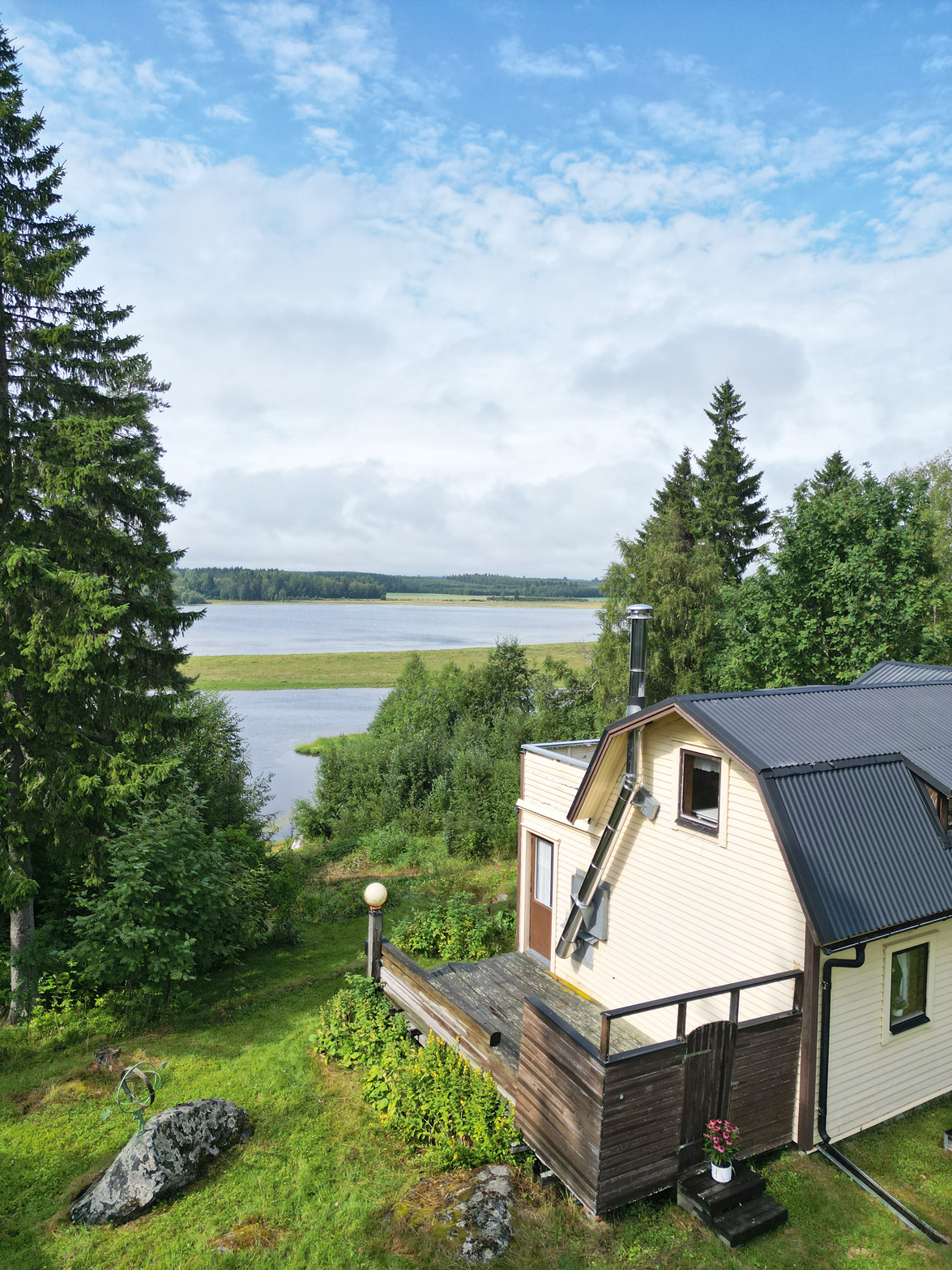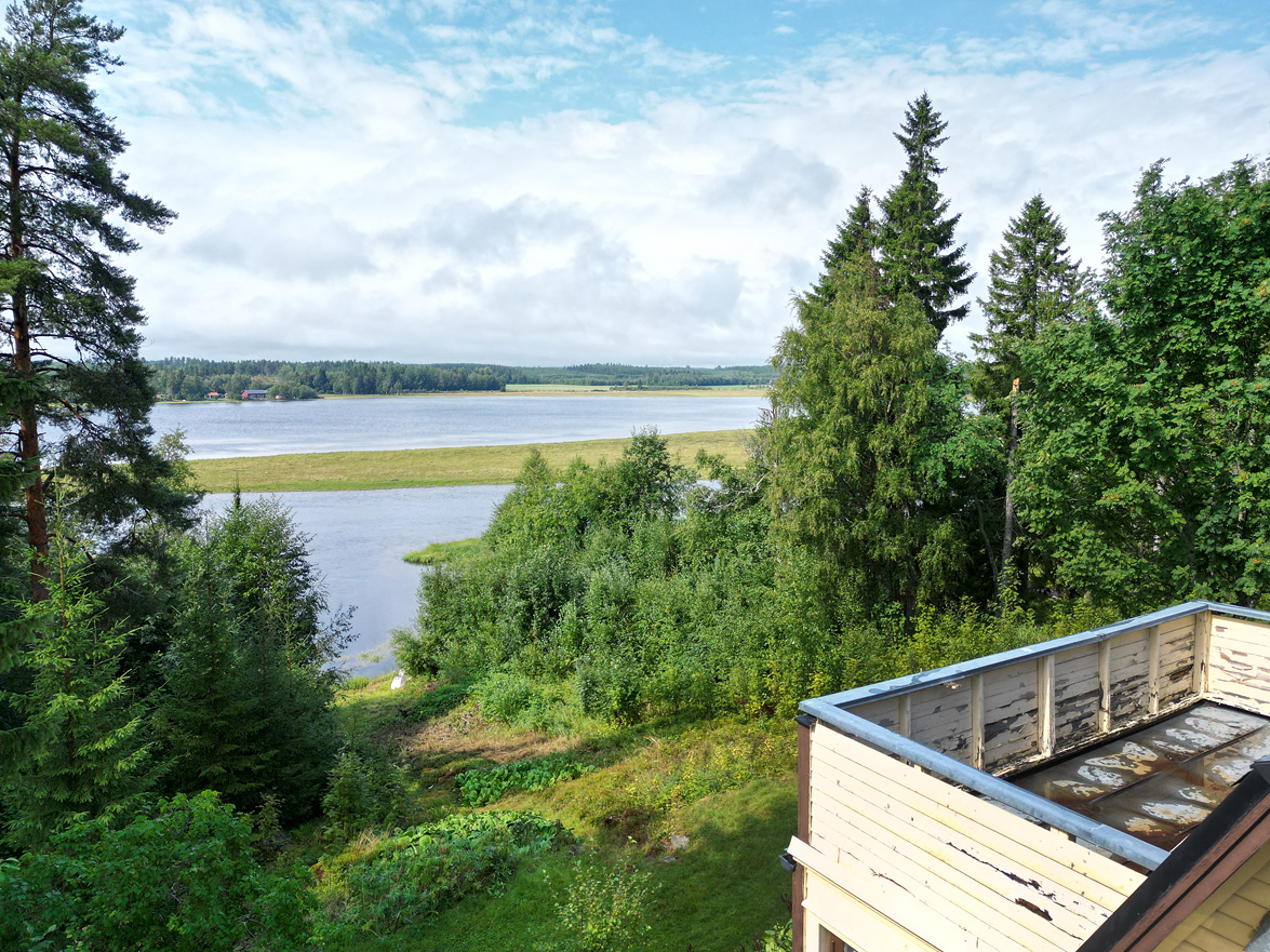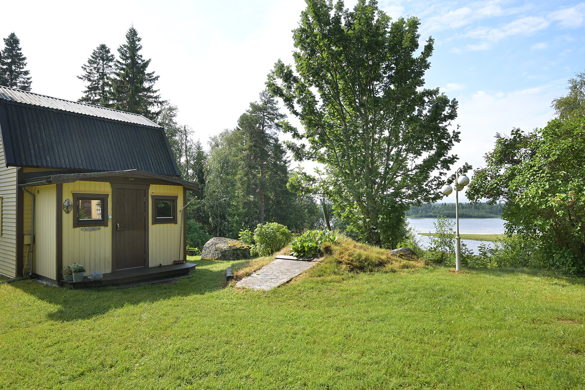 Hall Entrén till huset sker via en tillbyggd hall Kök Kök med matplats. I köket finns spis med fläkt samt en kyl/frys. Vardagsrum Stort vardagsrum med ett fint fönsterparti mot väster där man har utsikt mot Rinneln och fjärden. Från vardagsrummet har man utgång till en söderaltan. Övervåning Hall Övre hall med utgång till en stor altan med västerläge. Sovrum Två sovrum med trägolv, trätak och panelväggar. Husets båda altaner har underhållsbehov, men de är båda stora och soliga och väl värda att reparera. Fastigheten säljs med alla inventarier.