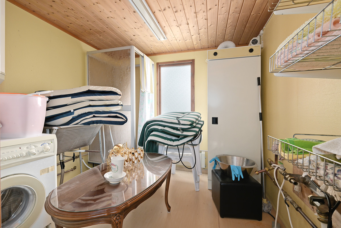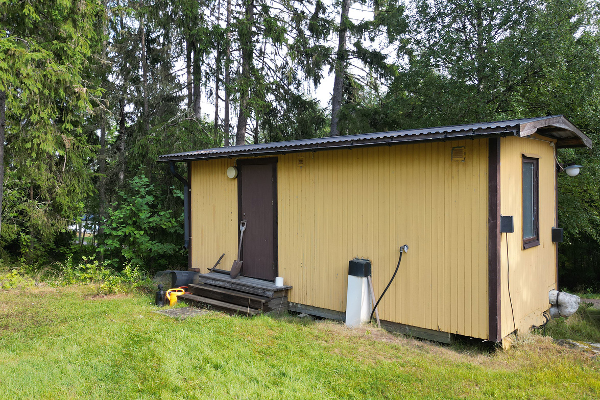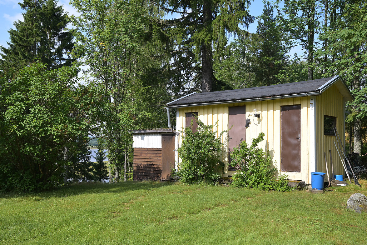 Varmbonad sidobyggnad med duschkabin, tvättmaskin och mulltoa. Två äldre förrådsbyggnader.
