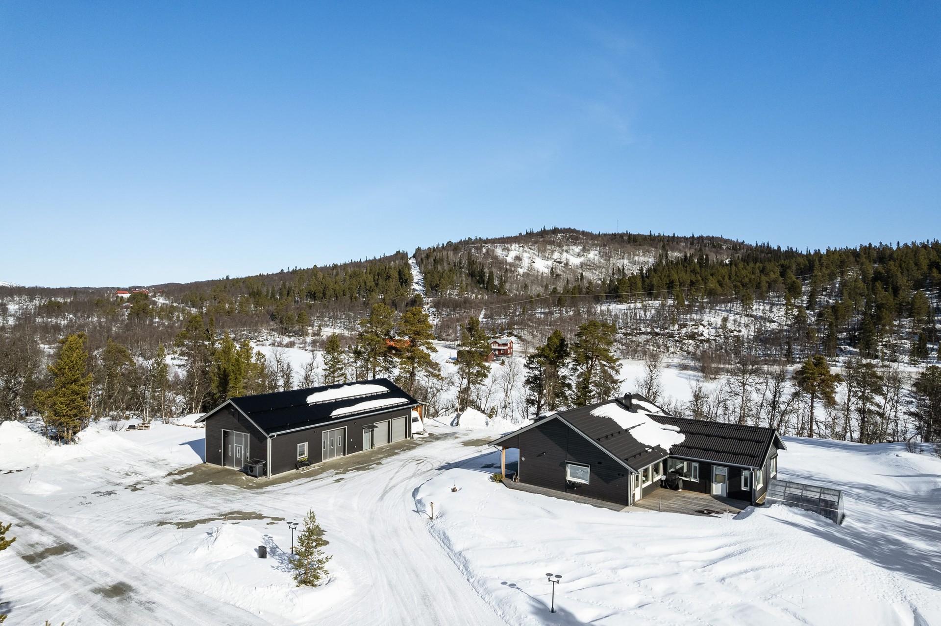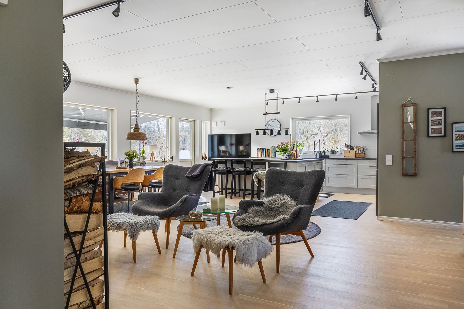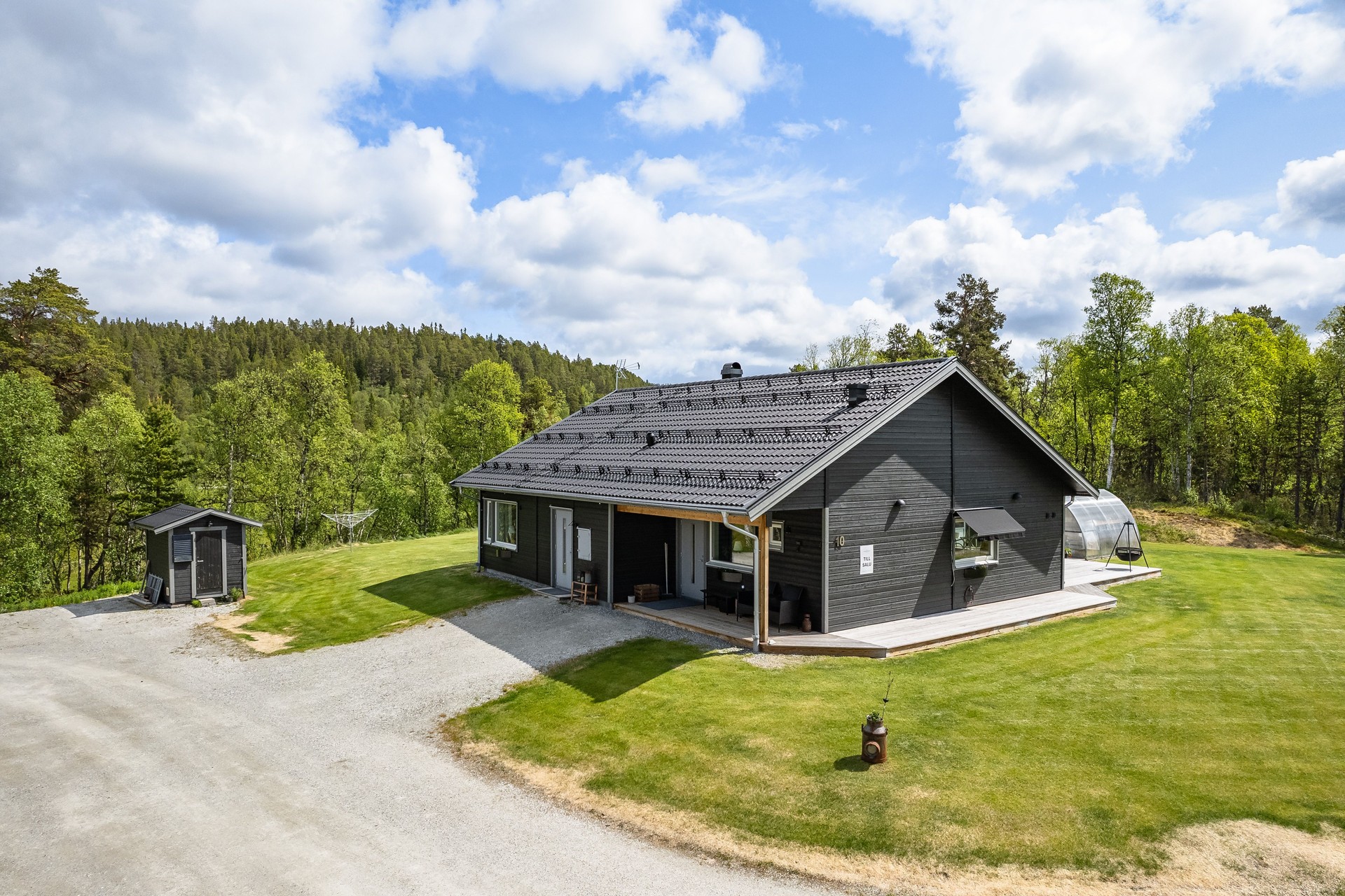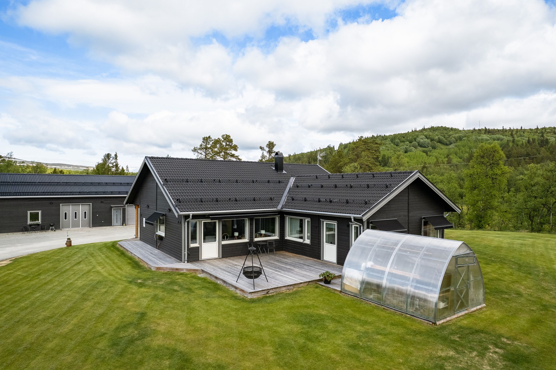 Ett drömboende strax utanför Bruksvallarna! Här på Stråndvägen 10, finns den här fina fastigheten som nu skall säljas. En underbar 1-plans villa som tillsammans med ett av västra Härjedalens lyxigaste garage skapar ett attraktivt boende med härlig gårdskaraktär i vacker omgivning. Gården som är belägen på den fina sandås som bildar en udde en bit uppströms Ljusnan från Flon, har härlig fjällutsikt mot Skarvarna och Kariknallen. Här bor du ljust, rofyllt och samtidigt med så många möjligheter som skapas genom de unika byggnaderna på just denna tomt. Bostadshuset är ett Myresjöhus på 157 kvm. boarea som har allt man kan önska av ett "nytt", fräscht hus från 2019. Huset är välhållet, har stora sällskapsytor och fyra sovrum (varav ett används som kontor idag). Här känns allt välplanerat och inget har lämnats åt slumpen. Huvudentrén är praktisk med sitt kapprum till höger och bra förvaring bakom skjutbara spegeldörrar. Kök och vardagsrum har täljstensklädd braskamin, en fin färgsättning med dova färger på väggar och golv och väl tilltaget kök i öppen planlösning med grå inredning, köksö, dubbla kyl/frys och skafferi. Bredvid vardagsrummet finns ett allrum med ingång till tre sovrum, kontor och helkaklat badrum. Närmare groventrén kombinerad med tvättstuga, finns ett större badrum med dubbla handfat, takdusch och bastu. I anslutning till det större badrummet finns sovrum 4, "master bedroom" med klädkammare bredvid. Ett växthus i anslutning till altanen är drömmen för många. Precis som det fantastiska garaget är för andra. Vem vill inte pröva sina gröna fingrar, odla egna grönsaker och sen bara kunna öppna altandörren och gå ut i växthuset för att hämta in det som behövs för stunden till matlagningen. Garaget med en byggnadsarea om 192 kvm är något utöver det vanliga. Varmgarage-delen på hela 87 kvm. har vattenburen golvvärme, två vikportar och dessutom ett badrum med dusch, wc, handfat och tvättmaskin för tvätt av t. ex. arbetskläder. Vägg i vägg finns det oisolerade dubbelgaraget för två bilar, motordrivna portar och bra förrådsutrymmen. Garaget och huvudbyggnad stod klart 2019. År 2020 kompletterades garaget med en carport som passar bra för t ex. husvagn, husbil eller kanske gårdens traktor.