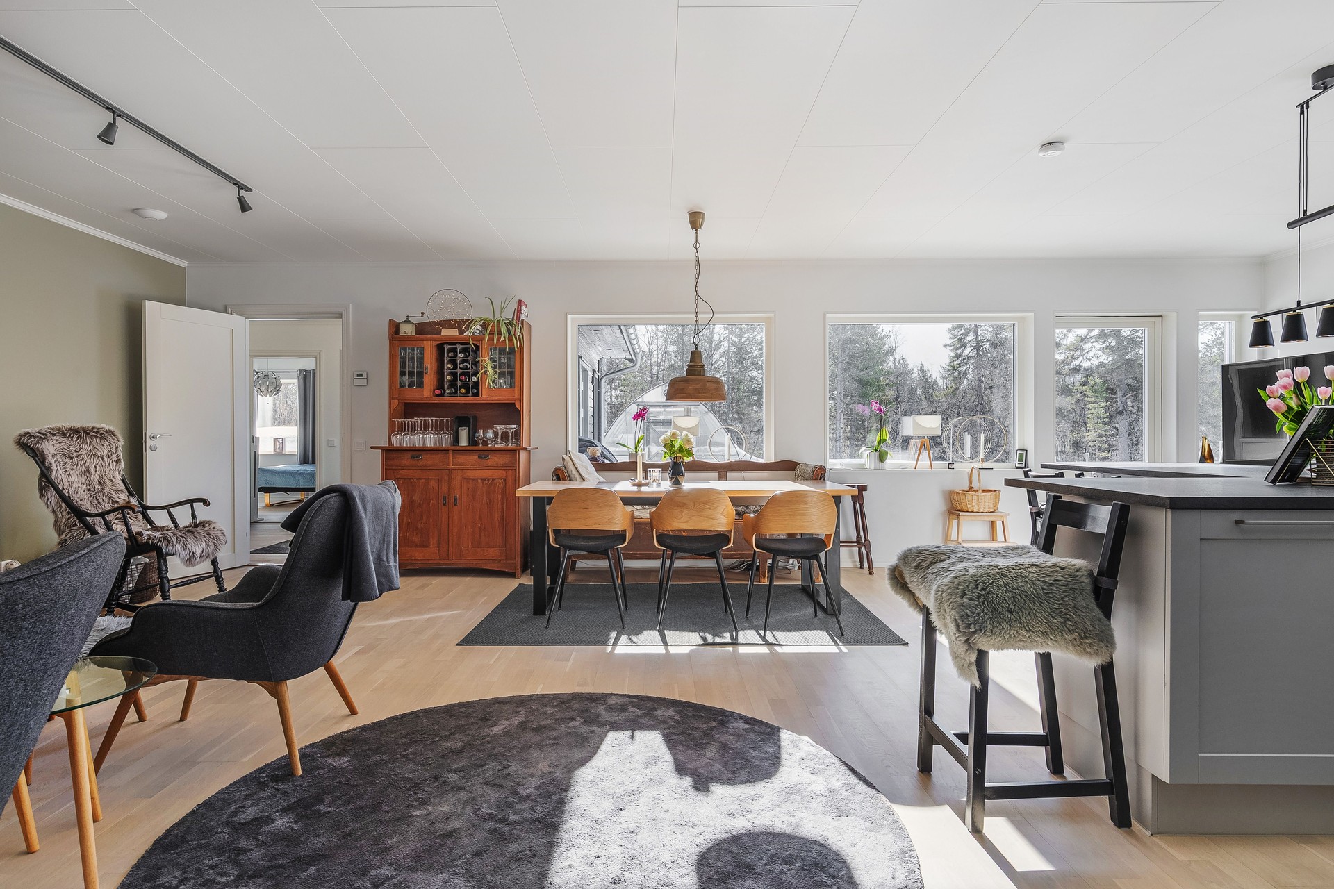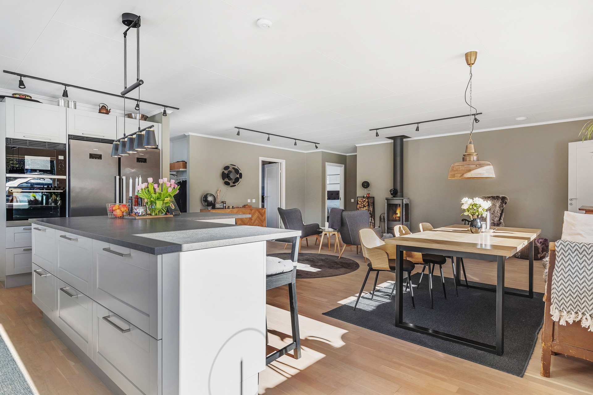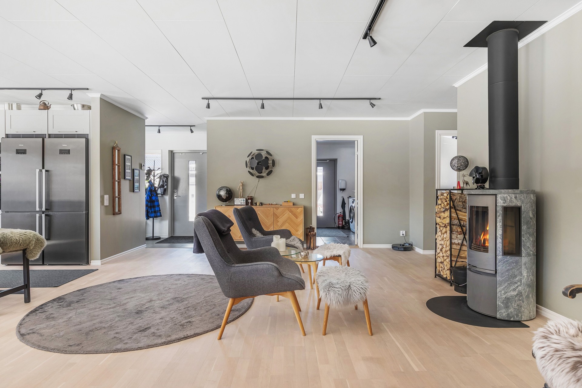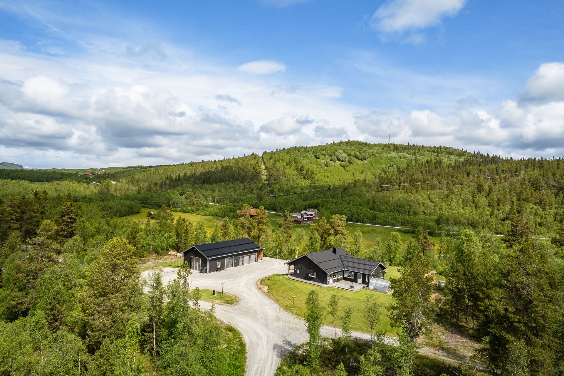 Ett drömboende strax utanför Bruksvallarna! Här på Stråndvägen 10, finns den här fina fastigheten som nu skall säljas. En underbar 1-plans villa som tillsammans med ett av västra Härjedalens lyxigaste garage skapar ett attraktivt boende med härlig gårdskaraktär i vacker omgivning. Gården som är belägen på den fina sandås som bildar en udde en bit uppströms Ljusnan från Flon, har härlig fjällutsikt mot Skarvarna och Kariknallen. Här bor du ljust, rofyllt och samtidigt med så många möjligheter som skapas genom de unika byggnaderna på just denna tomt. Bostadshuset är ett Myresjöhus på 157 kvm. boarea som har allt man kan önska av ett "nytt", fräscht hus från 2019. Huset är välhållet, har stora sällskapsytor och fyra sovrum (varav ett används som kontor idag). Här känns allt välplanerat och inget har lämnats åt slumpen. Huvudentrén är praktisk med sitt kapprum till höger och bra förvaring bakom skjutbara spegeldörrar. Kök och vardagsrum har täljstensklädd braskamin, en fin färgsättning med dova färger på väggar och golv och väl tilltaget kök i öppen planlösning med grå inredning, köksö, dubbla kyl/frys och skafferi. Bredvid vardagsrummet finns ett allrum med ingång till tre sovrum, kontor och helkaklat badrum. Närmare groventrén kombinerad med tvättstuga, finns ett större badrum med dubbla handfat, takdusch och bastu. I anslutning till det större badrummet finns sovrum 4, "master bedroom" med klädkammare bredvid. Ett växthus i anslutning till altanen är drömmen för många. Precis som det fantastiska garaget är för andra. Vem vill inte pröva sina gröna fingrar, odla egna grönsaker och sen bara kunna öppna altandörren och gå ut i växthuset för att hämta in det som behövs för stunden till matlagningen. Garaget med en byggnadsarea om 192 kvm är något utöver det vanliga. Varmgarage-delen på hela 87 kvm. har vattenburen golvvärme, två vikportar och dessutom ett badrum med dusch, wc, handfat och tvättmaskin för tvätt av t. ex. arbetskläder. Vägg i vägg finns det oisolerade dubbelgaraget för två bilar, motordrivna portar och bra förrådsutrymmen. Garaget och huvudbyggnad stod klart 2019. År 2020 kompletterades garaget med en carport som passar bra för t ex. husvagn, husbil eller kanske gårdens traktor.