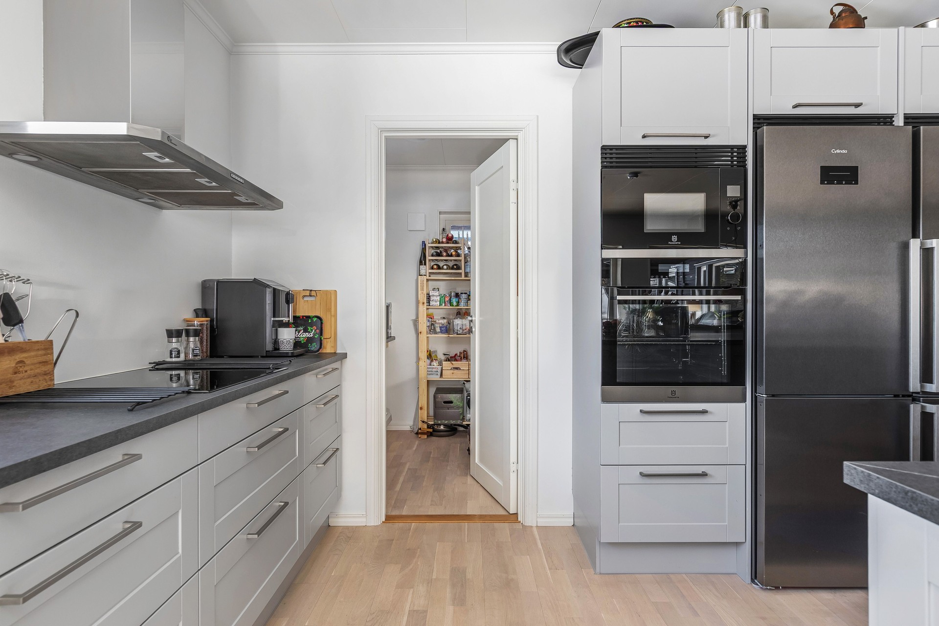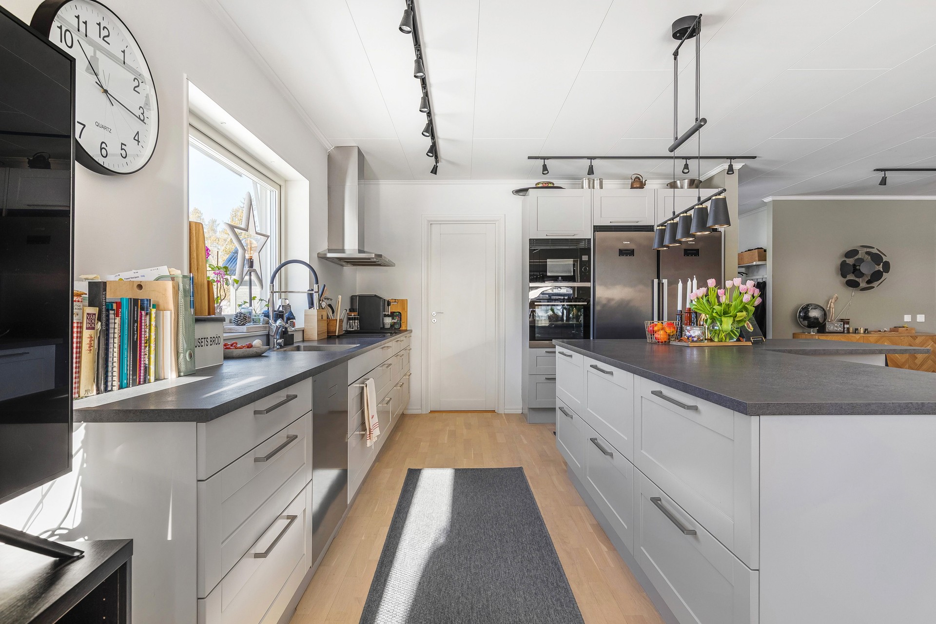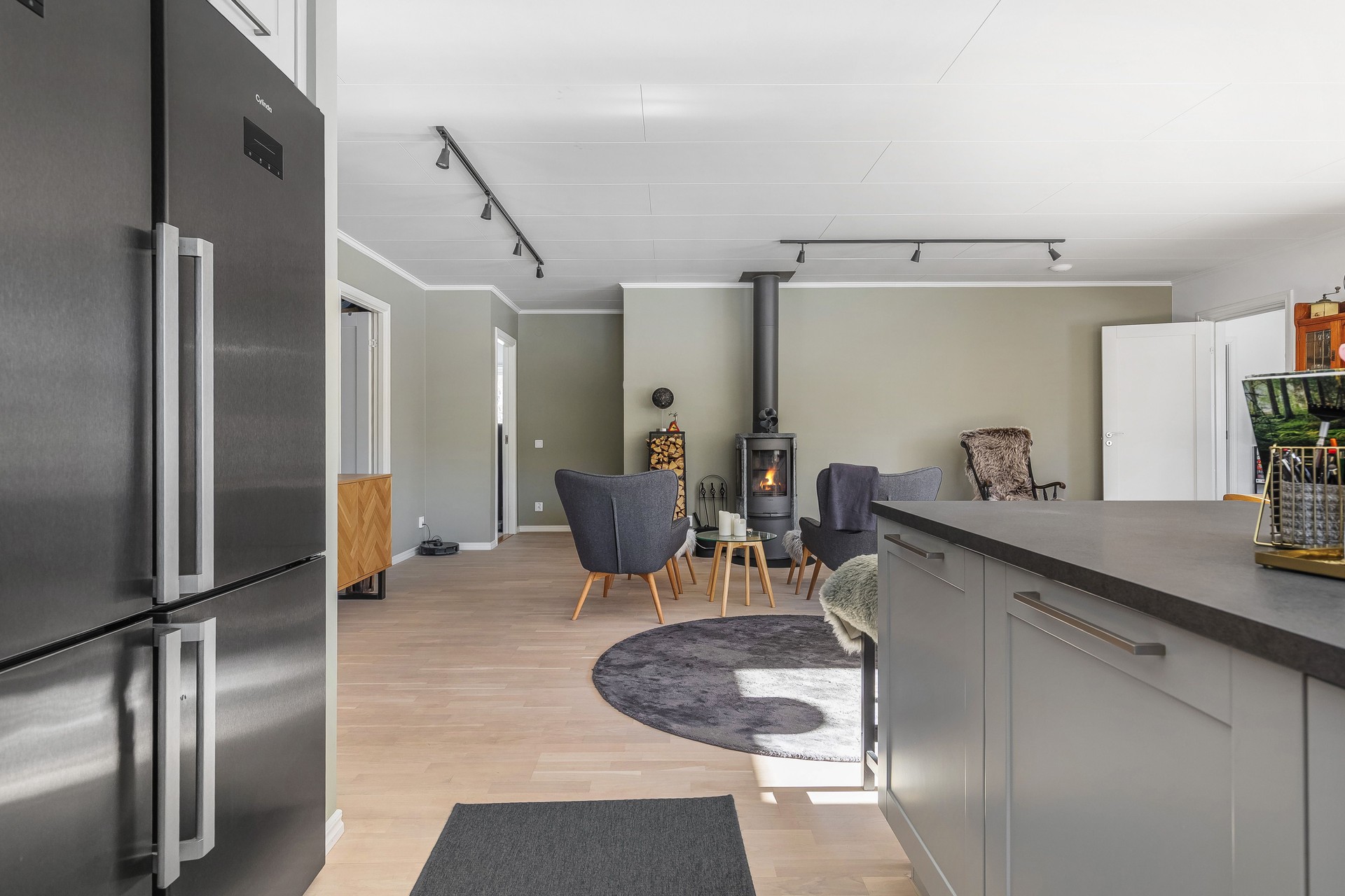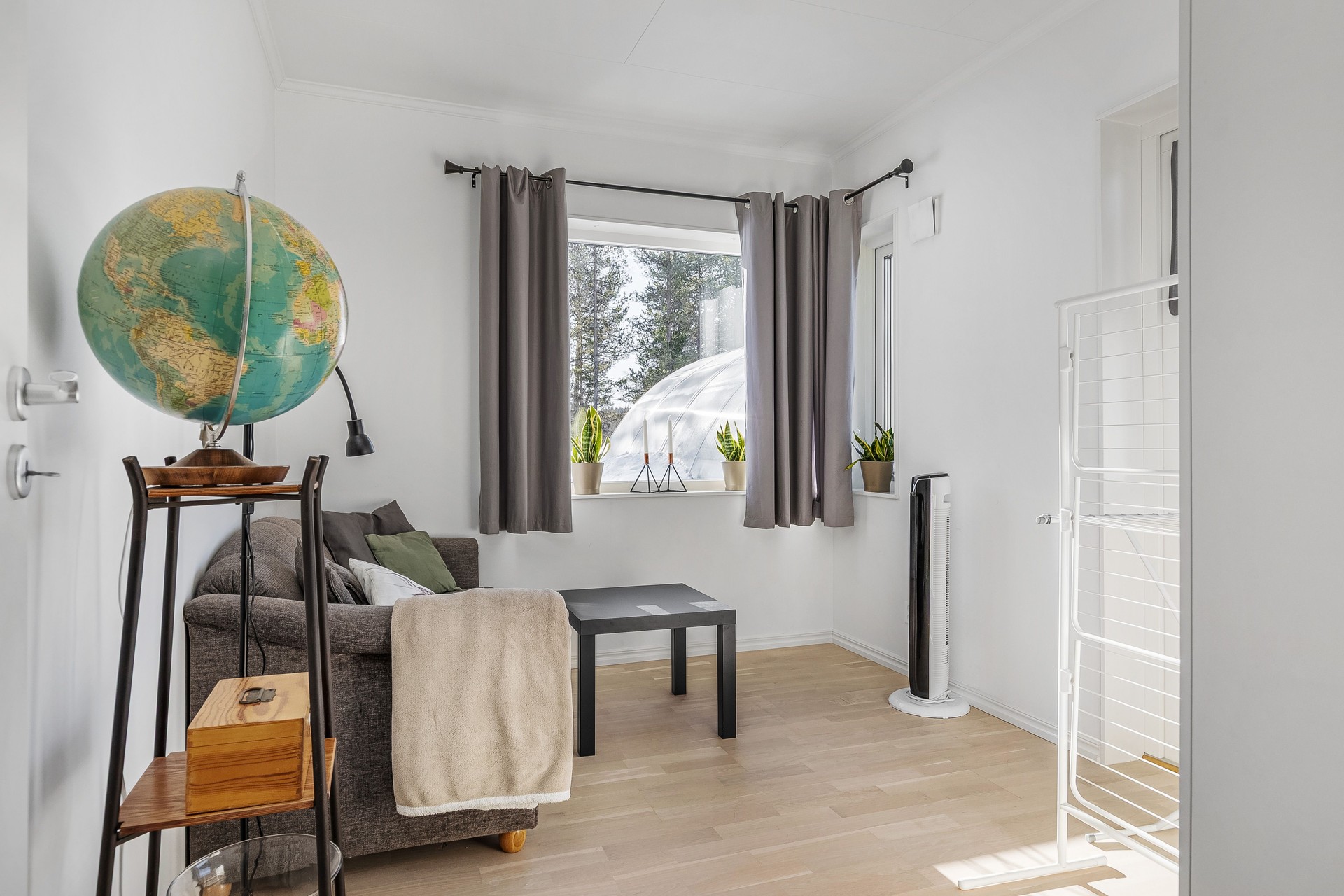 Fint utformad villa från Myresjöhus av modell Annedal som från grundritning ritats om och ändrats för att bli så bra som det är. Huset upplevs ljust, med stora ytor och bra planerat med två entréer, två fullstora badrum och dimensionerat kök i förhållande till husets storlek. Huvudentrén leder in till en hall med garderobsvägg bakom skjutbara glasdörrar till höger. Klinkergolv, målade skivor på väggar och i tak. Rakt fram från hallen finns kök och vardagsrum med större köksö i anslutning till köket. Rummet är stort och har en täljstensklädd braskamin till vänster i rummet. I köket finns ett stort skafferi med bra hyllförvaring. Köksutrustningen består av rostfria vitvaror så som dubbla kyl/frys (2023), diskmaskin (2022), fläktkåpa med fläkt (2019), glashäll med induktion (2024), inbyggnadsugn (2024) och mikrovågsugn (2024). Rostfri ho nedfälld i laminatskiva. Laminatgolv, målade skivor på väggar och i tak. I vinkel av huset finns ett ytterligare, lite mindre allrum som ansluter till badrum 2, sovrum 2, 3 och 4 (idag kontor). Samtliga rum har ytskikt med laminatgolv, målade skivor på väggar och i tak. Badrummet i anslutning till allrummet har klinker på golv, kakel på väggar och målade skivor i tak. Badrumsinredningen består av wc, handfat med kommod samt dusch med glasdörrar och elektrisk handdukstork samt fönster för vädring. Till vänster, vägg i vägg med huvudentrén, finns tvättstuga med groventré. Rummet inrymmer tvättmaskin, torktumlare, centraldammsugare och Nibe 750 frånluftsvärmepump. Rostfri ho nedfälld i laminatskiva. Ett städskåp samt överskåp. Lucka till vind i taket. Till vänster om tvättstugan med tvättmaskin och torktumlare (båda fr 2024) finns sovrum 1 med fönster i två väderstreck och ingång till separat klädkammare. Laminatgolv, målade skivor på väggar och i tak. Mitt emot sovrummet finns ett större badrum med bastu. Klinker på golv, kakel på väggar och målade skivor i tak. Wc, dubbla handfat med kommoder och dusch samt elektrisk handdukstork på vägg. Bastun har klinkergolv samt träpanel på väggar och i tak. Elektriskt bastuaggregat och fönster.