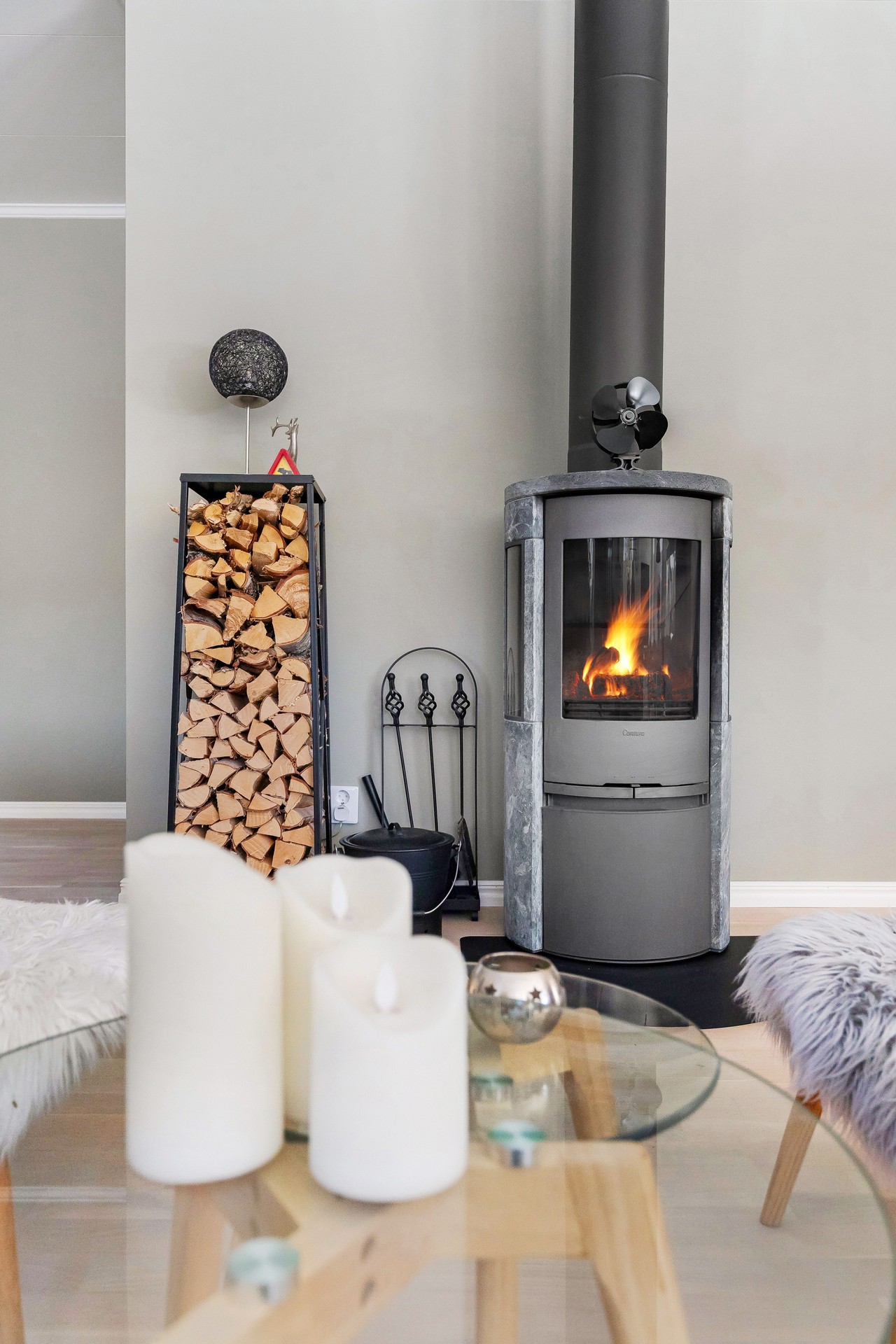 Större altan i vinkeln. Altanen fortsätter på gaveln av huset till huvudentrén. All ytterbelysning och invändig belysning på bostadsbyggnaden styrs via Plejd. I bostadshuset finns centraldammsugare.