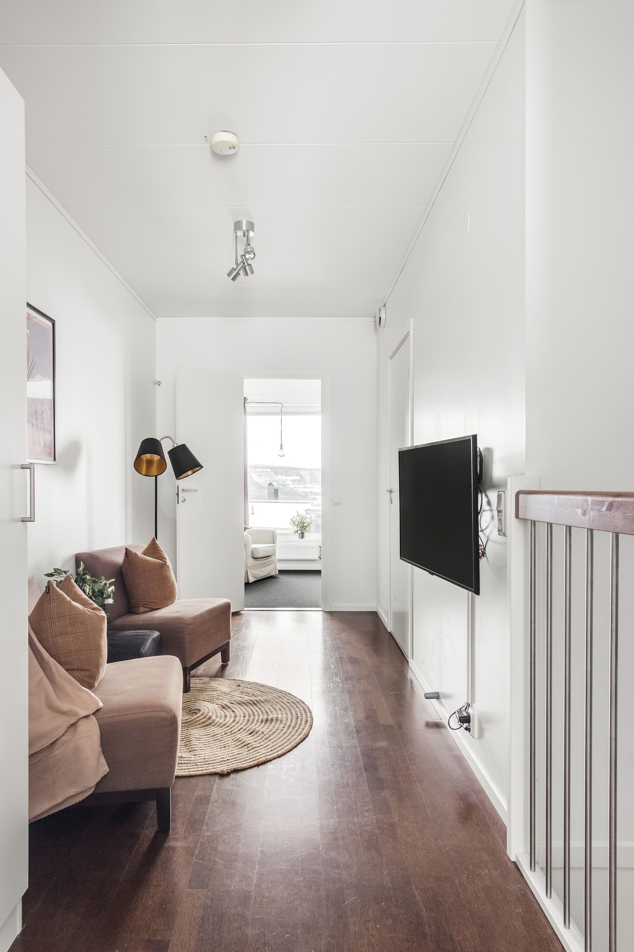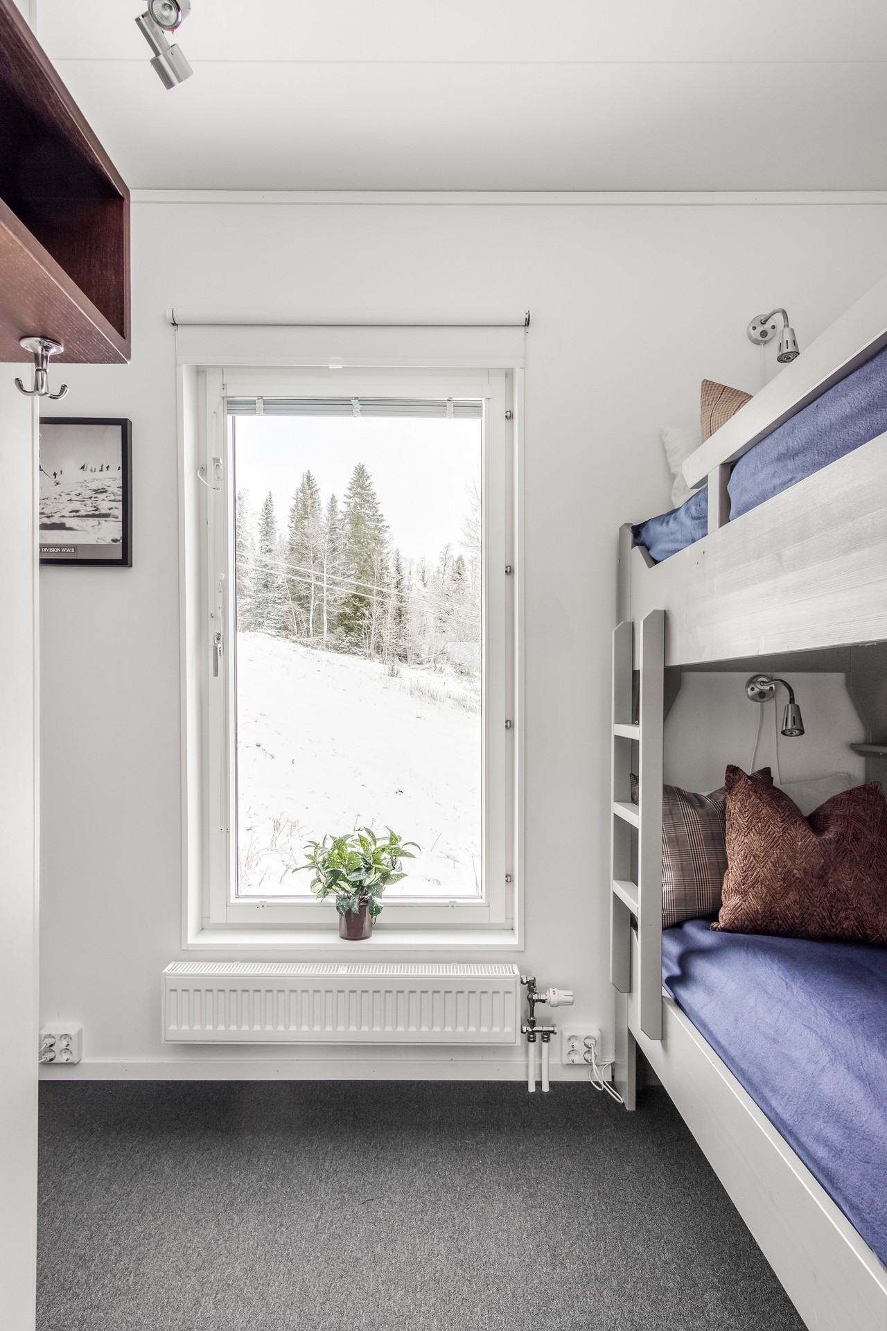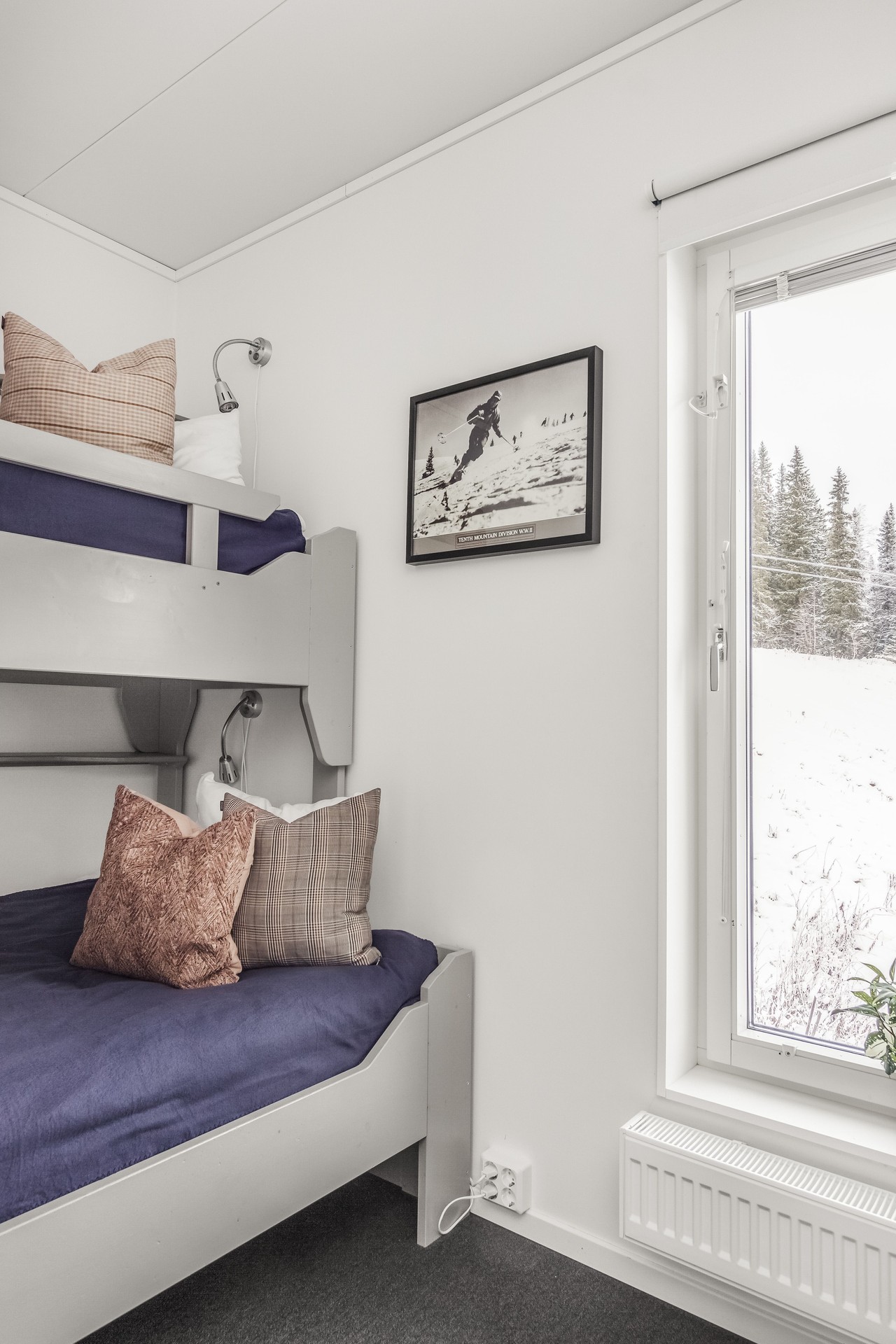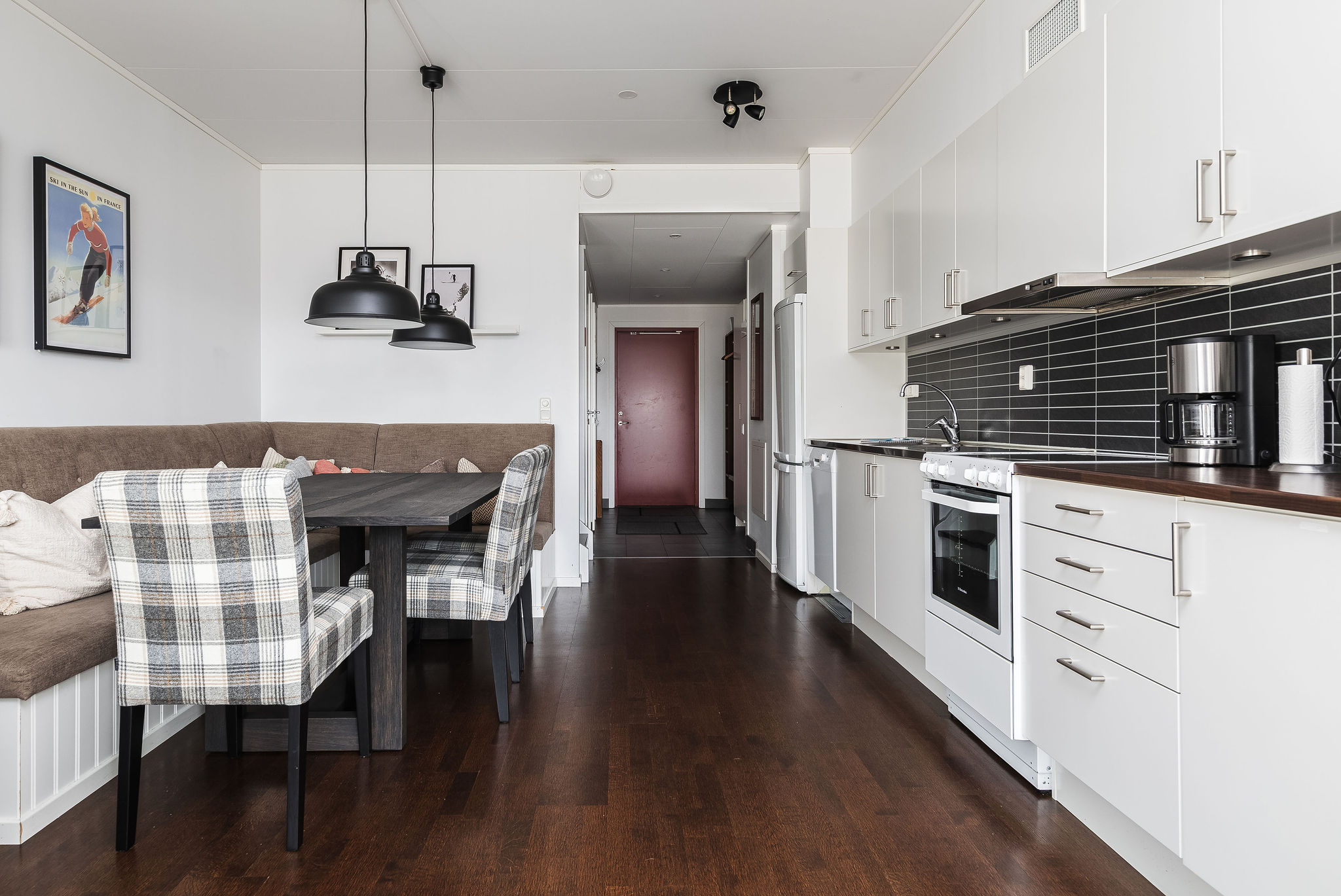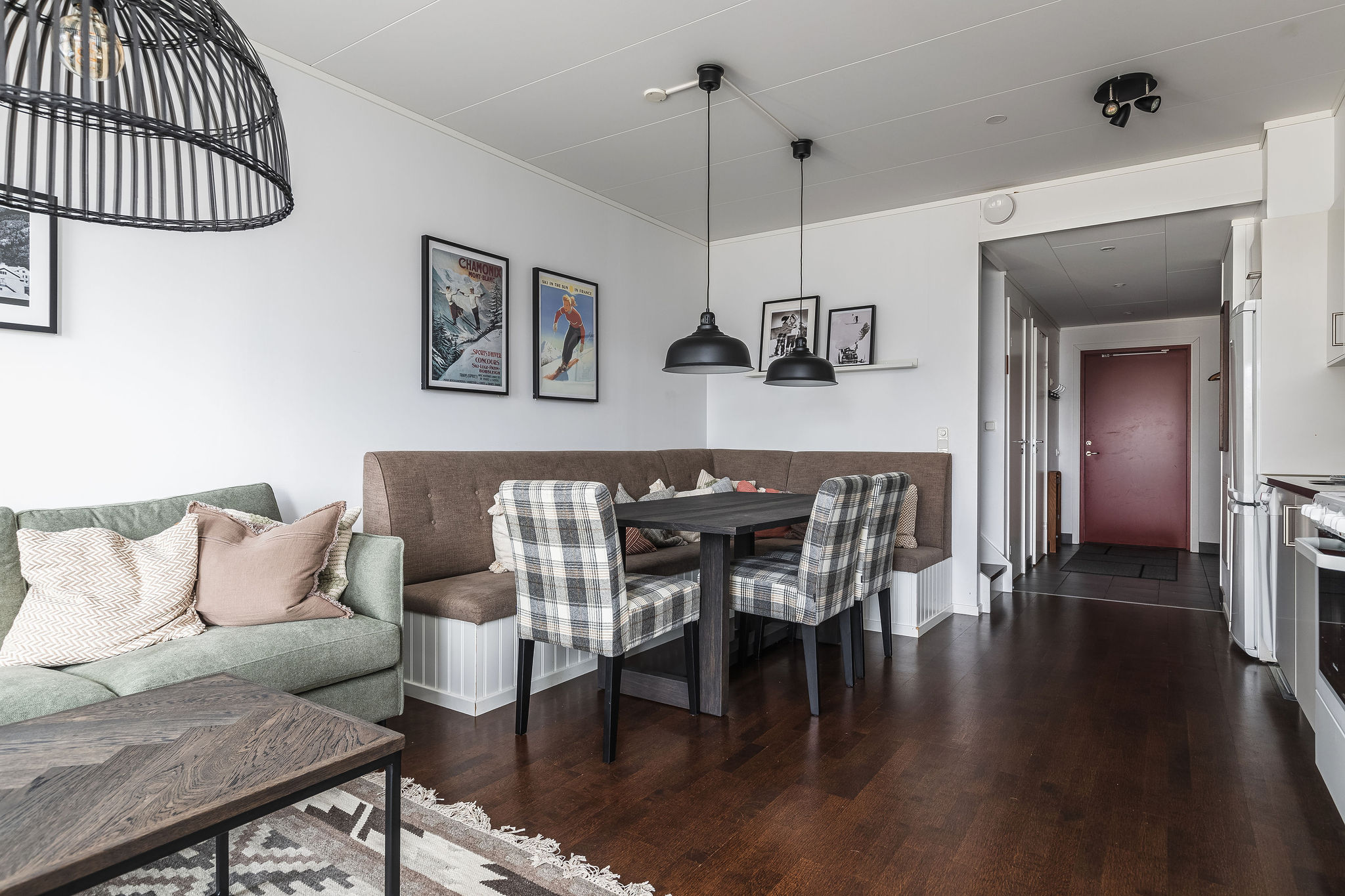 Köket på entréplanet är välutrustat och det stora matbordet med hörnsoffa intill väggen ger utrymme för hela familjen och även vänner på besök. Köksutrustningen består av spis med glashäll och ugn, kolfilterfläkt, kyl/frys, diskmaskin och mikrovågsugn på bänk. Vardagsrummet (i öppen planlösning med kök) är möblerat med soffa, fåtölj och tv. Lägenheten "uppdaterades" hösten 2024 med bl. a. nya vardagsrumsmöbler och matbord/stolar som är riktigt fina. En fransk balkong i söderläge öppnar upp för ljuset och den friska luften soliga dagar under vårvintern och sommar, så klart. Hallen har torkskåp, städskåp och ett praktiskt förrådsrum under trappan upp till övre plan. Elektrisk golvvärme i hall. I anslutning till hallen finns ett ljust, helkaklat badrum med dusch, handfat med kommod och wc samt elektrisk handdukstork. Övre plan består av två sovrum med ett mindre allrum i anslutning till trappan. Det större sovrummet, med vy mot dalgången har dubbelsäng. Det andra sovrummet som vetter mot berget, är möblerat med två våningssängar varav den ena, en familjesäng med bredare slaf nederst (120 + 90 cm). Badrummet på övervåningen har, förutom dusch, wc och handfat med kommod även tvättmaskin och stor bastu med glasvägg in mot badrummet. Ytskikten i lägenheten består av ekparkettgolv i vardagsrum och kök. Klinkergolv i badrum och hall. Sovrummen har mjuk matta på golv. Väggarna i badrummen har vitt kakel. Vitmålade väggar i hall, kök, vardagsrum och sovrum.