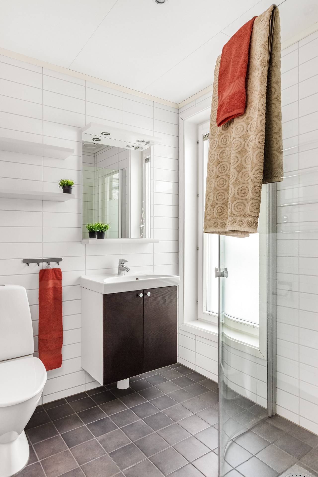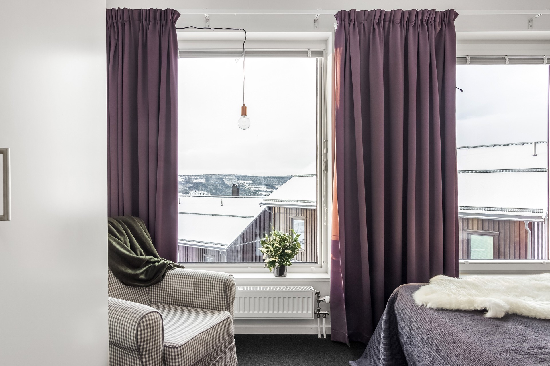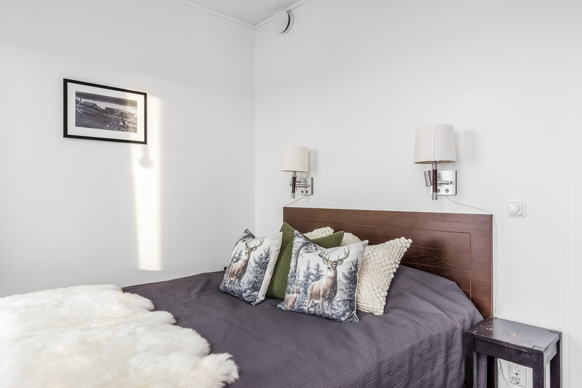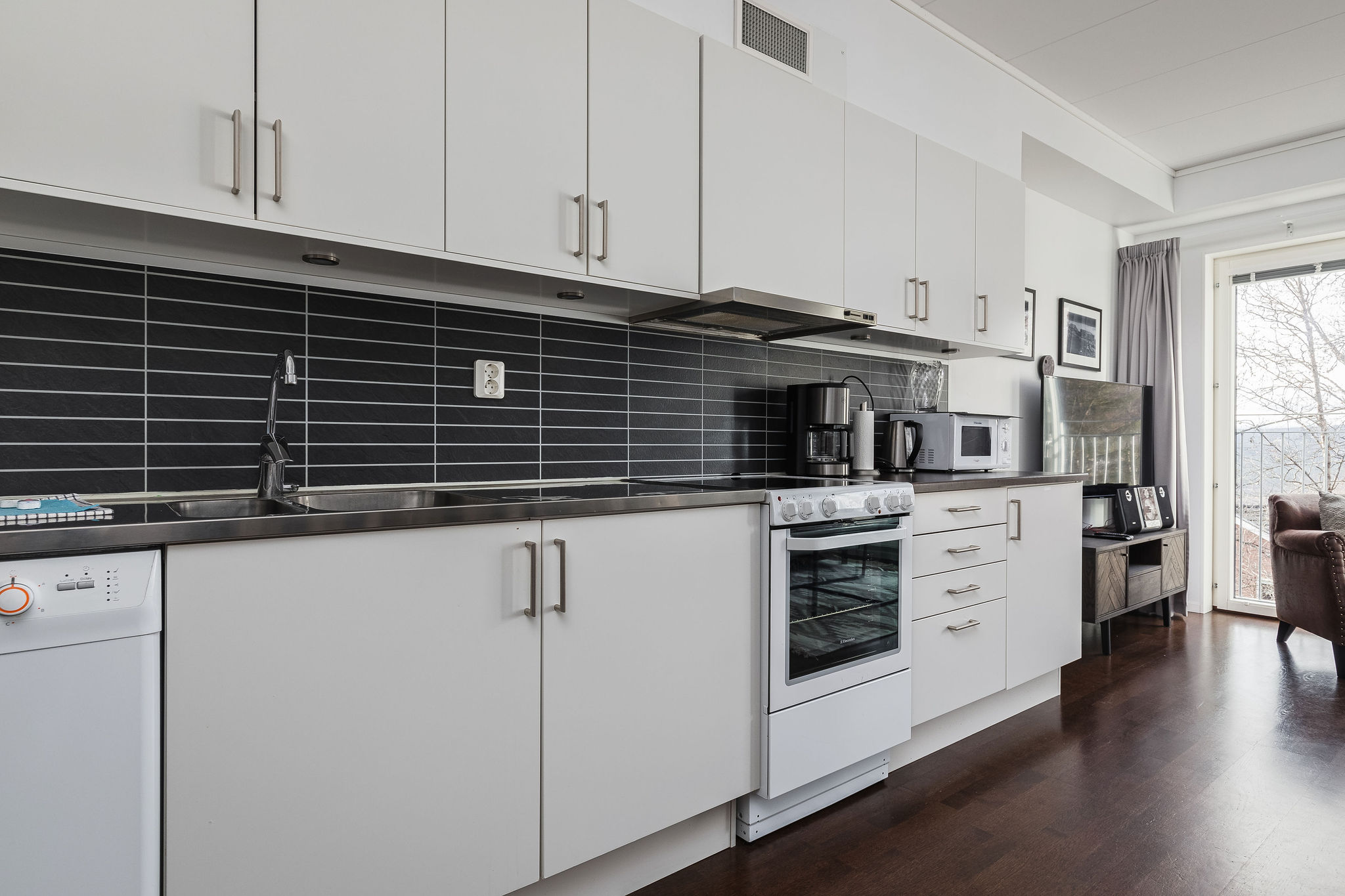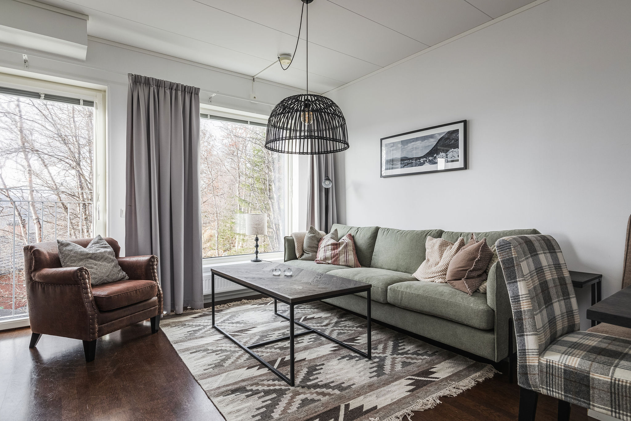 Köket på entréplanet är välutrustat och det stora matbordet med hörnsoffa intill väggen ger utrymme för hela familjen och även vänner på besök. Köksutrustningen består av spis med glashäll och ugn, kolfilterfläkt, kyl/frys, diskmaskin och mikrovågsugn på bänk. Vardagsrummet (i öppen planlösning med kök) är möblerat med soffa, fåtölj och tv. Lägenheten "uppdaterades" hösten 2024 med bl. a. nya vardagsrumsmöbler och matbord/stolar som är riktigt fina. En fransk balkong i söderläge öppnar upp för ljuset och den friska luften soliga dagar under vårvintern och sommar, så klart. Hallen har torkskåp, städskåp och ett praktiskt förrådsrum under trappan upp till övre plan. Elektrisk golvvärme i hall. I anslutning till hallen finns ett ljust, helkaklat badrum med dusch, handfat med kommod och wc samt elektrisk handdukstork. Övre plan består av två sovrum med ett mindre allrum i anslutning till trappan. Det större sovrummet, med vy mot dalgången har dubbelsäng. Det andra sovrummet som vetter mot berget, är möblerat med två våningssängar varav den ena, en familjesäng med bredare slaf nederst (120 + 90 cm). Badrummet på övervåningen har, förutom dusch, wc och handfat med kommod även tvättmaskin och stor bastu med glasvägg in mot badrummet. Ytskikten i lägenheten består av ekparkettgolv i vardagsrum och kök. Klinkergolv i badrum och hall. Sovrummen har mjuk matta på golv. Väggarna i badrummen har vitt kakel. Vitmålade väggar i hall, kök, vardagsrum och sovrum.