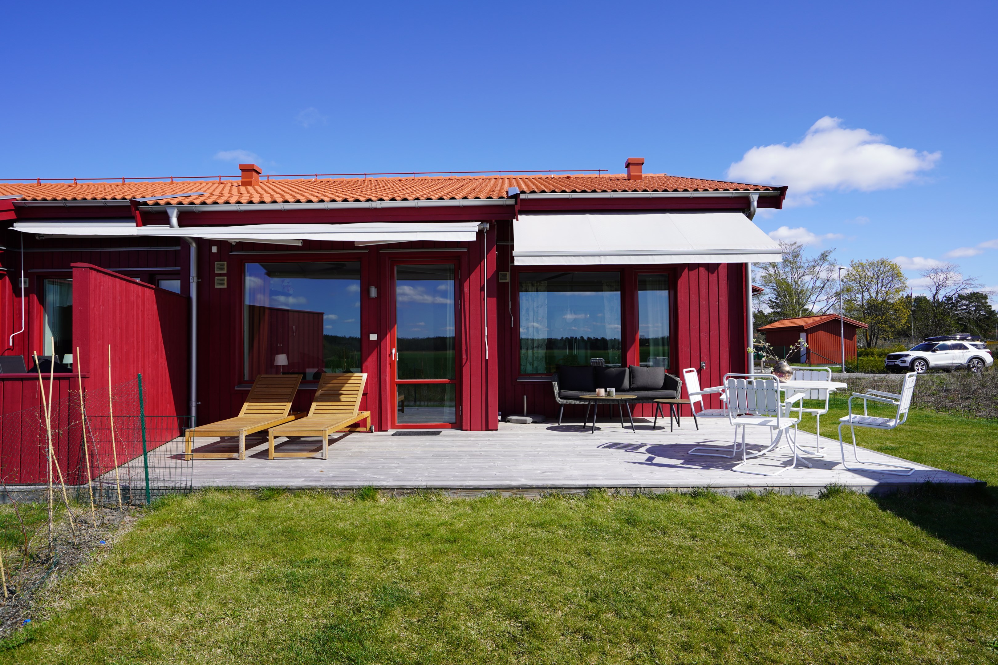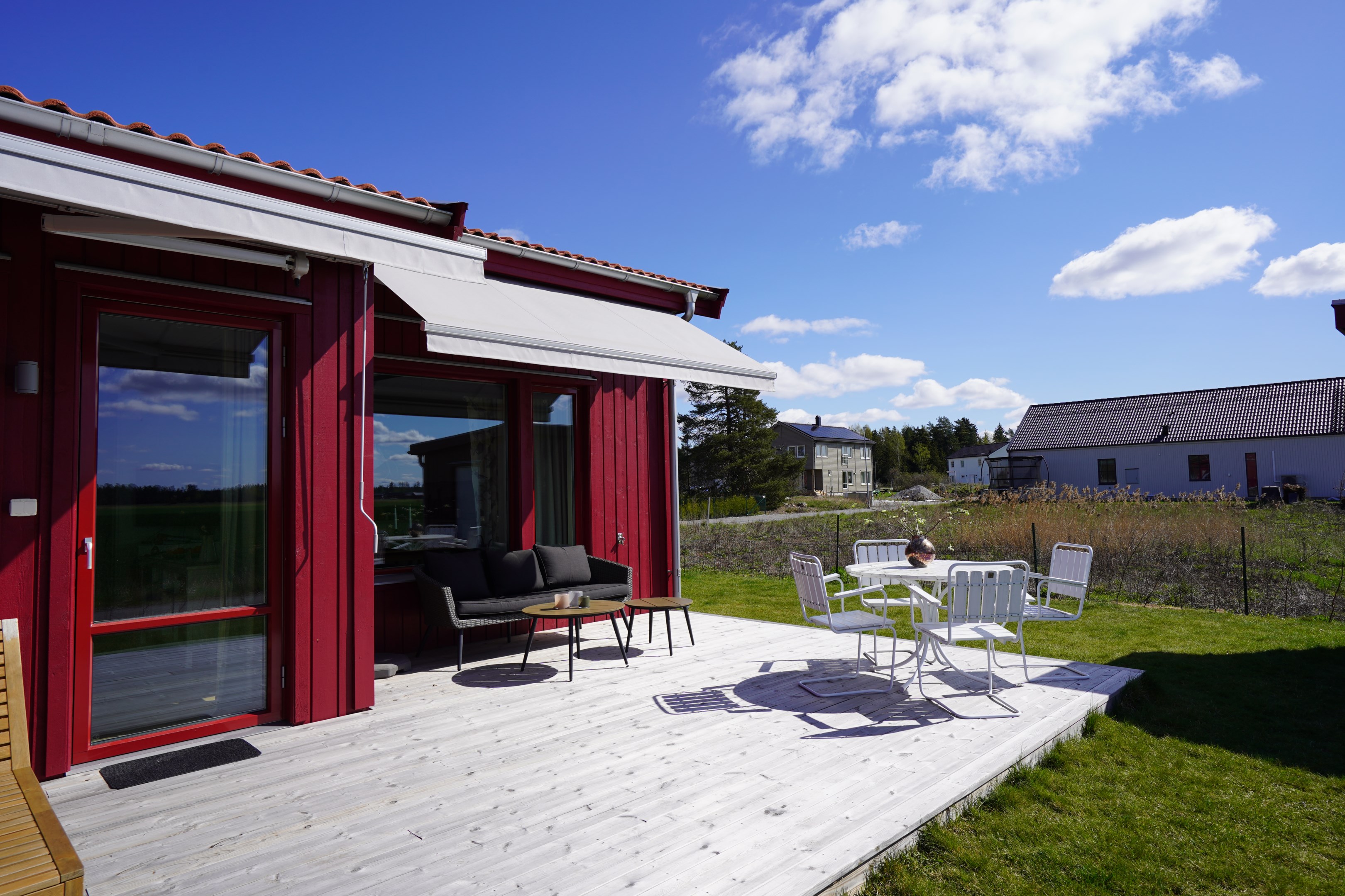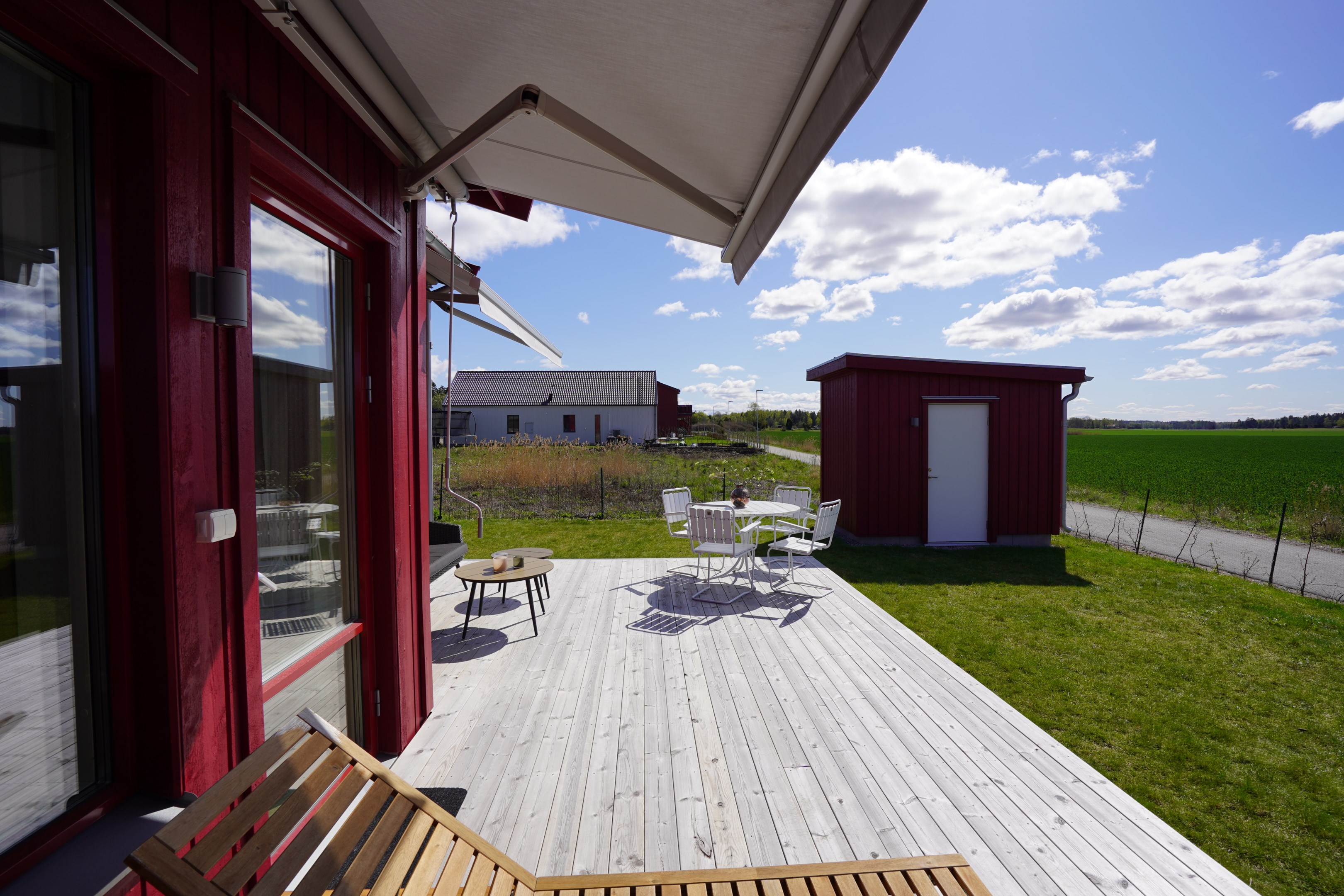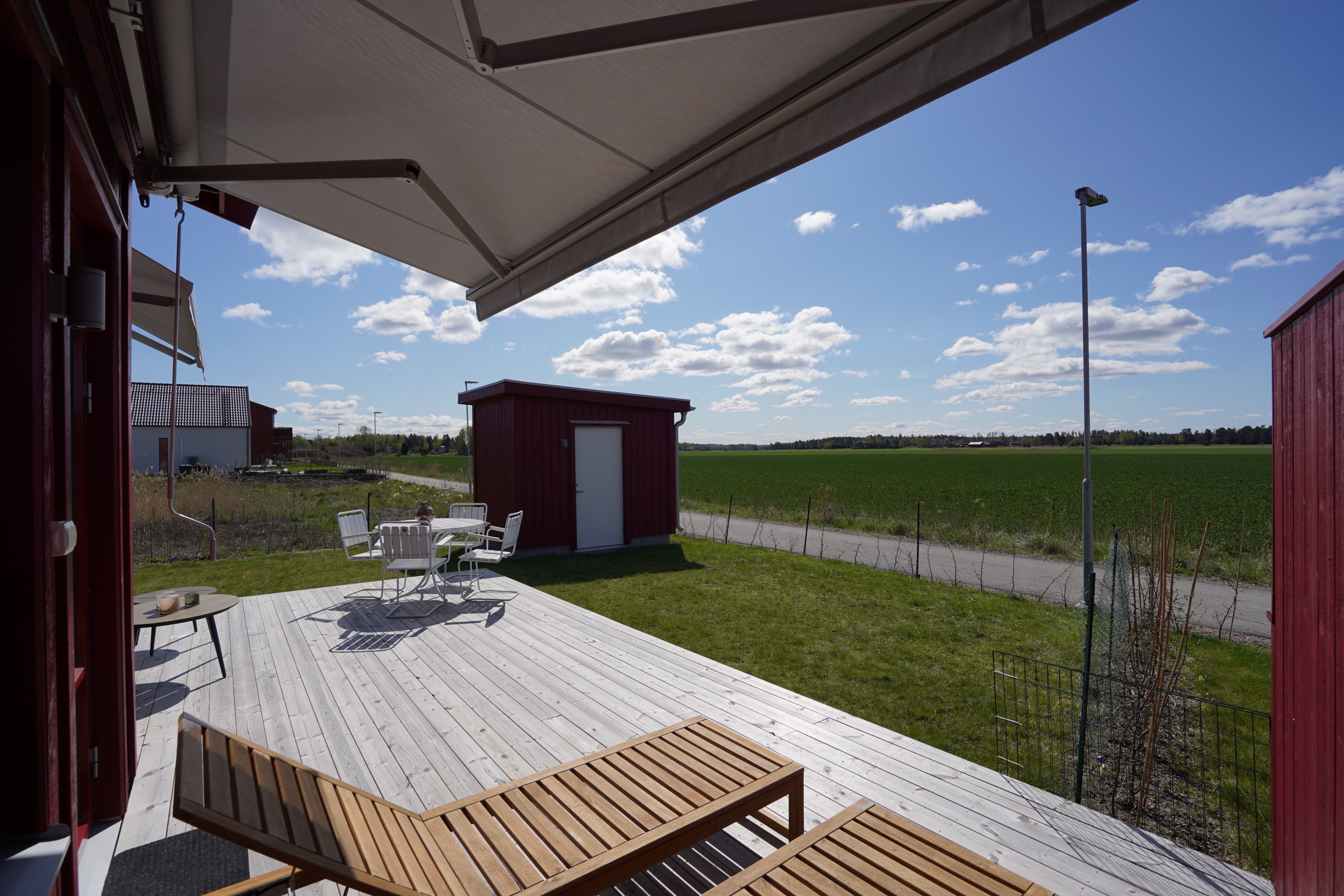 Stor altan med två markiser. Sydväst läge med fri utsikt ut över åkrarna. Plattlagd uteplats under tak på framsidan.