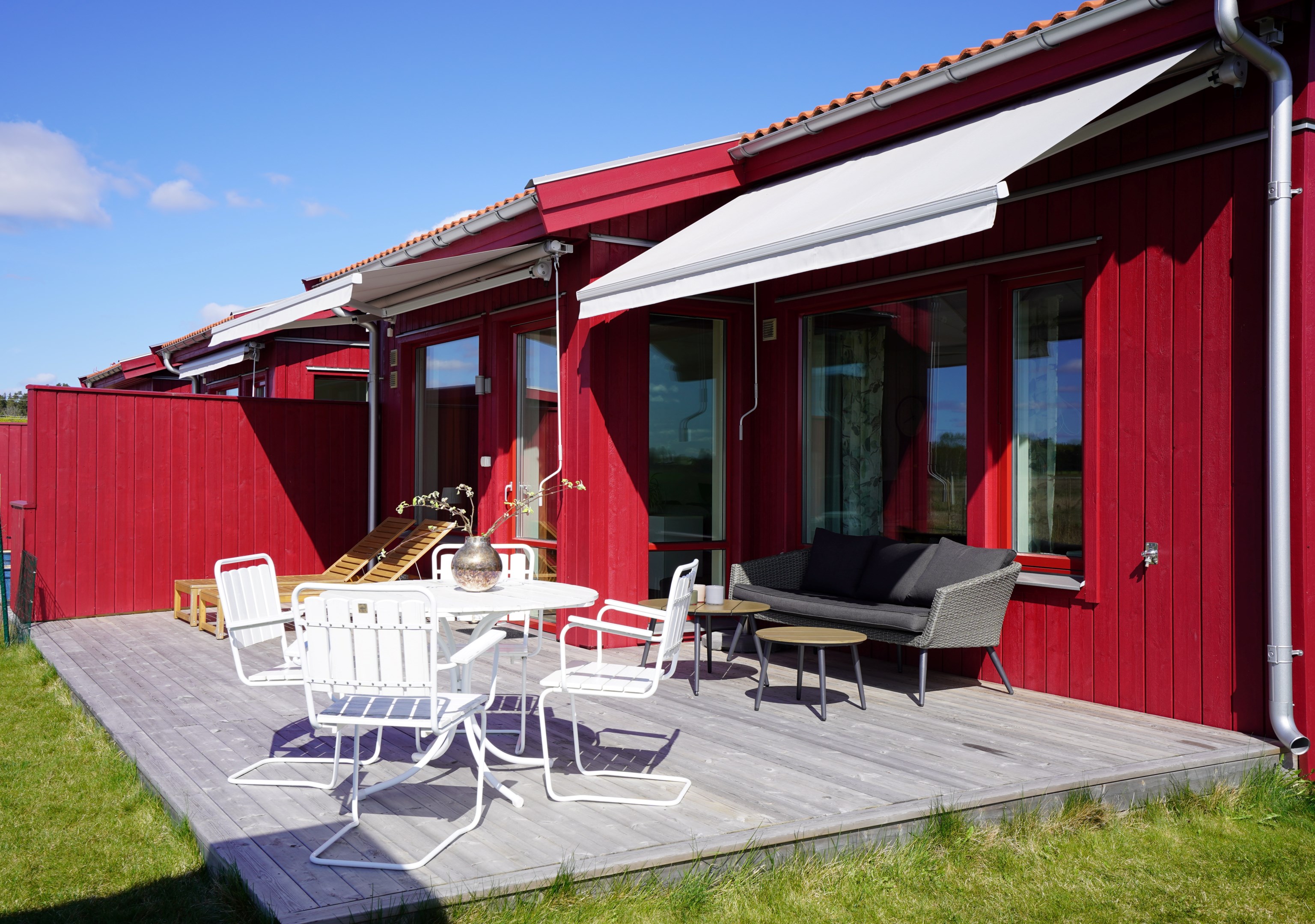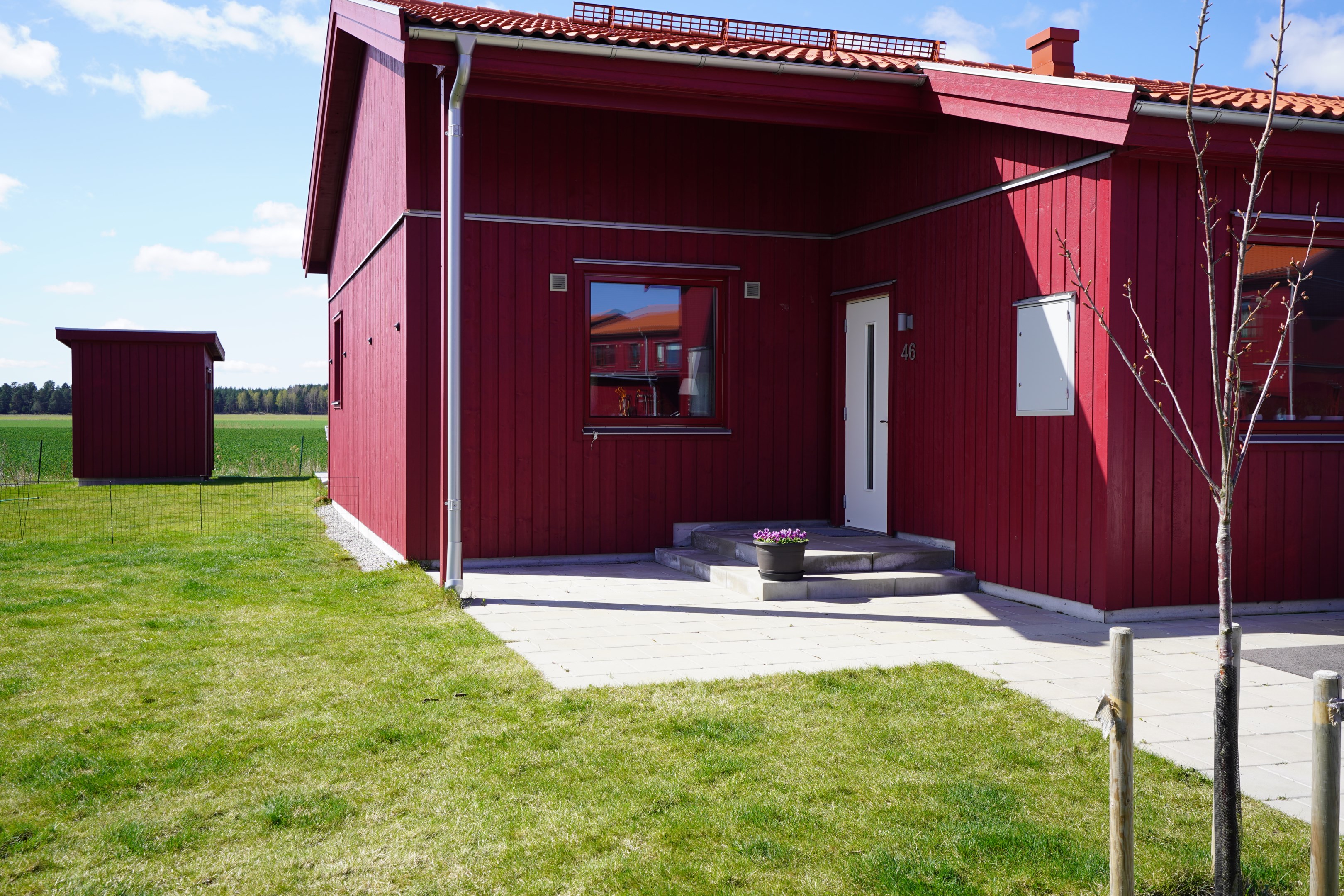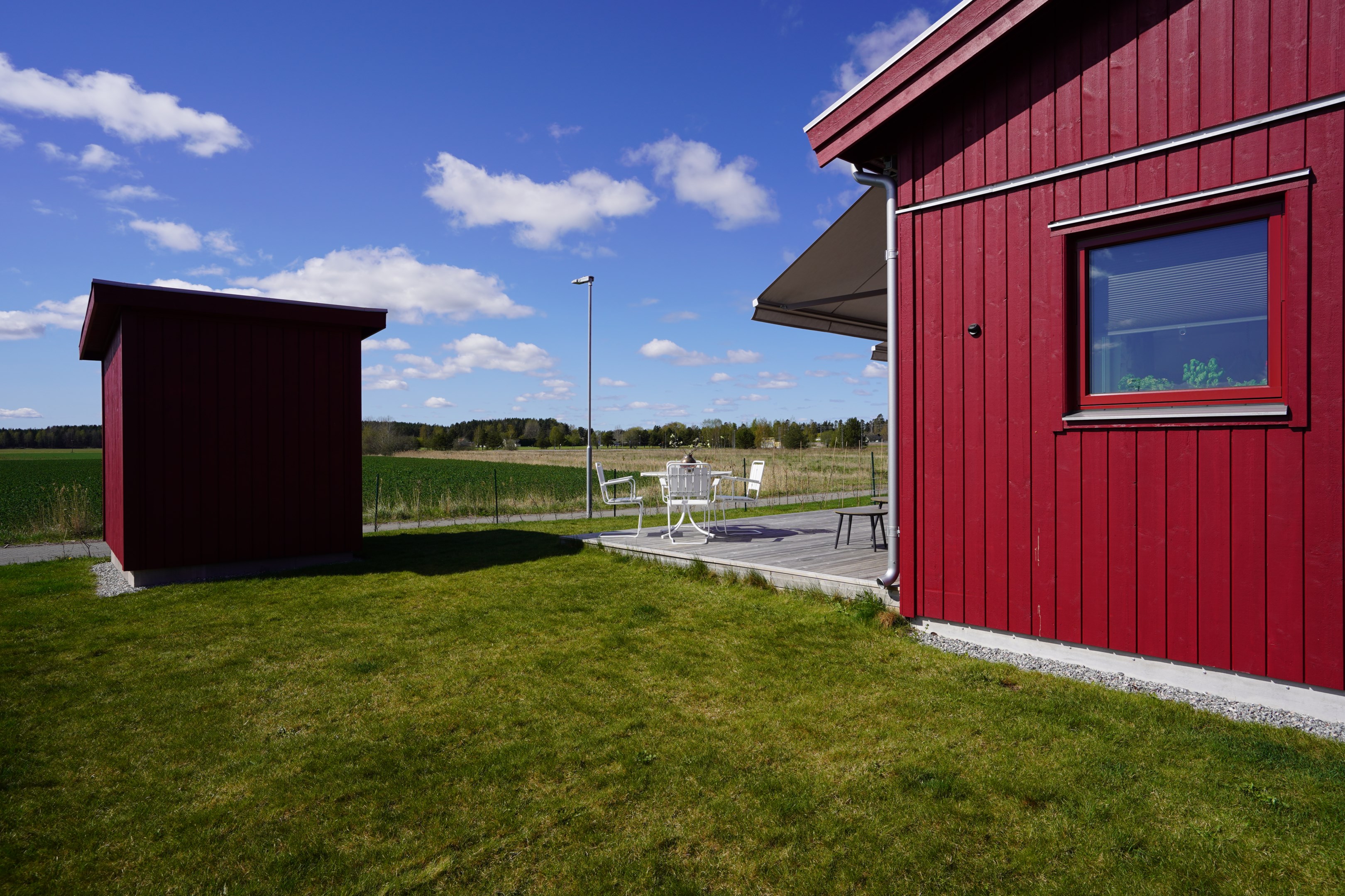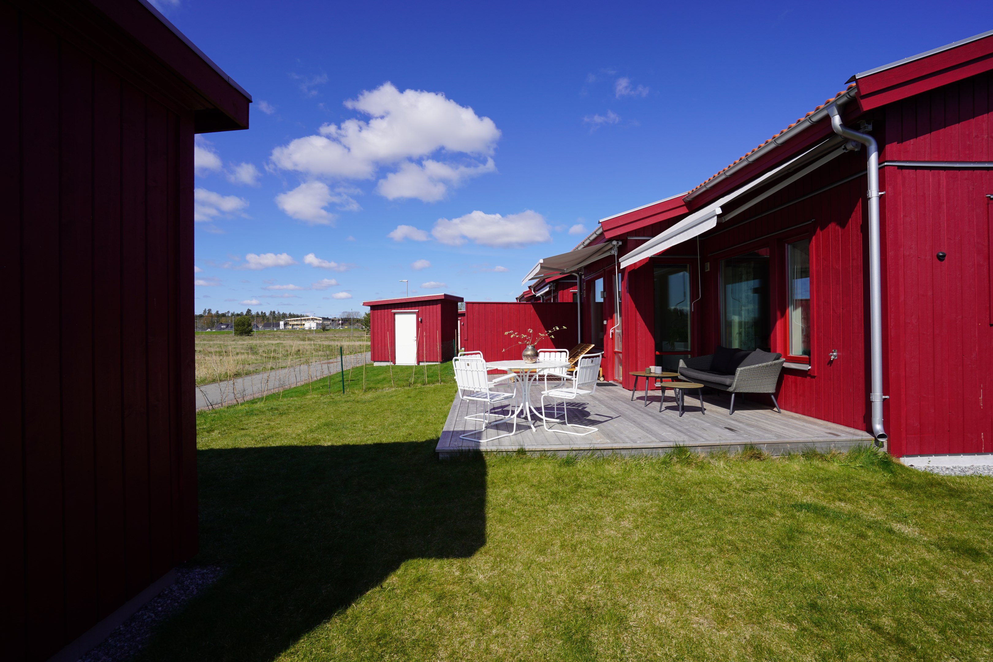 Stor altan med två markiser. Sydväst läge med fri utsikt ut över åkrarna. Plattlagd uteplats under tak på framsidan.