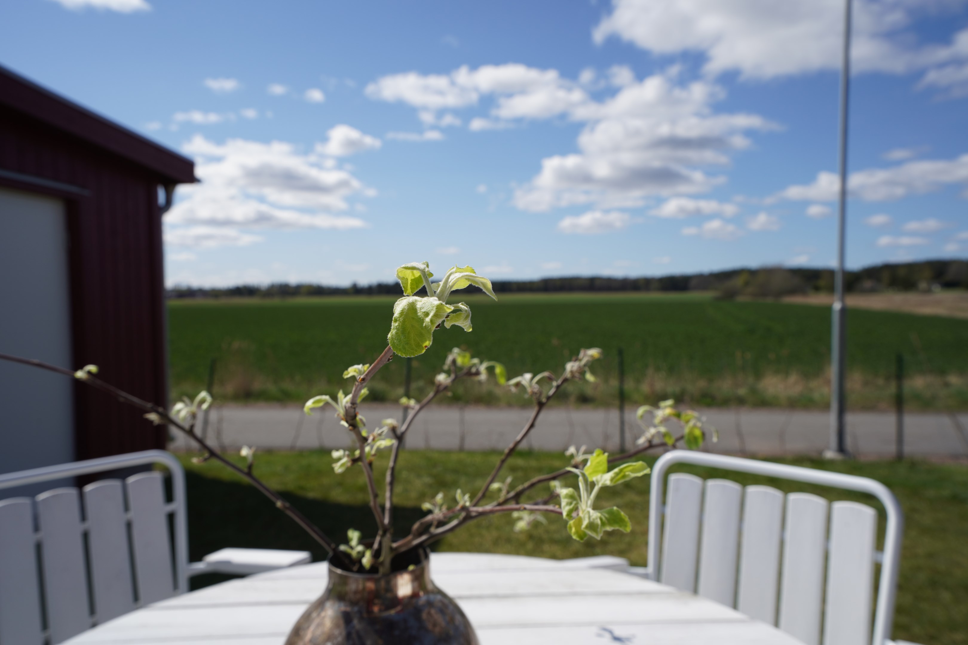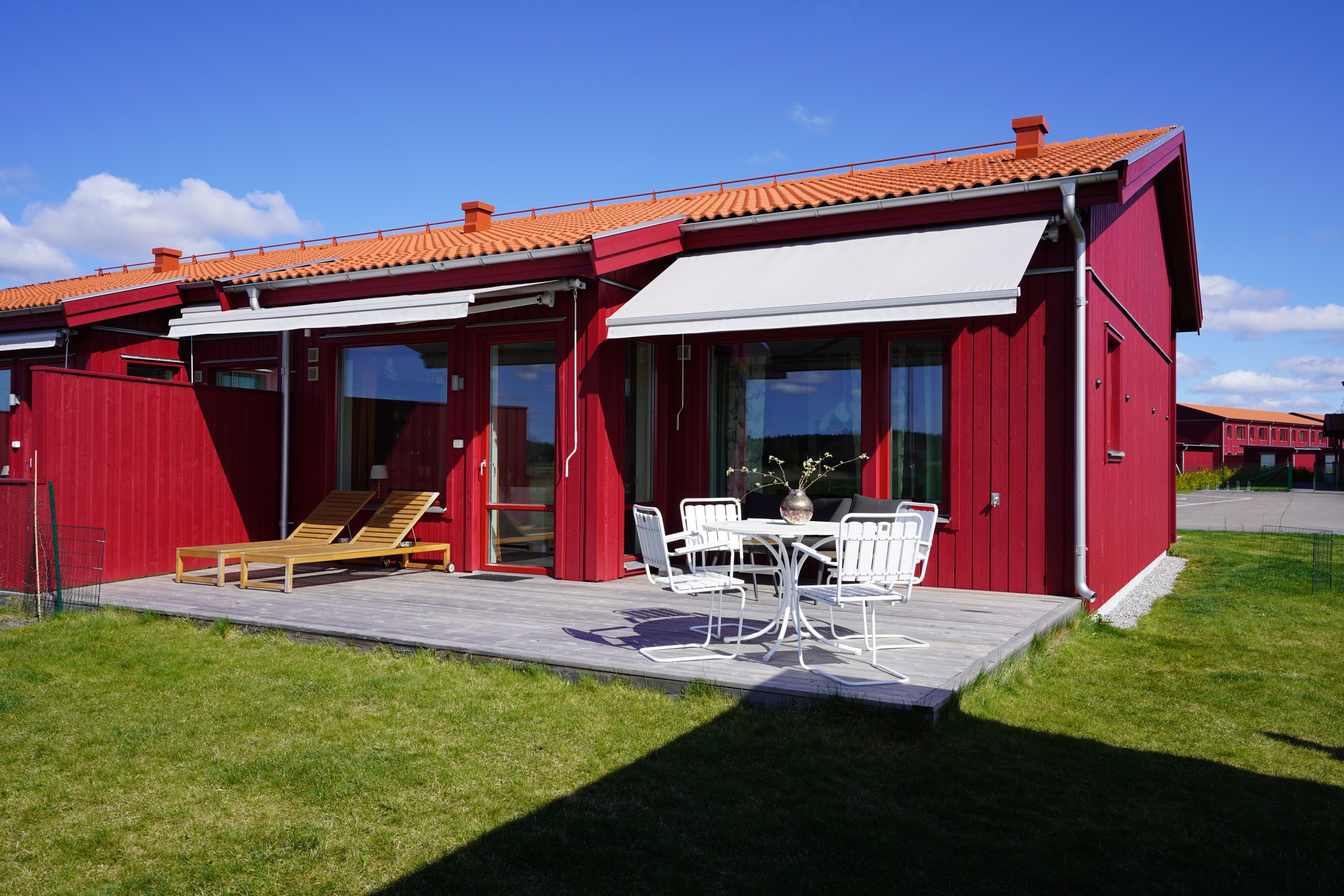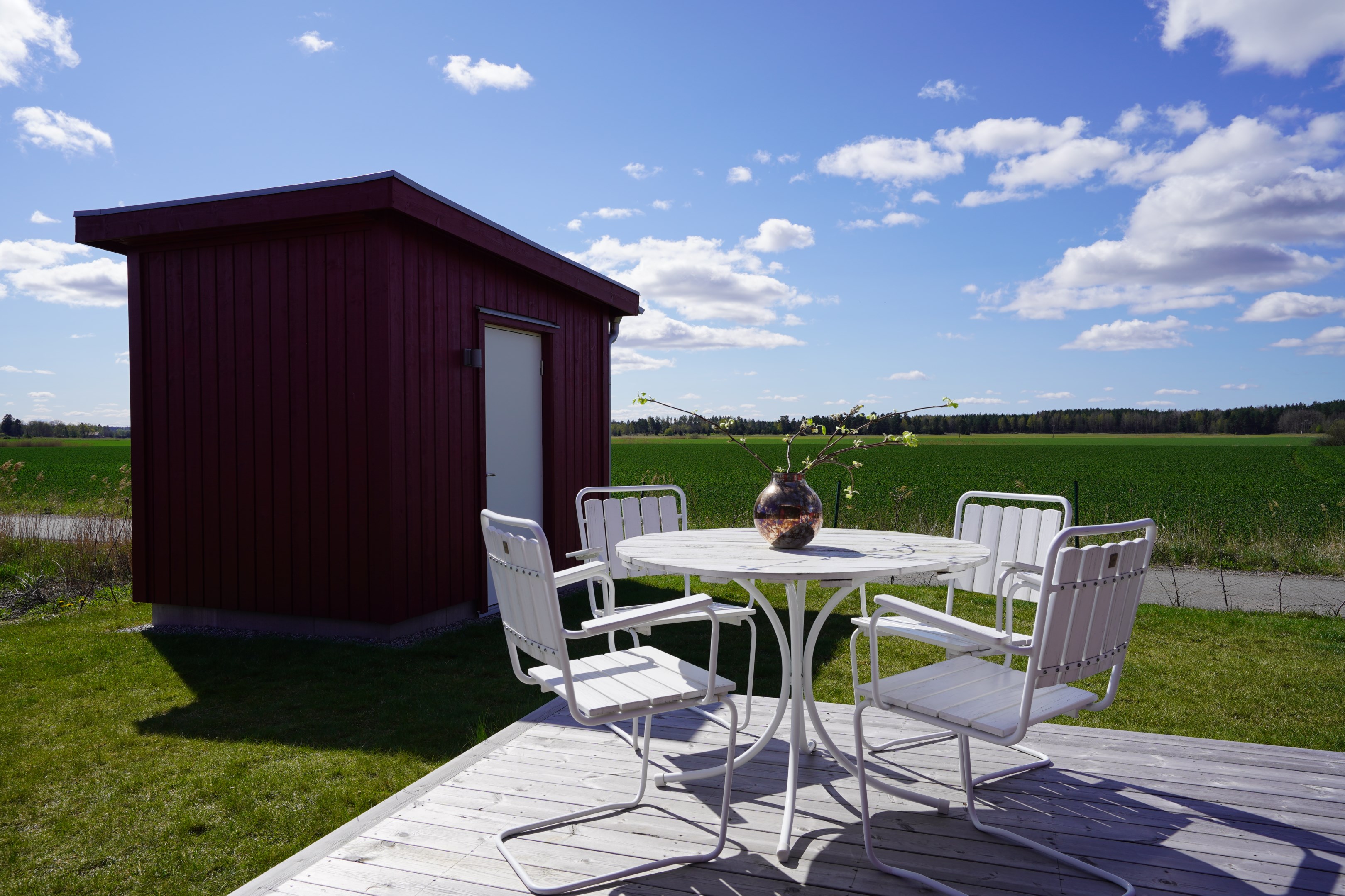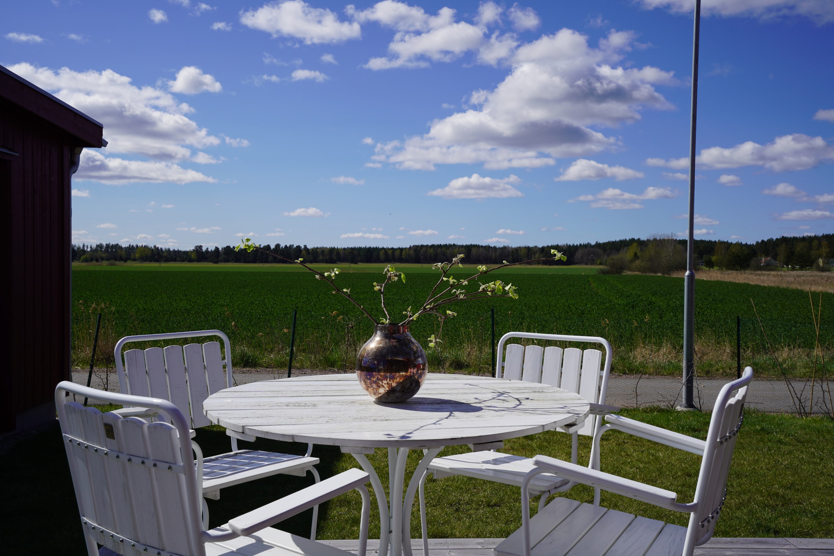 Stor altan med två markiser. Sydväst läge med fri utsikt ut över åkrarna. Plattlagd uteplats under tak på framsidan.