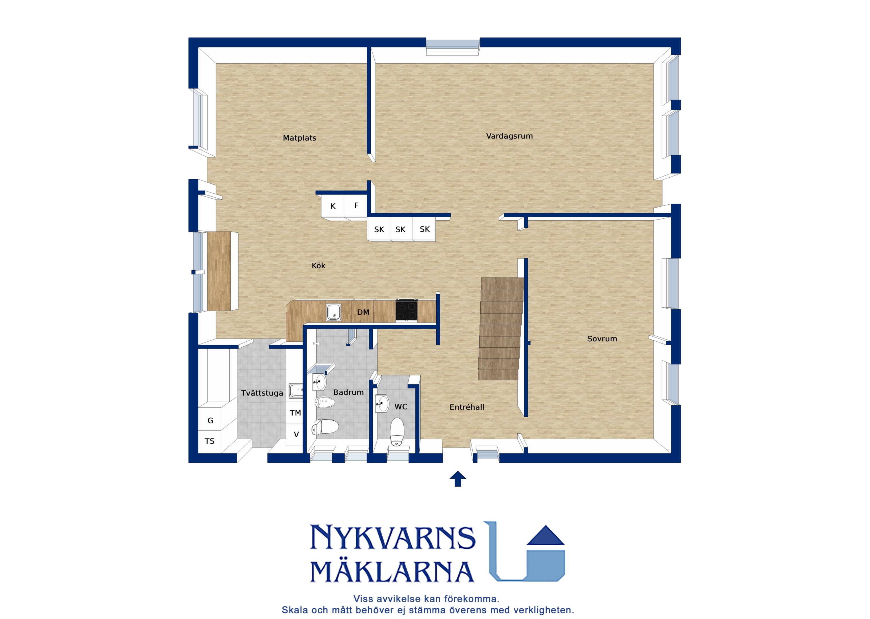 Tvättmaskin, torkskåp och tvättho. Varmvattenberedare. Plastmatta och tapet grovingång.