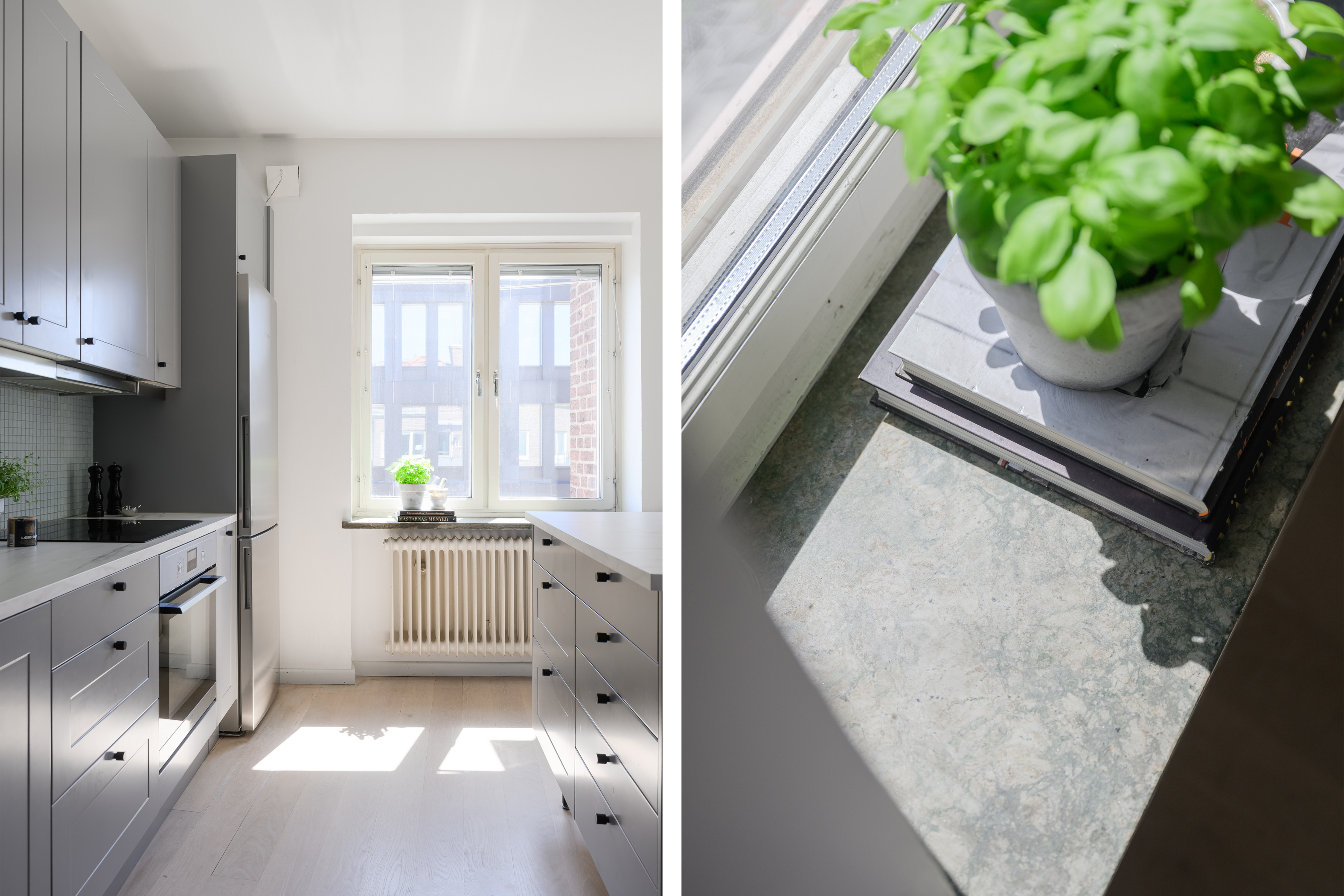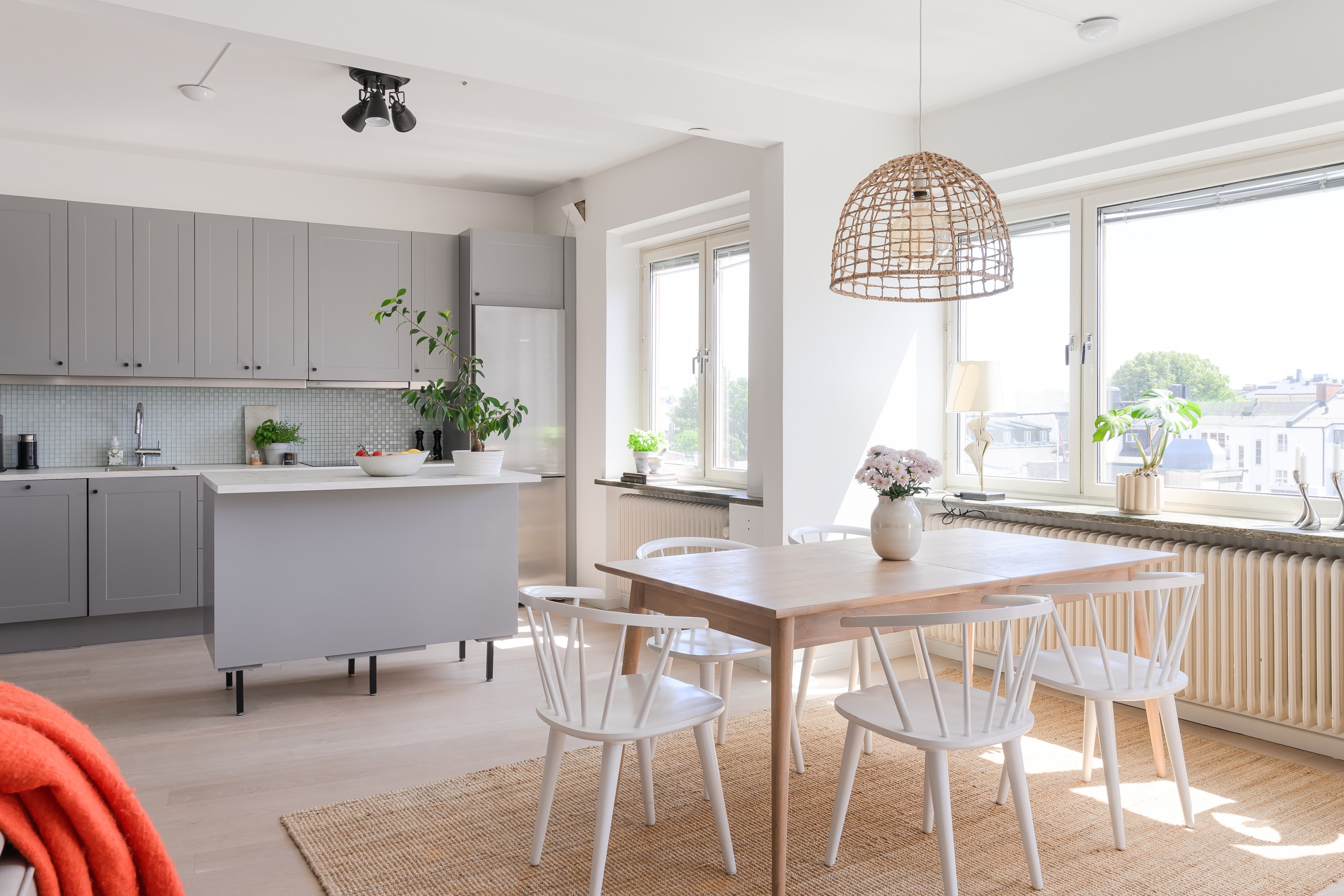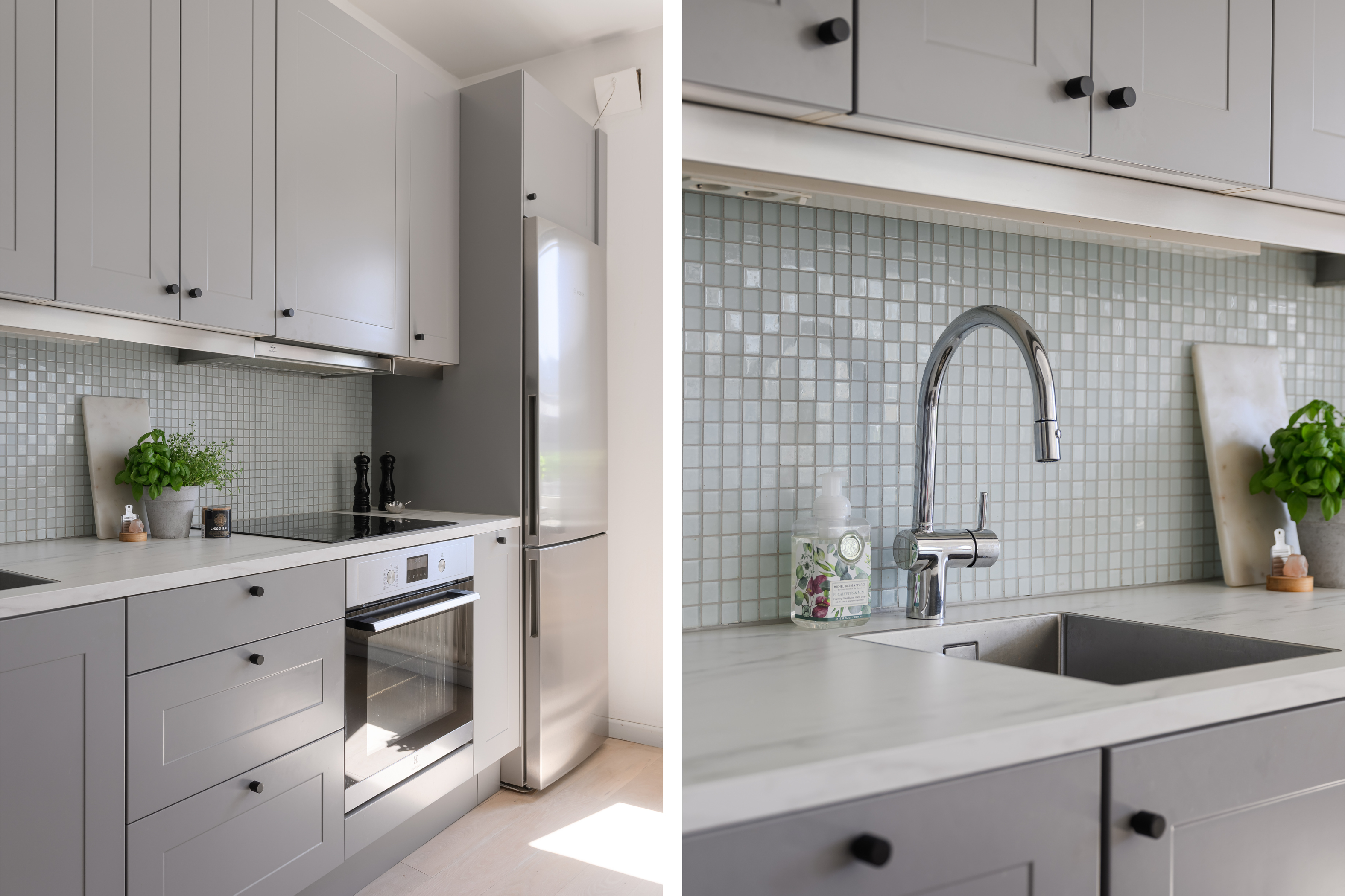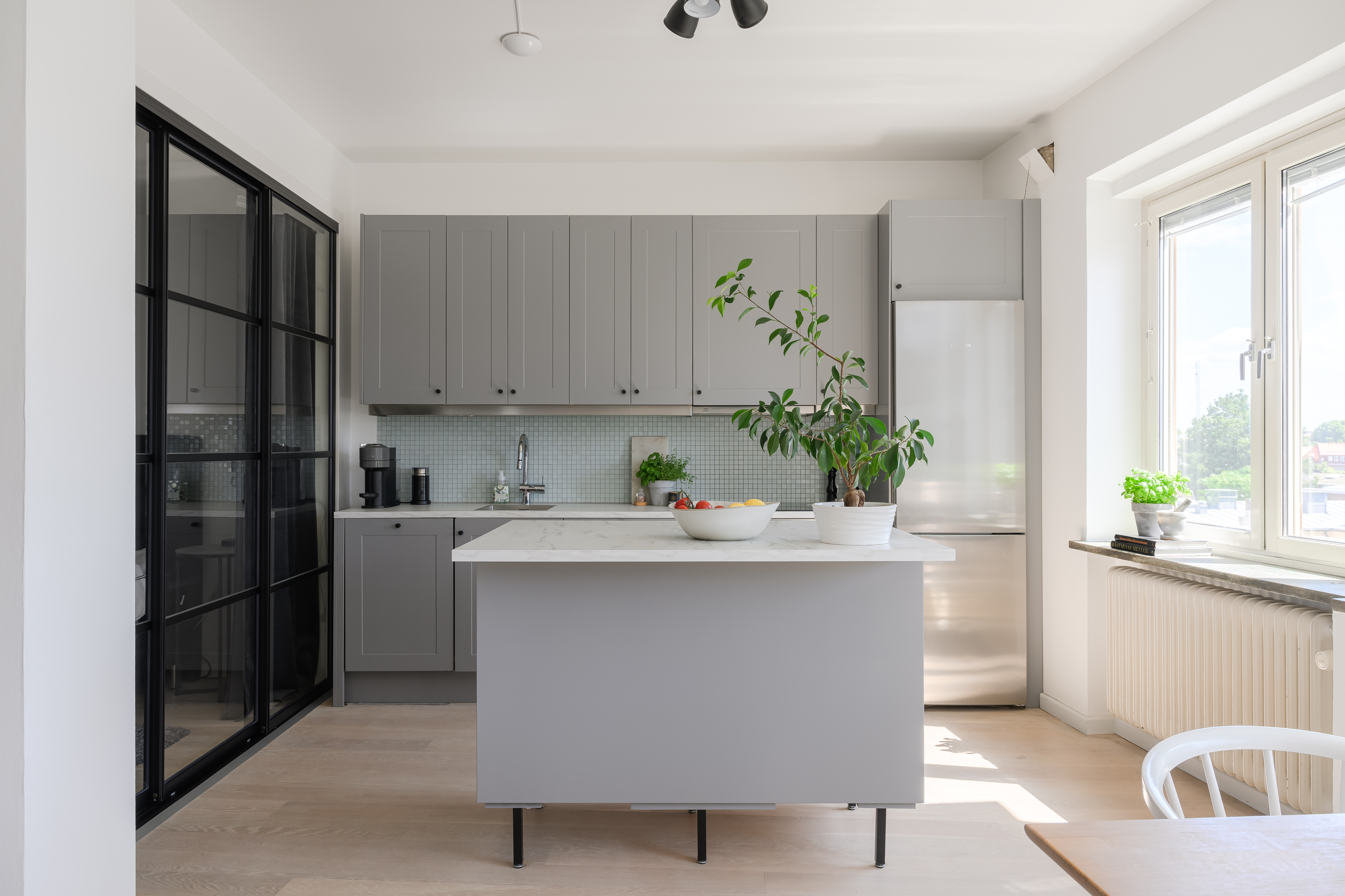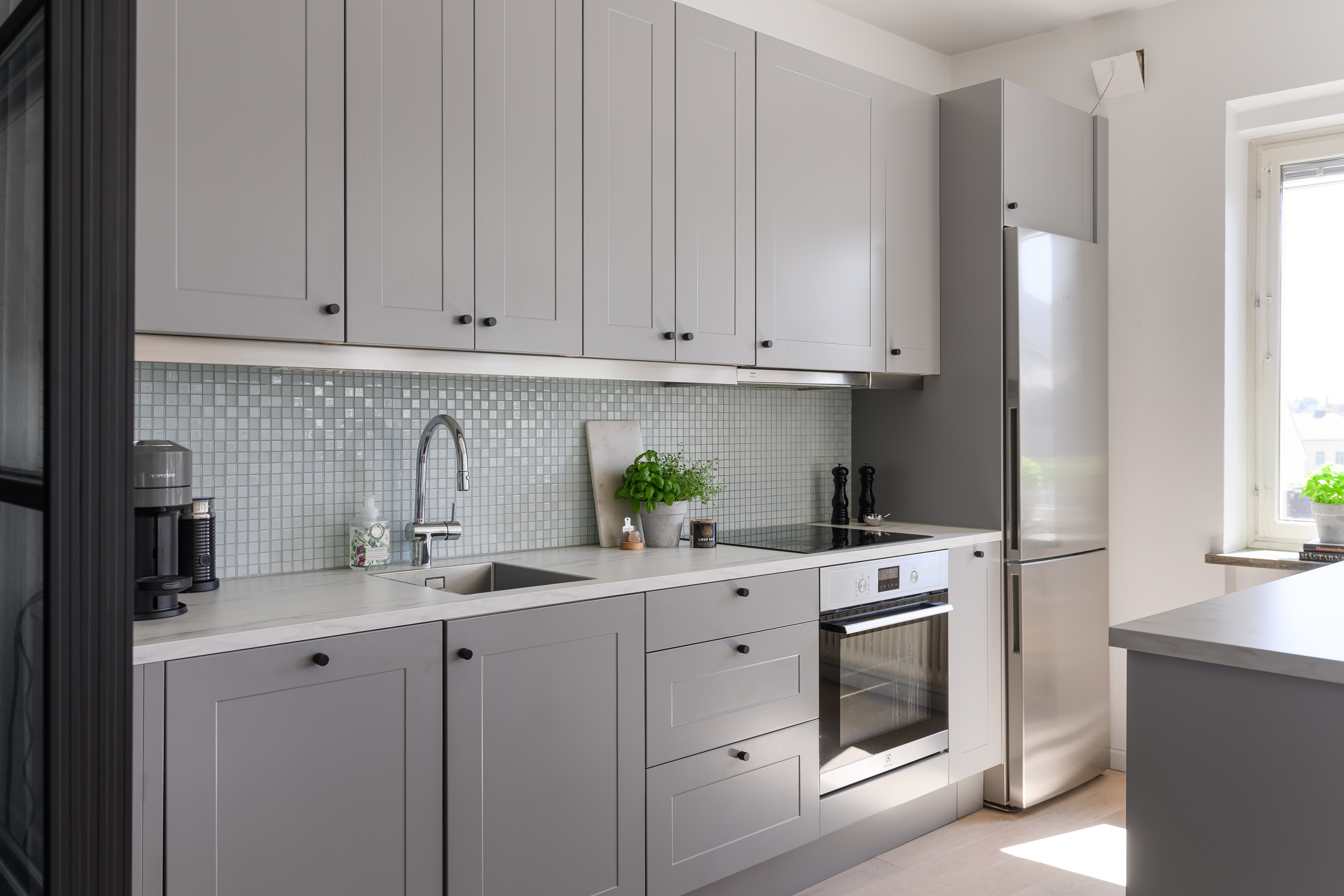 Stilrent och välplanerat kök i grå toner med ljus laminatbänkskiva och dekorativ mosaik ovanför diskbänken. Den öppna planlösningen mot vardagsrummet och den inbjudande köksön skapar en social och trivsam atmosfär. Här finns gott om förvaring samt full maskinell utrustning i form av spis, ugn, fläkt, kyl/frys och diskmaskin.