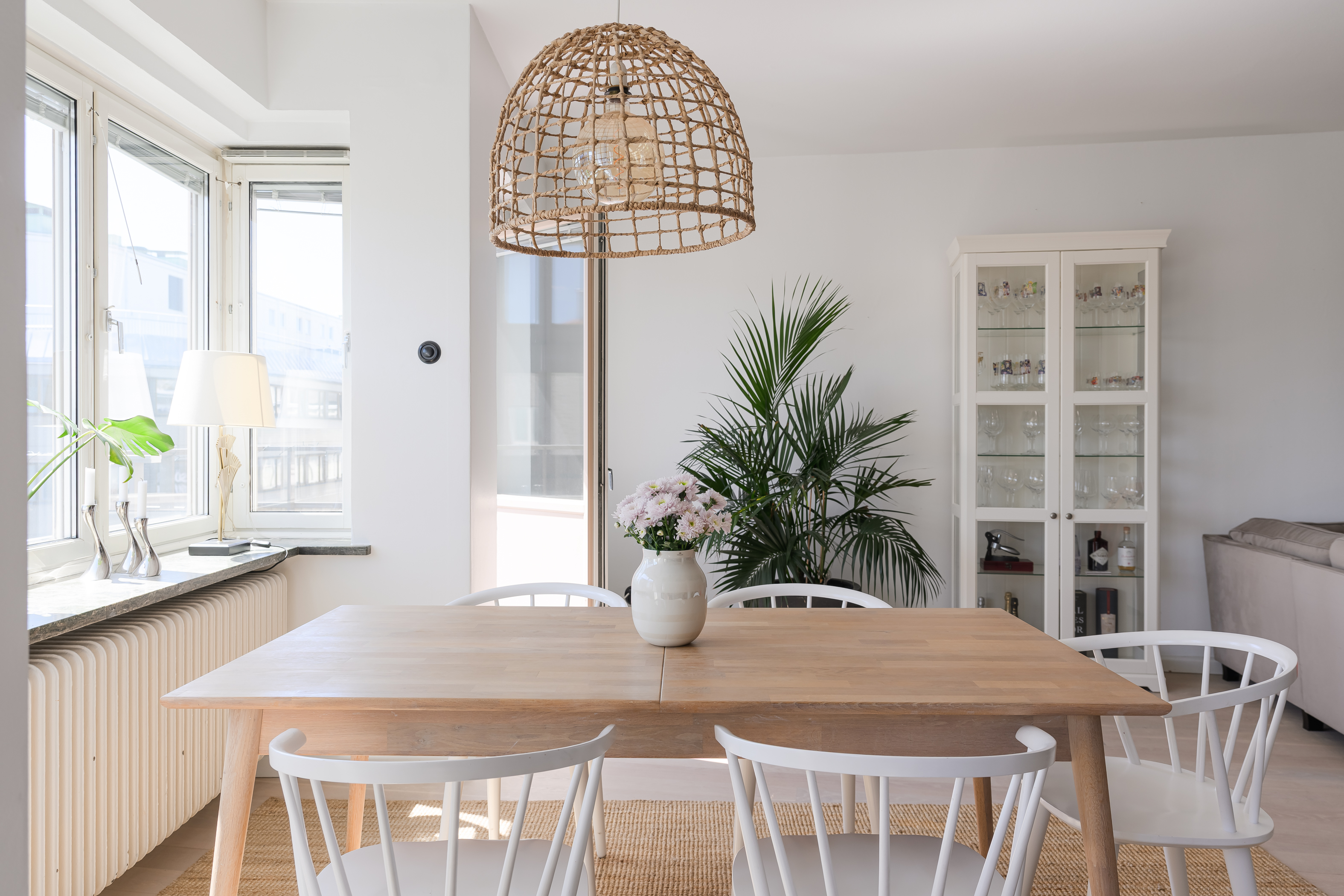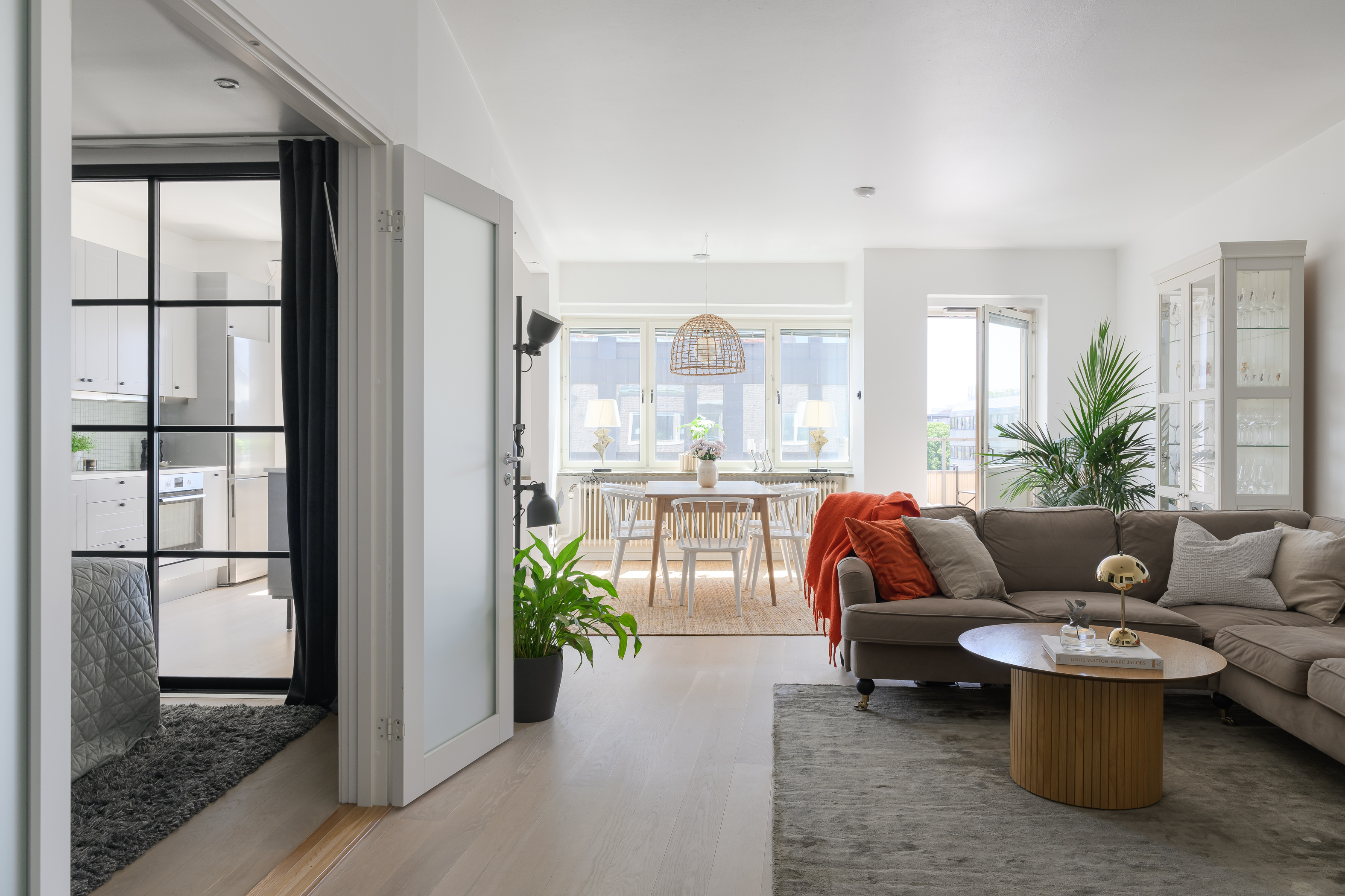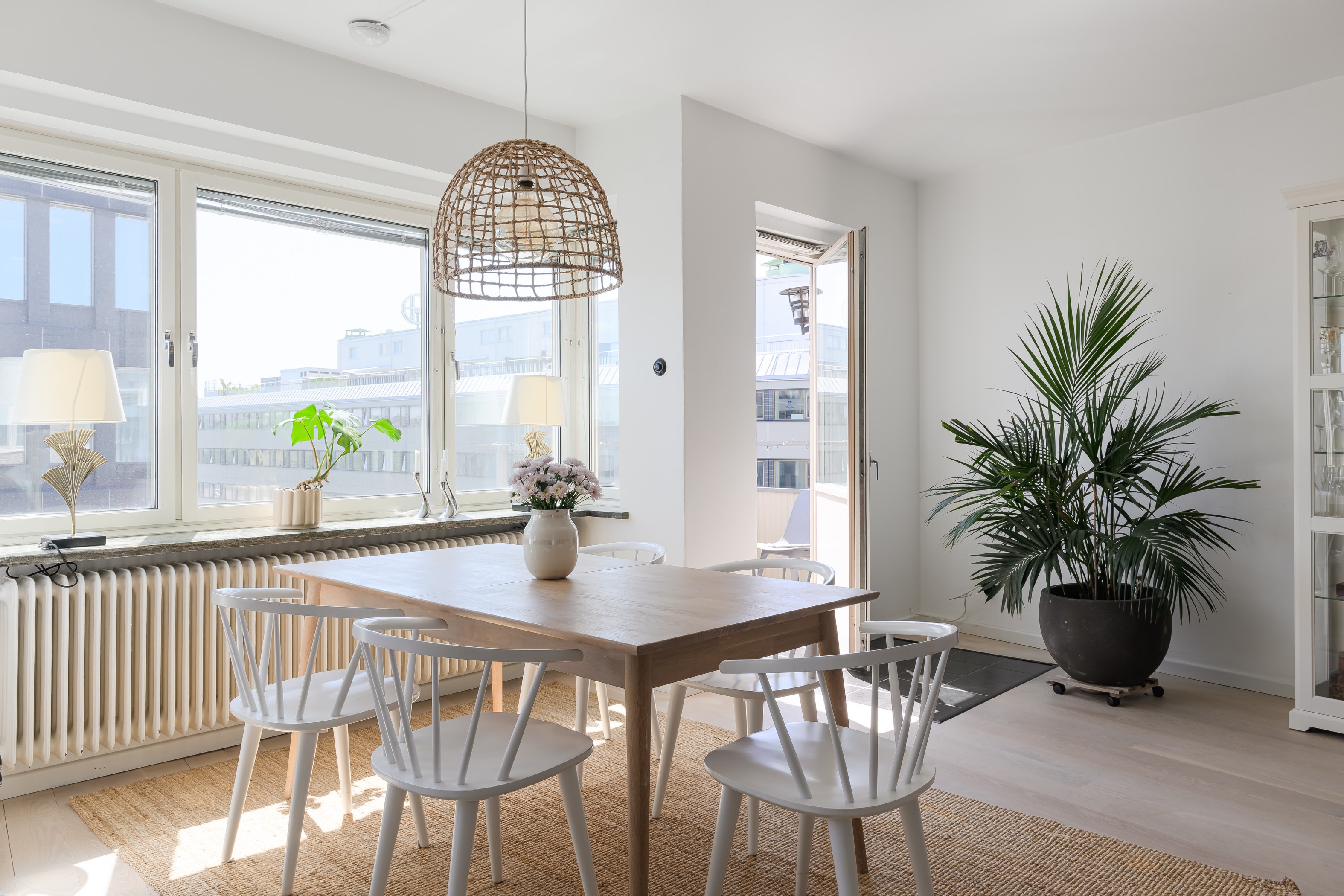 Ljust och rymligt vardagsrum med vacker ekparkett, vita väggar och generösa fönsterpartier som släpper in härligt ljus. Här finns plats för både stor soffgrupp, TV-hörna och ett rejält matbord i det charmiga burspråket. Från vardagsrummet nås en solig balkong i söderläge med fantastisk cityutsikt över takåsarna.