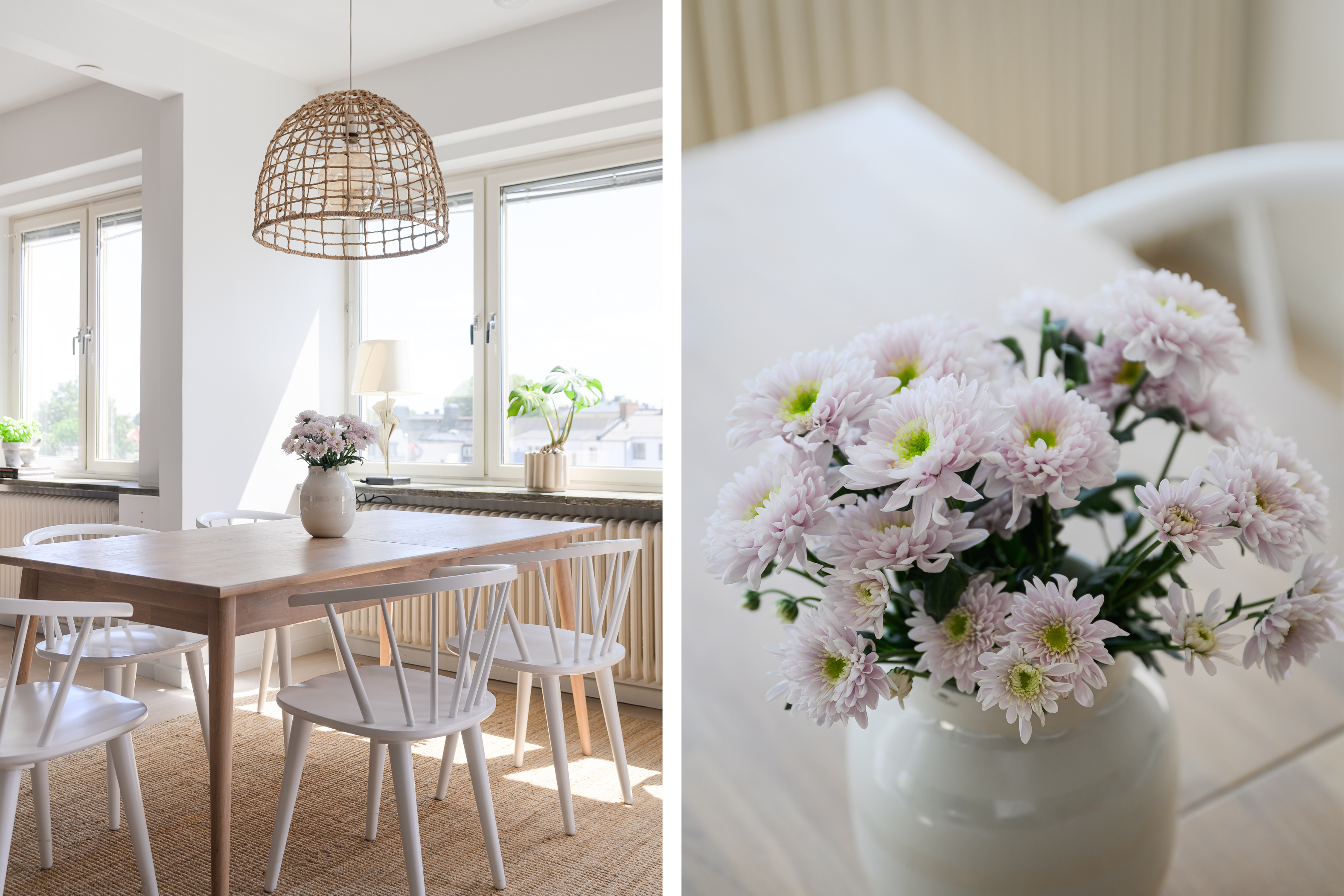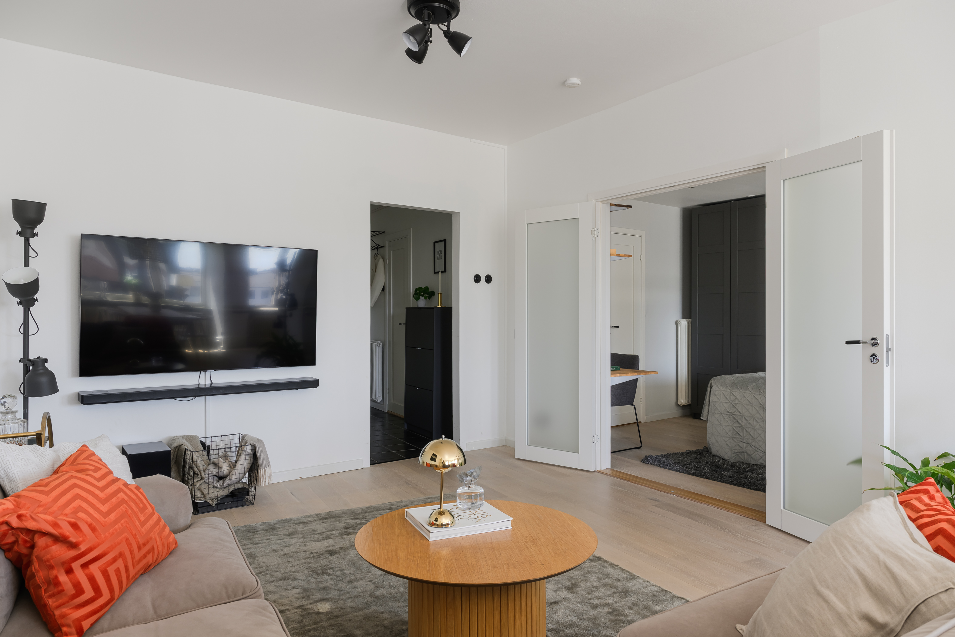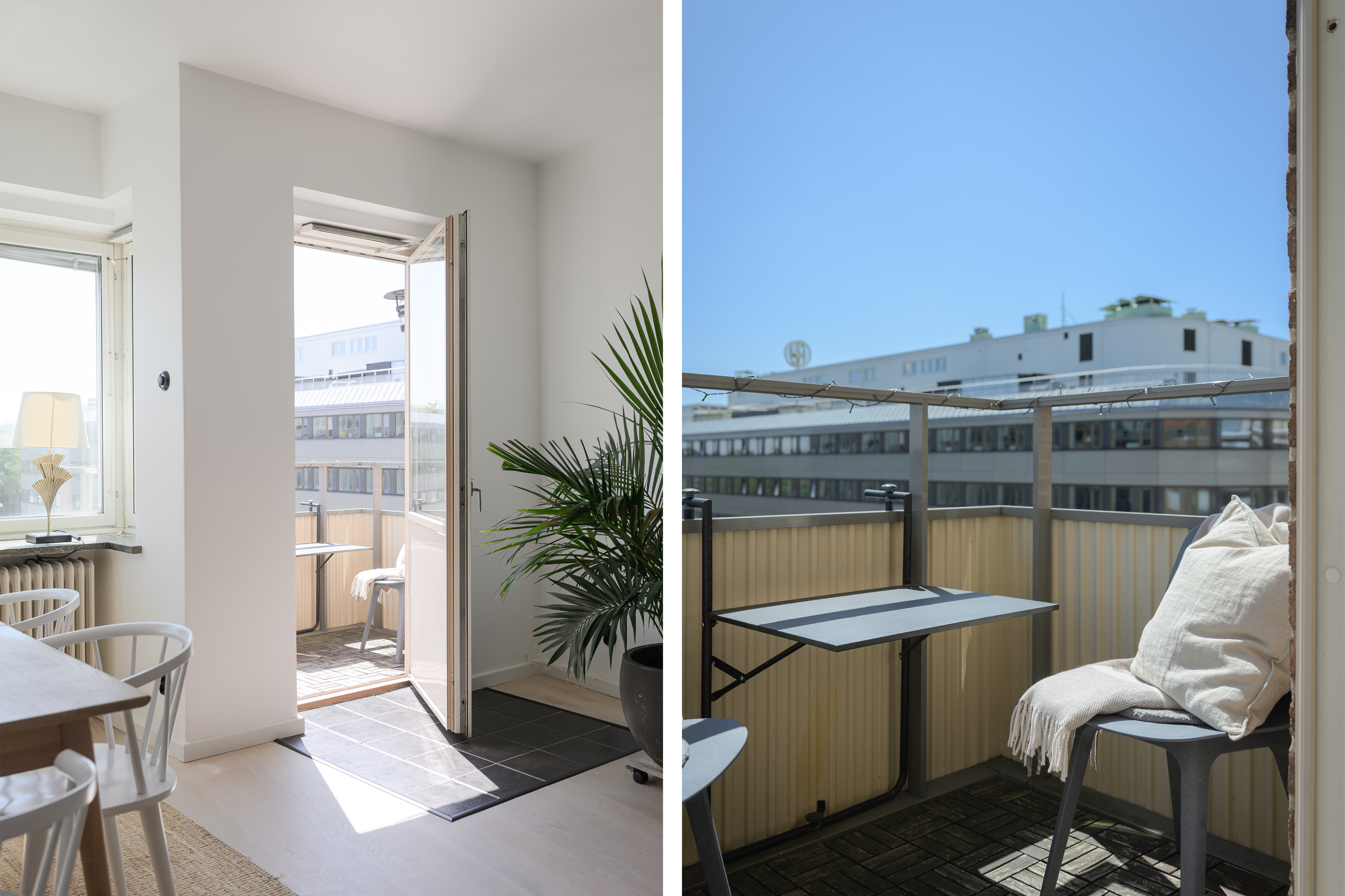 Ljust och rymligt vardagsrum med vacker ekparkett, vita väggar och generösa fönsterpartier som släpper in härligt ljus. Här finns plats för både stor soffgrupp, TV-hörna och ett rejält matbord i det charmiga burspråket. Från vardagsrummet nås en solig balkong i söderläge med fantastisk cityutsikt över takåsarna.