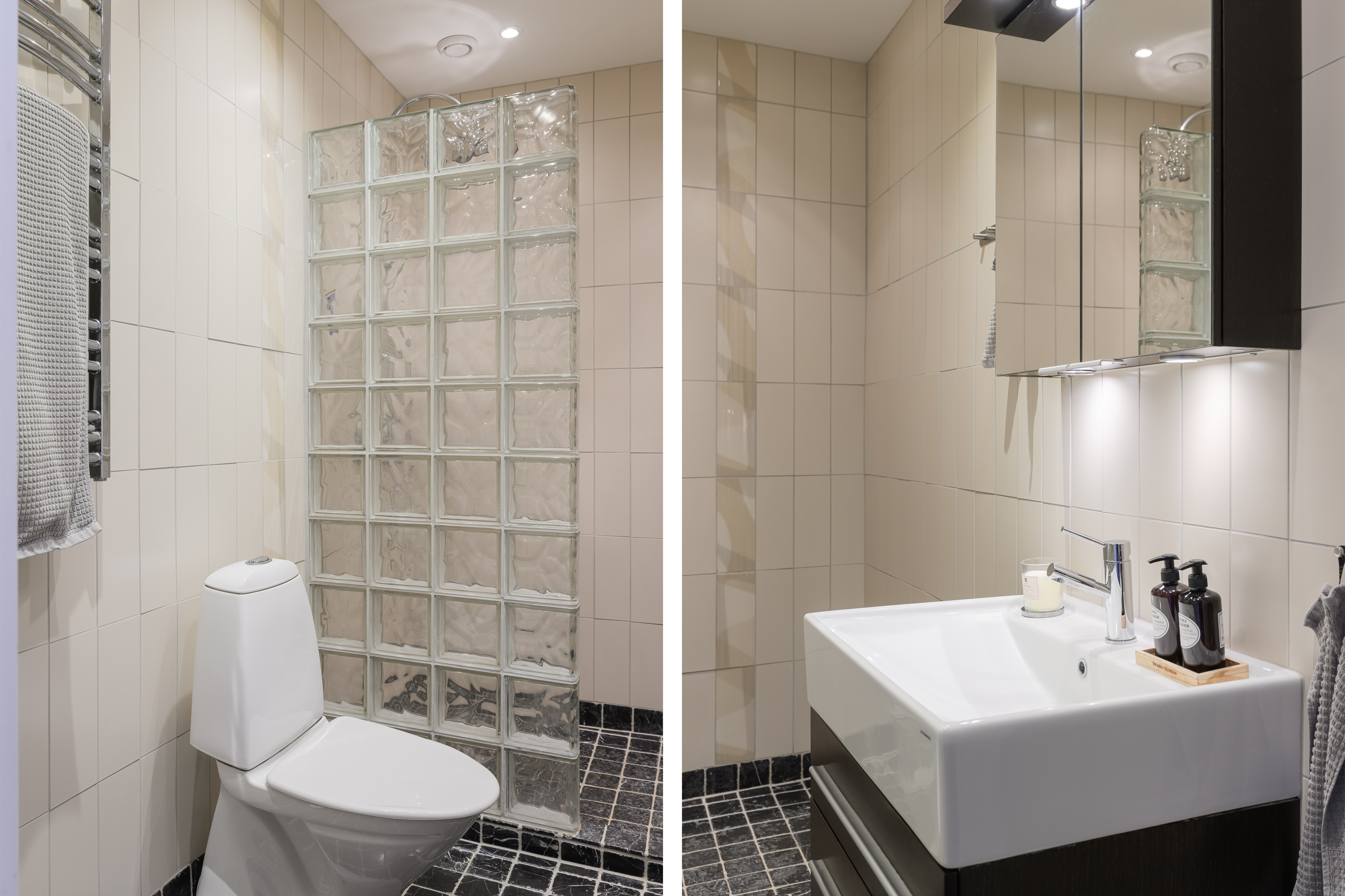 Stilrent helkaklat badrum med svart klinkergolv och ljusa väggar i snygg kontrast. Här finns en stor dusch med glasblocksvägg, spegelskåp med belysning, kommod, wc och handdukstork – praktiskt utrustat med stilrena detaljer.