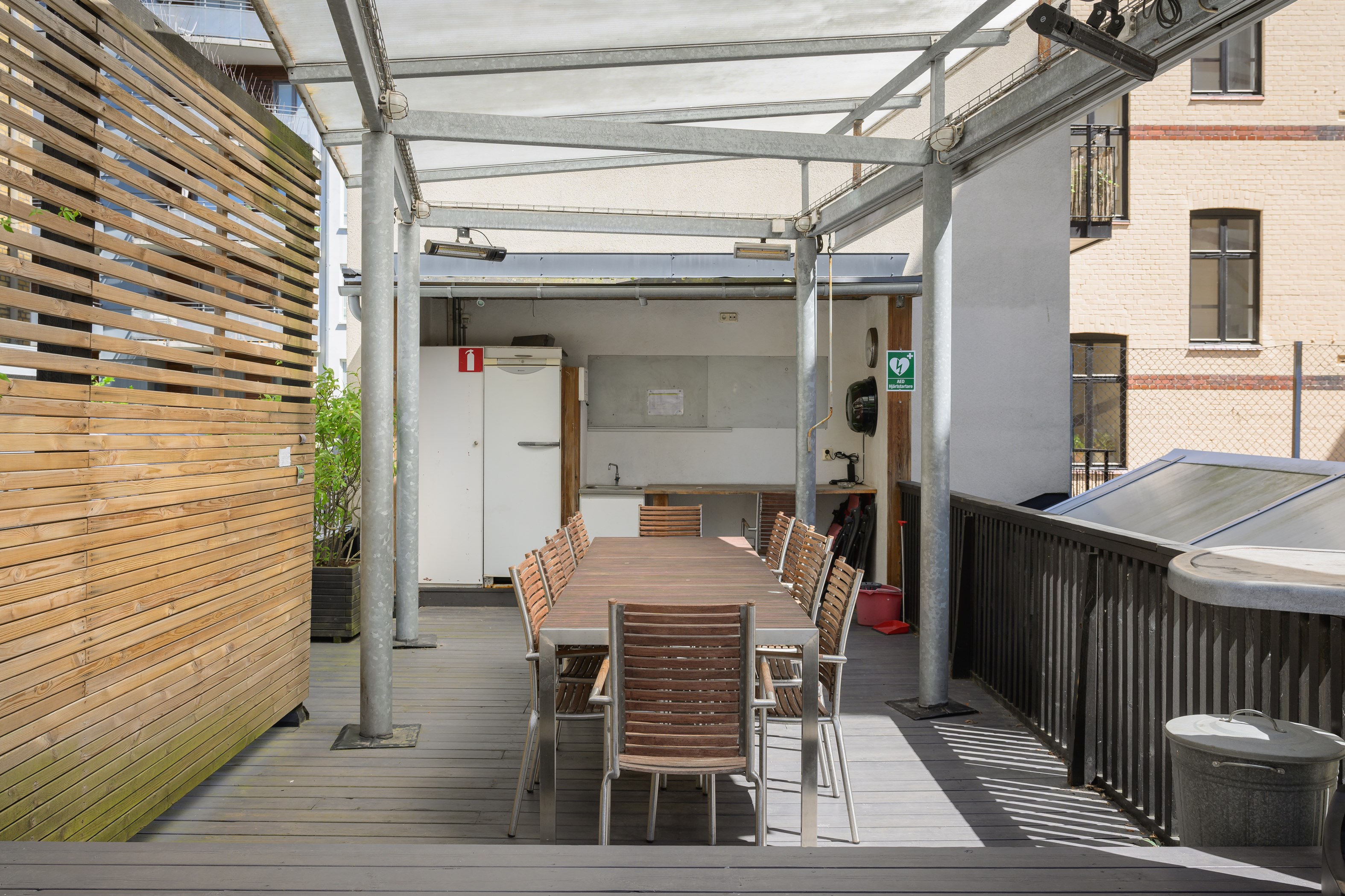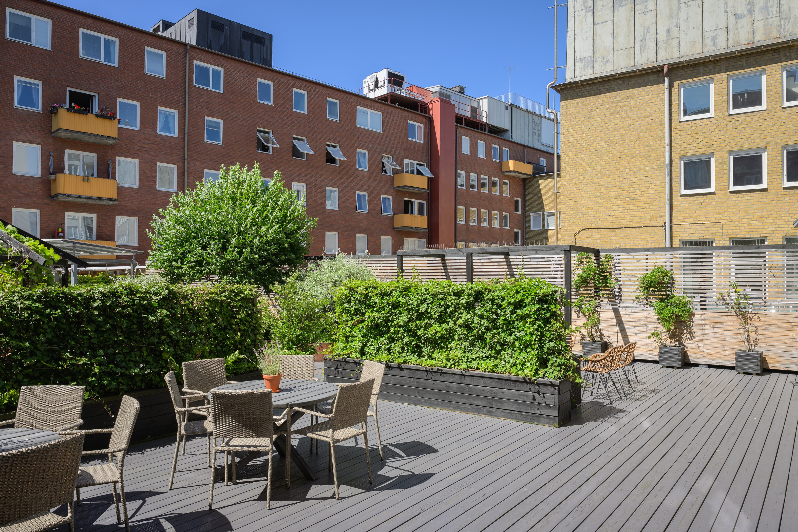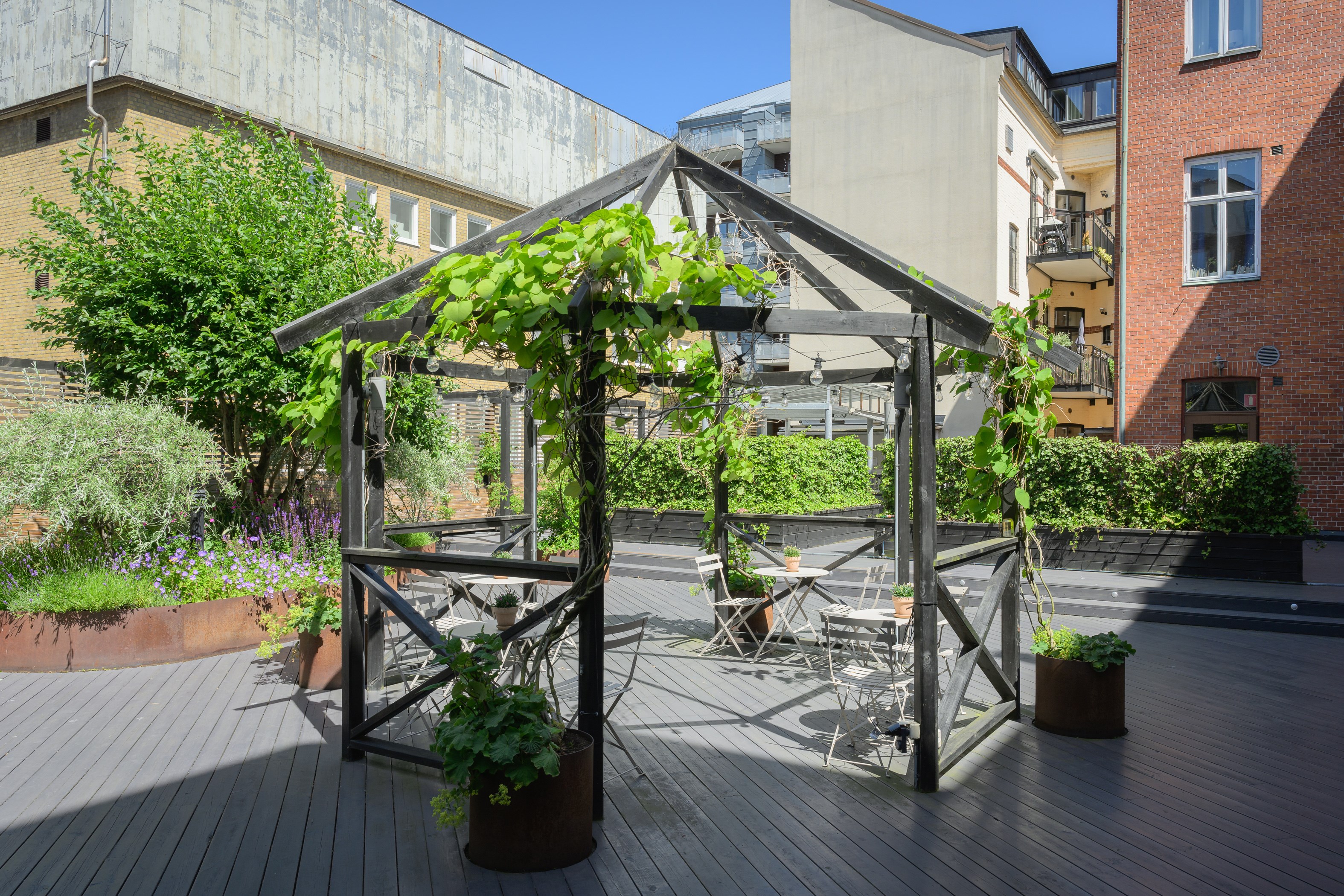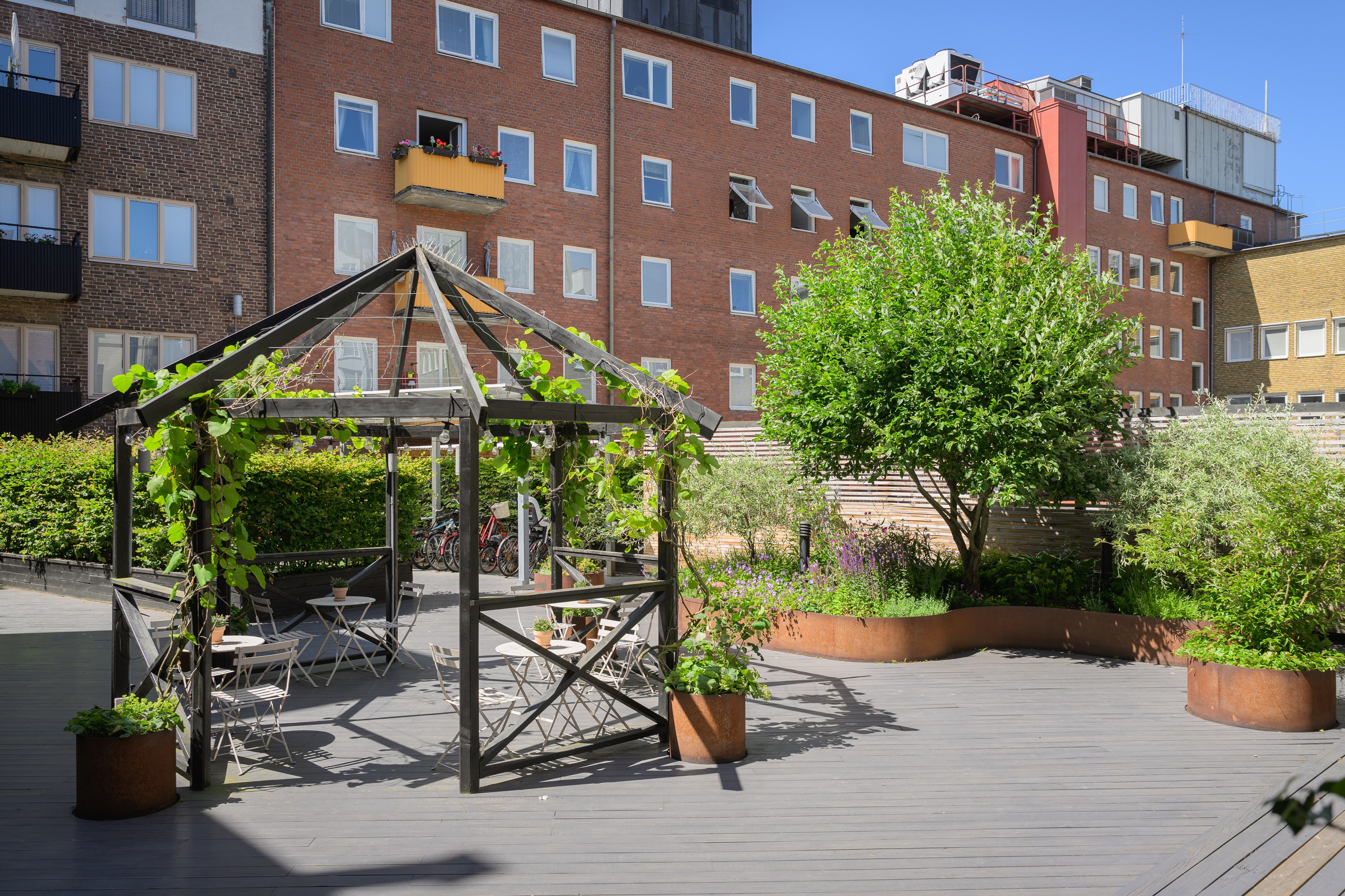 Välskött innergård med sittgrupper och grill. Går att boka för medlemmar.