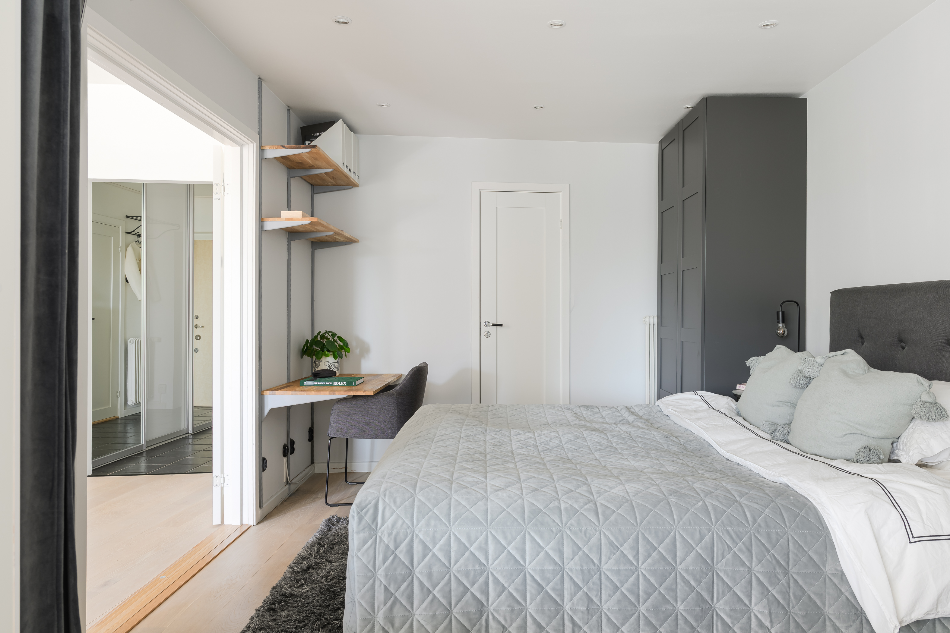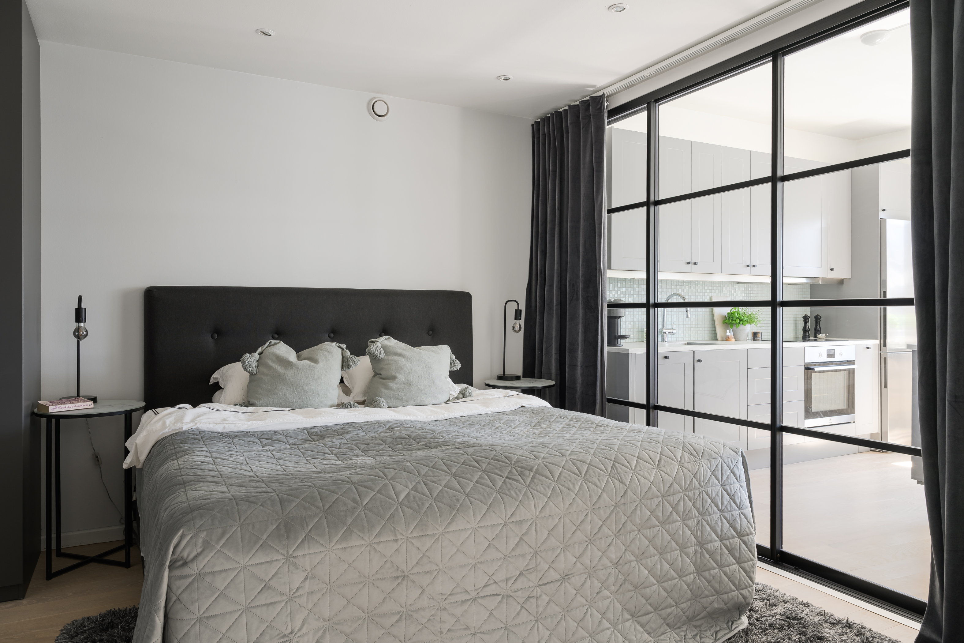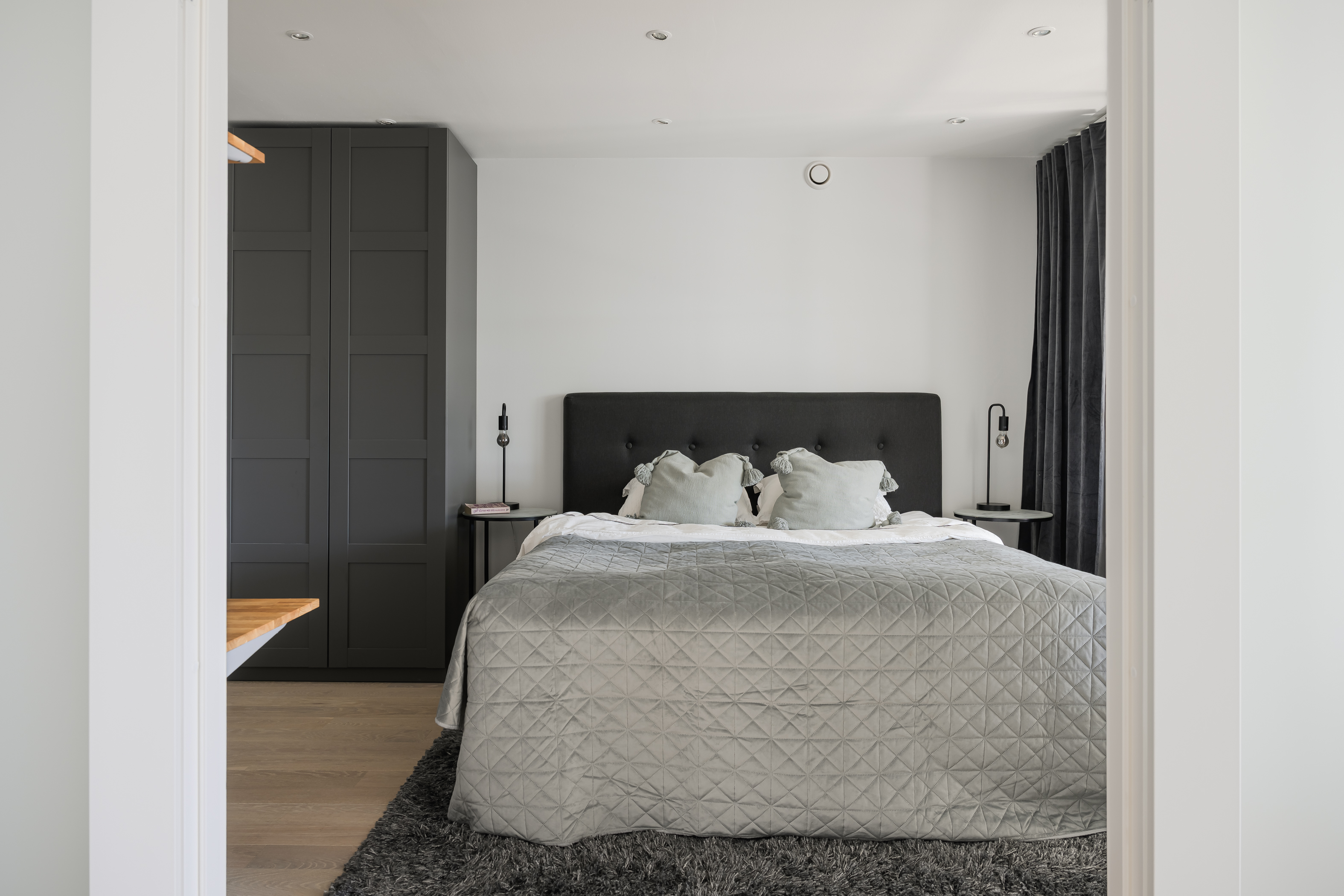 Rofyllt sovrum med dubbeldörrar och skjutdörrar i glas som släpper in ett generöst ljusflöde. Spotlights i taket bidrar med behaglig belysning och det enhetliga golvet skapar en harmonisk känsla. Här finns både garderob, en rymlig klädkammare samt plats för skrivbord eller byrå.
