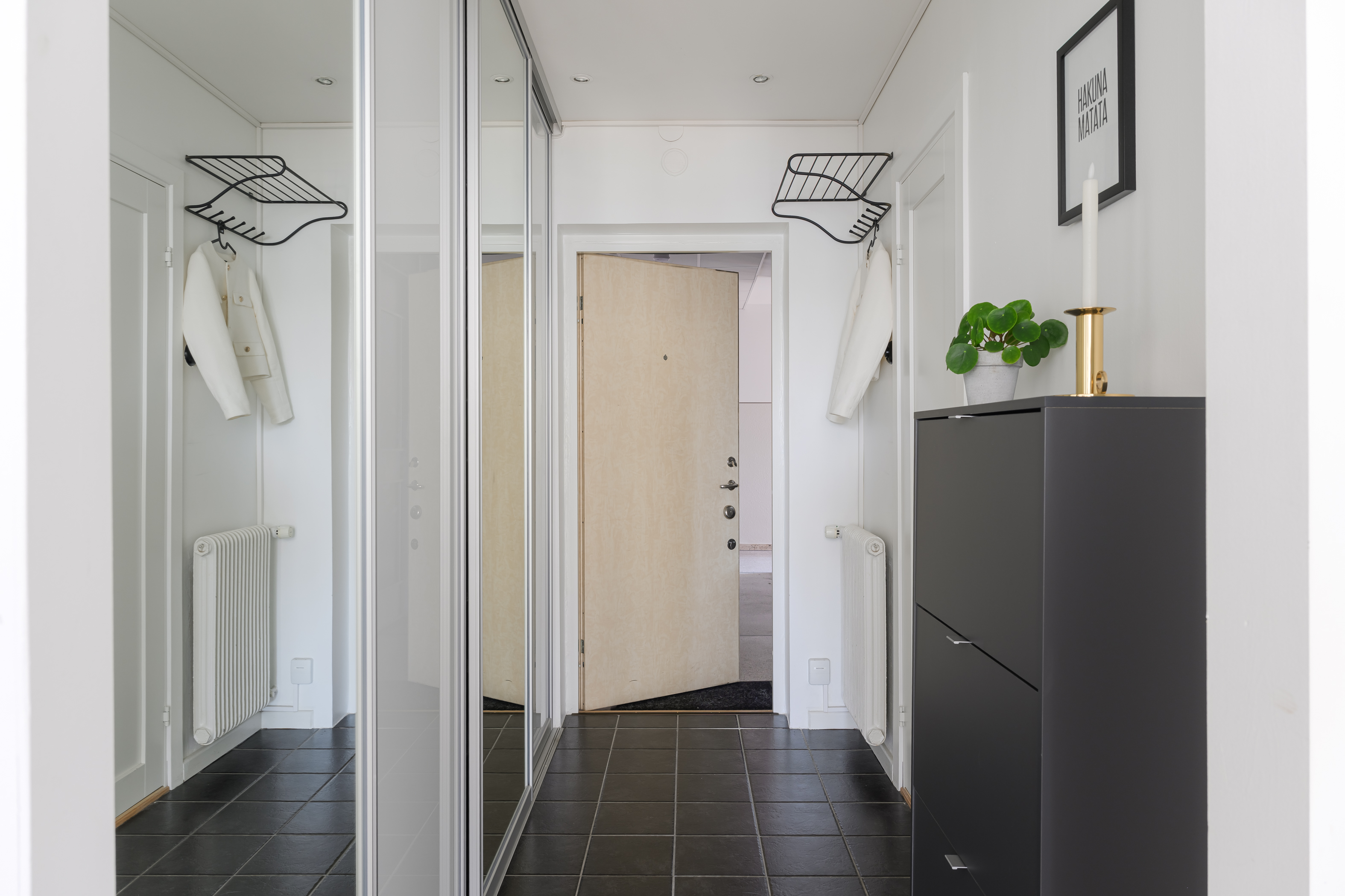 Välkomnande hall med svart klinkergolv och vita väggar som skapar en modern känsla. Gott om förvaring i skjutdörrsgarderober med spegelglas, spotlights i taket och bra avhängningsmöjligheter.