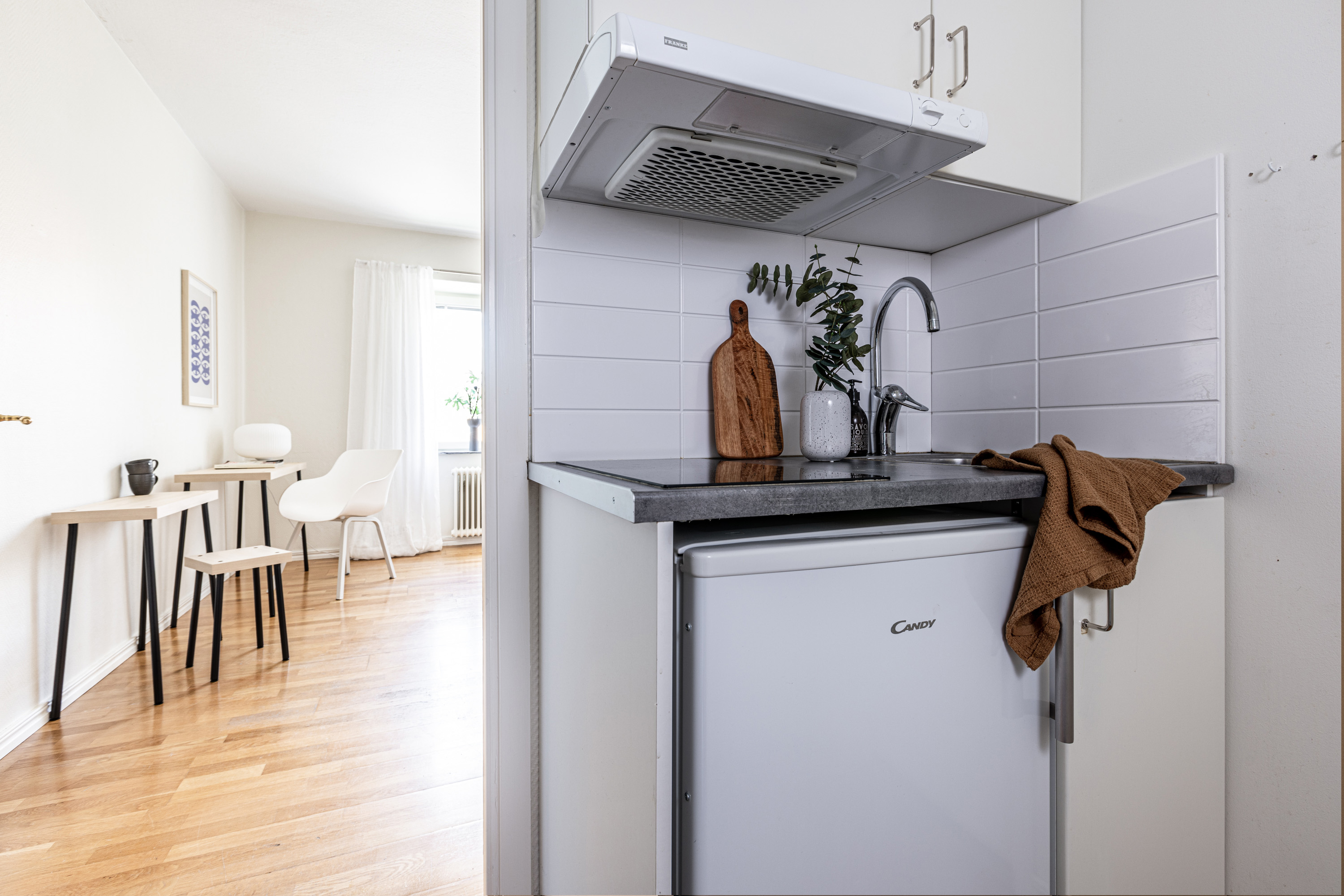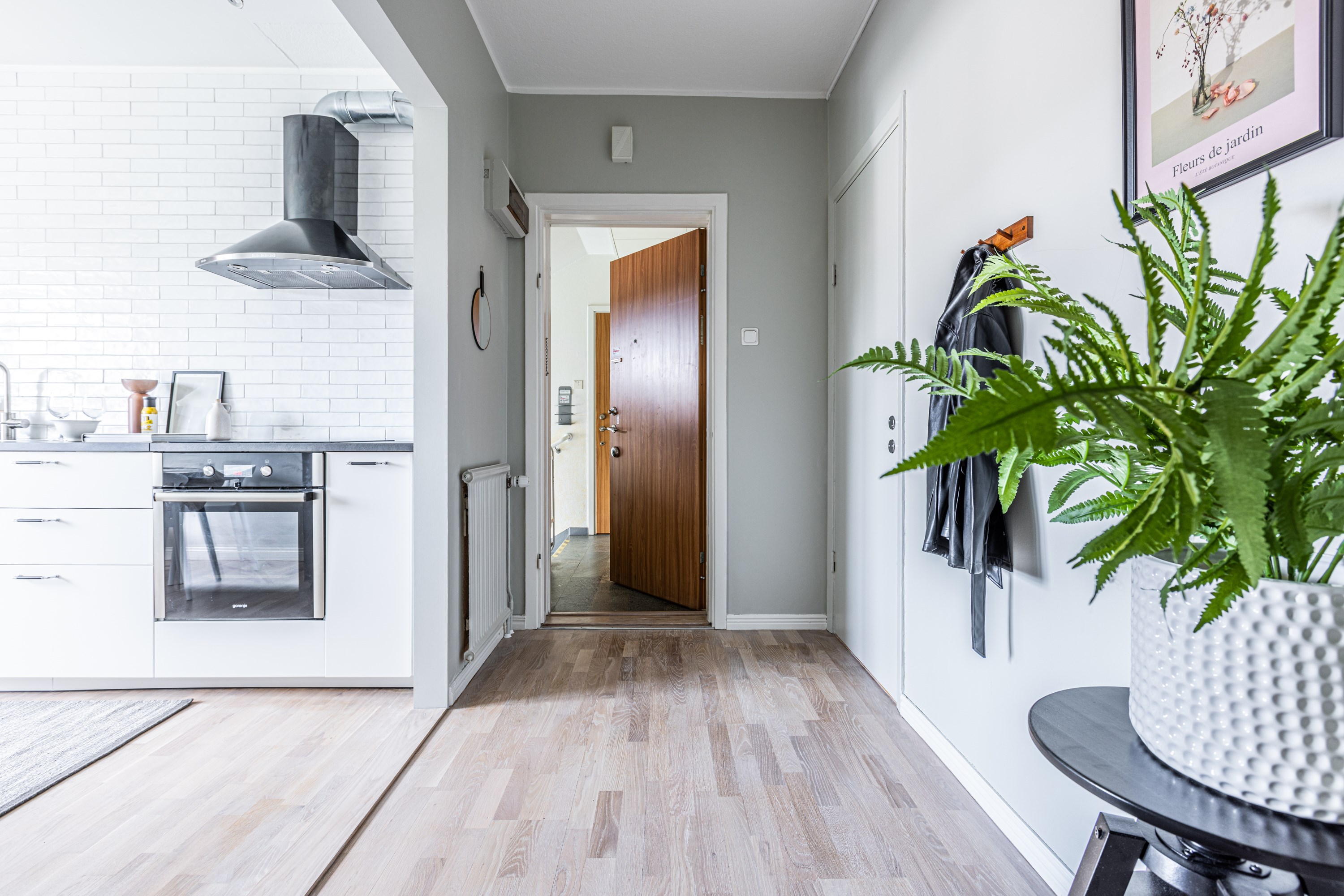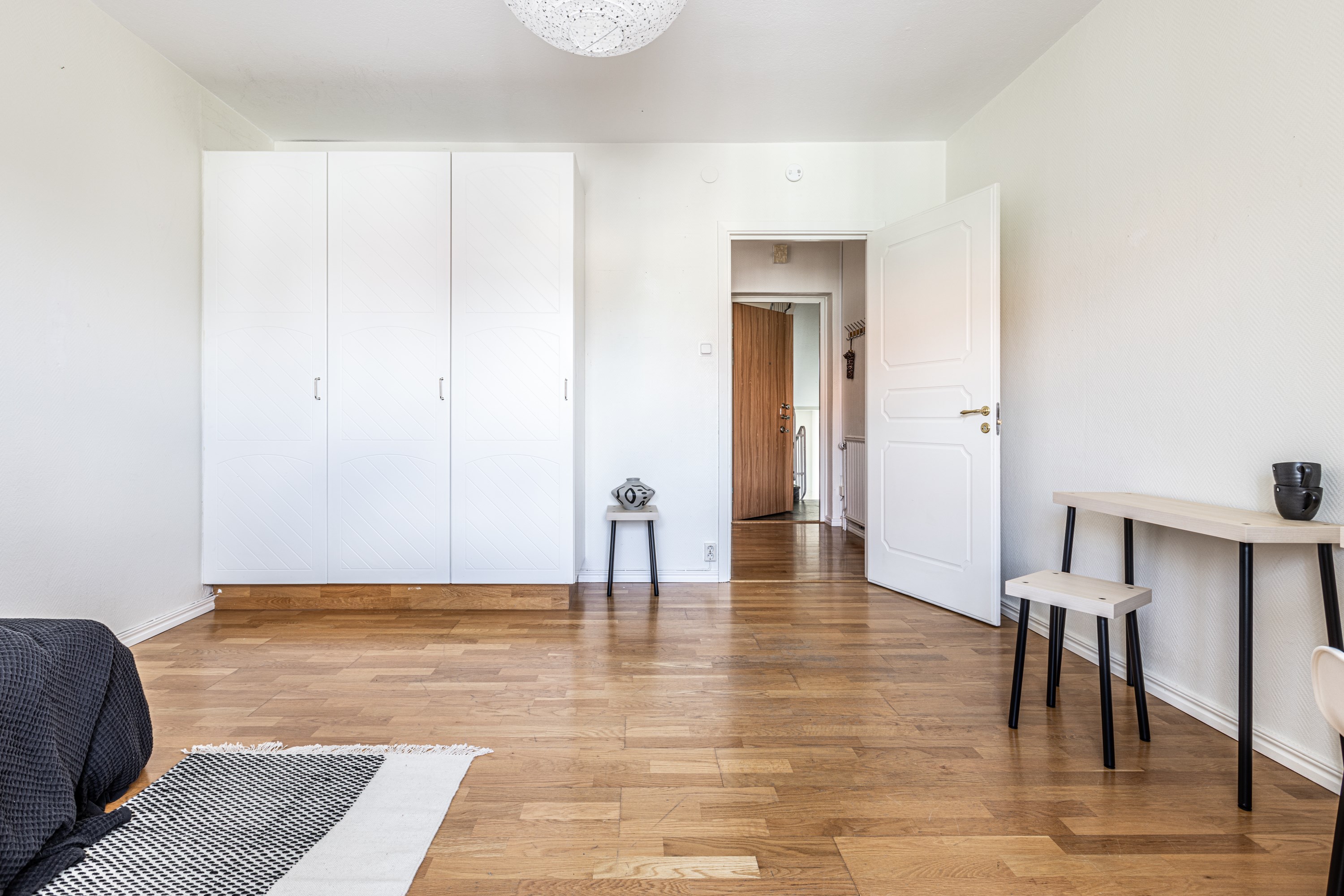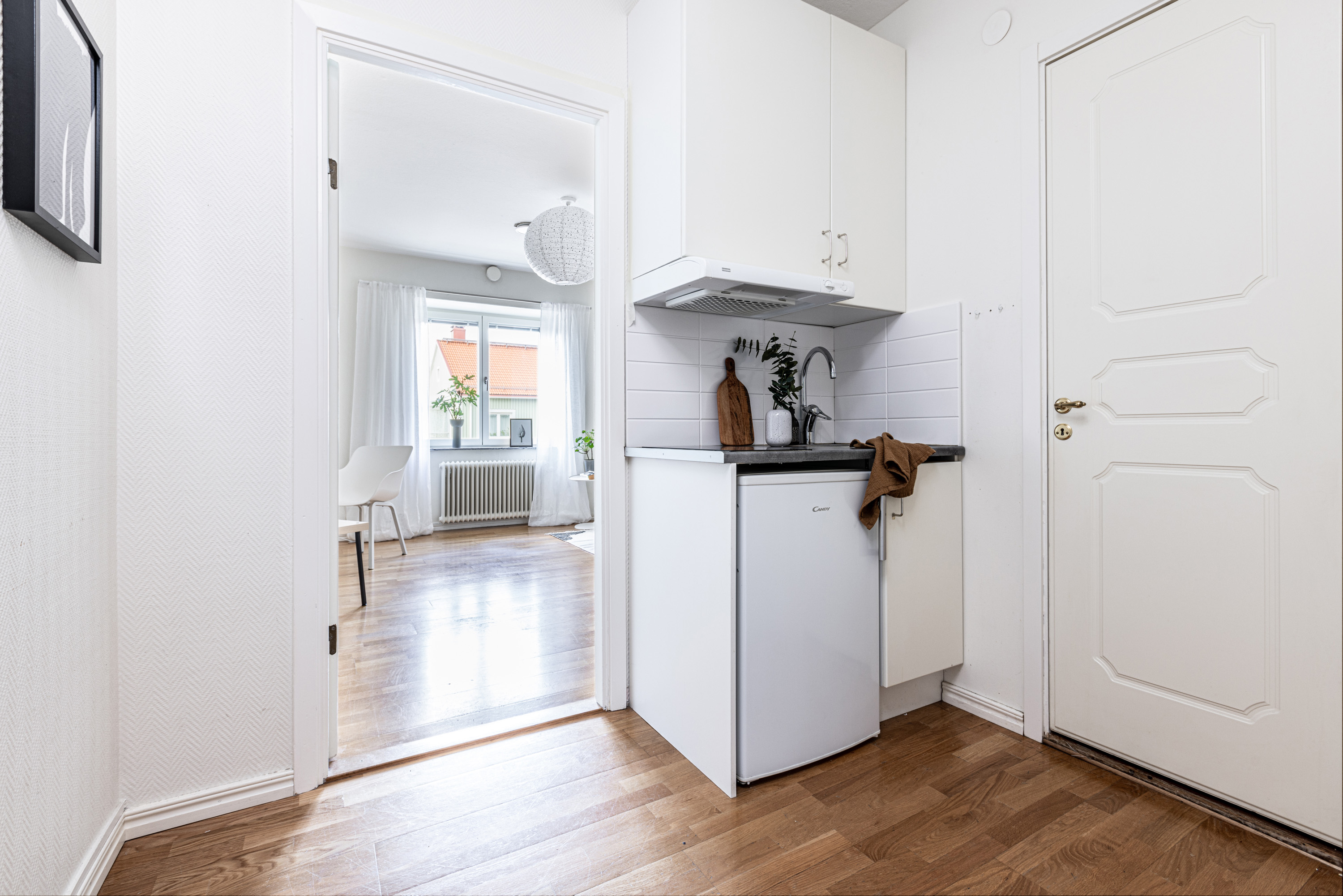 Välkommen! Vi börjar med att gå en rundtur i 2-rummaren och det första rummet som vi möts av är hallen. Under era fötter ligger ett nyslipat parkettgolv i ek som löper vidare genom lägenhetens alla rum. Plats för avhängning till vänster om entrén och förvaring lite längre fram till höger i praktisk klädkammare. Första svängen till höger leder oss in i det nyrenoverade köket, signerat IKEA. Gott om förvaring i lådor och skafferi samt goda arbetsytor ovan bänkskiva i laminat. Maskinparken består av kyl och frys, integrerad diskmaskin, ugn, induktionshäll och fläkt. Plats för matbord! Lite längre fram till höger disponeras det rofyllda sovrummet, beläget in mot den lugna innergården. Här rymmer du utan problem dubbelsäng med nattduksbord på vardera sida. Förvaring via inbygga garderober och plats finns även för byrå om så önskas. Rakt fram från hallen sett ligger badrummet. Badrummet är nyrenoverat och här har man valt att kosta på med kakel och klinker på väggar och golv. Badrummet är försett med wc, handfat med kommod, handdukstork och dusch. Sist men inte minst har vi vardagsrummet som ligger placerat en bit in till vänster. De väl tilltagna ytorna gör det fullt möjligt att möblera med soffgrupp och matsalsmöbel utan att rummet känns övermöblerat. Härifrån tar ni er ut på den inglasade balkongen som ligger till fördel för eftermiddags- och kvällssol. Dörren som länkar samman lägenheterna med varandra är låst men man har valt att inte bygga igen den för den händelse att nästa ägare vill använda lägenheten som en sammanhållen 3-rummare. 1:an nås i dagsläget via separat dörr i trapphuset. Denna lägenhet är yteffektiv och har kombinerad hall/kök, rymligt badrum med dusch och ett stort allrum med garderobsvägg samt plats för säng, matbord och skrivbord om så önskas. I hall och allrum pryds golvytorna av ett parkettgolv i ek. OBS! Föreningen kommer att renovera balkongerna.