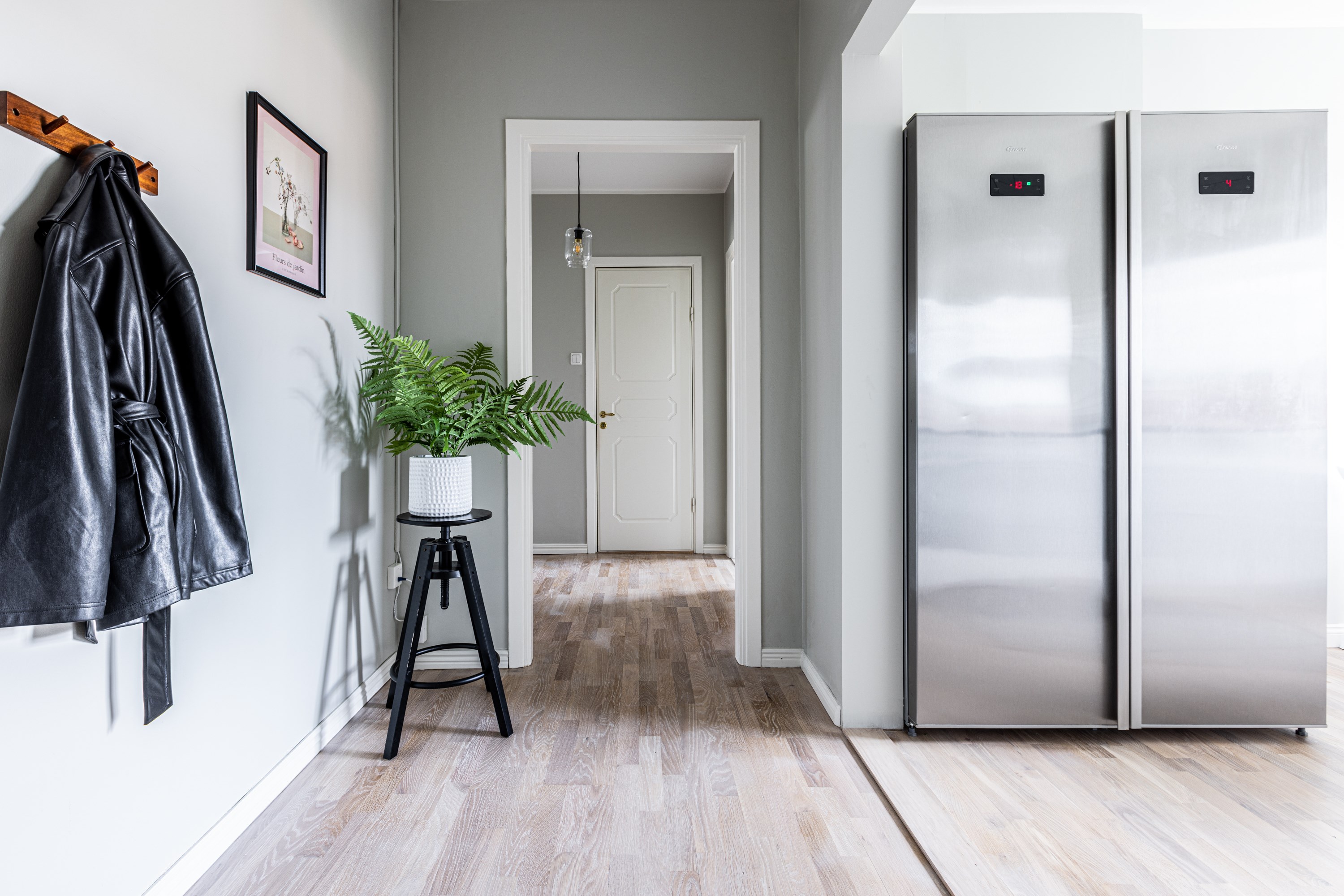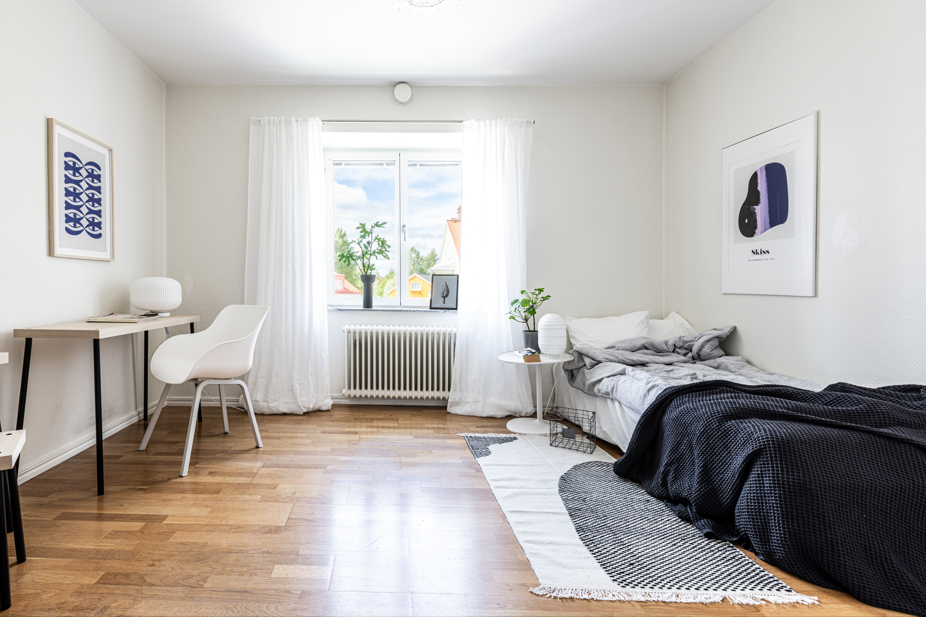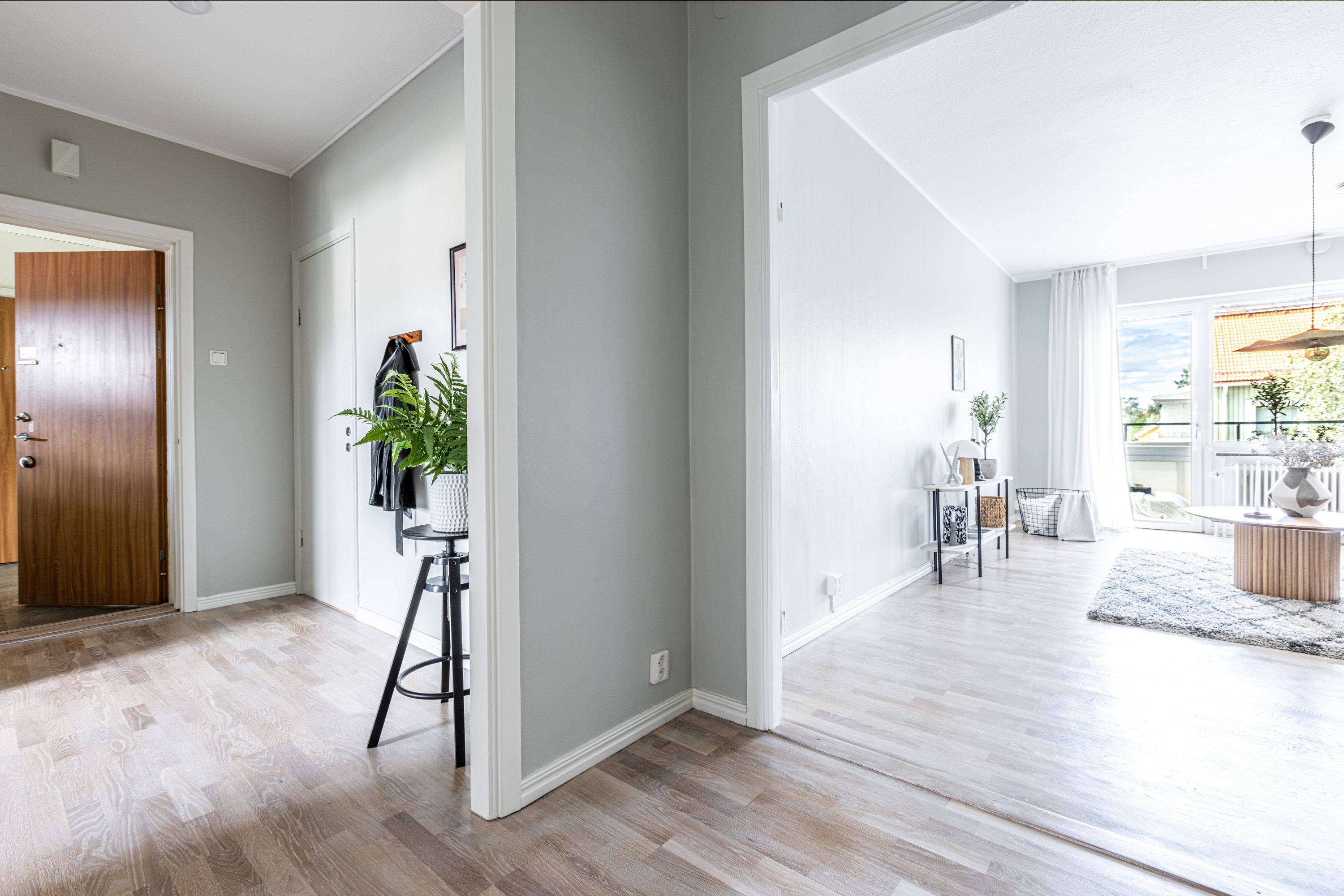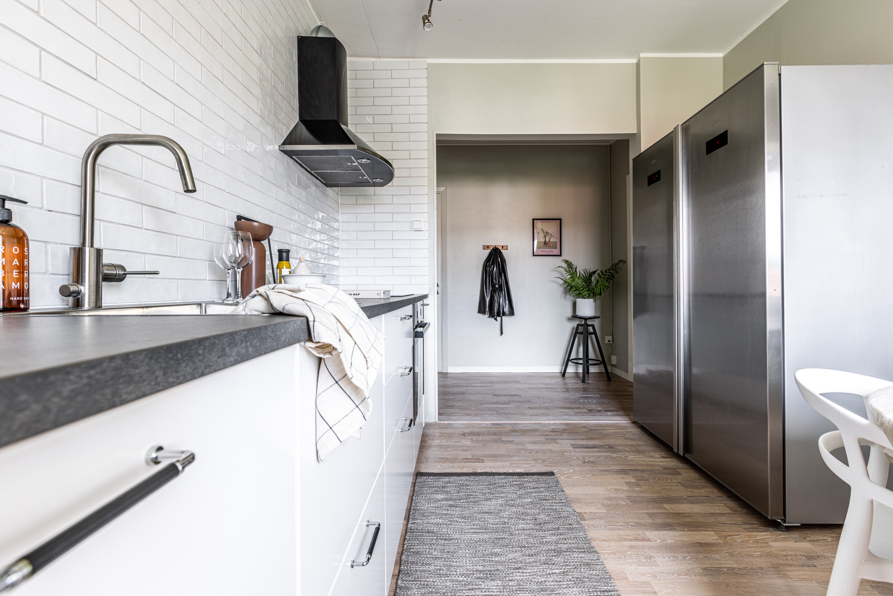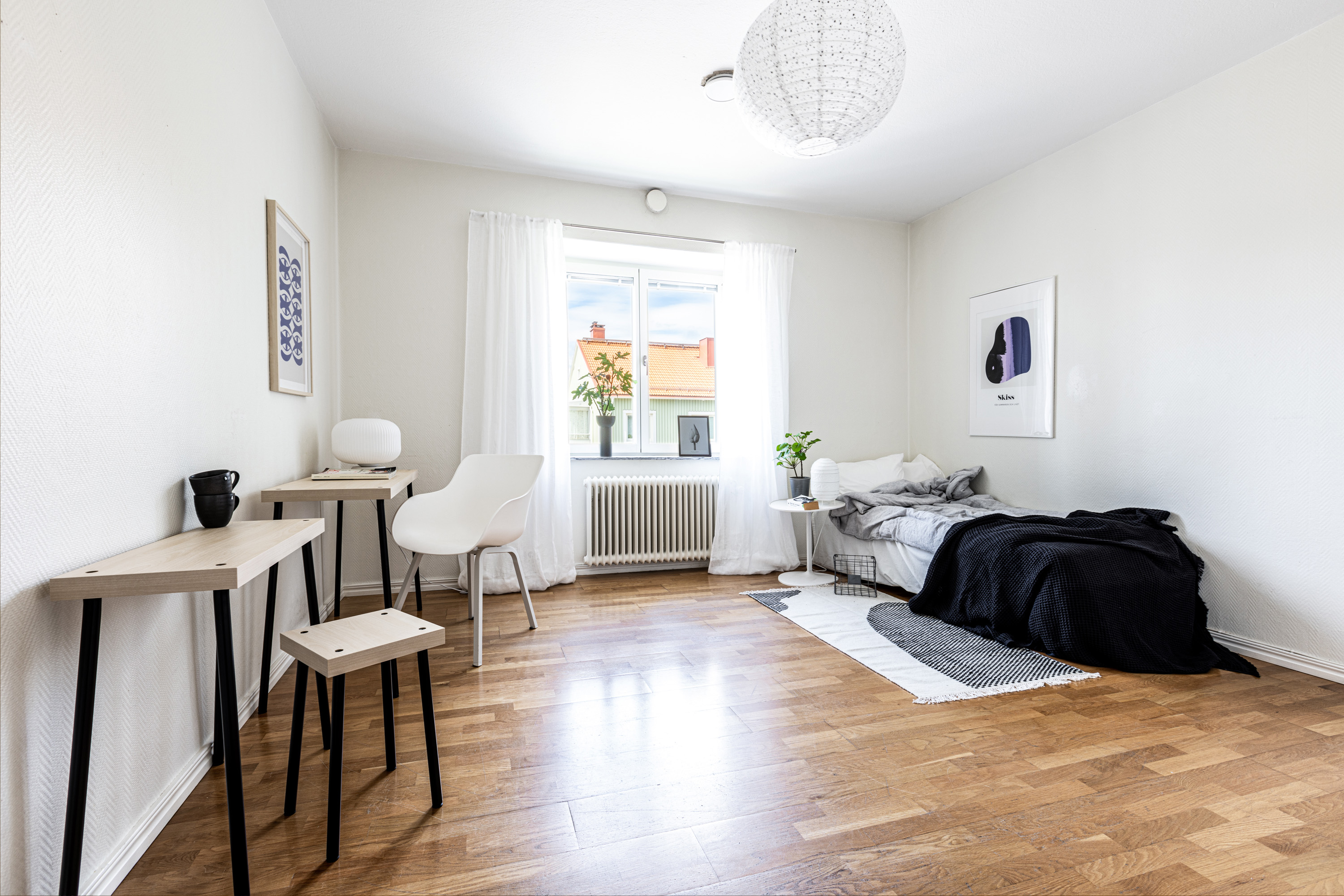 Välkommen! Vi börjar med att gå en rundtur i 2-rummaren och det första rummet som vi möts av är hallen. Under era fötter ligger ett nyslipat parkettgolv i ek som löper vidare genom lägenhetens alla rum. Plats för avhängning till vänster om entrén och förvaring lite längre fram till höger i praktisk klädkammare. Första svängen till höger leder oss in i det nyrenoverade köket, signerat IKEA. Gott om förvaring i lådor och skafferi samt goda arbetsytor ovan bänkskiva i laminat. Maskinparken består av kyl och frys, integrerad diskmaskin, ugn, induktionshäll och fläkt. Plats för matbord! Lite längre fram till höger disponeras det rofyllda sovrummet, beläget in mot den lugna innergården. Här rymmer du utan problem dubbelsäng med nattduksbord på vardera sida. Förvaring via inbygga garderober och plats finns även för byrå om så önskas. Rakt fram från hallen sett ligger badrummet. Badrummet är nyrenoverat och här har man valt att kosta på med kakel och klinker på väggar och golv. Badrummet är försett med wc, handfat med kommod, handdukstork och dusch. Sist men inte minst har vi vardagsrummet som ligger placerat en bit in till vänster. De väl tilltagna ytorna gör det fullt möjligt att möblera med soffgrupp och matsalsmöbel utan att rummet känns övermöblerat. Härifrån tar ni er ut på den inglasade balkongen som ligger till fördel för eftermiddags- och kvällssol. Dörren som länkar samman lägenheterna med varandra är låst men man har valt att inte bygga igen den för den händelse att nästa ägare vill använda lägenheten som en sammanhållen 3-rummare. 1:an nås i dagsläget via separat dörr i trapphuset. Denna lägenhet är yteffektiv och har kombinerad hall/kök, rymligt badrum med dusch och ett stort allrum med garderobsvägg samt plats för säng, matbord och skrivbord om så önskas. I hall och allrum pryds golvytorna av ett parkettgolv i ek. OBS! Föreningen kommer att renovera balkongerna.