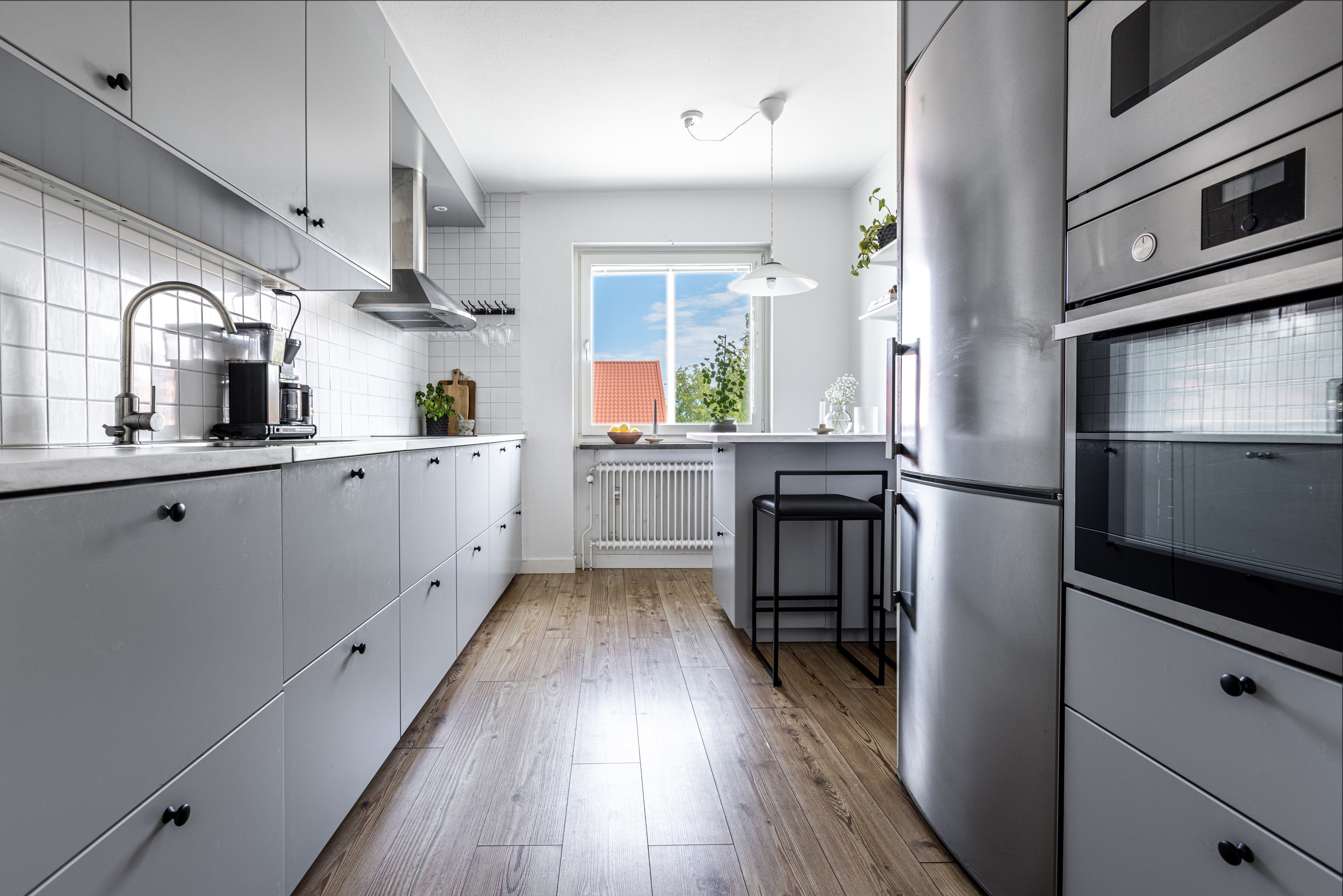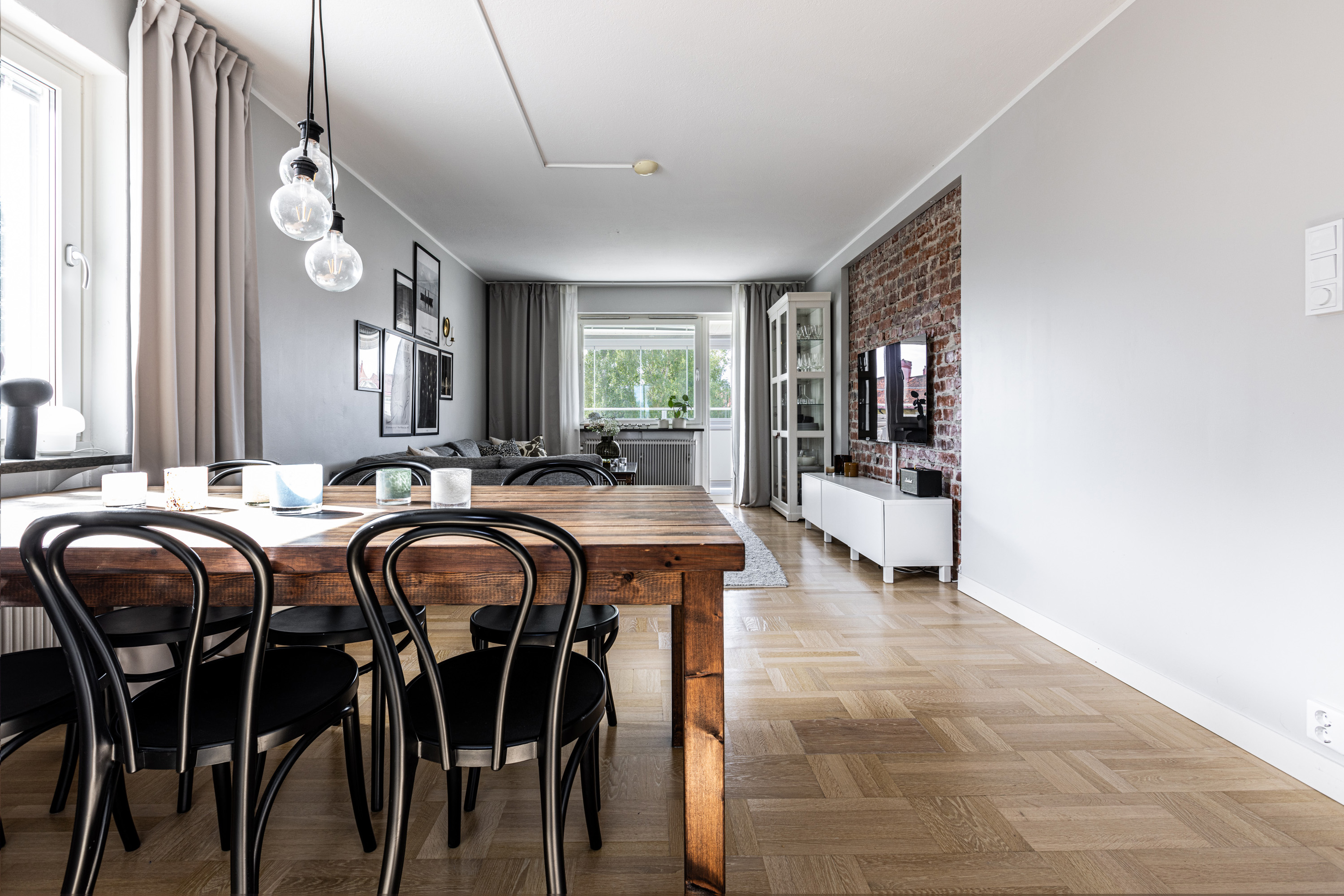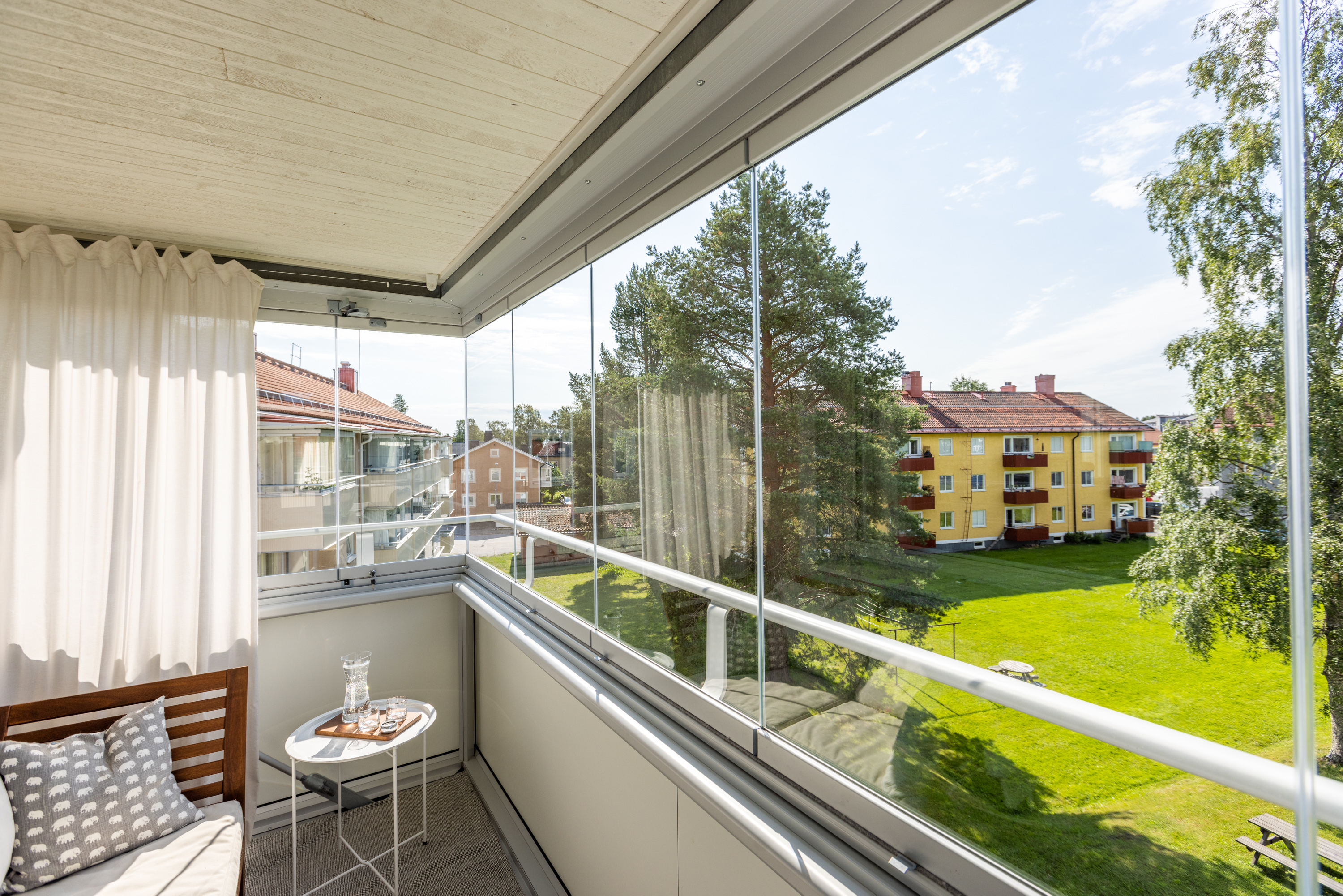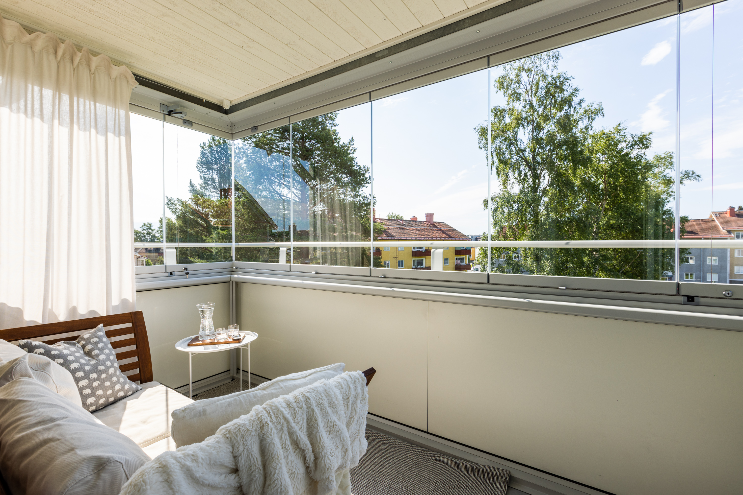 Stig på! Fötterna placerar ni på ett fint ekparkettgolv som löper vidare in genom den inre hallen och vardagsrummet. Till vänster om entrén disponeras ett mindre kapprum med plats för hatt- och skohylla samt garderober. Yta för avhängning ges även direkt till höger om entrén. Första svängen till vänster leder er genom kapprummet och in i badrummet. Stambytt, helkaklat badrum med vita kakelplattor på väggarna som snyggt bryts av mot ett mörkt klinkergolv. Här finns wc, handfat med kommod, spegel med belysning, dusch och ett fönsterparti - perfekt för vädring och naturligt ljusinsläpp. Badrummet är även utrustat med en tvättyta som inkluderar tvättmaskin, arbetsbänk och badrumsskåp. Till vänster om hallen återfinns även det renoverade köket. Här ges ni gott om förvaring i överskåp, lådor och köksö tillika generösa arbetsytor. Maskinparken består av kyl/frys, inbyggd ugn och mikro, integrerad diskmaskin, induktionshäll och fläkt. Köksön används till förvaring, som arbetsyta och matbord. Vardagsrummet ligger direkt i blickfånget när ni kliver in i lägenheten, dvs. rakt fram från hallen sett. Detta är ett ljust och luftigt rum tack vare fönster i två väderstreck och väl tilltagen golvyta. Ytskikten utgörs av ekparkett som ramas in av gråa väggar med undantag för ett parti med tegel. Från vardagsrummet tar ni er ut på den stora, inglasade balkongen med ypperligt söderläge! Lägenheten har två rofyllda sovrum som skiljer sig något i storlek. Huvudsovrummet har plats för dubbelsäng med tillhörande nattduksbord och en skjutdörrsgarderob. Den andra sovrummet nås genom en f.d. klädkammare som idag fungerar som passage samt är försedd med garderober. Sovrum 2 lämpar sig perfekt som barnrum, gästrum och/eller kontor.