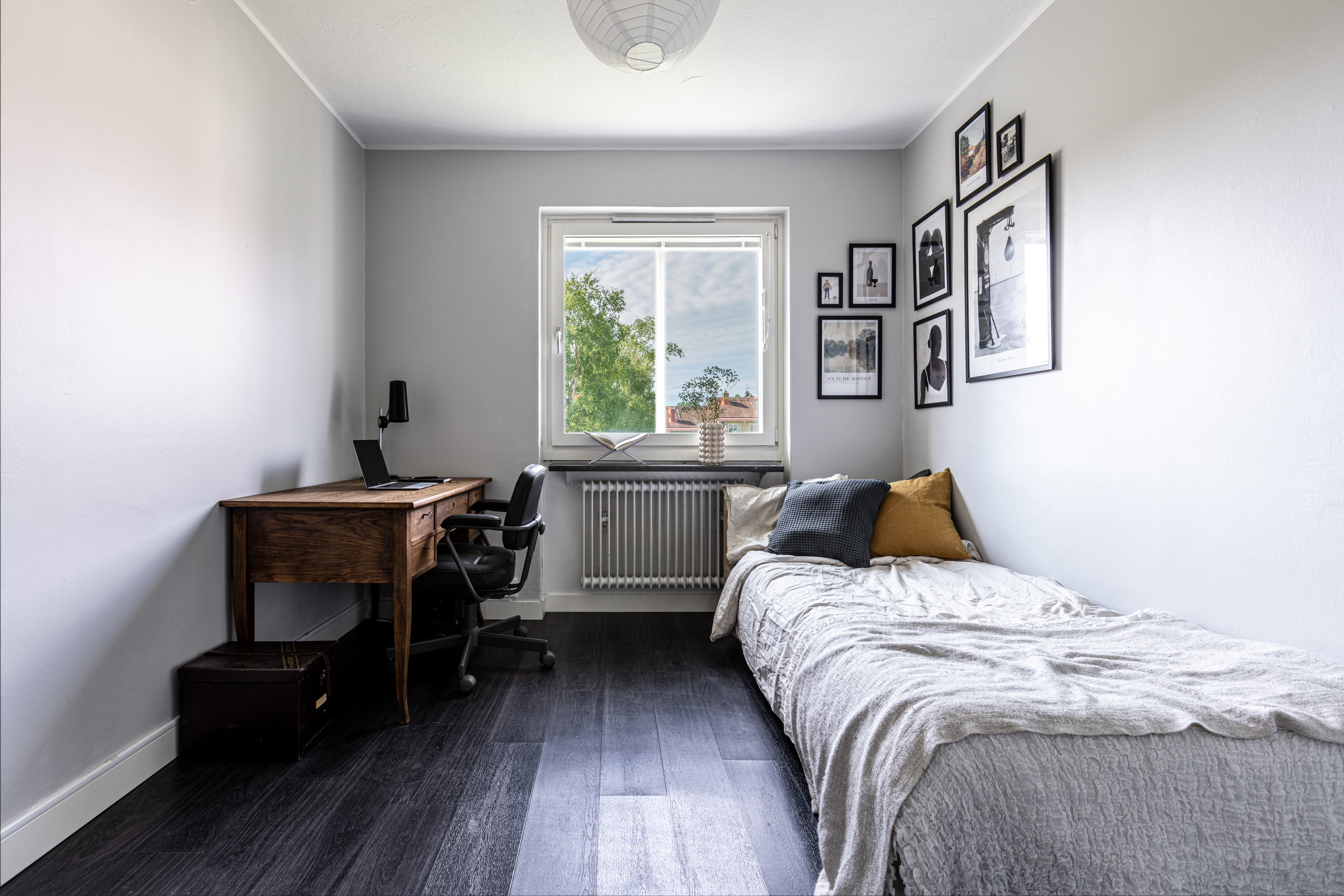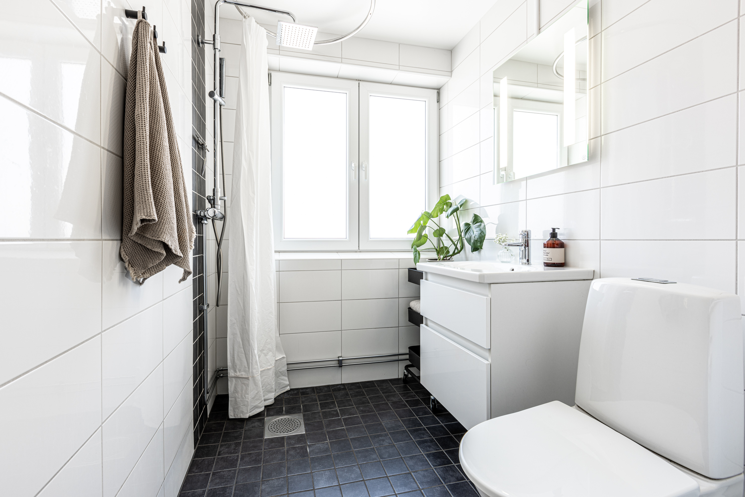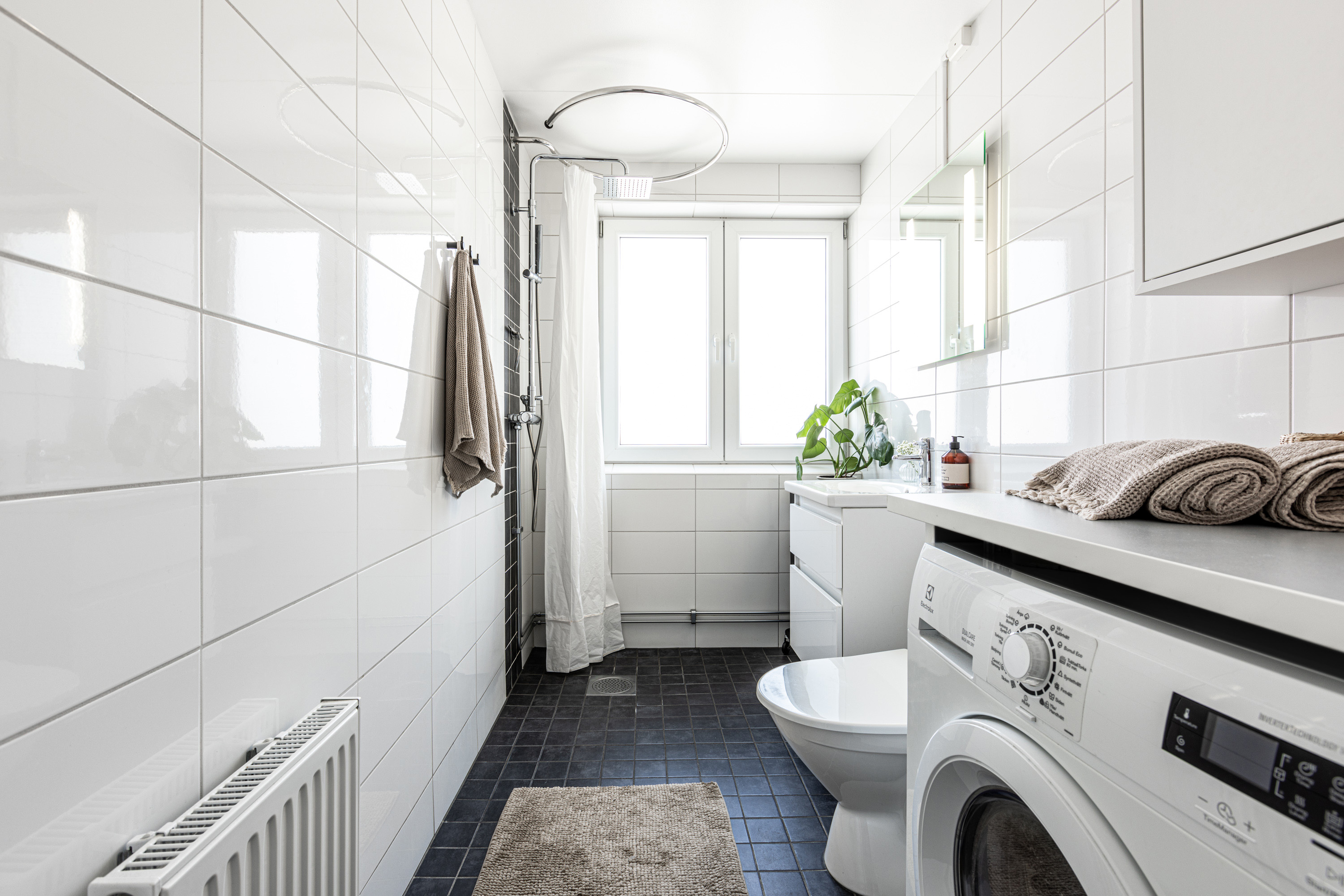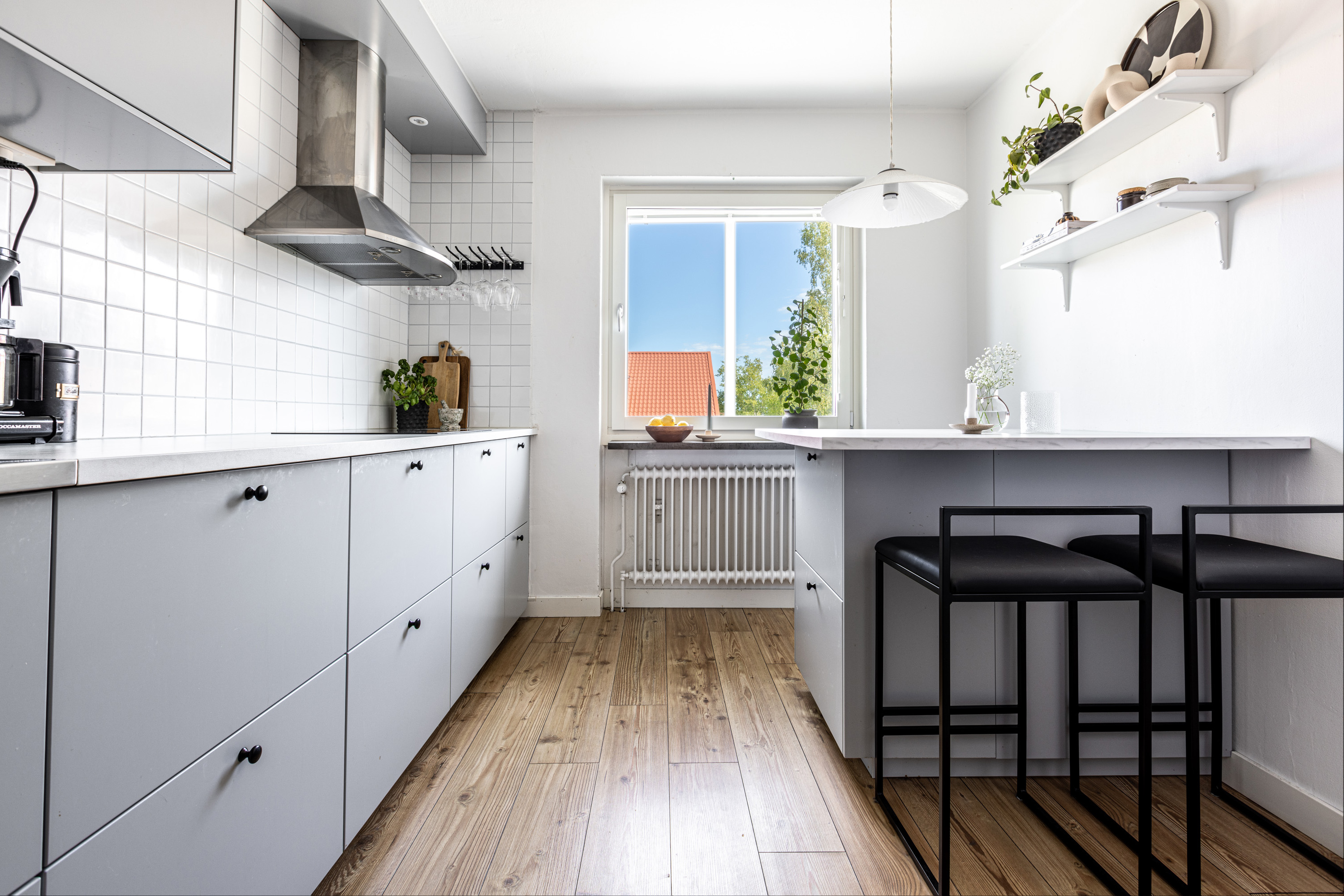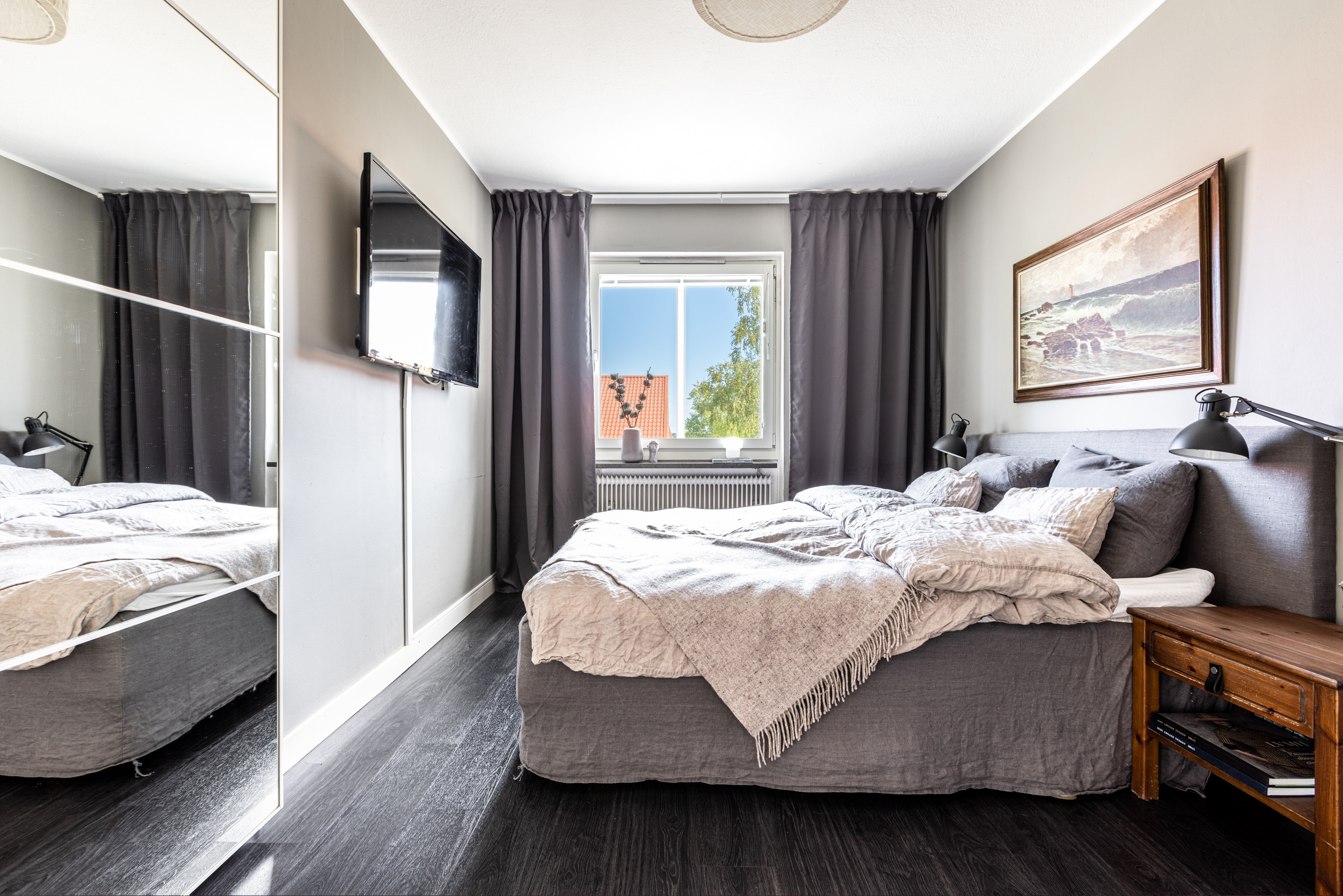 Stig på! Fötterna placerar ni på ett fint ekparkettgolv som löper vidare in genom den inre hallen och vardagsrummet. Till vänster om entrén disponeras ett mindre kapprum med plats för hatt- och skohylla samt garderober. Yta för avhängning ges även direkt till höger om entrén. Första svängen till vänster leder er genom kapprummet och in i badrummet. Stambytt, helkaklat badrum med vita kakelplattor på väggarna som snyggt bryts av mot ett mörkt klinkergolv. Här finns wc, handfat med kommod, spegel med belysning, dusch och ett fönsterparti - perfekt för vädring och naturligt ljusinsläpp. Badrummet är även utrustat med en tvättyta som inkluderar tvättmaskin, arbetsbänk och badrumsskåp. Till vänster om hallen återfinns även det renoverade köket. Här ges ni gott om förvaring i överskåp, lådor och köksö tillika generösa arbetsytor. Maskinparken består av kyl/frys, inbyggd ugn och mikro, integrerad diskmaskin, induktionshäll och fläkt. Köksön används till förvaring, som arbetsyta och matbord. Vardagsrummet ligger direkt i blickfånget när ni kliver in i lägenheten, dvs. rakt fram från hallen sett. Detta är ett ljust och luftigt rum tack vare fönster i två väderstreck och väl tilltagen golvyta. Ytskikten utgörs av ekparkett som ramas in av gråa väggar med undantag för ett parti med tegel. Från vardagsrummet tar ni er ut på den stora, inglasade balkongen med ypperligt söderläge! Lägenheten har två rofyllda sovrum som skiljer sig något i storlek. Huvudsovrummet har plats för dubbelsäng med tillhörande nattduksbord och en skjutdörrsgarderob. Den andra sovrummet nås genom en f.d. klädkammare som idag fungerar som passage samt är försedd med garderober. Sovrum 2 lämpar sig perfekt som barnrum, gästrum och/eller kontor.