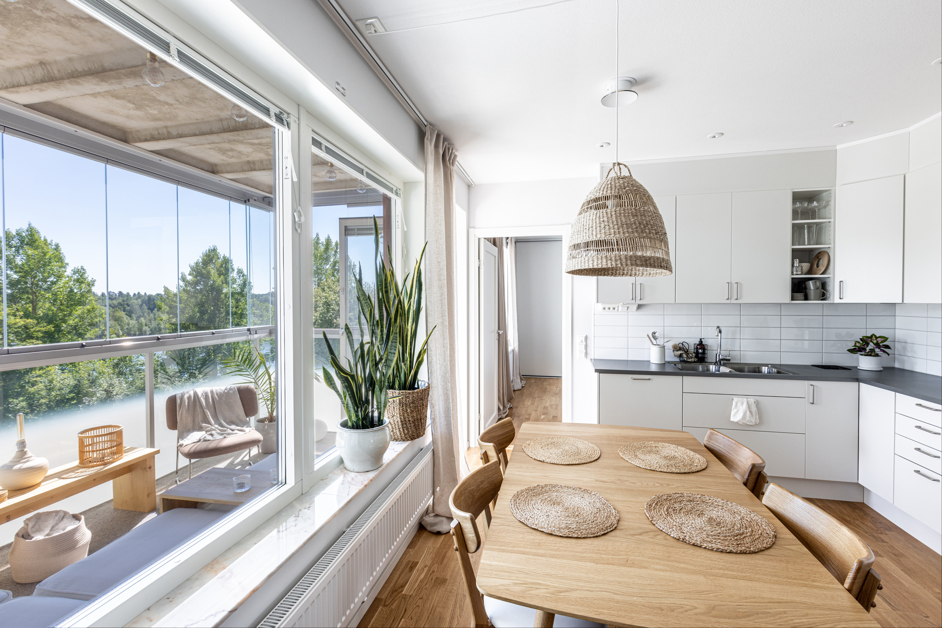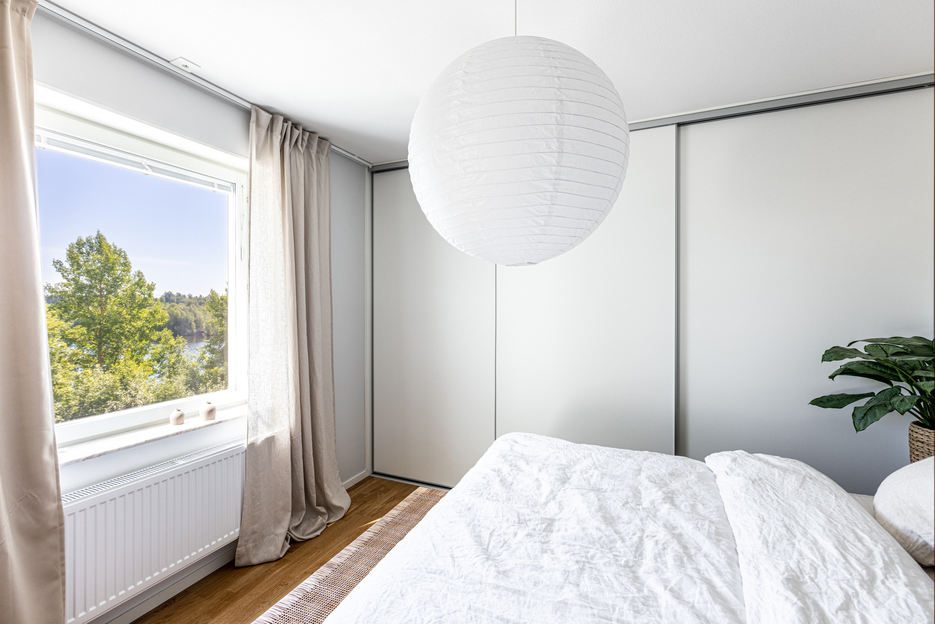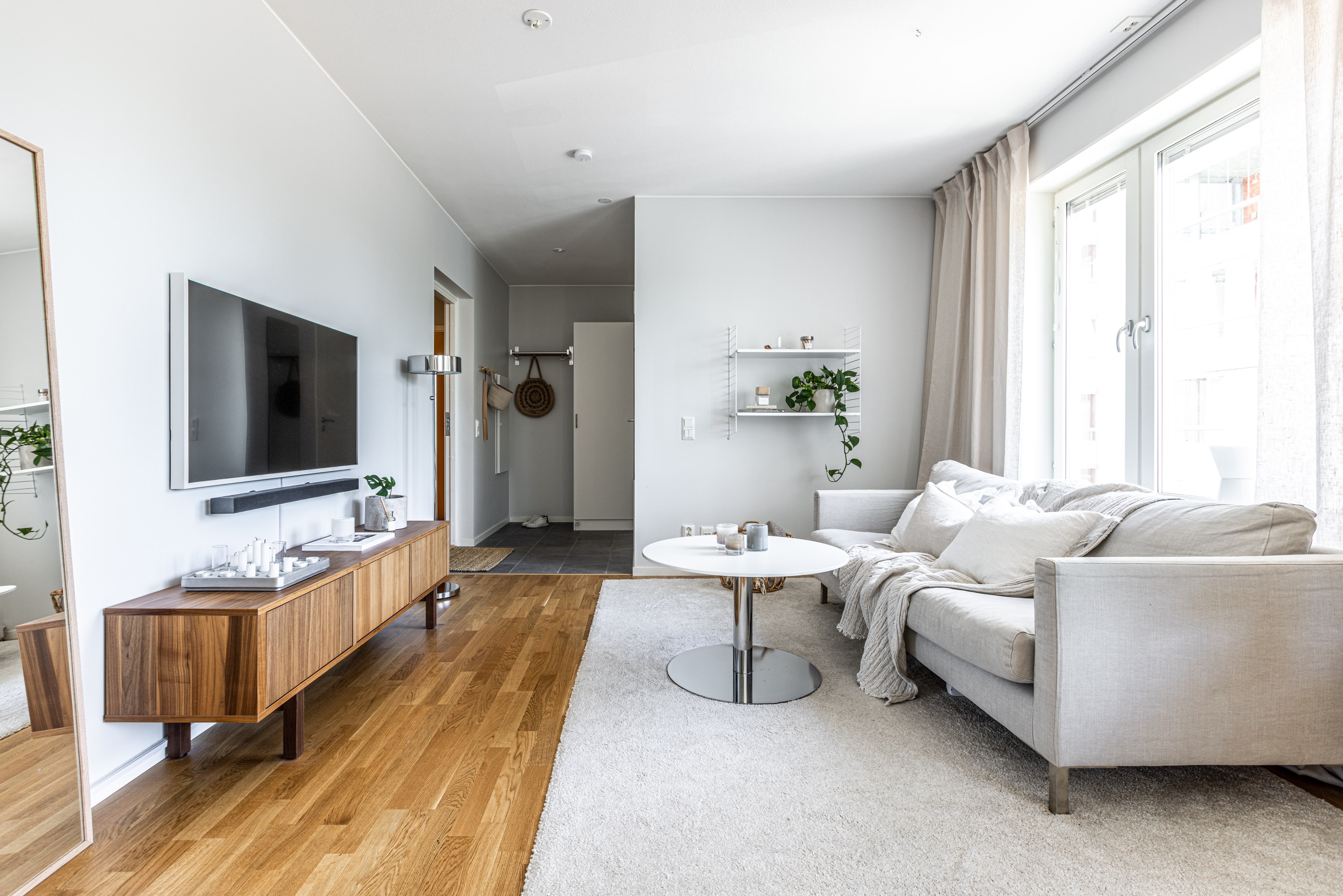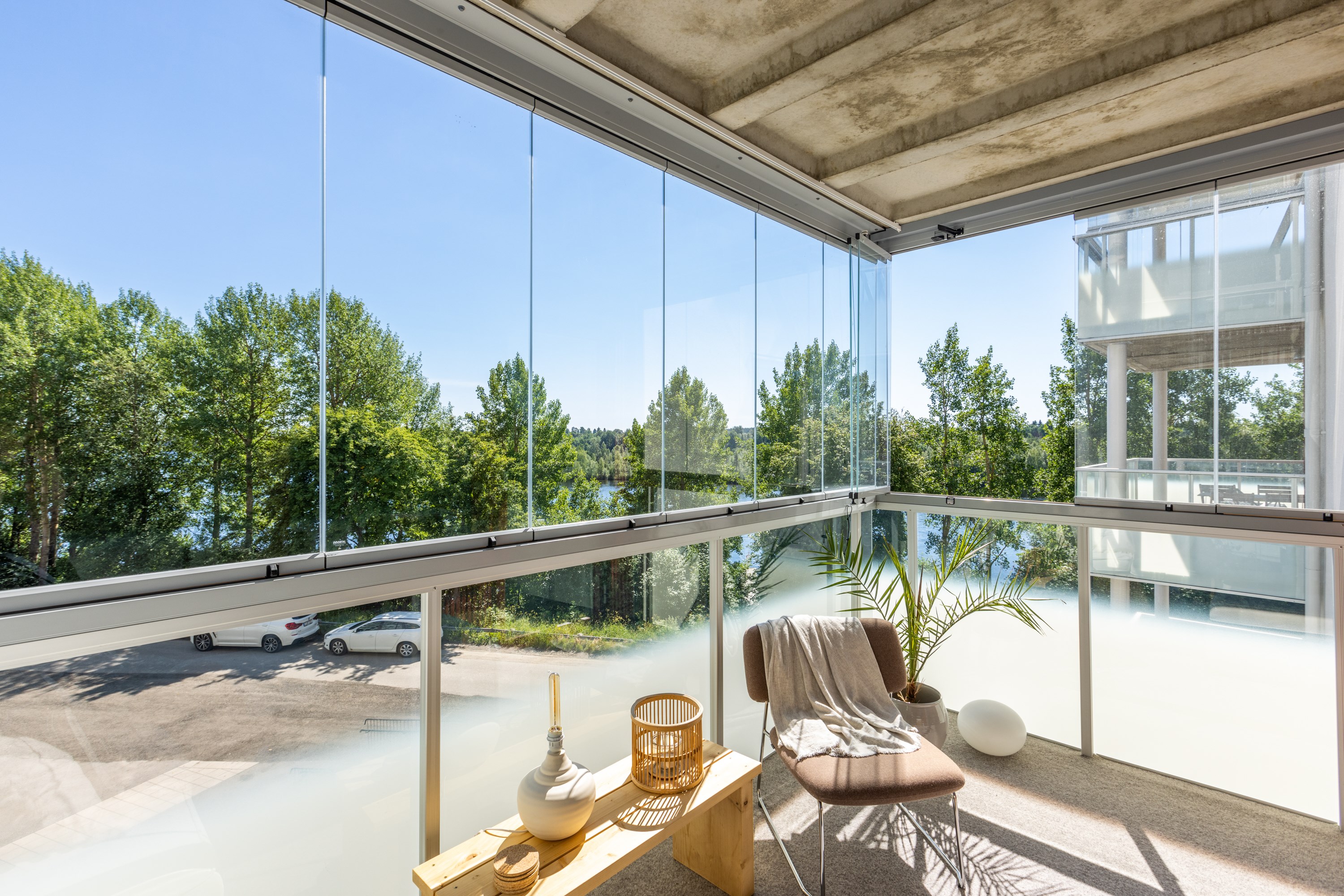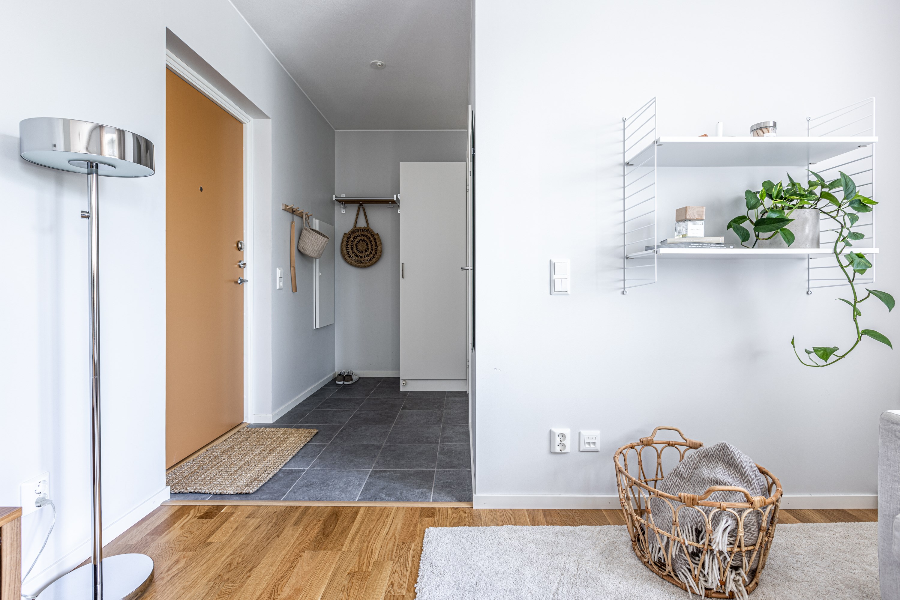Hall med avhängning av ytterkläder och skor direkt till vänster samt förvaring eller städskåp i garderob som kommer att lämnas kvar i lägenheten. Helkaklat badrum med behaglig golvvärme, spotlights i taket och ett litet vädringsfönster. Dusch med infällbara glasväggar, handfat med kommod, spegelskåp med belysning, handdukstork och toalett. Egen kombinerad tvättmaskin/tumlare med bänkyta ovan och rymligt badrumsskåp. Vardagsrum och kök samspelar i en modern, öppen planlösning. Stora fönsterpartier ger bostaden härlig ljus och rymd. Från vardagsrummet nås den stora, inglasade balkongen som blir favorittillhållet under vår, sommar och höst. Köket bjuder på högkvalitativ och stilsäker inredning från Marbodal. Vit skåpinredning sällskapas av ett vitt kakel och en gråmelerad bänkskiva - klockren kombination. Maskinparken består av integrerad diskmaskin, kyl/frys, ugn och mikro, induktionshäll och fläkt. Matbordet placeras naturligt intill fönsterparti. Sist men inte minst: det rofyllda sovrummet! Har ni mycket kläder och annat som ni vill ha lättillgängligt men ändå dolt? Då kommer ni verkligen att uppskatta skjutdörrsgarderoben som sträcker sig från golv till tak och vägg till vägg. I sovrummet rymmer ni dubbelsäng!