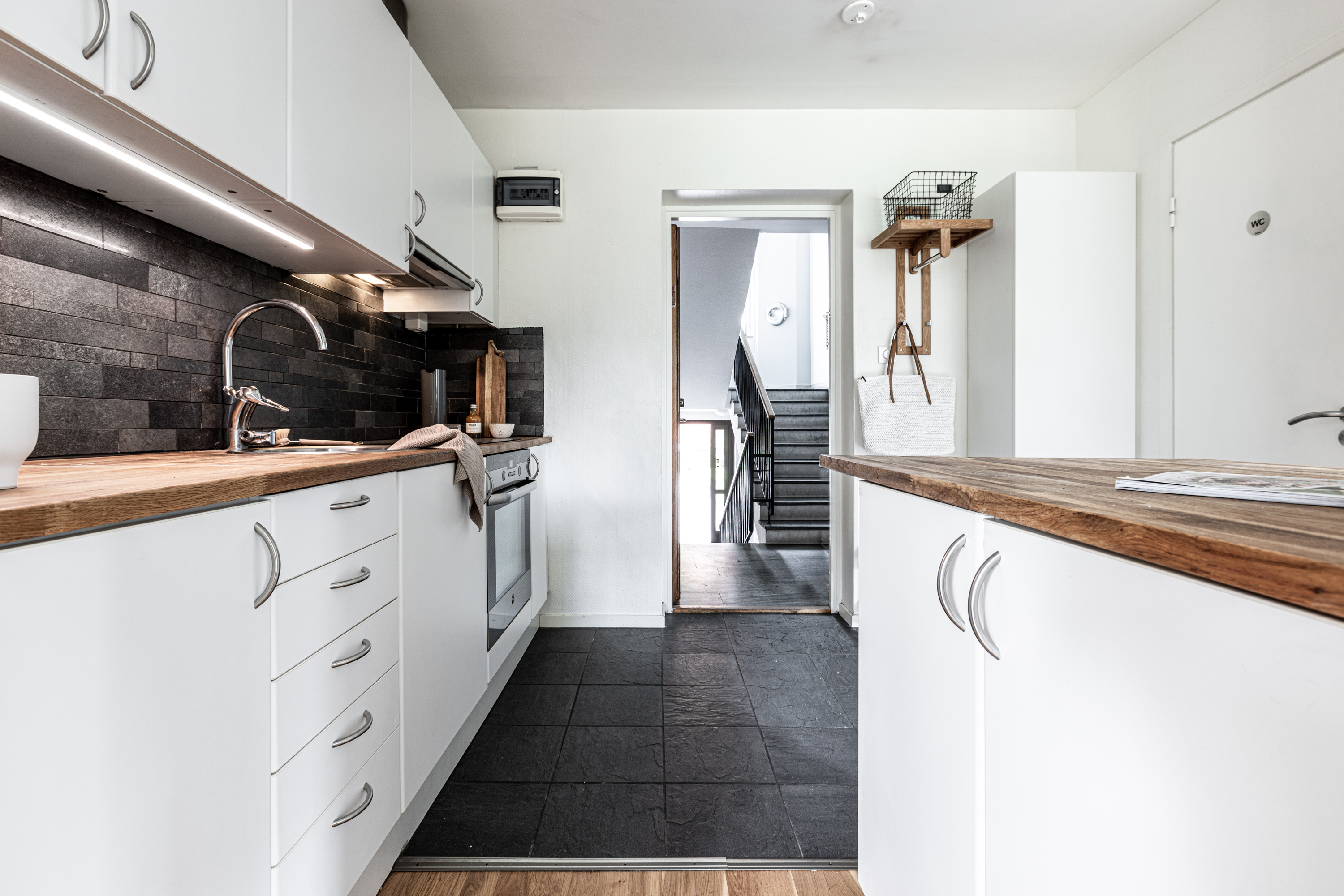 Lägenheten är belägen en halv trappa upp.
