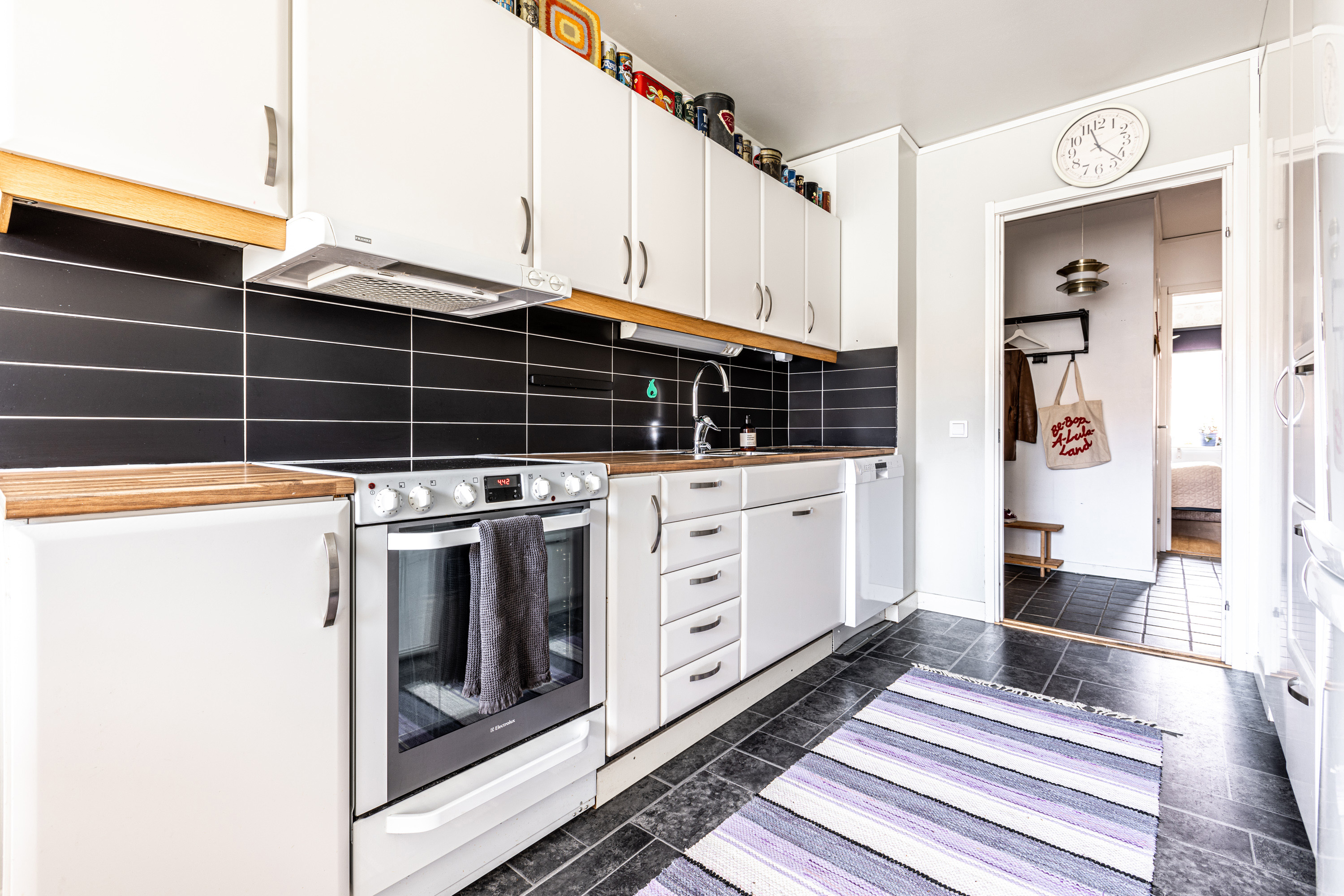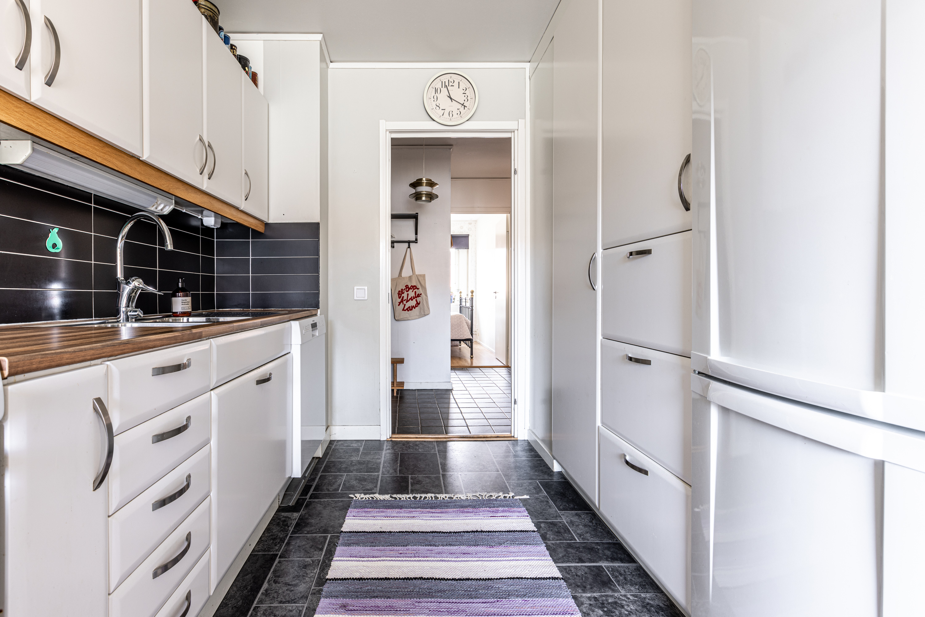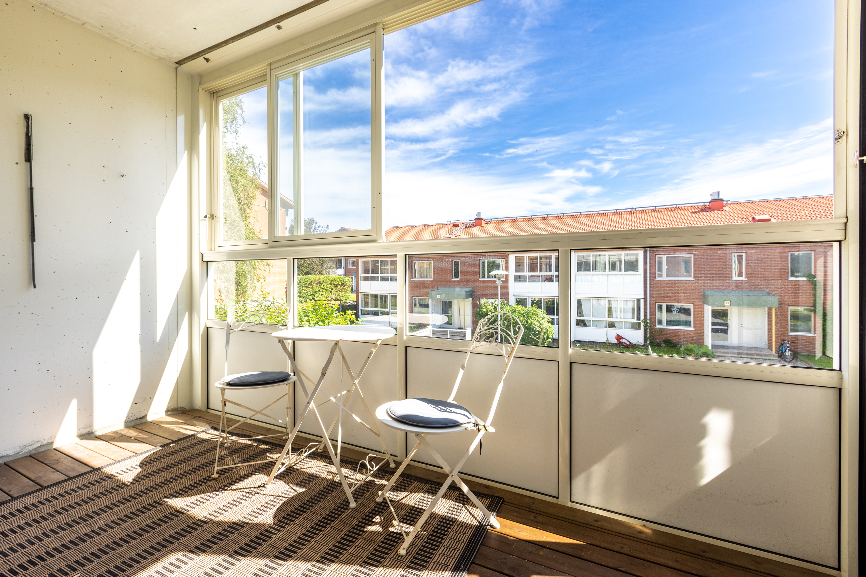 Hallen hälsar er välkomna med öppen famn och erbjuder avhängning av ytterkläder och skor direkt till vänster om entrén. Önskas dold förvaring? Inga problem! Lite längre fram till vänster återfinns en praktisk klädkammare. Första svängen till höger leder er in i lägenhetens kök. Köket är riktigt bra planerat med flertalet skåp och lådor samt generöst med arbetsytor. Maskinparken består av kyl/frys, diskmaskin, spis och fläkt. Utöver bra ytor för förvaring och matlagning har köket även plats för matbord intill fönsterparti. Från både hall och kök nås det ljusa och luftiga vardagsrummet. Spatiöst vardagsrum med goda möbleringsmöjligheter och med utrymme för variation, för den som önskar går det att få plats med både soffgrupp och matsalsmöbel. Från vardagsrummet nås den inglasade balkongen. Lägenhetens två sovrum ligger till vänster om entrén, vägg i vägg med varandra. Båda rummen har plats för dubbelsäng vilket gör att ni själva väljer vilket ni vill disponera som huvudsovrum. Rofyllda sovrum med ostört läge! Sist ut har vi badrummet där ytskikten utgörs av våtrumsmatta på både väggar och golv. Här finns wc, handfat med kommod, spegel med belysning, badrumsskåp och dusch. Badrummet är även försett med en tvättpelare (tvättmaskin och torktumlare).