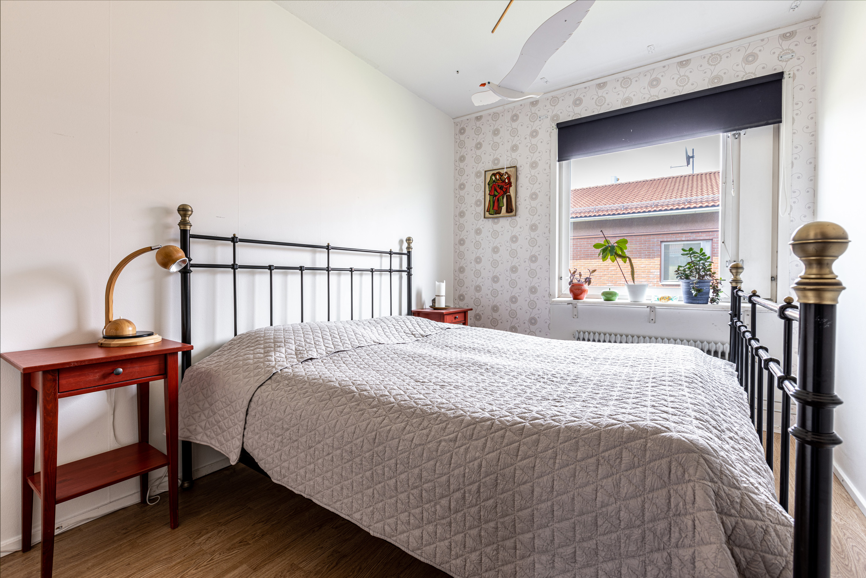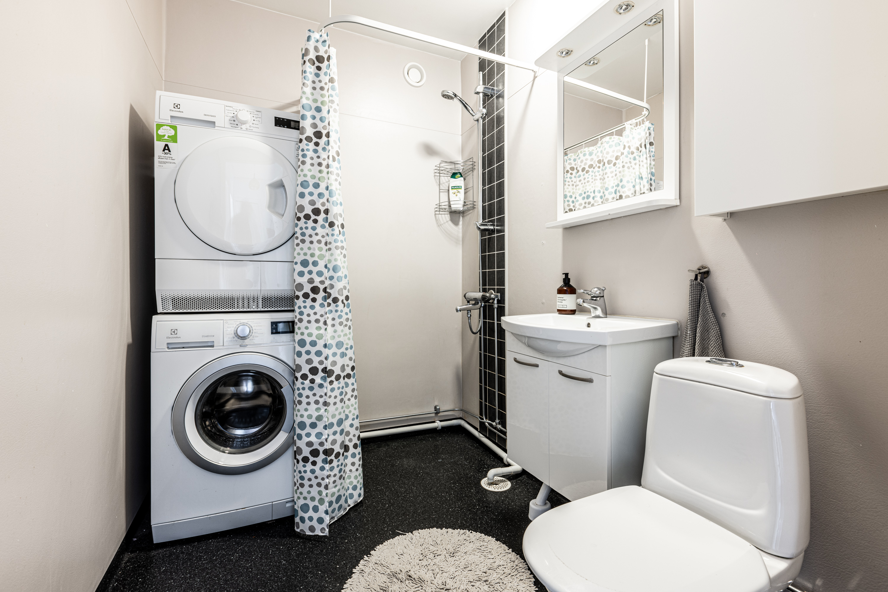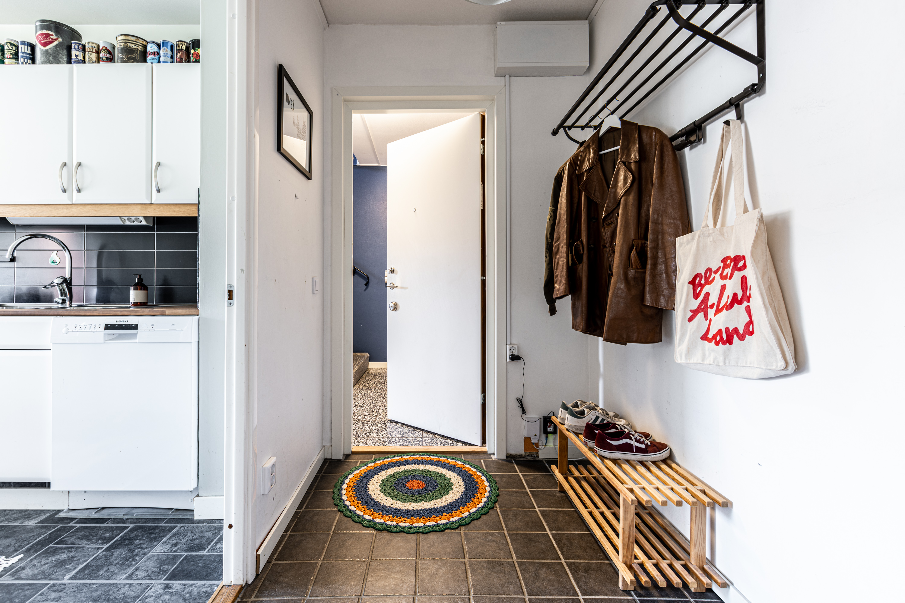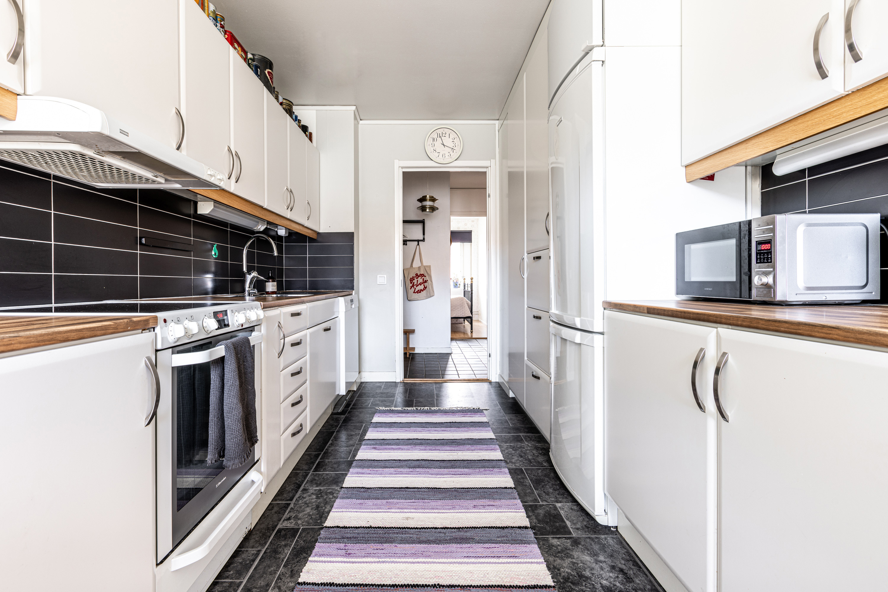 Hallen hälsar er välkomna med öppen famn och erbjuder avhängning av ytterkläder och skor direkt till vänster om entrén. Önskas dold förvaring? Inga problem! Lite längre fram till vänster återfinns en praktisk klädkammare. Första svängen till höger leder er in i lägenhetens kök. Köket är riktigt bra planerat med flertalet skåp och lådor samt generöst med arbetsytor. Maskinparken består av kyl/frys, diskmaskin, spis och fläkt. Utöver bra ytor för förvaring och matlagning har köket även plats för matbord intill fönsterparti. Från både hall och kök nås det ljusa och luftiga vardagsrummet. Spatiöst vardagsrum med goda möbleringsmöjligheter och med utrymme för variation, för den som önskar går det att få plats med både soffgrupp och matsalsmöbel. Från vardagsrummet nås den inglasade balkongen. Lägenhetens två sovrum ligger till vänster om entrén, vägg i vägg med varandra. Båda rummen har plats för dubbelsäng vilket gör att ni själva väljer vilket ni vill disponera som huvudsovrum. Rofyllda sovrum med ostört läge! Sist ut har vi badrummet där ytskikten utgörs av våtrumsmatta på både väggar och golv. Här finns wc, handfat med kommod, spegel med belysning, badrumsskåp och dusch. Badrummet är även försett med en tvättpelare (tvättmaskin och torktumlare).