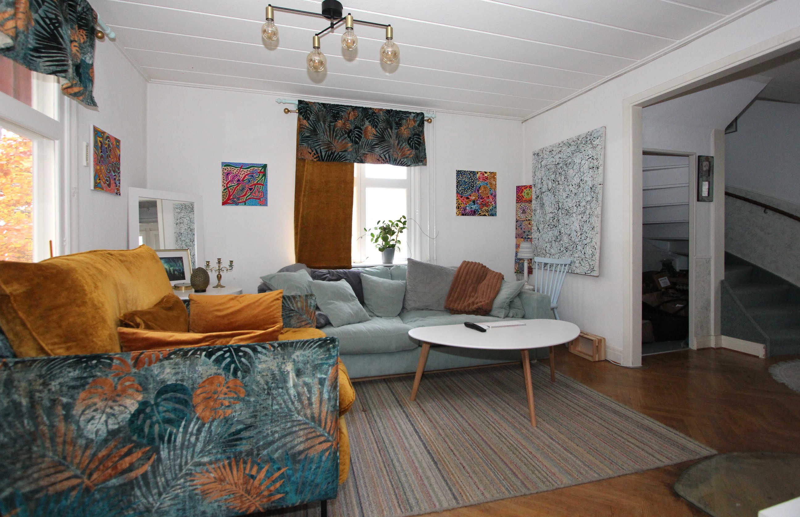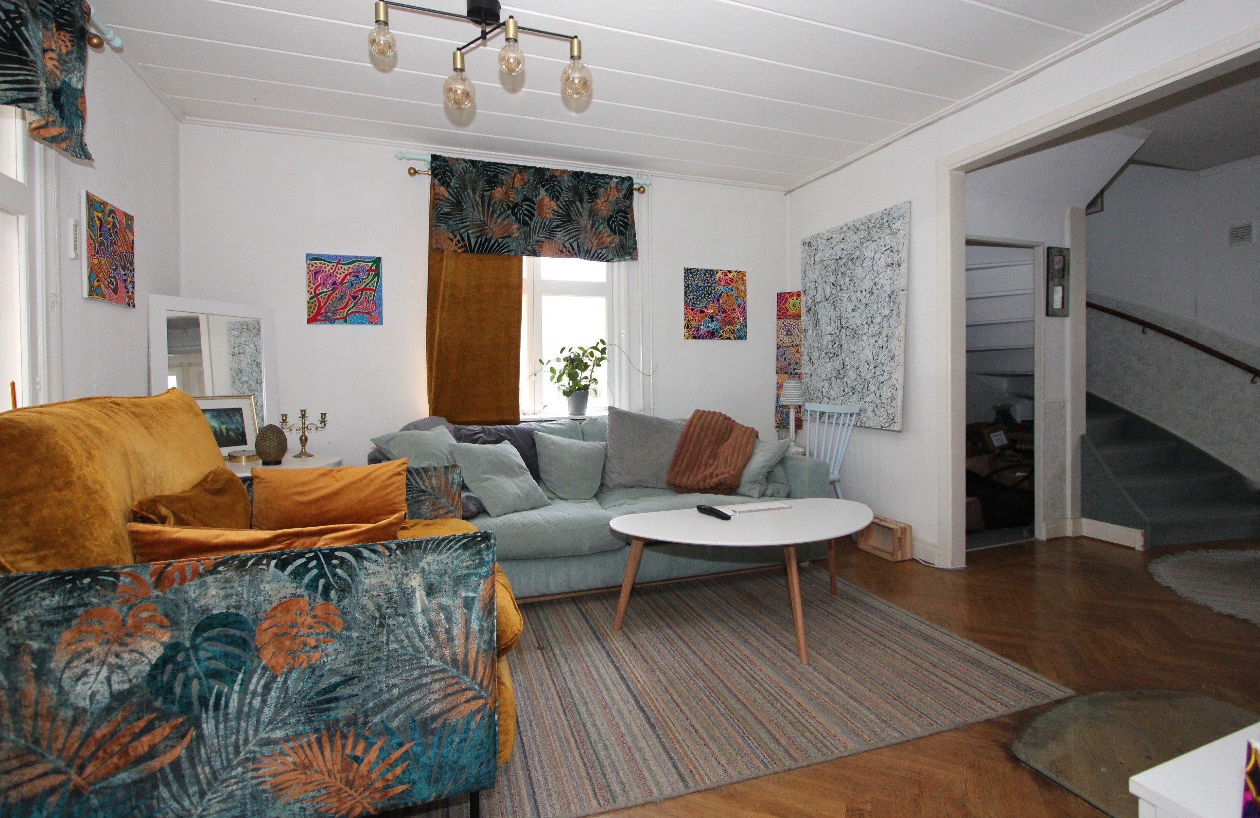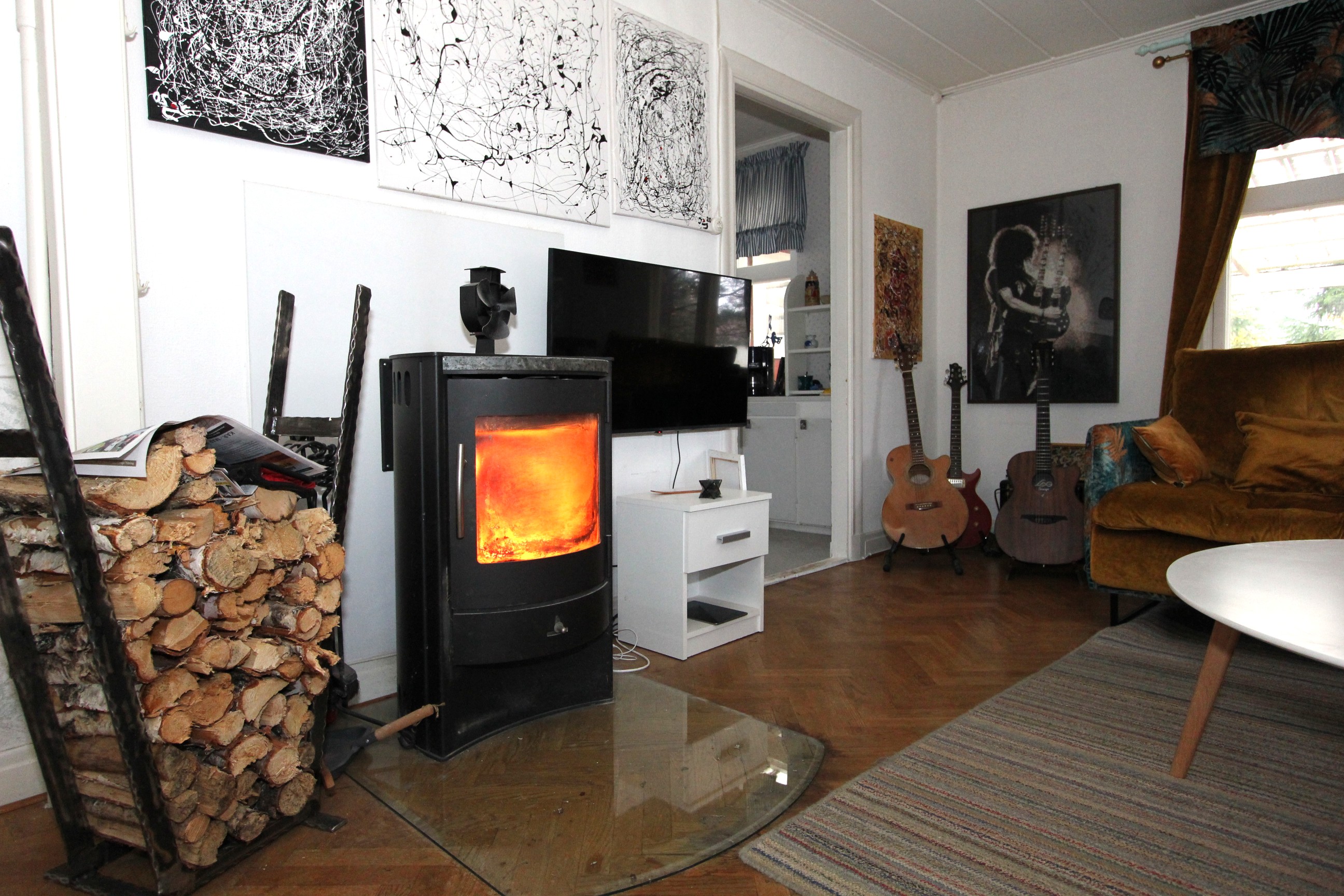Från köket och från matrummet når man vardagsrummet. 2 fönster och gott om plats att mysa framför kaminen som sprider värme i hela huset. Fiskbensparkett. Trappa upp och förvaring under den.